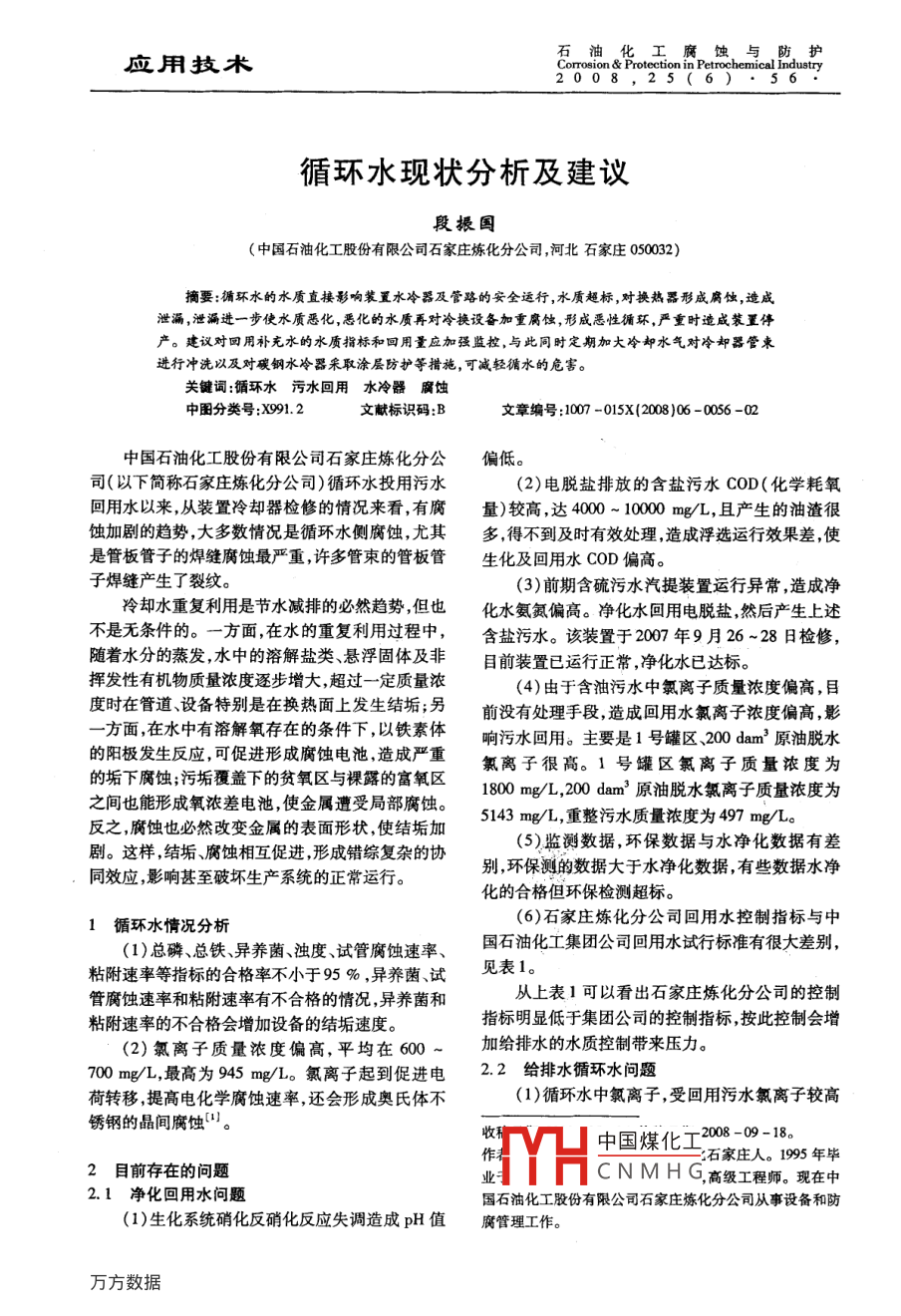 應用技術Corrosion Protection in Petrochemical Ind2008,25(6)循環(huán)水現(xiàn)狀分析及建議段搌國(中國石油化工股份有限公司石家莊煉化分公司,河北石家莊050032)摘要:循環(huán)水的水質(zhì)直彩響裝置水冷器及管路的安全透行,水質(zhì)超標,對換熱器形成腐蝕,造咸泄漏,泄渦進一步使水質(zhì)惡化,惡化的水質(zhì)再對冷換設備加重腐蝕,形成惡性循環(huán),嚴重時造威裝歪停產(chǎn)。建議對回用補充水的水質(zhì)指標和回用量應加強監(jiān)控,與此同時定期加大冷卻水氣對冷卻器管東進行沖洗以及對碳鋼水冷器采取涂層防護等措施,可減輕循水的危害。關鍵詞:循環(huán)水污水回用水冷器腐蝕中圖分類號:X912文獻標識碼:B文章編號:1007-015X(2008)06-0056-02中國石油化工股份有限公司石家莊煉化分公偏低司(以下簡稱石家莊煉化分公司)循環(huán)水投用污水(2)電脫鹽排放的含鹽污水COD(化學耗氧回用水以來從裝置冷卻器檢修的情況來看,有腐量)較高,達4000~1000mg/,且產(chǎn)生的油渣很蝕加劇的趨勢,大多數(shù)情況是循環(huán)水側腐蝕,尤其多,得不到及時有效處理,造成浮選運行效果差,使是管板管子的焊縫腐蝕最嚴重,許多管束的管板管生化及回用水COD偏高。子焊縫產(chǎn)生了裂紋。3)前期含硫污水汽提裝置運行異常,造成凈冷卻水重復利用是節(jié)水減排的必然趨勢,但也化水氨氮偏高。凈化水回用電脫鹽然后產(chǎn)生上述不是無條件的。一方面,在水的重復利用過程中,含鹽污水。該裝置于2007年9月26~28日檢修隨著水分的蒸發(fā)水中的溶解鹽類、懸浮固體及非目前裝置已運行正常,凈化水已達標揮發(fā)性有機物質(zhì)量濃度逐步增大,超過一定質(zhì)量濃(4)由于含油污水中氯離子質(zhì)量濃度偏高,目度時在管道、設備特別是在換熱面上發(fā)生結垢;另前沒有處理手段,造成回用水氯離子濃度偏高影方面,在水中有溶解氧存在的條件下,以鐵素體響污水回用。主要是1號罐區(qū)、200dam3原油脫水的陽極發(fā)生反應,可促進形成腐蝕電池,造成嚴重的垢下腐蝕;污垢覆蓋下的貧氧區(qū)與裸露的富氧區(qū)氯離子很高。1號罐區(qū)氯離子質(zhì)量濃度為1800mg/L,200dam3原油脫水氯離子質(zhì)量濃度為之間也能形成氧濃差電池,使金屬遭受局部腐蝕。反之,腐蝕也必然改變金屬的表面形狀,使結垢加5143mg/L,重整污水質(zhì)量濃度為497mg/L劇。這樣,結垢、腐蝕相互促進,形成錯綜復雜的協(xié)(5)監(jiān)測數(shù)據(jù),環(huán)保數(shù)據(jù)與水凈化數(shù)據(jù)有差同效應,影響甚至破壞生產(chǎn)系統(tǒng)的正常運行。別,環(huán)保測的數(shù)據(jù)大于水凈化數(shù)據(jù),有些數(shù)據(jù)水凈化的合格但環(huán)保檢測超標。1循環(huán)水情況分析(6)石家莊煉化分公司回用水控制指標與中(1)總磷、總鐵、異養(yǎng)菌、濁度、試管腐蝕速率國石油化工集團公司回用水試行標準有很大差別粘附速率等指標的合格率不小于95%,異養(yǎng)菌、試見表1管腐蝕速率和粘附速率有不合格的情況,異養(yǎng)菌和從上表1可以看出石家莊煉化分公司的控制粘附速率的不合格會增加設備的結垢速度。指標明顯低于集團公司的控制指標按此控制會增(2)氯離子質(zhì)量濃度偏高,平均在600~加給排水的水質(zhì)控制帶來壓力。700mg/L,最高為945mg/L。氯離子起到促進電22給排水循環(huán)水問題荷轉(zhuǎn)移提高電化學腐蝕速率,還會形成奧氏體不(1)循環(huán)水中氯離子,受回用污水氯離子較高銹鋼的晶間腐蝕。2目前存在的問題YH中國煤化工202-09-18石家莊人。1995年畢CNMHG高級工程師?,F(xiàn)在中2.1凈化回用水問題國石油化工股份有限公司石家莊煉化分公司從事設備和防(1)生化系統(tǒng)硝化反硝化反應失調(diào)造成pH值腐管理工作第6期段振國.循環(huán)水現(xiàn)狀分析及建議的影響,質(zhì)量濃度越來越高,這也是腐蝕速度增高的一個主要原因表1回用水控制指標與試行標準的區(qū)別(質(zhì)量濃度)PH值濁度/COD氮氮懸浮物硫化物石油烴酚鈣硬總堿氯離子硫酸根總鐵(mg·L-1)中國石油化工6.5≤10≤75≤15≤50≤0.1≤10≤1.050~50-≤250≤300≤0.5集團公司石家莊煉化7.29.0≤10≤150≤50≤30≤0.5≤10≤1.0≤300≤250≤1.0(2)氨氮指標偏高促進微生物的繁殖。在循場的水質(zhì)指標進行控制。環(huán)水中有充足的碳源、磷源、氧氣、適宜的溫度,非(2)目前石家莊煉化分公司的回用污水水質(zhì)常適合細菌藻類等微生物生長,若加上氮源就會指標高于中國石油化工集團公司下達控制指標,需極大促進微生物的繁殖,硝化菌群大量繁殖。硝化要重新核實回用污水補入循環(huán)水水質(zhì)指標。不能菌群對水質(zhì)最大的危害是使氨氧化成為亞硝酸根、只考慮回用量,應在確保循環(huán)水水質(zhì)的前提下,再硝酸根,從而影響氯的殺菌能力,產(chǎn)生酸性環(huán)境,造提高回用量。成水質(zhì)惡化(3)裝置定期對換熱器開大進、出口閥門,加(3)一循環(huán)水場旁濾設施不足,循環(huán)水中懸浮大循環(huán)水流速,將水冷器管束流速控制在不低于物含量高,在流速低的管路中沉積,在設備表面產(chǎn)1m/s,避免粘泥沉積附著在管束中而造成垢下生粘泥污垢,促使發(fā)生局部腐蝕。腐蝕。(4)裝置換熱器介質(zhì)泄漏,油類泄漏會消耗大4)建議各裝置使用碳鋼換熱器時進行涂層防量緩蝕阻垢劑,降低緩蝕阻垢效果。另外,