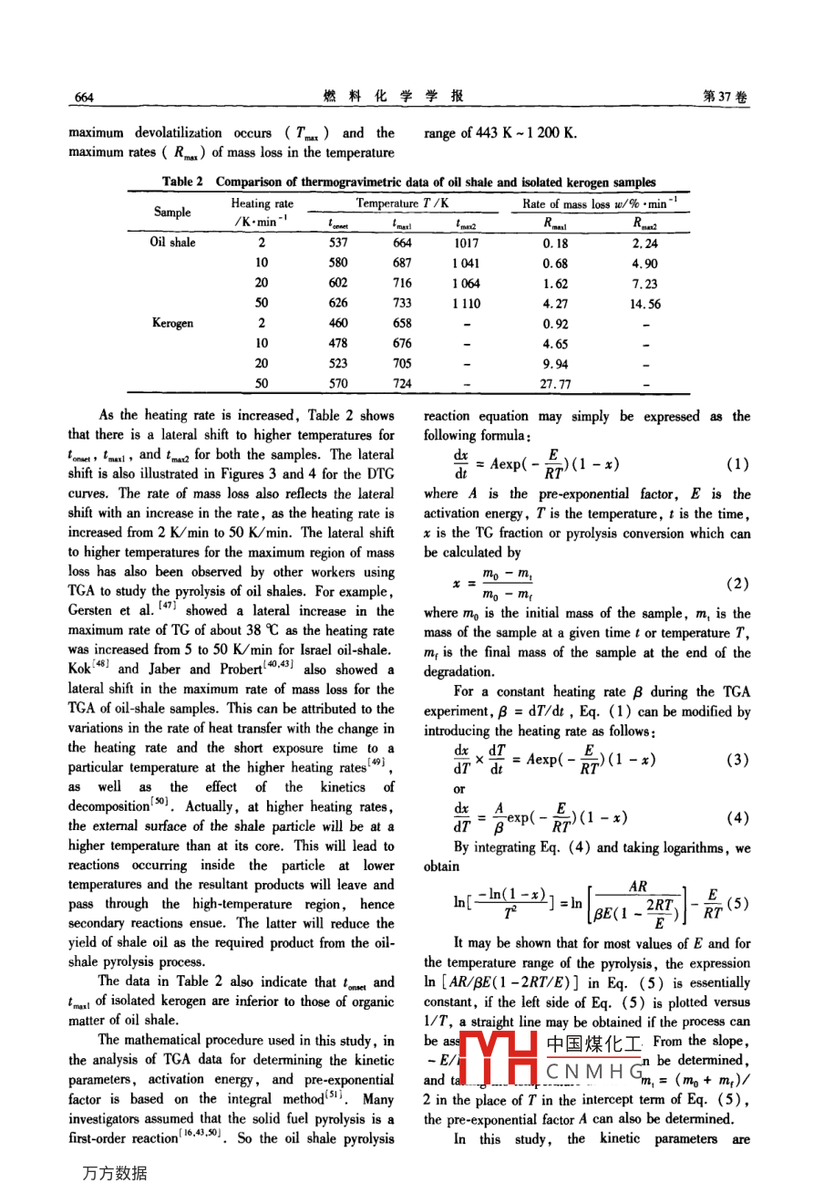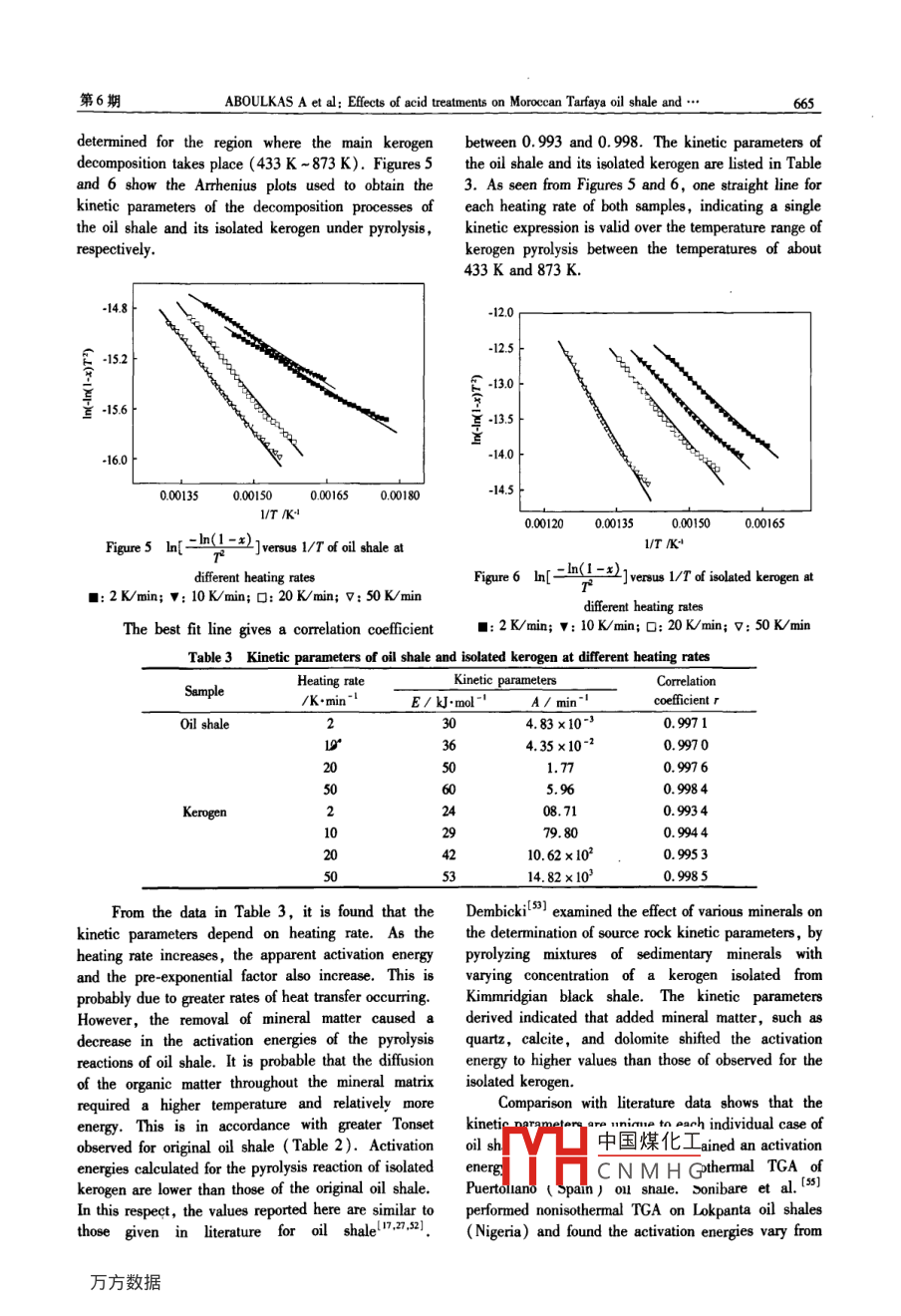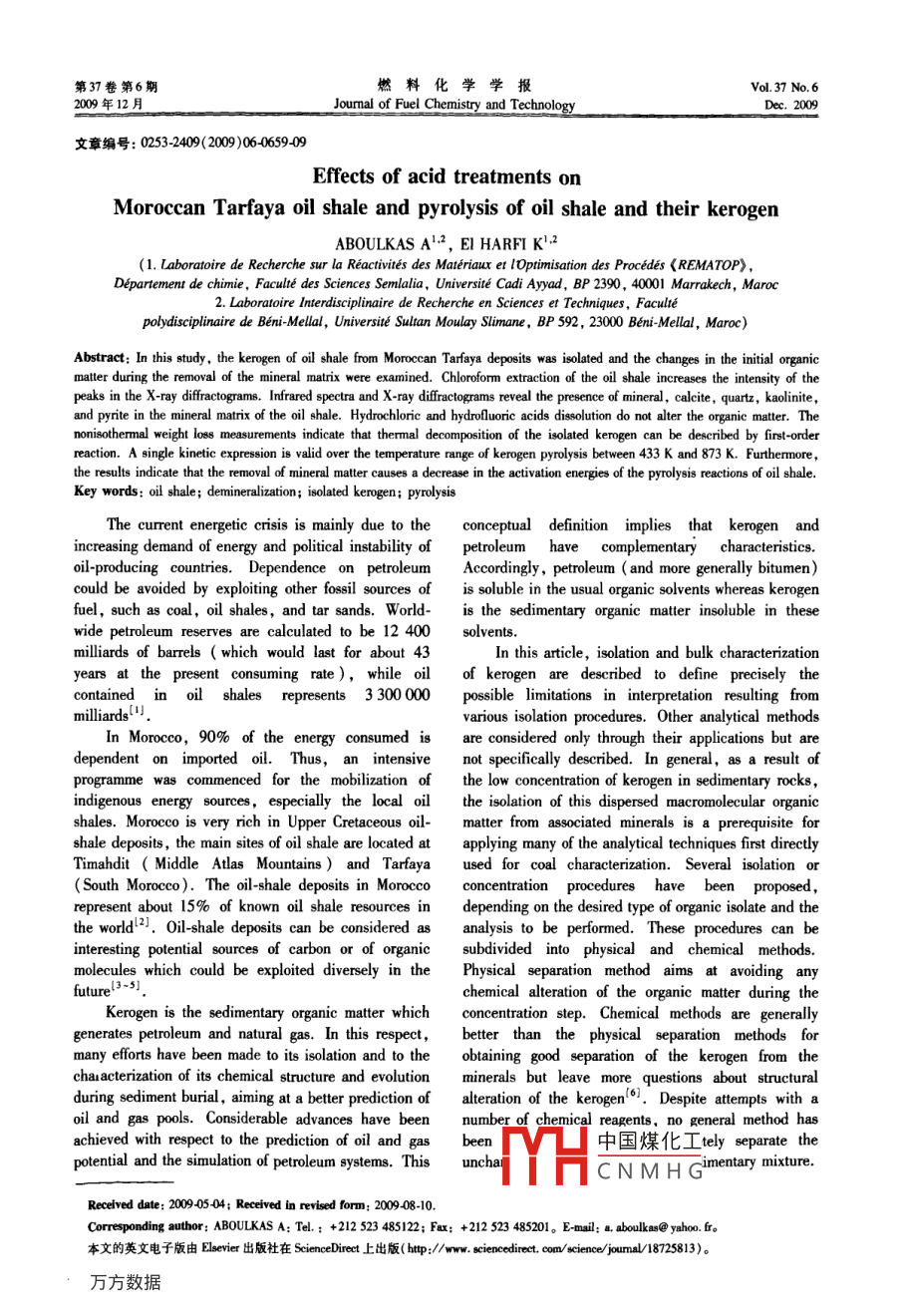 第37卷第6期燃料化學學報Vol.37 No.62009年12月Joumal of Fuel Chemistry and TechnologyDec. 2009文章編號: 0253-2409(2009)06-0659-09Effects of acid treatments onMoroccan Tarfaya oil shale and pyrolysis of oil shale and their kerogenABOULKAS A'2, EI HARFI K!2(1. Laboratoire de Recherche sur la Reactivites des Materiaux et lOptimisation des Procedes《REMATOP> ,Deparement de chimie, Faculte des Sciences Semlalia, Universite Cadi Ayyad, BP 2390, 40001 Marrakech, Maroc .2. Laboratoire Interdisciplinaire de Recherche en Sciences et Techniques, Facultepolydisciplinaire de Beni-Mellal, Universite Sultan Moulay Slimane, BP 592 , 23000 Beni Melal, Maroc)Abstract: In this study, the kerogen of oil shale from Moroccan Tarfaya deposits was isolated and the changes in the initial organicmatter during the removal of the mineral matrix were examined. Chloroform extraction of the oil shale increases the intensity of thepeaks in the X-ray dffactograms. Infrared spectra and X-ray difractograms reveal the presence of mineral , calcite , quartz, kaolinite ,and pyrite in the mineral matrix of the oil shale. Hydrochloric and hydroluoric acids dissolution do not alter the organice matter. Thenonisothermal weight loss measurements indicate that thermal decomposition of the isolated kerogen can be described by first-orderreaction. A single kinetic expression is valid over the temperature: range of kerogenpyrolysis between 433 K and 873 K. Furthermore,the results indicate that the removal of mineral malter causes a decrease in the activation energies of the pyrolysis reactions of oil shale.Key words: oil shale; demineralization; isolated kerogen; pyrolysisThe curent energetic crisis is mainly due to theconceptual definition implies that kerogen andincreasing demand of energy and political instability ofpetroleum have complementarycharacteristics.oil-producing countries. Dependence on petroleumAccordingly, petroleum ( and more generally bitumen)could be avoided by exploiting other fossil sources of is soluble in the usual organic solvents whereas kerogenfuel, such as coal, oil shales, and tar sands. World-is the sedimentary organic matter insoluble in thesewide petroleum reserves are calculated to be 12 400solvents.milliards of barrels ( which would last for about 43In this article ,isolation and bulk characterizationyears at the present consuming rate) ,while oilof kerogen are described to define precisely thecontained in oil shales represents 3 300 000possible limitations in interpretation resulting frommilliards'various isolation procedures. Other analytical methodsIn Morocco, 90% of the energy consumed isare considered only through their applications but aredependent on imported oil. Thus, an intensivenot specifically described. In general, as a result ofprogramme was commenced for the mobilzation ofthe low concentration of kerogen in sedimentary rocks,indigenous energy sources, especially the local oithe isolation of this dispersed macromolecular organicshales. Morocco is very rich in Upper Cretaceous oilmatter from associated minerals is a prerequisite forshale deposits, the main sites of oil shale are located atapplying many of the analytical techniques first directlyTimahdit ( Middle Atlas Mountains ) and Tarfayaused for coal characterization. Several isolation or( South Morocco). The oil-shale deposits in Moroccoconcentrationprocedures have been proposed,represent about 15% of known oil shale resources independing on the desired type of organic isolate and thethe world!2). Oil-shale deposits can be considered asanalysis to be performed. These procedures can beinteresting potential sources of carbon or of organicsubdivided into physical and chemical methods.molecules which could be exploited diversely in thePhysical separation method aims at avoiding anyfuturel3-5].chemical alteration of the organic matter during theKerogen is the sedimentary organic matter whichconcentration step. Chemical methods are generallygenerates petroleum and natural gas. In this respect ,better than the physical separation methods formany efforts have been made to its isolation and to theobtaining good separation of the kerogen from thechatacterization of its chemical structure and evolutionminerals but leave more questions about structuralduring sediment burial, aiming at a better prediction ofalteration of the kerogen'Despite attempts with aoil and gas pools. Considerable advances have beennumber of chemical reagents. no general method hasachieved with respect to the prediction of oil and gasbeen中國煤化工tely separate thpotential and the simulation of petroleum systems. Thisunchai.FYTHCNMHGimentary mixture.Received date: 2009-0504; Received in rerised form: 2009 08-10.Corresponding author; ABOULKAS A: Tel.: +212 523 485122; Fax: +212 523 485201。E-mail: a. aboulkas@ yahoo. fr。本文的英文電子版由Elserier出版社在ScienceDiret上出版( htp://www siencedrect. con/sience/jouma/18725813)。660燃料化學學報第37卷The conventionalhydrochloric/hydrofluoric acidGoymuk and Green River oil shale. Berkorich et al18])treatment is efective for removing most carbonate ,presented a novel technique to the thermaloxide,and monosulfide minerals from sedimentarycharacterization of oil shale. This approach involves therocks and leaves kerogen and pyrite largelyseparation of the unique components of oil shale, theunaffected-9. Effective removal of pyrite is usuallykerogen and the clay minerals, using chemical andthe main problem' 0. Petroleum geochemists have longphysical techniques. Enthalpy data for dehydration andbeen interested in obtaining pyrite free and chemicallypyrolysis of kerogen were also determined.unaltered kerogen concentrates. Quantiative removalThe aim of this study was to investigate the effectsof pyrite is not possible without alteration of the organicof hydrochloric and hydrofluoric acids treatments. Thecomposition. The magnitude of the change in thechemical changes occurring in the organic ma
