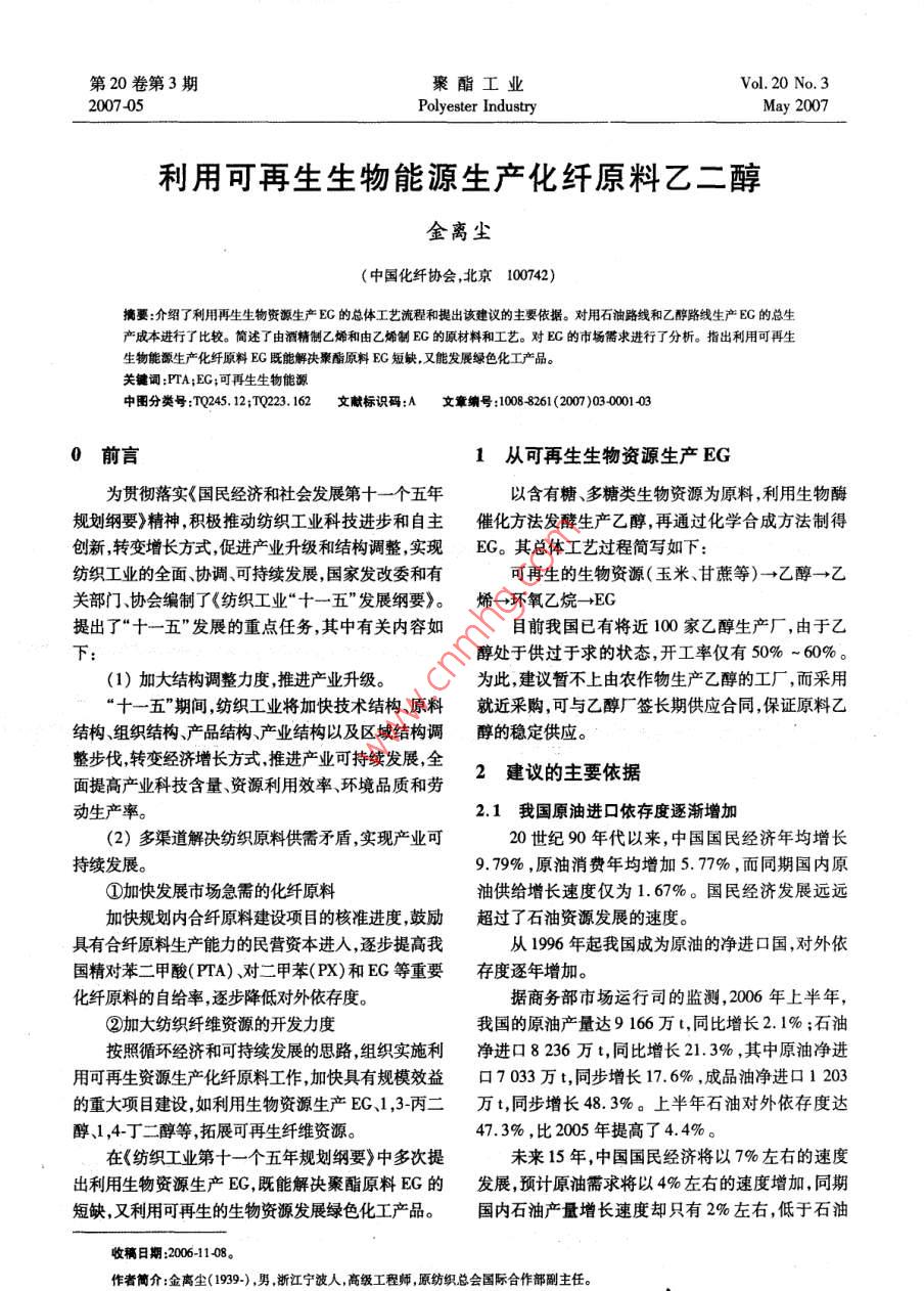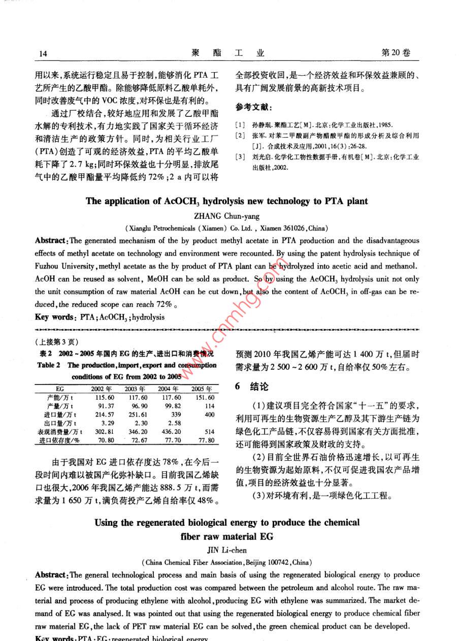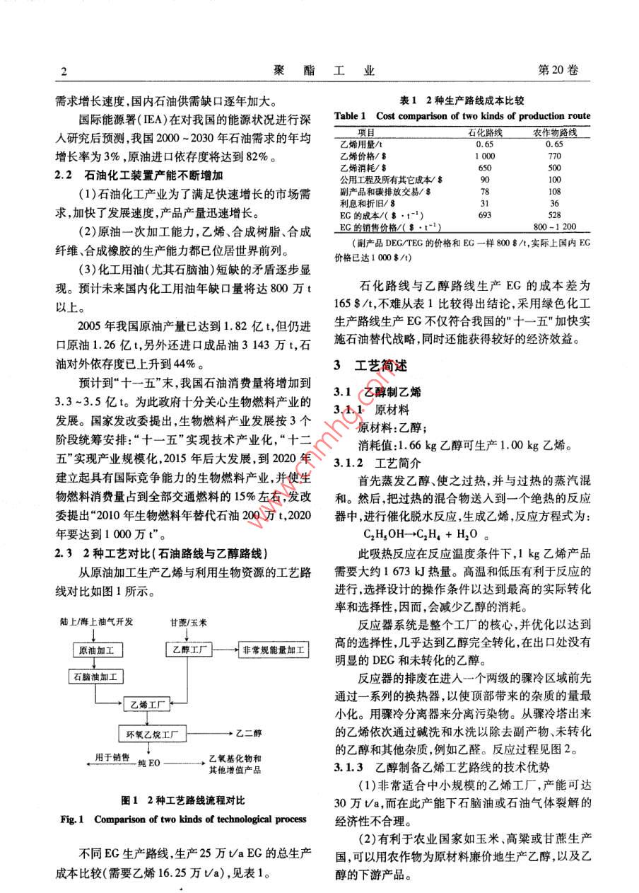 第20卷第3期聚酯工業(yè) Vol. 20 No.3200705 Polyester Industry May 2007利用可再生生物能源生產(chǎn)化纖原料乙二醇金離塵(中國化纖協(xié)會,北京100742)摘要:介紹了利用再生生物資源生產(chǎn)EG的總體工藝流程和提出該建議的主要依據(jù)。對用石油路線和乙醇路線生產(chǎn)EG的總生產(chǎn)成本進(jìn)行了比較。簡述了由酒精制乙烯和由乙烯制E的原材料和工藝。對E的市場需求進(jìn)行了分析。指出利用可再生生物能源生產(chǎn)化纖原料EG既能解決聚酯原料EG短缺又能發(fā)展綠色化工產(chǎn)品。關(guān)鍵: PTA EG可再生生物能源中分類號:TQ245.12:TQ223.162文獻(xiàn)標(biāo)識碼:A文章編號:1008261(2070301-030前言1從可再生生物資源生產(chǎn)EG為貫徹落實(shí)《國民經(jīng)濟(jì)和社會發(fā)展第十一個(gè)五年以含有糖、多糖類生物資源為原料,利用生物酶規(guī)劃綱要》精神,積極推動紡織工業(yè)科技進(jìn)步和自主催化方法發(fā)酵生產(chǎn)乙醇,再通過化學(xué)合成方法制得創(chuàng)新,轉(zhuǎn)變增長方式,促進(jìn)產(chǎn)業(yè)升級和結(jié)構(gòu)調(diào)整實(shí)現(xiàn)EG。其總體工藝過程簡寫如下:紡織工業(yè)的全面、協(xié)調(diào)、可持續(xù)發(fā)展,國家發(fā)改委和有可再生的生物資源(玉米、甘蔗等)→乙醇→乙關(guān)部門、協(xié)會編制了《紡織工業(yè)“十一五”發(fā)展綱要。烯→環(huán)氧乙烷→EG提出了“十一五”發(fā)展的重點(diǎn)任務(wù),其中有關(guān)內(nèi)容如目前我國已有將近100家乙醇生產(chǎn)廠,由于乙下:醇處于供過于求的狀態(tài),開工率僅有50%~60%。(1)加大結(jié)構(gòu)調(diào)整力度推進(jìn)產(chǎn)業(yè)升級。為此,建議暫不上由農(nóng)作物生產(chǎn)乙醇的工廠,而采用“十一五”期間,紡織工業(yè)將加快技術(shù)結(jié)構(gòu)、原料就近采購,可與乙醇廠簽長期供應(yīng)合同,保證原料乙結(jié)構(gòu)組織結(jié)構(gòu)產(chǎn)品結(jié)構(gòu)產(chǎn)業(yè)結(jié)構(gòu)以及區(qū)域結(jié)構(gòu)調(diào)醇的穩(wěn)定供應(yīng)。整步伐,轉(zhuǎn)變經(jīng)濟(jì)增長方式,推進(jìn)產(chǎn)業(yè)可持續(xù)發(fā)展,全面提高產(chǎn)業(yè)科技含量、資源利用效率、環(huán)境品質(zhì)和勞2建議的主要依據(jù)動生產(chǎn)率。2.1我國原油進(jìn)口依存度逐漸增加(2)多渠道解決紡織原料供需矛盾,實(shí)現(xiàn)產(chǎn)業(yè)可20世紀(jì)90年代以來,中國國民經(jīng)濟(jì)年均增長持續(xù)發(fā)展。9.79%,原油消費(fèi)年均增加5.77%,而同期國內(nèi)原①加快發(fā)展市場急需的化纖原料油供給增長速度僅為1.67%。國民經(jīng)濟(jì)發(fā)展遠(yuǎn)遠(yuǎn)加快規(guī)劃內(nèi)合纖原料建設(shè)項(xiàng)目的核準(zhǔn)進(jìn)度,鼓勵超過了石油資源發(fā)展的速度。具有合纖原料生產(chǎn)能力的民營資本進(jìn)入,逐步提高我從1996年起我國成為原油的凈進(jìn)口國,對外依國精對苯二甲酸(PTA)、對二甲苯(PX)和EG等重要存度逐年增加?;w原料的自給率,逐步降低對外依存度。據(jù)商務(wù)部市場運(yùn)行司的監(jiān)測,2006年上半年,②加大紡織纖維資源的開發(fā)力度我國的原油產(chǎn)量達(dá)9166萬t,同比增長2.1%;石油按照循環(huán)經(jīng)濟(jì)和可持續(xù)發(fā)展的思路,組織實(shí)施利凈進(jìn)口8236萬t,同比增長21.3%,其中原油凈進(jìn)用可再生資源生產(chǎn)化纖原料工作加快具有規(guī)模效益口7033萬t,同步增長17.6%,成品油凈進(jìn)口1203的重大項(xiàng)目建設(shè),如利用生物資源生產(chǎn)EG、1,-丙二萬t,同步增長48.3%。上半年石油對外依存度達(dá)醇、1,4丁二醇等,拓展可再生纖維資源。47.3%,比2005年提高了4.4%。在《紡織工業(yè)第十一個(gè)五年規(guī)劃綱要》中多次提未來15年,中國國民經(jīng)濟(jì)將以7%左右的速度出利用生物資源生產(chǎn)EG,既能解決聚酯原料EG的發(fā)展,預(yù)計(jì)原油需求將以4%左右的速度增加,同期短缺,又利用可再生的生物資源發(fā)展綠色化工產(chǎn)品。國內(nèi)石油產(chǎn)量增長速度卻只有2%左右,低于石油收稿日期:2006-11-08作者簡介:金離塵(1939-),,浙江寧波人,高級工程師,原紡織總會國際合作部副主任。2聚酯工業(yè)第20卷需求增長速度,國內(nèi)石油供需缺口逐年加大。表12種生產(chǎn)路線成本比較國際能源署(IEA)在對我國的能源狀況進(jìn)行深 Table Cost comparison of two kinds of production route入研究后預(yù)測,我國2000~2030年石油需求的年均項(xiàng)目石化路線農(nóng)作物路線乙烯用量/t0.650.65增長率為3%,原油進(jìn)口依存度將達(dá)到82%。乙烯價(jià)格/10007702.2石油化工裝置產(chǎn)能不斷增加乙烯消耗/650500公用工程及所有其它成本/90100(1)石油化工產(chǎn)業(yè)為了滿足快速增長的市場需副產(chǎn)品和碳排放交易781083136求,加快了發(fā)展速度,產(chǎn)品產(chǎn)量迅速增長。利息和折舊EG的)693528(2)原油一次加工能力,乙烯、合成樹脂、合成EG的銷售價(jià)格/(t800-1200(副產(chǎn)品DEG/TEG的價(jià)格和EG一樣8008/t,實(shí)際上國內(nèi)EG纖維、合成橡膠的生產(chǎn)能力都已位居世界前列。價(jià)格已達(dá)1000/t)(3)化工用油(尤其石腦油)短缺的矛盾逐步顯現(xiàn)。預(yù)計(jì)未來國內(nèi)化工用油年缺口量將達(dá)800萬t石化路線與乙醇路線生產(chǎn)EG的成本差為以上