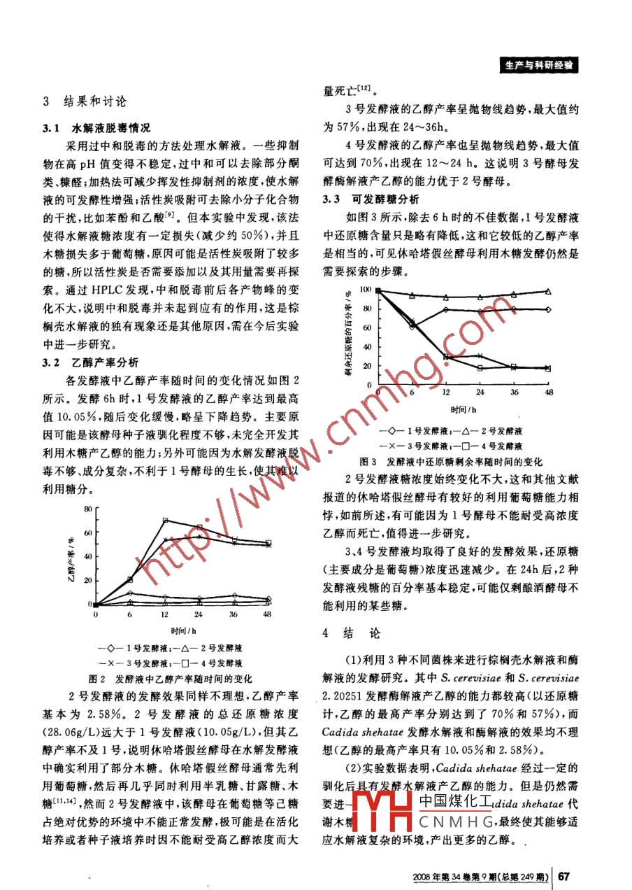 棕櫚殼發(fā)酵制取燃料乙醇的研究王瓊1,2,莊新姝1,張字12,徐明忠12,許敬亮,李東2,袁振宏1(中國科學(xué)院廣州能源研究所,中國科學(xué)院可再生能源與天然氣水合物重點實驗室廣東省新能源和可再生能源研究開發(fā)與應(yīng)用重點實驗室廣東廣州,510640)2(中國科學(xué)院研究生院,北京,100039)摘要嘗試?yán)?Cadida shehatae ATcc34887、 Saccharomyces cerevisiae2.20251和 Saccharomyces cereus3株酵母功菌發(fā)酵棕櫚殼的高溫液態(tài)水水解液和纖維素晦水解液?;藿庖号c高溫液態(tài)水水解液相比,發(fā)酵較容易,乙醇產(chǎn)率最高達(dá)到理論產(chǎn)率的70%面水解液發(fā)酵仍有許多工藝問題值得研究探討關(guān)鍵詞棕櫚殼,發(fā)酵,燃料乙醇使用燃料乙醇作為車用化石燃料替代品已經(jīng)很糖濃度為4.42g/L,大部分為木糖。第2步,將水解普遍。燃料乙醇是最直接、使用量最大的液體燃料,液中和脫毒然后取部分濃縮液用于種子液培養(yǎng)和發(fā)通過生物質(zhì)原料,如玉米、木材來制備它是各國研究酵,其余部分同殘渣一起進行酶解(纖維素酶購自的一大熱點,而利用棕櫚殼制備目前少有研究。棕櫚 Sigma公司,加酶量為15FPU/g,溫度50℃,水解12是一種重要的經(jīng)濟作物,在東南亞、南美洲、非洲的很h,糖濃度基本穩(wěn)定)得到纖維素酶水解液(以下簡多國家都有種植在我國廣泛分布于長江以南大部分稱酶解液),測得其還原糖濃度為28.06g/L,葡萄糖地區(qū)。由其果實制得的棕櫚油是世界油脂市場的重約占80%。具體的原料處理流程見圖1要組成部分121,而油脂生產(chǎn)過程中產(chǎn)生的大量棕櫚粽櫚殼原料殼尚未得到有效利用。本文初涉棕櫚殼水解制乙醇高溫高壓液態(tài)水水解領(lǐng)域,選擇使用休哈塔假絲酵母來發(fā)酵棕櫚殼的水解中和脫毒后的水解液液,同時利用3個菌株來發(fā)酵其酶解液,對糖利用情部分液體殘渣部分十剩余液體況、乙醇產(chǎn)率等進行了研究,為棕櫚殼燃料乙醇的生濃酶水解液產(chǎn)打下基礎(chǔ)液相部分殘渣部分1原料及其處理方法木糖發(fā)酵己糖發(fā)酵圖1棕櫚殼原料的基本處理流程圖通過范式分析的方法得出棕櫚殼含有豐富的用掃描電鏡觀察棕櫚殼原料和實驗殘渣的微觀纖維素和半纖維素資源。幾種常用的木質(zhì)纖維素原結(jié)構(gòu)變化,發(fā)現(xiàn)原料呈現(xiàn)沿徑向條狀紋路;水解渣顯料,如小麥稈、稻稈、硬木、軟木,其纖維素含量(質(zhì)量示沿徑向的纖維條有碎裂,質(zhì)地開始疏松;酶解殘渣分?jǐn)?shù))在30%~40%,半纖維素含量在25%顯示良好的破裂情況,纖維條有序排列但是彼此連35%而棕櫚殼的纖維素含量高達(dá)442%,半纖接松散。這表明高溫液態(tài)水水解和纖維素酶水解都維素含量也較高(21.74%),有利于產(chǎn)糖發(fā)酵。在不同程度上改變了棕櫚殼原料的結(jié)構(gòu),通過范式分棕櫚殼原料的處理主要分2步。第1步,將粉碎析發(fā)現(xiàn),半纖維素轉(zhuǎn)化率(質(zhì)量分?jǐn)?shù))達(dá)到90%,纖維后的棕櫚殼過40目篩,105℃烘干至恒重,然后用高素轉(zhuǎn)化率達(dá)到75%說明確實產(chǎn)生了大量的糖用于溫高壓液態(tài)水水解的方法(20℃,4.0MPa,液固比發(fā)酵。15:1,攪拌轉(zhuǎn)速500r/min)得到水解液,測得其還原2實驗方法第一作者:讀碩士研究生(袁振宏為通訊作者)國家高技術(shù)研究發(fā)展計劃(863計劃)(2007AA0524062.12007AA100702);中國科學(xué)院知識創(chuàng)新工程重大項目(KSCX1-YW-11);中國科學(xué)院廣州能源研究所所長創(chuàng)新基金中國煤化工酵木糖能力5~。,人才引進專項(06076510607681001)故本CNMHG Cadida shehatae收稿日期:2008-04-11,改回日期:2008-06-04(ATCC34887,以下簡稱1號酵母,購自中國工業(yè)微28年第斗4卷9順(總需2期)65食品與發(fā)醉工 FOOD AND FERMENTATION INDUSTRIES生菌種保藏中心)來發(fā)酵水解液,同時將其和釀酒酵條件下進行馴化培養(yǎng),測OD值考察其是否到達(dá)對數(shù)母 Saccharomyces, cereuisiae2.20251(以下簡稱2號生長期酵母,由首都師范大學(xué)生命科學(xué)學(xué)院提供)、釀酒酵母2.3.3種子培養(yǎng)Saccharomyces, cerevisiae(以下簡稱3號酵母,由華馴化培養(yǎng)42h后,1號酵母進入對數(shù)生長期,將南農(nóng)業(yè)大學(xué)食品學(xué)院生物工程系提供)一起發(fā)酵酶解5mL菌液接種到15mL水解液種子培養(yǎng)基中,于液30℃,130~135r/min培養(yǎng)60h2.2培養(yǎng)基活化培養(yǎng)的1、2、3號酵母各5mL接種到102.2.1活化培養(yǎng)基(g/L)mL酶解液種子培養(yǎng)基,于30℃靜置培養(yǎng)60h。葡萄糖30,酵母粉10,蛋白胨5,麥芽浸膏10,2.3.4發(fā)酵pH5.0~5.5,115℃滅菌30min。水解液種子培養(yǎng)基按接種量10%接種到30mL2.2.2馴化培養(yǎng)基(g/L)水解發(fā)酵液中,發(fā)酵在50mL帶透氣塞的三角燒瓶木糖30,酵母粉10,蛋白胨5,麥芽浸膏10,pH中進行,條件是30℃,130~135r/min。此為1號發(fā)5.0~5.5,105℃滅菌20min酵液2.2.3種子培養(yǎng)基3份酶解液種子培養(yǎng)基同樣按接種量10%分別2.2.3.1水解液種子培養(yǎng)基接種到30mL酶解發(fā)酵液中,發(fā)酵在50mL密閉的過中和脫毒處理:用Ca(OH)2調(diào)節(jié)pH為三角瓶中進行,條件是30℃,靜置發(fā)酵。此為2、3、410.0,過濾去除沉淀;加熱煮沸10min,補充水到原號發(fā)酵液。來刻度;活性炭吸附,1g/L,80min1以上發(fā)酵液均每隔一定時間取樣,測定糖濃度和取部分水解液微沸濃縮,使得還原糖濃度為