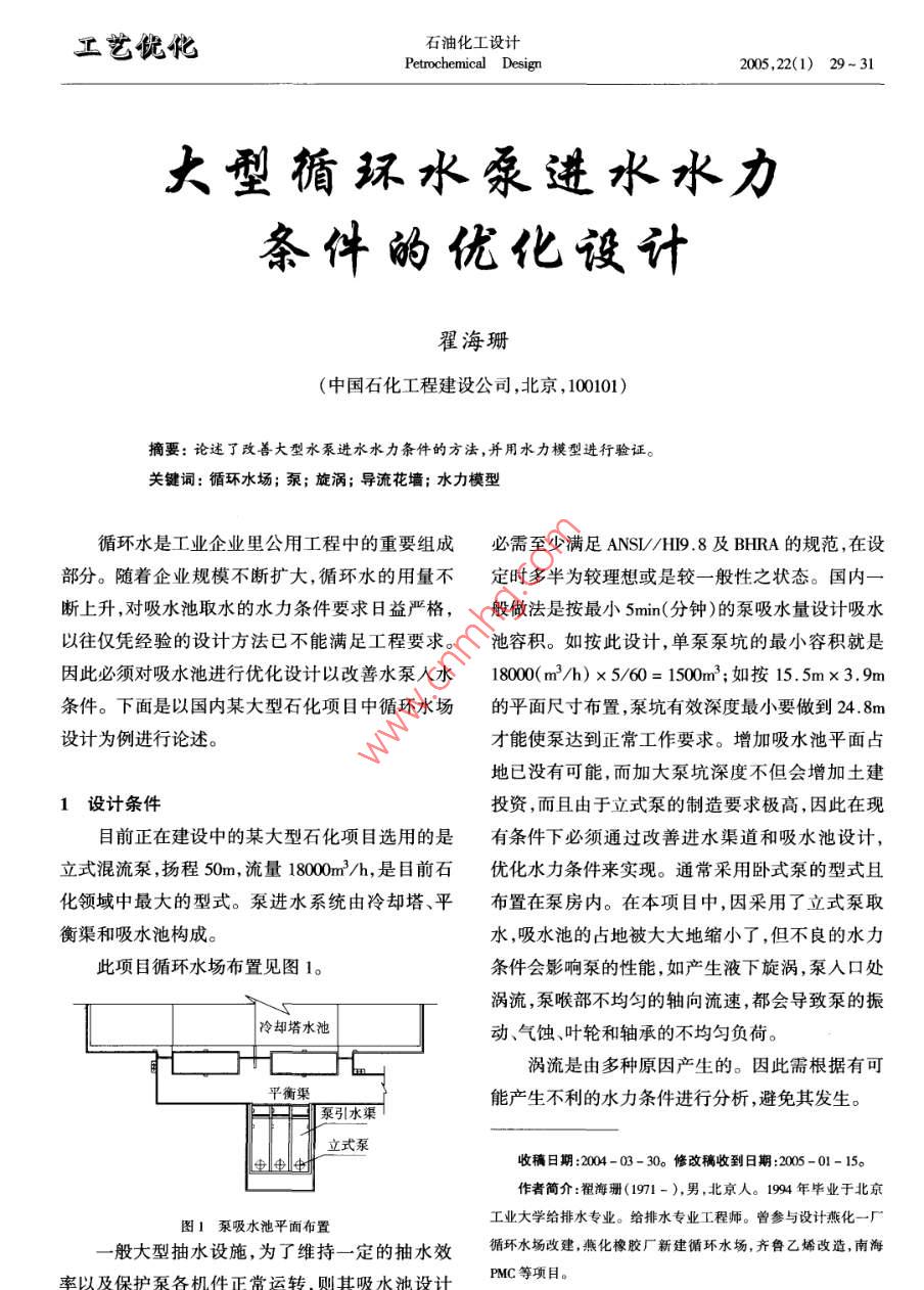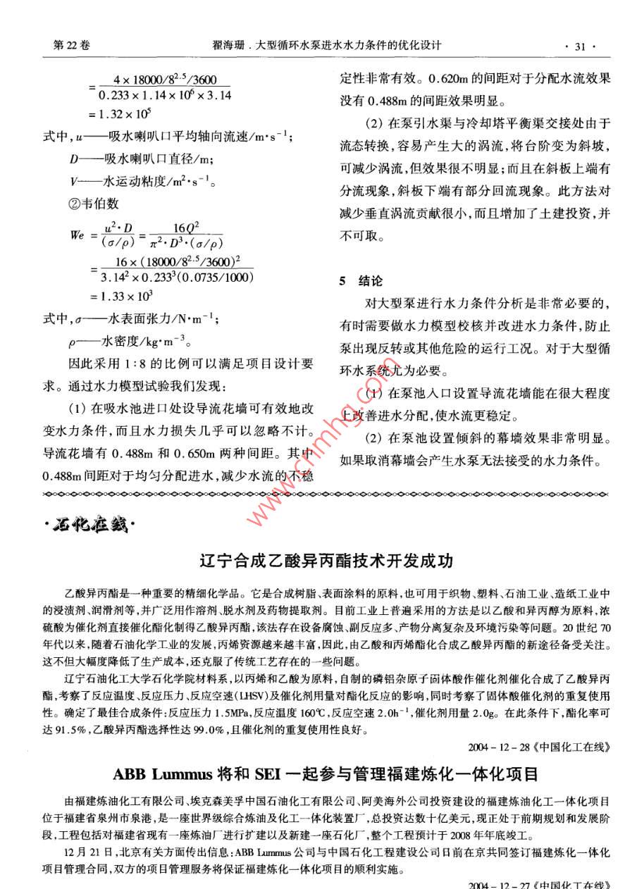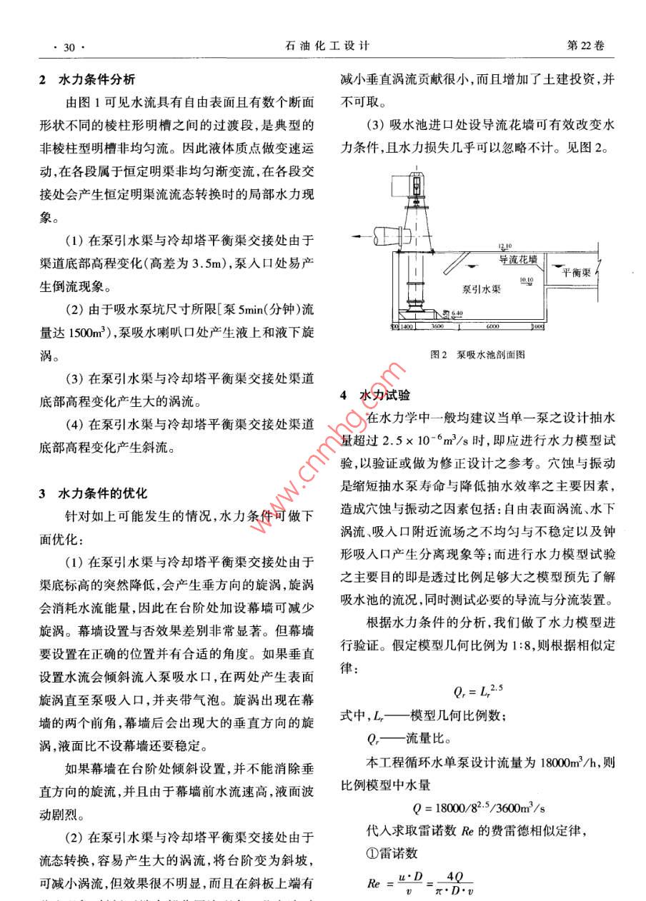 工藝優(yōu)化石油化工設計Petrochemical Design2005.22(1) 29- 31大型循環(huán)水泵進水水力條件的優(yōu)化設計翟海珊(中國石化工程建設公司,北京,100101)摘要:論述了改善大型水泵進水水力條件的方法,并用水力模型進行驗證。關鍵詞:循環(huán)水場;泵;旋渦;導流花墻;水力模型循環(huán)水是工業(yè)企業(yè)里公用工程中的重要組成必需至少滿足ANSI//HI9.8及BHRA的規(guī)范,在設部分。隨著企業(yè)規(guī)模不斷擴大,循環(huán)水的用量不定時多半為較理想或是較一般性之狀態(tài)。 國內一斷上升,對吸水池取水的水力條件要求日益嚴格,般做法是按最小5min(分鐘)的泵吸水量設計吸水以往僅憑經驗的設計方法已不能滿足工程要求。池容 積。如按此設計,單泵泵坑的最小容積就是因此必須對吸水池進行優(yōu)化設計以改善水泵人水18000(m3/h) x 5/60= 1500mm';如按15. 5mx 3.9m條件。下面是以國內某大型石化項目中循環(huán)水場的平面尺寸布置,泵坑有效深度最小要做到24.8m設計為例進行論述。才能使泵達到正常工作要求。增加吸水池平面占地已沒有可能,而加大泵坑深度不但會增加土建1設計條件投資,而且由于立式泵的制造要求極高,因此在現目前正在建設中的某大型石化項目選用的是有條件下必須通過改善進水渠道和吸水池設計,立式混流泵,揚程50m,流量18000m2/h, 是目前石優(yōu)化水力條件來實現。通常采用臥式泵的型式且化領域中最大的型式。泵進水系統(tǒng)由冷卻塔、平布置在泵房內。在本項目中,因采用了立式泵取衡渠和吸水池構成。水,吸水池的占地被大大地縮小了,但不良的水力此項目循環(huán)水場布置見圖1。條件會影響泵的性能,如產生液下旋渦,泵人口處渦流,泵喉部不均勻的軸向流速,都會導致泵的振冷 卻塔水池動、氣蝕、葉輪和軸承的不均勻負荷。渦流是由多種原因產生的。因此需根據有可平衡渠能產生不利的水力條件進行分析,避免其發(fā)生。泵引水渠立式泵中中業(yè)收稿日期:004-03- 30。修改稿收到日期:2005 -01- 15。作者簡介:翟海珊(1971-),男,北京人。1994 年畢業(yè)于北京.工業(yè)大學給排水專業(yè)。給排水專業(yè)工程師。曾參與設計燕化-廠圖1泵吸水池平 面布置一般大型抽水設施,為了維持- -定的抽水效循環(huán)水場改建,燕化橡膠廠新建循環(huán)水場,齊魯乙烯改造,南海率以及保護泵各機件正常運轉.則其吸水池設計PMC等項目?!?0.石油化工設計第22卷2水力條件分析減小垂直渦流貢獻很小,而且增加了土建投資,并由圖1可見水流具有自由表面且有數個斷面不可取。形狀不同的棱柱形明槽之間的過渡段,是典型的(3)吸水池進口處設導流花墻可有效改變水非棱柱型明槽非均勻流。因此液體質點做變速運力條件,且水力損失幾乎可以忽略不計。見圖2。動,在各段屬于恒定明渠非均勻漸變流,在各段交接處會產生恒定明渠流流態(tài)轉換時的局部水力現象。(1)在泵引水渠與冷卻塔平衡渠交接處由于一-王3:渠道底部高程變化(高差為3.5m),泵人口處易產導流花墻“平衡渠 A生倒流現象。泵引水渠(2)由于吸水泵坑尺寸所限[泵5min(分鐘)流正司烏型號1400.3600 二工量達1500m2),泵吸水喇叭口處產生液上和液下旋渦。圖2泵吸水池劑面圖(3)在泵引水渠與冷卻塔平衡渠交接處渠道4水力試驗底部高程變化產生大的渦流。(4)在泵引水渠與冷卻塔平衡渠交接處渠道在水力學中一般均建議當單- -泵之設計抽水量超過2.5x 10-*m2/s時,即應進行水力模型試底部高程變化產生斜流。驗,以驗證或做為修正設計之參考。穴蝕與振動是縮短抽水泵壽命與降低抽水效率之主要因素,3水力 條件的優(yōu)化針對如上可能發(fā)生的情況,水力條件可做下造成穴蝕與振動之因素包括:自由表面渦流、水下渦流、吸人口附近流場之不均勻與不穩(wěn)定以及鐘面優(yōu)化:形吸人口產生分離現象等;而進行水力模型試驗渠底標高的突然降低,會產生垂方向的旋渦,旋渦之主要目的即是透過比例足夠大之模型預先了解會消耗水流能量,因此在臺階處加設幕墻可減少吸水池的流況,同時測試必要的導流與分流裝置。旋渦。幕墻設置與否效果差別非常顯著。但幕墻根據水力條件的分析,我們做了水力模型進要設置在正確的位置并有合適的角度。如果垂直行驗證。假定模型幾何比例為1:8,則根據相似定設置水流會傾斜流人泵吸水口,在兩處產生表面律:Q,=L25.旋渦直至泵吸入口,并夾帶氣泡。旋渦出現在幕墻的兩個前角,幕墻后會出現大的垂直方向的旋式中,L,一模型幾何 比例數;Q,一流量比。渦,液面比不設幕墻還要穩(wěn)定。如果幕墻在臺階處傾斜設置,并不能消除垂本工程循環(huán)水單泵設計流量為18000m3/h, 則直方向的旋流,并且由于幕墻前水流速高,液面波比例模型中水量Q = 18000/82./3600m2/s動劇烈。(2)在泵引水渠與冷卻塔平衡渠交接處由于代人求取雷諾數Re的費雷德相似定律,流態(tài)轉換,容易產生大的渦流,將臺階變?yōu)樾逼拢倮字Z數u.D___ 40可減小渦流,但效果很不明顯,而且在斜板上端有Re =π.D.∪第22卷翟海珊.大型循環(huán)水泵進水水力條件的優(yōu)化設計●31.4x 18000/82-5/3600定性非常有效。0.620m的間距對于分配水流效果0.233x1.14x 10°x3. 14沒有0.488m的間距效果明顯。=1.32x 10(2)在泵引水渠與冷卻塔平衡渠交接處由于式中,u一-吸水喇叭口平均軸向流速/m's" ;流態(tài)轉換,容易產生大的渦流,將
