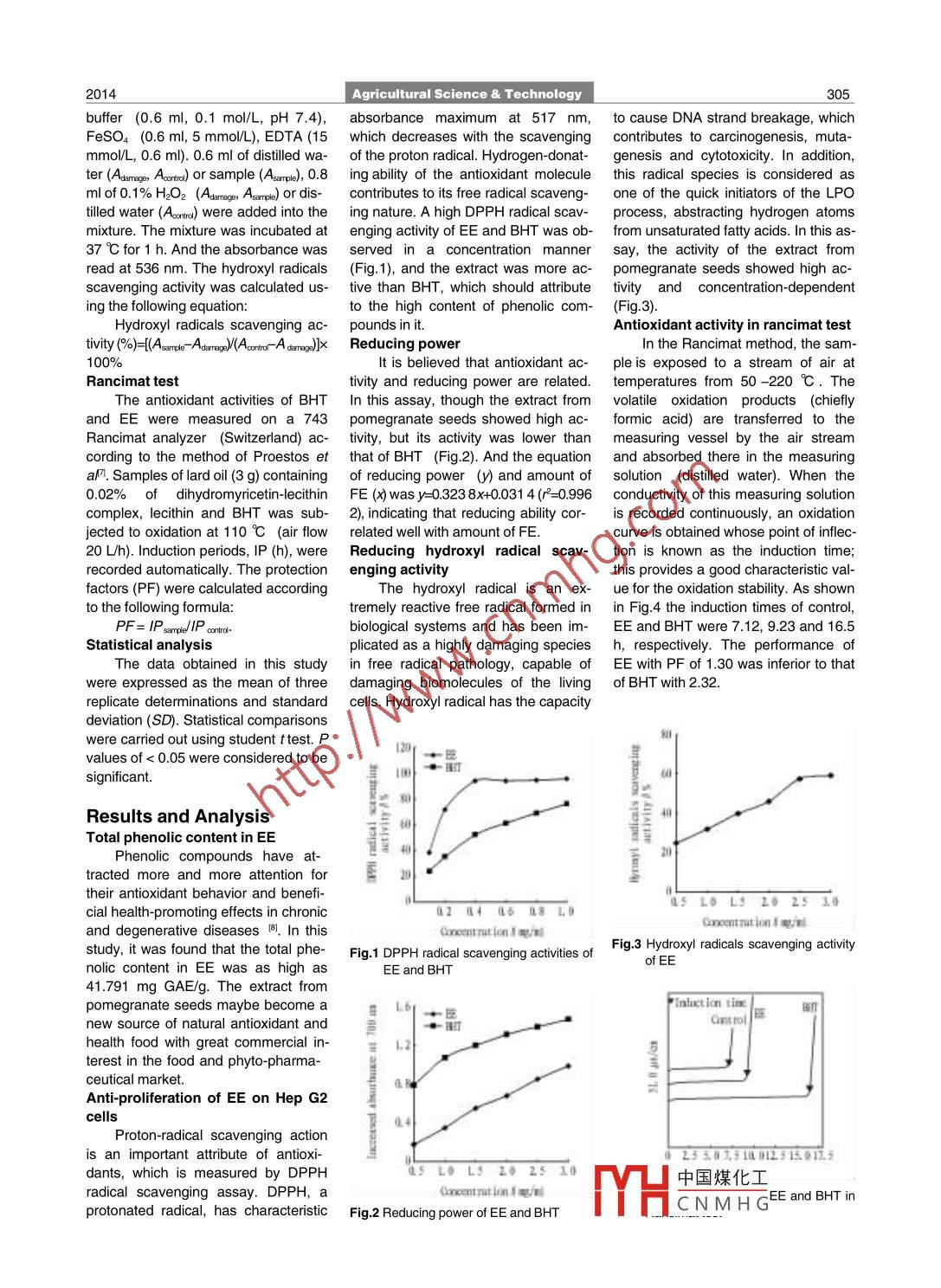 Agricultural Science Technology, 2014, 15(2): 304-306Copyright C) 2014, Information Institute of HAAS. All rights reservedStorage and processingAntioxidant Activity of Ethanol Extract ofPomegranate SeedYuzhong SHI, Yuan LU, Benguo LIU, Sasa ZUoSchool of Food Science, Henan Institute of Science and Technology, Xinxiang 453003, ChinaAbstract In this study, the ethanol extract of pomegranate seed was prepared andDPPH radical scavenging assayts antioxidant activities were investigated. It was found the total phenolic content in was done according to a publishedthe extract was as high as 41 791 mg GAE/g. And the extract showed high antioxidant activity measured as scavenging of DPPH radicals, hydroxyl radicals. It alsood 141. Briefly, 2 ml of DPPHexhibited strong antioxidant activity in reducing power and Rancimat test. These re-ethanol solution (0.2 mmol/L, inults demonstrated Pomegranate seeds could serve as a new source of natural an- ethanol)was incubated with differentoxidantconcentrations of FE and BHT(ButyKey words Pomegranate seed; Antioxidant; Free radicalslated hydroxytoluene). The reactionmixture was shaken and incubated inthe dark for 30 min, at room temperaomegranates (Punica grana- Plant Beijing Co, Ltd, China), about ture. And the absorbance was read attum) have been used exten- 1. 844 g of ethanol extract(EE)was 517 nm against ethanol Controls con-ively in the folk medicine of obtainedtaining ethanol instead of the antioximany cultures. Pomegranate seed is Determination of total phenolic con- dant solution, and blanks containingthe main waste fraction of pomeg. tent in EEethanol instead of dPPh solution wereranate fruits 1-2. In order to provide the100 mg of EE was dissolved in also made. the inhibition of the DPPHcorresponding development strategy ethanol and diluted to 100 ml with radical by the samples was calculatedthe ethanol extract (EE)of pomeg- ethanoldetermine total phenolic according to the following formularanate seed was prepared and itscontentDPPH scavenging activittioxidant activities were investigated inTPC was determined according to [Abs of control-(Abs of sample-Absthe present study.the Folin-Ciocalteu method 3. Briefly, of blank)/Abs of control%0. 2 ml of the extract was added to a 25 Reducing power assayMaterials and Methodsml volumetric flask. and additionalThe reducing power of EE andMaterials and chemicalsdistilled water was added to make a fi- BHT was determined according to theThe defatted pomegranate seeds nal volume of 10 ml. A reagent blank method of A. Strivastava et a/5. 1 ml ofprovided by Jisanduo Oil &Fatrepared using distilled water. the extract in ethanol was mixed withTechnology Co, Ltd( Beijing, China). Folin-Ciocalteu phenol reagent (2 ml) phosphate buffer (2.5 ml, 0.2 mol/L,Folin-Ciocalteu's phenol reagent and was added to the mixture and shaken pH 6.6)and potassium ferricyanide1,1-diphenyl-2-picrylhydrazyl(DPPH) vigorously. After 5 min, 5 ml of 5%(2.5 ml, 1%); the mixture was incubatwas purchased from Sigma. Gallic Na CO3 solution was added with mix- ed at 50C for 20 min. A portion(2.5acid was the product of BBL. Other ing. The solution was immediately di- ml)of trichloroacetic acid (10%)washemicals were of analytical gradeluted to 25 ml with distilled water and added to the mixture, which was thenPreparation of the ethanol extractixed thoroughly and then allowed to centrifuged at 3 000 r/min for 10 minstand for 90 min. After that. the ab- The upper layer of solution (2.5 ml)Powdered pomegranate seed(50 sorbance was measured at 750 nm was mixed with distilled water (2.5 ml)g)was soaked in 500 ml of 80% versus the prepared blank. The total and FeCl(0.5 ml, 0.1%), and the ab-ethanol, sonicated for 30 min and then phenolic content of the sample was sorbance was measured at 700 nmfiltered. The filtrate was concentrated expressed as gallic acid equivalents Increased absorbance of reaction mixunder vacuum at 45C and freeze- (mg GAE/ml)ture indicated increased reducingdried( Four-Ring Science Instrument DPPH radical scavenging assaypoweSupported by Foundation for Science and Technology Research Program of Henan say oxyl radicals scavenging as-Hydrprovince (132102110007: 102102210194): Natural Science Foundation of EducationThe hydroxyl radical scavengingDepartment in Henan province(2011A550006): Program for Innovative Research Team activity of the extract was determined(in Science and Technology) in University of Henan Province(13IRTSTHNO06)中國(guó)煤化工 of Jin et a/ACorrespondingauthorE-mail:syz6511@163.comReceived: January 2, 2014 Accepted: February 2, 2014anthroline (5CNMHGh phosphateAgricultural Science Technologybuffer (0.6 ml, 0. 1 mol/L, pH 7. 4), absorbance maximum at 517 nm, to cause DNA strand breakage, whichFeSO4(0.6 ml, 5 mmol/ L), EDTA(15 which decreases with the scavenging contributes to carcinogenesis, mutammol/L, 0.6 ml). 0.6 ml of distilled wa- of the proton radical. Hydrogen-donat- genesis and cytotoxicity. In additionter(Adarece, Aortro )or sample(Asarrple), 0.8 ing ability of the antioxidant molecule this radical species is considered asml of 0. 1%H2O2(Damege, Asarrple)or dis- contributes to its free radical scaveng- one of the quick initiators of the LPOtilled water(Aoorntrod)were added into the ing nature a high DPPH radical scav- process, abstracting hydrogen atomsmixture. The mixture was incubated at enging activity of EE and BHT was ob- from unsaturated fatty acids. In this as37C for 1 h And the absorbanceserved in a concentration manner say, the activity of the extract fromread at 536 nm. The hydroxyl radicals (Fig. 1), and the extract was more ac- pomegranate seeds showed high acscavenging activity was calculated us- tive than BHT, which should attribute tivity and concentration-dependenting the following equationto the high content of phenolic com-(Fig 3)Hydroxyl radicals scavenging ac- pounds in itAntioxidant activity in rancimat testtivity (%)=[(Asample-AdarregeM(Aontror-A derrege)]x Reducing powerIn the ran
