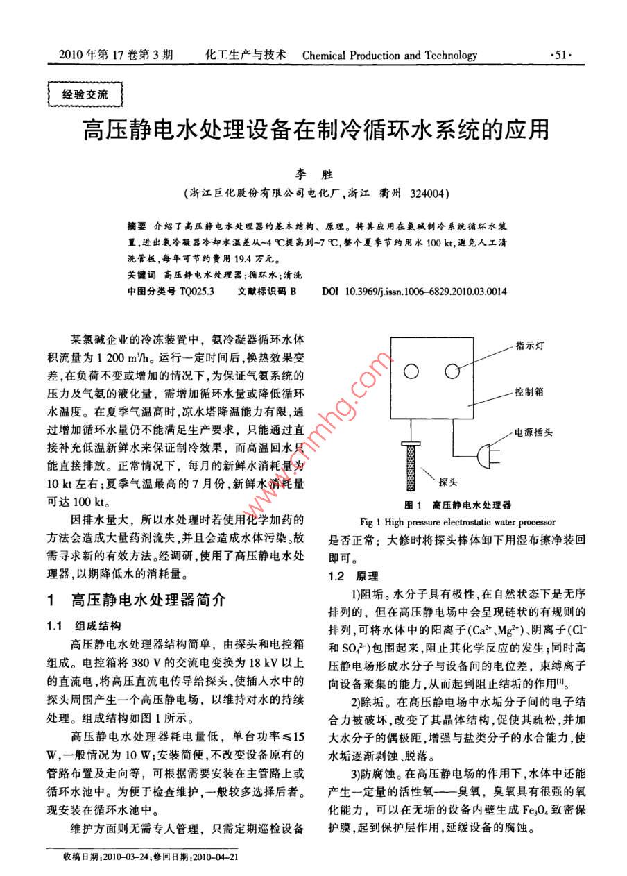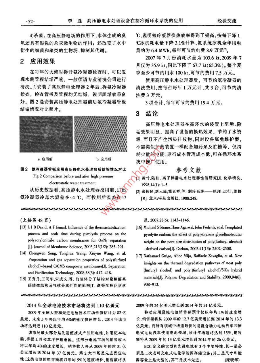 2010年第17卷第3期化工生產(chǎn)與技術(shù)Chemical Production and Technology.51.經(jīng)驗(yàn)交流高壓靜電水處理設(shè)備在制冷循環(huán)水系統(tǒng)的應(yīng)用李勝(浙江巨化股份有限公司電化廠,浙江衢州324004)摘要介紹了高壓靜電水處理器的基本結(jié)構(gòu)、原理。將其應(yīng)用在氯堿制冷系統(tǒng)循環(huán)水裝置,進(jìn)出氨冷凝器冷卻水溫差從~4 C提高到~7 C,整個(gè)夏季節(jié)約用水100 kt,避免人工清洗管板,每年可節(jié)約費(fèi)用19.4 萬(wàn)元。關(guān)鍵詞高壓靜電水處理器;循環(huán)水;清洗中圖分類號(hào)TQ025.3文獻(xiàn)標(biāo)識(shí)碼BDOI 10396/j.ssn.1006 -6829.2010.03.0014某氯堿企業(yè)的冷凍裝置中,氨冷凝器循環(huán)水體. 指示燈積流量為1 200 m/h。運(yùn)行一定時(shí)間后,換熱效果變差,在負(fù)荷不變或增加的情況下,為保證氣氨系統(tǒng)的壓力及氣氨的液化量,需增加循環(huán)水量或降低循環(huán). 控制箱水溫度。在夏季氣溫高時(shí),涼水塔降溫能力有限,通過(guò)增加循環(huán)水量仍不能滿足生產(chǎn)要求,只能通過(guò)直。電源插頭接補(bǔ)充低溫新鮮水來(lái)保證制冷效果,而高溫回水只能直接排放。正常情況下,每月的新鮮水消耗量為10 kt左右;夏季氣溫最高的7月份,新鮮水消耗量探頭可達(dá)100 kt。圖1高壓靜電水處理器因排水量大,所以水處理時(shí)若使用化學(xué)加藥的Fig 1 High presure electrostatic waler processor方法會(huì)造成大量藥劑流失,并且會(huì)造成水體污染。故是否正常;大修時(shí)將探頭棒體卸下用濕布擦凈裝回需尋求新的有效方法。經(jīng)調(diào)研,使用了高壓靜電水處即可。理器,以期降低水的消耗量。1.2 原理1高壓靜電水處理 器簡(jiǎn)介1)阻垢。水分子具有極性,在自然狀態(tài)下是無(wú)序排列的,但在高壓靜電場(chǎng)中會(huì)呈現(xiàn)鏈狀的有規(guī)則的1.1組成結(jié)構(gòu)排列,可將水體中的陽(yáng)離子(Ca2*、Mg*)、陰離子(C1-高壓靜電水處理器結(jié)構(gòu)簡(jiǎn)單,由探頭和電控箱和S0,2)包圍起來(lái),阻止其化學(xué)反應(yīng)的發(fā)生;同時(shí)高組成。電控箱將380 V的交流電變換為18kV以上壓靜電場(chǎng)形成水分子與設(shè)備間的電位差,束縛離子的直流電,將高壓直流電傳導(dǎo)給探頭,使插人水中的向設(shè)備聚集的能力,從而起到阻止結(jié)垢的作用"。探頭周圍產(chǎn)生-一個(gè)高壓靜電場(chǎng),以維持對(duì)水的持續(xù)2)除垢。在高壓靜電場(chǎng)中水垢分子間的電子結(jié)處理。組成結(jié)構(gòu)如圖1所示。合力被破壞,改變了其晶體結(jié)構(gòu),促使其疏松,并加高壓靜電水處理器耗電量低,單臺(tái)功率≤15大水分子的偶極距,增強(qiáng)與鹽類分子的水合能力,使W,-般情況為10W;安裝簡(jiǎn)便,不改變?cè)O(shè)備原有的水垢逐漸剝蝕、脫落。管路布置及走向等,可根據(jù)需要安裝在主管路上或3)防腐蝕。在高壓靜電場(chǎng)的作用下,水體中還能循環(huán)水池中。為便于檢查維護(hù),- -般較多選擇后者。產(chǎn)生- -定量的活性氧一-臭氧, 臭氧具有很強(qiáng)的氧現(xiàn)安裝在循環(huán)水池中。化能力,可以在無(wú)垢的設(shè)備內(nèi)壁生成FesO4致密保維護(hù)方面則無(wú)需專人管理,只需定期巡檢設(shè)備護(hù)膜,起到保護(hù)層作用,延緩設(shè)備的腐蝕。收稿日期:2010-03- -24:修回8期:2010-04-21.52.李勝高壓靜電水處理設(shè)備在制冷循環(huán)水系統(tǒng)的應(yīng)用經(jīng)驗(yàn)交流4)殺菌。在高壓靜電場(chǎng)的作用下,水體生成的臭C,說(shuō)明氨冷凝器換熱效率得到了提高。按每下降1氧還具有很強(qiáng)的殺滅微生物的作用;還改變了水中C冰機(jī)耗電量下降3.1%計(jì)算,氨系統(tǒng)冰機(jī)全年用電術(shù)生的細(xì)菌和藻類的生物場(chǎng),抑制其代謝。量約為6.4 MWh,每年可節(jié)約電費(fèi)8.9萬(wàn)元內(nèi)。2007年7月份消耗水量為103.6 kt,2009年72應(yīng)用效果月僅為35.9 kt,同比下降了67.7 kt(65.3%)。整個(gè)夏在每年的大修時(shí)拆開氨冷凝器檢查時(shí),可以發(fā)季至少可節(jié)約用水100 kt,可節(jié)約費(fèi)用7.5萬(wàn)元?,F(xiàn)水側(cè)管程結(jié)垢嚴(yán)重,--般須請(qǐng)專業(yè)清洗公司進(jìn)行使用高壓靜電水處理器后,可節(jié)約氨冷凝器的清洗。而安裝了高壓靜電處理器2年后,拆氨冷凝器清洗費(fèi)用,按每臺(tái)每年1萬(wàn)元計(jì),共3臺(tái),可節(jié)約清檢查,檢查管板及管程均無(wú)結(jié)垢,說(shuō)明阻垢效果良洗費(fèi)3萬(wàn)元。好。圖2是安裝高壓靜電處理器前后氨冷凝器管板3項(xiàng)合計(jì),每年可節(jié)約費(fèi)用19.4萬(wàn)元。,結(jié)垢情況對(duì)比照片。3結(jié)論高壓靜電水處理器在循環(huán)水的裝置上阻垢、除垢效果明顯,提高了設(shè)備的換熱效果,節(jié)約了水資源,而且不產(chǎn)生污染排放物,同時(shí)設(shè)備屬免維護(hù)型,不需類似加藥裝置一樣配備加藥泵及貯槽等,僅消耗少量的電能,運(yùn)行成本管理成本低,可在循環(huán)水系且應(yīng)用前b.應(yīng)用后統(tǒng)中推廣使用。圖2氨冷凝器管板應(yīng)用高壓靜電水處理前后結(jié)垢情況對(duì)比參考文獻(xiàn)Fig 2 Comparison before and after high pressure[1]黃竹,陸柱.離子棒靜電水處理器性能研究]化學(xué)消洗,electrostatic water treatment1998,14(1); 1-5.從歷史數