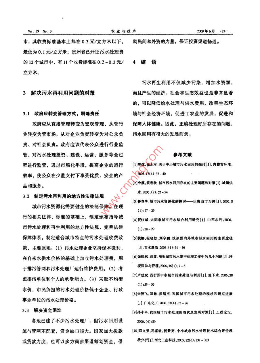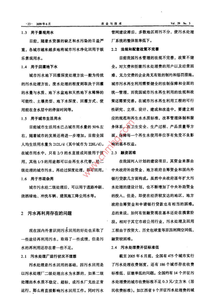 第29卷第3期農(nóng)業(yè)與技術(shù)vd.29N.3200年6月城市污水回用的探討國(guó)洪琴徐敏鐘卓趙志勇遼寧省水文水資源勘測(cè)局本溪分局,遼寧本漢11700[摘要]城市污水易于處理,再生利用阜高,效益墨蕃。文章綜逑了國(guó)內(nèi)外污水四用的主要遼徑以及存在的問(wèn)題,最后提出了解決問(wèn)題的對(duì)策。關(guān)鍵詞]城市污水;再利用;處理中圖分類(lèi)號(hào):X703文獻(xiàn)標(biāo)識(shí)碼:C水資源是經(jīng)濟(jì)社會(huì)可持續(xù)發(fā)展的重要戰(zhàn)略性行的途徑。本文將國(guó)內(nèi)外比較成熟的污水回用途資源和基礎(chǔ)性自然資源。隨著人口的增加,經(jīng)濟(jì)徑介紹如下。社會(huì)的發(fā)展,水資源的供需矛盾日漸突出。以本溪市為例,多年平均地表水資源量1國(guó)內(nèi)外污水回用的主要途徑32.48億立方米,地下水資源量70億立方米,水資源總量3256億立方米。但是,在加入人類(lèi)系1.1用于農(nóng)業(yè)灌溉統(tǒng)后,情況就大不一樣。1985年本溪市水資源總一般經(jīng)二級(jí)處理的城市污水出水水質(zhì)都能滿(mǎn)量31.95億立方米,人口142.3萬(wàn),人均水資源足農(nóng)業(yè)灌溉用水標(biāo)準(zhǔn)。在國(guó)內(nèi)許多城市,用于此量2245立方米;2000年,本溪市人口157.1萬(wàn)項(xiàng)的水量占總處理量的比重較大。污水回用于農(nóng)人,人均水資源量2073立方米。從以上數(shù)據(jù)可以田灌溉,對(duì)水質(zhì)要求也不高,而且還可給土壤提看出,相對(duì)于某一地區(qū)而言,多年平均水資源總供肥份,減少化肥用量,是一種符合可持續(xù)發(fā)展量是一個(gè)定數(shù),但人均水資源量是逐年減少的,已經(jīng)嚴(yán)重制約了經(jīng)濟(jì)社會(huì)的發(fā)展,因此,多途徑的回用方式。開(kāi)發(fā)水資源利用的方式方法迫在眉捷。1.2用于工業(yè)生產(chǎn)隨著社會(huì)的進(jìn)一步城市化,城市污水的排放城市污水用于工業(yè)生產(chǎn)用水的最大好處在于量會(huì)越來(lái)越大。城市污水主要包括工業(yè)污水和生可以代替飲用水,因?yàn)樵诤芏嗲闆r下,工業(yè)用水活污水。目前,城市污水的處理方法是經(jīng)過(guò)污水對(duì)水質(zhì)的要求遠(yuǎn)低于飲用水標(biāo)準(zhǔn)。因此,城市污處理廠(chǎng)處理直接排入江河。以本溪市為例,現(xiàn)有水回收對(duì)于工業(yè)企業(yè)和市政當(dāng)局都有很大的益處。2座城市污水處理廠(chǎng),每天處理污水35萬(wàn)立方目前,隨著社會(huì)的快速發(fā)展,工業(yè)相對(duì)于其他行米。每年處理污水1275萬(wàn)立方米。如何利用城業(yè)來(lái)說(shuō)對(duì)水的需求量最大,因此再生水回用于工市污水,增大水資源可利用量,緩解日益突出的業(yè)生產(chǎn)的潛力巨大。特別是對(duì)于工業(yè)生產(chǎn)用水和水資源供需矛盾,城市污水回用是一種性?xún)r(jià)比可工業(yè)冷卻水而言。23·200年6月農(nóng)業(yè)與技d.a、313用于景觀(guān)用水管網(wǎng)建設(shè)滯后,多數(shù)地區(qū)雨污不分,使污水處理目前,隨著水資源的缺乏和水污染的日益嚴(yán)廠(chǎng)系統(tǒng)的整體效率低下。重,各城市越來(lái)越多地將城市污水凈化回用于娛2.,2法規(guī)和配套政策不完善樂(lè)景觀(guān)用水。目前我國(guó)污水管理的法規(guī)不完善,政策不健1.4用于回灌地下水全。對(duì)欠費(fèi)和拒繳污水處理費(fèi)的用戶(hù)以及經(jīng)營(yíng)困城市污水地下回灌深度處理方法一般為傳統(tǒng)難、無(wú)力交費(fèi)的企業(yè)尚無(wú)有效的制約和懲罰措施。的污水處理方法,廢水處理的程度則取決于回灌城市污水再生利用需要健全的法制保障和全面的的水量與水質(zhì)、地下水盆地和天然地下水稀釋的統(tǒng)一管理,而我國(guó)城市污水再生利用的法規(guī)和政可能性、土壤類(lèi)型、地下水深度、回灌方式、使策還需要完善。在城市污水再生利用工程的可行用前在含水層中的停留時(shí)間等。性研究、立項(xiàng)、設(shè)計(jì)、建成和改造中,要建立相1.5用于城市生活用水應(yīng)的規(guī)范和再生水水質(zhì)標(biāo)準(zhǔn),改革管理體制和服前城市生活用水已占城市用水量的50%左務(wù)體系,在衛(wèi)生安全、生產(chǎn)過(guò)程、產(chǎn)品質(zhì)量等方右,隨著城市的發(fā)展還將進(jìn)一步增加。目前全國(guó)面,保障每一個(gè)再生水使用單位享有免受不良影人均生活用水量為212L/d(其中城市為2L/d)。響的基本權(quán)益在城市用水中,只有2/3的水直接或間接用于飲23融資困難用,其他1/3的用途都可以由再生水代替。經(jīng)二在我國(guó)列入計(jì)劃的建設(shè)項(xiàng)目,其資金來(lái)源由級(jí)處理的城市污水,再經(jīng)過(guò)深度處理,即可回用。中央政府補(bǔ)助資金、地方政府自籌資金和國(guó)內(nèi)外1.6用于市政雜用銀行貸款幾方面構(gòu)成。雖然中央政府逐年擴(kuò)大污城市污水經(jīng)二級(jí)處理后,可以用于道路沖刷、水處理的建設(shè)計(jì)劃,也不斷增加了中央補(bǔ)助資金澆灑綠地、沖洗車(chē)輛、建筑施工降塵用水等的投入,但是,即使在經(jīng)濟(jì)較發(fā)達(dá)的地區(qū),地方政府自籌資金和申請(qǐng)銀行貸款也有相當(dāng)?shù)睦щy。2污水再利用存在的問(wèn)題總的來(lái)說(shuō),如何有效融資現(xiàn)在基本還處在摸索階