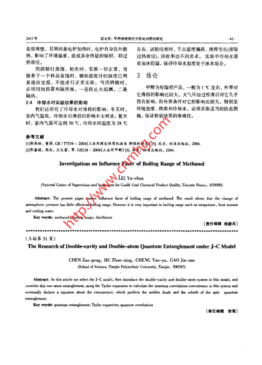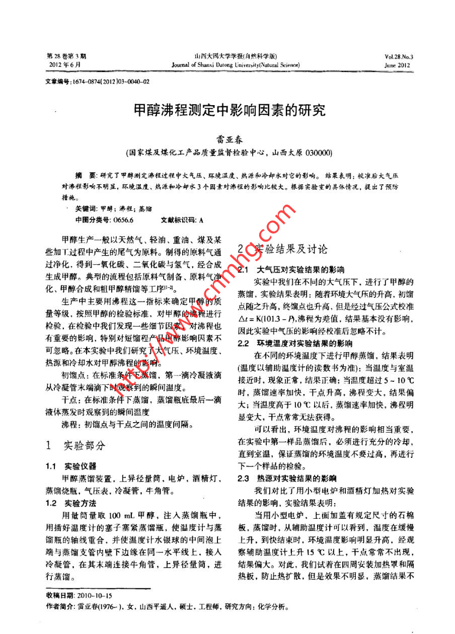 第28卷第3期山西大同大學(xué)學(xué)報{自然科學(xué)版)Vol.28.No.32012年6月Journal of Shanxi Datong iniversily(Nalural Scienca)June 2012文章編號:1674 -0874( 2012 )03-0040-02甲醇沸程測定中影響因素的研究雷亞春(國家煤及煤化工產(chǎn)品質(zhì)量監(jiān)督檢驗中心,山西太原030000)摘要:研究了 甲醇測定沸程過程中大氣壓、環(huán)境溫度、熱源和冷卻水對它的影響。結(jié)果表明: 校準(zhǔn)后大氣壓對沸程影響不明顯,環(huán)境溫度、熱源和冷卻水3個因素對沸程的影響比較大。根據(jù)實驗室的具體情況,提出了預(yù)防措施。關(guān)鍵詞:甲醇;沸程;蒸餾中圈分類號: 0656.6文獻(xiàn)標(biāo)識碼: A甲醇生產(chǎn)- -般以天然氣、輕油、重油、煤及某些加工過程中產(chǎn)生的尾氣為原料。制得的原料氣通2實驗結(jié)果及討論過凈化,得到-氧化碳、二氧化碳與氫氣,經(jīng)合成2.1大氣壓對實驗結(jié)果的影響生成甲醇。典型的流程包括原料氣制備.原料氣凈實驗中我們在不同的大氣壓下,進行了甲醇的化、甲醇合成和粗甲醇精餾等工序-。生產(chǎn)中主要用沸程這--指標(biāo)來確定甲醇的質(zhì)蒸餾,實驗結(jié)果表明:隨著環(huán)境大氣壓的升高,初餾量等級,按照甲醇的檢驗標(biāo)準(zhǔn),對中醇的沸程進行點隨之升高,終餾點也升高,但是經(jīng)過氣壓公式校準(zhǔn)檢驗,在檢驗中我們發(fā)現(xiàn)一些細(xì)節(jié)因素,對沸程也Ot= K(1013- P,沸程為差值,結(jié)果基本沒有影響,有重要的影響,特別對短餾程產(chǎn)品甲醇影響因素不因此實驗中氣壓的影響經(jīng)校準(zhǔn)后忽略不計??珊雎?。在本實驗中我們研究了大氣壓、環(huán)境溫度.2.2環(huán)境溫度對實驗結(jié)果的影響在不同的環(huán)境溫度下進行甲醇蒸餾,結(jié)果表明熱源和冷卻水對甲醇沸程的影響。初餾點:在標(biāo)準(zhǔn)條件下蒸餾,第-滴冷凝液滴(溫度以輔助溫度計的讀數(shù)書為準(zhǔn)):當(dāng)溫度與室溫接近時,現(xiàn)象正常,結(jié)果正確;當(dāng)溫度超過5~ 10從冷凝管末端滴下時觀察到的瞬間溫度。干點:在標(biāo)準(zhǔn)條件下蒸餾,蒸餾瓶底最后一滴時,蒸餾速率加快,千點升高,沸程變大,結(jié)果偏大;當(dāng)溫度高于10 C以后,蒸餾速率加快,沸程明液體蒸發(fā)時觀察到的瞬間溫度顯變大,干點常常無法獲得。沸程:初餾點與干點之間的溫度間隔。可以看出,環(huán)境溫度對沸程的影響相當(dāng)重要,1實驗部分在實驗中第一-樣品蒸餾后,必須進行充分的冷卻,直到室溫,保證蒸餾的環(huán)境溫度不要過高,再進行1.1 實驗儀器下一個樣品的檢驗。甲醇蒸餾裝置,上異徑量筒,電爐,酒精燈,2.3熱源對實驗結(jié)果的影響蒸餾燒瓶,氣壓表,冷凝管,牛角管。.我們對比了用小型電爐和酒精燈加熱對實驗1.2 實驗方法結(jié)果的影響,實驗結(jié)果表明:用量簡量取100mL甲醇,注入蒸餾瓶中,當(dāng)用小型電爐,上面加蓋有規(guī)定尺寸的石棉用插好溫度計的塞子塞緊蒸餾瓶,使溫度計與蒸板, 蒸餾時,從輔助溫度計可以看到,溫度在緩慢餾瓶的軸線重合,并使溫度計水銀球的中間泡上上升,到快結(jié)束時,環(huán)境溫度影響明顯升高,經(jīng)觀端與蒸餾支管內(nèi)壁下邊緣在同一水平線上,接入察輔助溫度計上升!5 C以上,干點常常不出現(xiàn),冷凝管,在其末端連接牛角管,上異徑量簡,進結(jié)果偏大。對此,我們試著在四周安裝加熱罩和隔行蒸餾。熱板,防止熱擴散,但是效果不明顯,蒸餾結(jié)果不收稿日期: 2010-10-15作者簡介:雷亞春(1976-),女,山西平遙人,碩士,工程師,研究方向:化學(xué)分析。2012年雷業(yè)春:甲醉沈程測定中影響閑索的研究.41.是很理想。其原因是電爐加熱時,電爐自身往外散左右,試驗結(jié)束時,干點溫度偏高,沸程變長(排除熱,影響了環(huán)境溫度,造成多余熱量的輻射,即過過熱效應(yīng)).回收率達(dá)不到要求。實驗中冷卻水需熱效應(yīng)。要加冰控溫,保持冷卻水溫度處于冰水混合。用酒精燈蒸餾,初次時,實驗一切正常,當(dāng)接著下一個樣品蒸餾時,輔助溫度計的溫度已明3結(jié)論顯超出室溫,不能進行正常實驗。當(dāng)用酒精時,必須用加熱罩和隔熱板,- -是防止火焰飄,二是甲醇為短餾程產(chǎn)品,一般為1 C左右,外界對隔熱。它沸程的影響比較大。大氣壓經(jīng)過校準(zhǔn)后對它幾乎2.4冷 卻水對實驗結(jié)果的影響沒有影響,但外界條件對它的影響比較大,特別是我們還研究了冷卻水對沸程的影響:冬天時,環(huán)境溫度、熱源和冷卻水,必須采取適當(dāng)?shù)姆婪洞胧覂?nèi)氣溫低,冷卻水對沸程的影響不太明顯;夏天施, 保證檢驗結(jié)果的準(zhǔn)確性。時,室內(nèi)氣溫可達(dá)到30 C,冷卻水的溫度為28 C參考文獻(xiàn)[I]郭燕玲,董蔚. GB1 T7534 - 2004《工業(yè)用揮發(fā)性有機液體沸程的測定》[S].北京:標(biāo)準(zhǔn)出版社, 2004.[2]郭鑫銘,周兵,王文君,等. GB338 - 2004《工業(yè)用甲醇》[S].北京:標(biāo)準(zhǔn)出版社, 2004.Investigatiom on Influence Facer of Boiling Range of MethanolLEI Ya-chun(National Center of Supervision and Inspection for Coal& Coal Chemical Product Quality .Taiyuan Shanxi, 030000)Abstract: The present paper studien infuence facer of boiling range of methanol. The result shows that the change ofatmospheric pressure has litle efect on boiling range. Howrver il is very important to boiling range such as temperture, heat resoureand cooling water.Key words