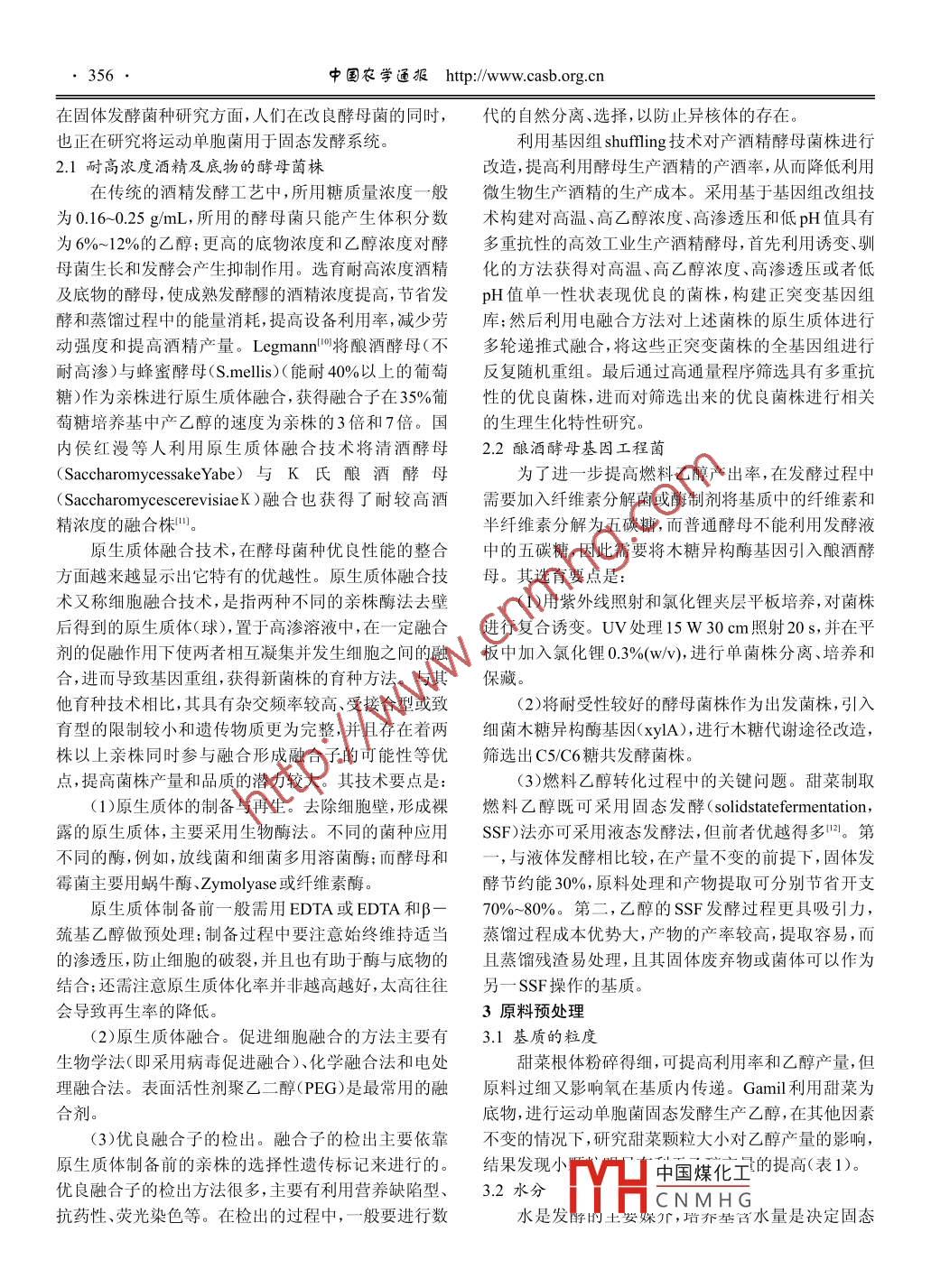 中國(guó)農(nóng)學(xué)過報(bào)2010,26(7):354-359Chinese agricultural Science Bulletin甜菜制取燃料乙醇關(guān)鍵技術(shù)及其研究進(jìn)展李文,王鑫,劉迎春',楊波2(吉林省農(nóng)業(yè)科學(xué)院農(nóng)村能源硏究所,長(zhǎng)春130033:ˉ吉林省農(nóng)業(yè)科學(xué)院洮南綜合試驗(yàn)站,吉林洮南137100摘要:分析了在不影響現(xiàn)有糧食作物種植結(jié)構(gòu)的前提下,利用“三北”地區(qū)邊際性土地資源發(fā)展甜菜乙醇能源的生產(chǎn)潛力及提高甜萊抗逆性和可發(fā)酵糖的調(diào)控途徑。介紹了甜萊原料預(yù)處理、發(fā)酵制取乙醇的高效菌株選育、發(fā)酵條件優(yōu)化與副產(chǎn)物綜合利用等甜萊酒精發(fā)酵技術(shù)的硏究與應(yīng)用進(jìn)展情況。認(rèn)為甜菜是一種抗鹽堿性很強(qiáng)的能源作物,在生物乙醇生產(chǎn)中具有重要價(jià)值。指出了甜萊乙醇產(chǎn)業(yè)發(fā)展必須解決的關(guān)鍵問題是利用邊際性土地生產(chǎn)優(yōu)質(zhì)甜萊原料,且需穩(wěn)定供應(yīng);高效低成夲的發(fā)酵菌種選育;為燃料乙醇生產(chǎn)過程中產(chǎn)生的副產(chǎn)品尋找出既環(huán)保又經(jīng)濟(jì)的利用途徑關(guān)鍵詞:甜菜;乙醇;邊際性土地;菌種選育中圖分類號(hào):S216文獻(xiàn)標(biāo)志碼:A論文編號(hào):2009-1957The Key Technologies and Advances in Research of AlcoholProduction from Sugar Beet FermentedLi Wen, Wang Xin', Liu Yingchun, Yang Bo(Institute of Energy Conversion, Jilin Academy of Agriculture Science, Changchun 130033Station for Agricultural Experimental Research in Taonan Jilin Province, Taonan Jilin 13710Abstract: Based on the premise of no effect on the present planting structure of grain crops, the paperanalyzed the potential productivity of energy of sugar beet ethanol and the regulation pathway to enhancestress-tolerance and fermentable sugars of sugar beet by using marginal land in the three north regions". Thepaper summarized the progress of research and application of alcohol fermentation of sugar beet, whichincluding technical methods of pretreatment for raw material, screening of efficient strains, optimizing offermentation conditions and multipurpose utilization of waste of alcohol fermentation. Sugar beet is kindenergy crops having strong ability of coping with salt and alkaline, which has important values for alcoholproduction. The paper indicated the key factors for industrialization of alcohol fermentation of sugar beet: it willsupply raw material stable by using marginal land, screening of cost-effective strains, seek theeco-environmental way to utilize waste of alcohol fermentationKey words: sugar beet; alcohol; marginal land; screening strain0引言作物。從20世紀(jì)90年代末,英國(guó)、法國(guó)和日本等一些中國(guó)是世界第二大能源消費(fèi)國(guó),能源供求矛盾突發(fā)達(dá)國(guó)家開始培育能源甜菜品種,并以甜菜為原料轉(zhuǎn)出。國(guó)際能源杋構(gòu)預(yù)測(cè):中國(guó)石油儲(chǔ)量只能開采17化燃料乙醇。在甜菜制取燃料乙醇效益日益得到肯年,此后中國(guó)將無油可采。為此,中國(guó)從2006年1月定,鹽堿荒漠化日趨惡化的情況下,為什么中國(guó)近年來開始實(shí)施可再生能源法,大力研究和開發(fā)生物質(zhì)能甜菜面積卻大幅度下降,甜菜乙醇產(chǎn)業(yè)發(fā)展緩慢?如源。甜菜( Betavulgaris L.)屬于一種抗逆性較強(qiáng)的能源何正確認(rèn)識(shí)能源甜菜在生物能源產(chǎn)業(yè)中的地位及如何基金項(xiàng)目:國(guó)家甜菜產(chǎn)業(yè)技術(shù)體系建設(shè)專項(xiàng)經(jīng)費(fèi)資助( nyct-25-01-0)第一作者簡(jiǎn)介:李文,男,1962年岀生,吉林省洮南市人,吉林省農(nóng)業(yè)科學(xué)院農(nóng)村能源研究所副所長(zhǎng),研究員,研究方向:能源植物遺傳改良與生物質(zhì)能利用。通信地址:130033長(zhǎng)春市凈月開發(fā)區(qū)彩宇大街1363號(hào)吉林省農(nóng)業(yè)科學(xué)院農(nóng)村能源中國(guó)煤化工m通訊作者:王鑫,男,1984年出生,吉林省洮南市人,助理研究員,研究方向:生物質(zhì)能轉(zhuǎn)化與CNMHG收稿日期:2009-09-23,修回日期:2009-10-26。李文等:甜菜制取燃料乙醇關(guān)鍵技術(shù)及其研究進(jìn)展355·適度發(fā)展甜菜乙醇產(chǎn)業(yè),需進(jìn)一步眀確。筆者試圖針菜起源于西亞、地中海沿岸及西歐一帶,具備各種抗逆對(duì)這一問題,就甜菜轉(zhuǎn)化燃料乙醇的關(guān)鍵技術(shù)及產(chǎn)業(yè)基因。甜菜經(jīng)二百余年人工栽培,適應(yīng)在舒適的條件發(fā)展作一探討。下生長(zhǎng)發(fā)育,使其某些抗逆機(jī)能逐漸衰退,某些基因由1利用邊際性土地生產(chǎn)優(yōu)質(zhì)甜菜原料于長(zhǎng)期未能充分表達(dá)而逐漸處于休眠狀態(tài),成為所謂甜菜抗鹽堿,是一種喜鈉作物,能夠在含鹽量的隱性基因?,F(xiàn)代科學(xué)硏究表明,只要探明激活基因0.4%以下的土壤上正常生長(zhǎng),含鹽量高于0.4%甜菜生的條件和方法,創(chuàng)造適當(dāng)?shù)沫h(huán)境與條件就可以將生物長(zhǎng)受到抑制。但抑制到什么程度,在怎樣的鹽堿脅體內(nèi)固有而處于休眠狀態(tài)的隱性基因加以激活,使生迫下甜菜仍能生存,在現(xiàn)有的資料中不夠明確。目前物自身的潛能得以充分發(fā)揮。抗逆基因的表達(dá)需要有在甜菜抗逆性方面資料很少,硏究不夠深入,致使在邊多種基因誘導(dǎo)劑從各種信號(hào)傳遞途徑去激發(fā)有關(guān)的基際性土地上種植甜