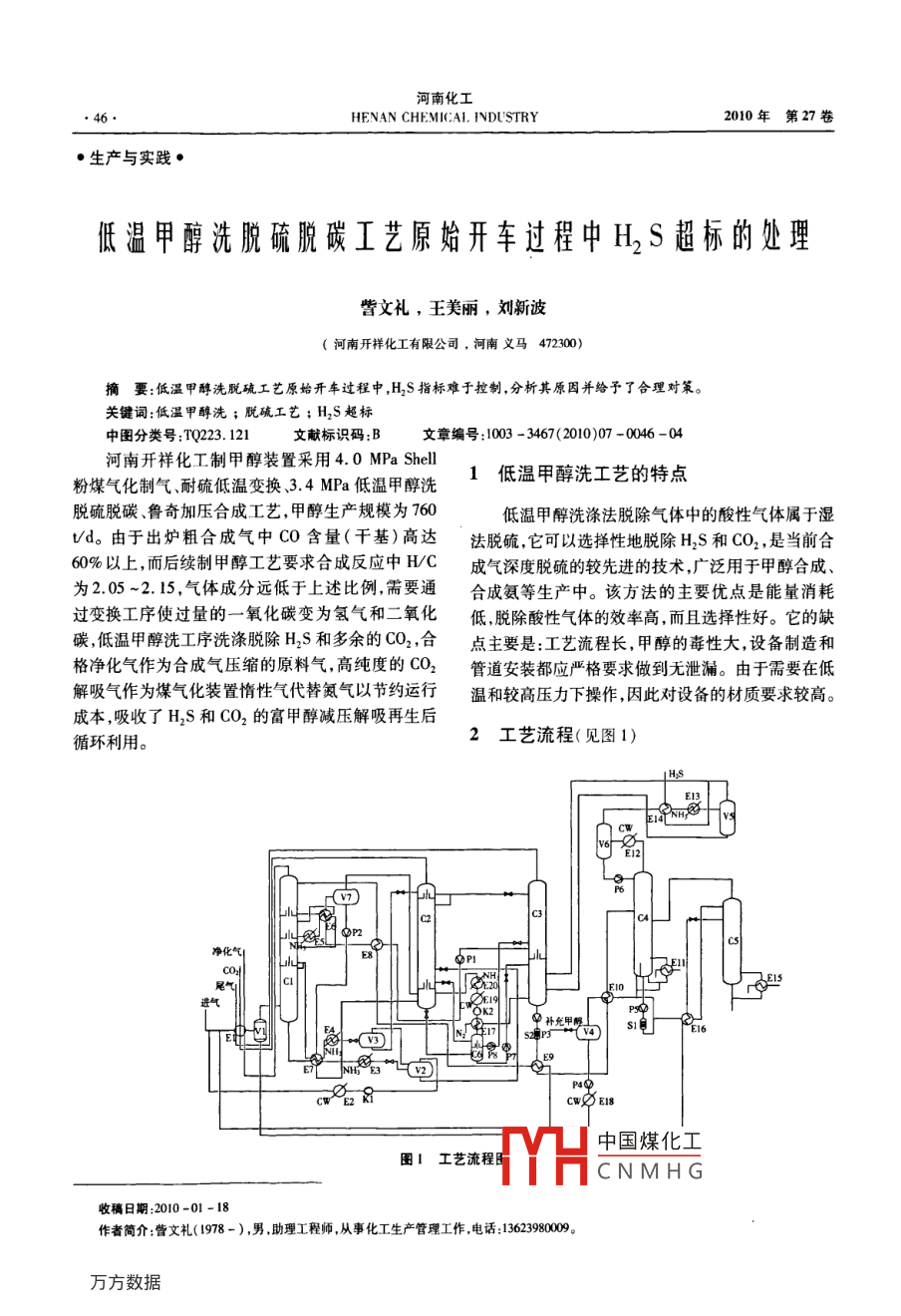 低溫甲醇洗脫硫脫碳工藝原始開車過程中H2S超標(biāo)的處理