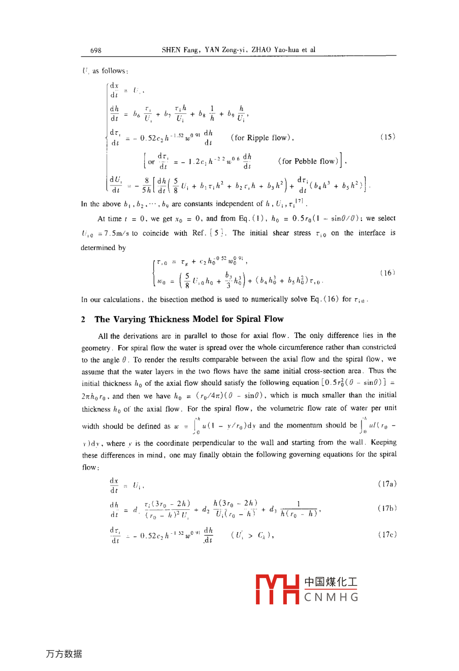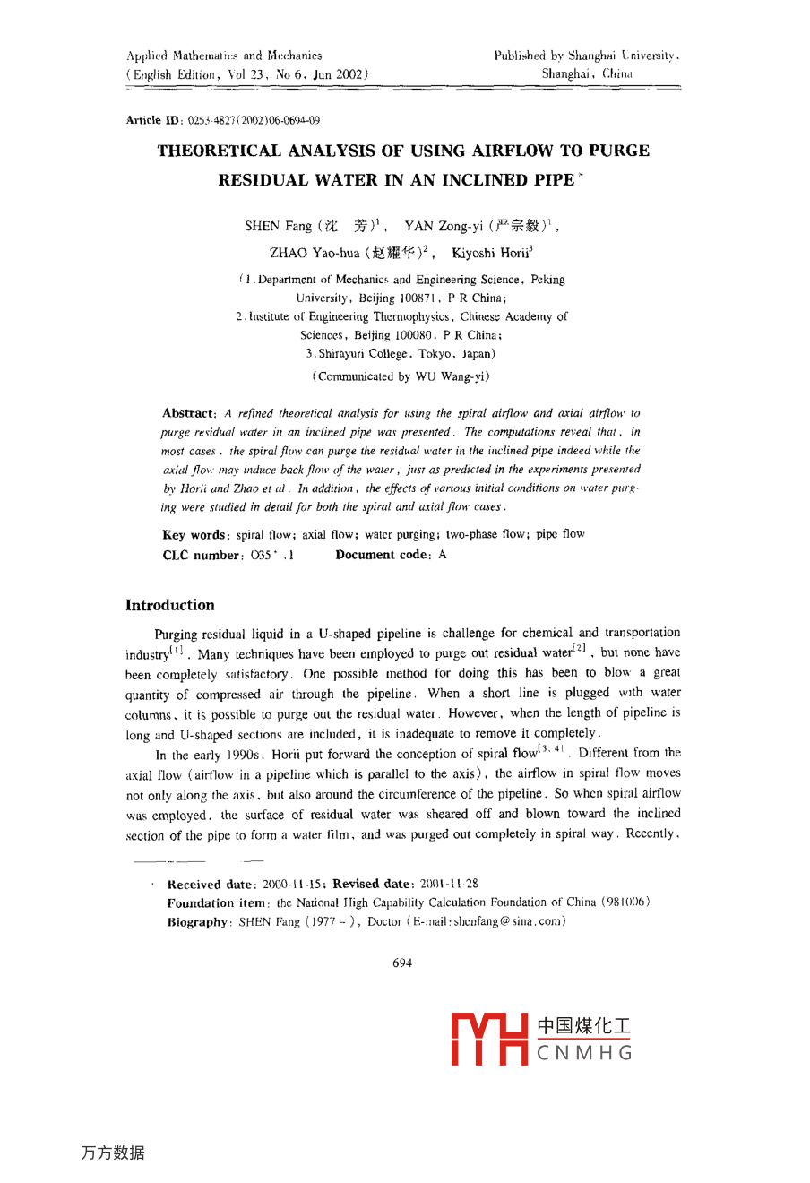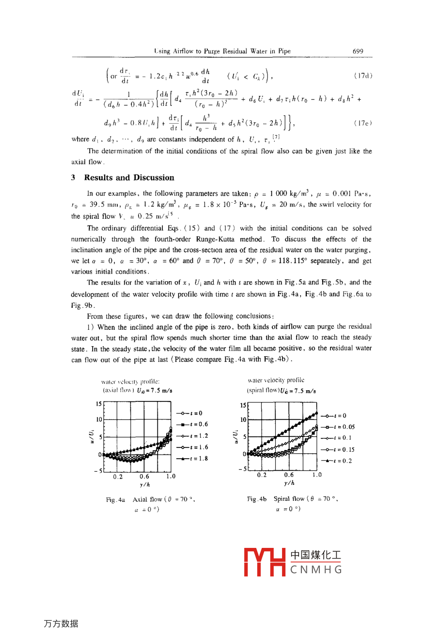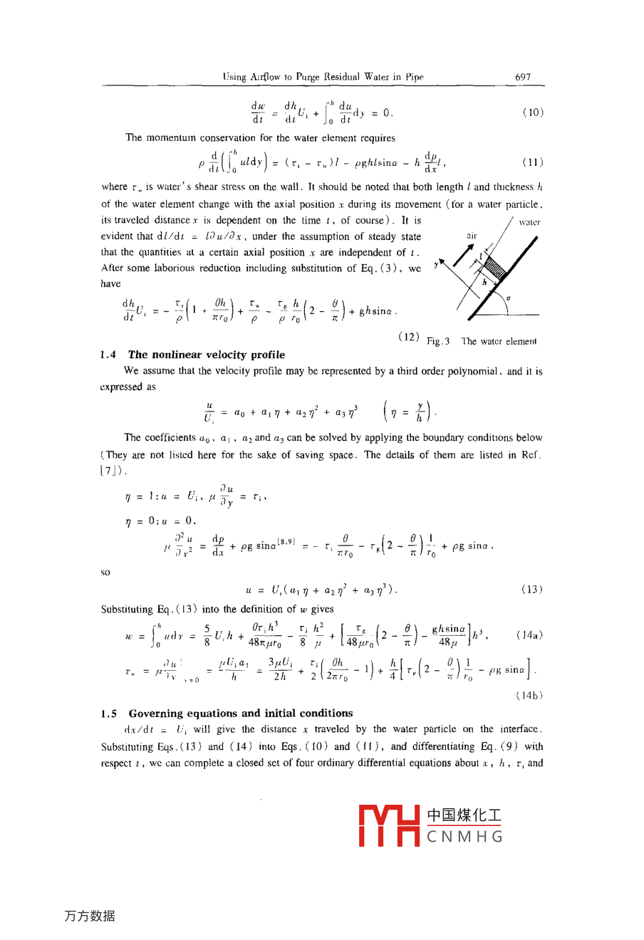 Applied Mathemalics and MechanicsPublished by Shanghai Liniverity .( English Edition, Vol 23, No 6. Jun 2002)Shanghai, ChinaArticle ID: 0253 4827<2002)06-0694-09THEORETICAL ANALYSIS OF USING AIRFLOW TO PURGERESIDUAL WATER IN AN INCLINED PIPE”SHEN Fang (沈芳), YAN Zong-yi (嚴宗毅)',ZHAO Yao-hua (趙耀華)2,Kiyoshi Hori'1.. Departmcnt of Mechanics and Engineering Science, PekingUniversity, Bejng 100871. P R China;2. Institute of Engineering Thernophysics, Chinese Academy ofSciences, Bejing 100080. P R China;3. Shirayuri College. Tokyo, Japan)(Communicaled by WU Wang-yi)Abstract: A refined theoretical analysis for using the spiral airflow and carial airflow' topurge residual water in an inclined pipe was presented. The computations reveal that, inmost cases. the spiral flow can purge the re sidual water in the inclined pipe indeed while theaxrial flowr may induce back flow of the water , just as predicted in the experiments presentedby Horii and Zhao et ul. In addition. the effects of warious initial conditions on water purg.ing were studied in derail for both the spiral and axial flow cases .Key words: spiral flow; axial flow; watcr purging; two-phase flow; pipe flowCLC number: 035° .1Document code: AIntroductionPurging residual liquid in a U-shaped pipeline is challenge for chemical and transportationindustry'! . Many techniques have been employed to purge out residual water'l ,but none haveheen completely sutisfactory. One possible imethod for doing this has been to blow a greatquantity of compressed air through lhe pipeline. When a shor line is plugged with watercolumns. it is possible to purge out the residual waler . However. when the length of pipeline islong and U-shaped sections are included ,it is inadequate to remove it completely.In the early 1990s, Hori put forward the conception of spiral flow'3.4. Different from theaxial flow (airflow in a pipeline which is parallel to the axis). the airflow in spiral flow movesnot only along the axis, but also around the circumference of the pipeline . So when spiral airflowas employed. the surface of residual water was sheared off and blown toward the inclincdsection of the pipe to form a water film, and was purged out completely in spiral way . Recently .Received date: 2000-11 !5; Revised date: 2001-11-28Foundation item: the Nationa! High Capability Calculation Foundation of China (98 1006)Biography: SHEN Fang (1977- ), Doctor (E- mail: shcnfang @ sina . com)中國煤化工MYHCNMHGUsing Airlow lo Purge lesidual Water in Pipe695Hori. Zhao, Tomita and Shimo have made experiments to show that the spiral airflow couldremove the residual waler completely in an inc lined pipeline :Fig. 1 shows their experimentmodel . The pipeline consisted of 79mm-diameter pipes over a distance of 129m including the U-shaped pipe section of 2.6m. Experiments were performed to test removal of 0.07m' -water. Thpressure of both device (ubes arose to 200 kPa-gage and developed an average pipe flow velocityof 20m/s. In order to make comparison,airflow was generated by either the spiral flow device orthe axial flow device and experiments were conducted varying the inclination angle of the pipe .Their experimcntal results showed that the spiral flow could efficiently purge the residual water outof the inclined pipe while in the axial turbulent flow the water often flows back after it was drivenforward for a distance .0.18 m2.6mFig. 1 The experimental apparalus of Rer.[5]Referring 10 the experimental result of Ref.[5], we present a simplified theoretical modelherein. The principle of mass and momentum conservation is applied to the thin water layer fromLagrangian viewpoint and, thus ,goverming equations similar to the momentum integral equationin the boundary layer theory are derived. Variable thickness of the layer and a third orderpolynomial approximation for the velocity profile are considered.1 The Varying Thickness Model for Axial Flow1.1 Simplification of geometryFig.2 shows a circular pipe of radius ro, which is inclined at angle Q with respect to thehorizontal direction. The residual water inside it corresponds to angle θ with respect to the centerof the circle. We usual consider the thickness of the residual water to be far smaller than theradius of pipeline. and we may treal it as a problem of water flowing u over an inclined plane ofwidth rqθ. The equivalent thickness of the waterx,layer ho can be derived . From the equality of thecross-section areas of the water in the twoAgeometries, we have ro0ho = rH(0 - sin0)/2,and thuswater -AA sectionho =號(1- sing).(1)For a small segment of air with cross- sectionFig.2 Geonetry of waler purging (ul o[area πrand thickness dx in the circular pipe, thean inclined pipemoment conservation in tbe x direction requires出dxπ活= τro0dx + rτ。(2π- 0)rodx.(2)wherep is the pressure. τ。is air' s shear stress on the pipe wall and τi is air's shear stress on its中國煤化工MYHCNMHG596SHEN Fang,YAN Zong-yi, ZHAO Yao-hua et alinterface with water. The gravity force is neglected here for air. Then the pressure gradient isgiven by .(3)=-r品-。(2-號).1.2 Calculation of the shear stress on the interfaceRef.[6] gave empirical formulae for the stress on the interface on experiments. τg is givenbyτp = λxρ。號, λg = 0.485 Re:0:28, Re, = PpU,(2ro)/μg,(4)whereρp,μp, U。are the density, dynamic viscosity, and mean velocity of air, respectively .Air' s shear stress τ; on the interface with water is computed byt=之λiPq吸.where the friction coefficient 入, is dependent on the flow pattern. The flow is Ripply when thewater velocity l; on the interface is greater than the wave speed C , otherwise the flow is Pebbly .λ. =入g[1 +6.1 x 10~*(X0.8 Re:)°6Re[7] for Ripple flow (U, > G),(6)lx[! + 4xl2]for Pebble flow (U; < Gx),where Rer = pw/μ, ρ and μ are the density and dynamic viscosity of water, w is the volumetricflow rate of water per unit width. X is called Martinelli parameterf6l, defined byA:pU}X2=