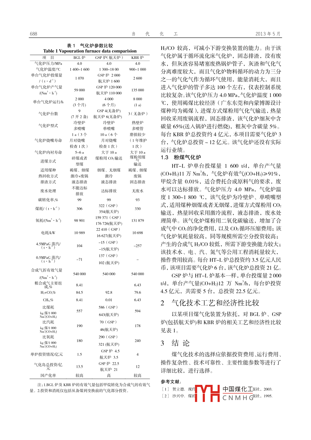 第42卷第5期Vo1.42013年5月Contemporary Chemical IndustryMay煤氣化工藝技術(shù)的比較閆秀婷(中國(guó)寰球工程公司遼寧分公司,遼寧撫順113006)摘要:中國(guó)是一個(gè)富煤、貧油的國(guó)家,石油資源稀缺,每年進(jìn)口大量原油以滿足國(guó)家經(jīng)濟(jì)增長(zhǎng)的需求因此,尋找替代能源是一項(xiàng)國(guó)家戰(zhàn)略性的課題。根據(jù)我國(guó)煤炭較為豐富的資源稟賦,發(fā)展煤制油化工產(chǎn)業(yè),對(duì)于緩解石油供需矛盾,實(shí)現(xiàn)煤炭清潔利用具有重要意義,煤制油化工產(chǎn)業(yè)具有廣闊的發(fā)展前景。選擇合適的煤氣化工藝,對(duì)于整個(gè)煤化工項(xiàng)目而言具有舉足輕重的意義。對(duì)BGL、GSP、KBR和粉煤氣化爐從單臺(tái)能力、操作條件、壽命、公用工程消耗、投資等方面進(jìn)行了比較關(guān)鍵詞:煤制油;煤氣化技術(shù);比較中圖分類號(hào):TQ541文獻(xiàn)標(biāo)識(shí)碼:A文章編號(hào):1671-0460(2013)05-0687-02Comparision of Coal vapouration TechnologiesYAN Xiu-ting(HQCEC, Liaoning Company, Liaoning Fushun 113001, China)Abstract: China has a large amount of coal storage, but is lack of petroleum resource. China need import a largeamount of crude oil every year. So to find alternative resources is very important for our country. Because of therichness of coal storage, developing coal-made oil industry is the way to solve the lack of crude oil and realize theclean usage of coal; coal-made oil industry has a bright development prospect. So choosing a proper technology is veryimportant for coal-made oil industry. In this paper, BGL, GSP, KBR and coal-powder vaporization furnace werecompared from the aspects of unit performance, operating conditions, duration, utility consumption, cost and so onKey words: Coal-made oil; Coal vaporation technology; Comparision煤氣化裝置在整個(gè)煤化工項(xiàng)目中占有的投資比統(tǒng),費(fèi)托合成塔尺寸加大,效率降低,循環(huán)量增大,例及公用工程消耗均較大,因此選擇合適的煤氣化而且費(fèi)托合成循環(huán)氣和尾氣中甲烷含量20%~30%,工藝,對(duì)于整個(gè)煤化工項(xiàng)目而言具有舉足輕重的意需把這部分尾氣中的甲烷通過(guò)二段轉(zhuǎn)化爐進(jìn)行轉(zhuǎn)義。通常煤氣化工藝選擇的主要原則包括化,產(chǎn)生的轉(zhuǎn)化氣返回費(fèi)托合成當(dāng)原料氣使用。該根據(jù)原料煤質(zhì)選擇相適應(yīng)的煤氣化工藝。BGL氣化爐煤焦油的收率只有1%-~3%,焦?fàn)t煤氣根據(jù)下游工序?qū)γ簹饧庸ぎa(chǎn)品的要求和煤焦油分離后的廢水處理投資需要1~2億元人民工藝裝置規(guī)模的大型化。幣,處理每噸廢水需要8元錢人民幣,而且還不能裝置的技術(shù)經(jīng)濟(jì)指標(biāo)。達(dá)標(biāo)排放。該氣化爐壓力40MPa,氣化爐溫度1500為此,依托某公司煤炭綜合利用項(xiàng)目的煤氣化裝℃,使用褐煤比較經(jīng)濟(jì),進(jìn)煤方式碎煤或者型煤置,對(duì)煤氣化工藝進(jìn)行對(duì)比。熱量回收采用激冷和廢鍋流程,液態(tài)排渣。每臺(tái)BCL爐總投資~1.5億元人民幣(含投煤、氣化、焦油水煤氣化工藝比較分離、煤氣水分離系統(tǒng)),此項(xiàng)目需要9臺(tái)氣化爐(71.1BGL氣化爐開(kāi)2備),氣化爐總投資13.5億。該氣化爐(BCI該氣化爐單臺(tái)投煤量1070td,單臺(tái)氣化爐產(chǎn)爐)還沒(méi)有實(shí)際運(yùn)行業(yè)績(jī)氣量(CO+H1)5.9萬(wàn)Nmh,氣化爐有效氣CO+H)≥12KBR運(yùn)輸床氣化84%,甲烷含量8.41%,有效氣(CO+H)含量相對(duì)于該氣化爐單臺(tái)投煤量2600td,單臺(tái)產(chǎn)氣量干粉煤氣化爐低,降低了費(fèi)托合成反應(yīng)器的利用率。(CO+H2)14萬(wàn)Nm/h,氣化爐有效氣CO+H)≥81%在進(jìn)入費(fèi)托合成反應(yīng)器前要分離這些甲烷,投資較氣化爐出口干氣甲烷含量654%,氣化氣中甲烷影大,能耗較高,難度較大需要采用深冷分離技術(shù)),響與BCL爐柙忙副立量大,品質(zhì)較若這部分甲烷不分離和原料氣一起進(jìn)入費(fèi)托合成系高,可大幅度中國(guó)煤化工生的合成氣CNMHG收稿日期:2013-04-03者簡(jiǎn)介:閆秀婷(1960-),女,遼寧撫順人,工程師,1987年畢業(yè)于撫順石化公司職工大學(xué)石油化工專業(yè),從事工作:工藝設(shè)計(jì)。E-mailYANXUETINGOHOCEC. COM2013年5月表1氣化爐參數(shù)比較Table 1 Vapouration furnace data comparisionHCO較高,可減小下游變換裝置的能力。由于該GSP爐(航天爐)KBR爐氣化爐屬于循環(huán)流化床氣化爐,固態(tài)排渣,沒(méi)有廢氣化爐壓力MPa水,但灰渣容易堵塞廢熱鍋爐管子,灰渣和氣化氣氣化爐溫度/℃1400-16001300-1800900-1000單臺(tái)氣化爐投煤量分離難度較大,而且氣化爐物料循環(huán)的動(dòng)力為三分GSP爐20001070航天爐2600之一的氣化氣作為循環(huán)氣使用,能量消耗大,而且單臺(tái)氣化爐產(chǎn)氣量GSP爐59000135000進(jìn)入氣化爐的管子多達(dá)100個(gè)左右,儀表控制系統(tǒng)航天爐110000比較復(fù)雜。該氣化爐壓力40MPa,氣化爐溫度100040008000單臺(tái)氣化爐運(yùn)行h(3個(gè)月(6個(gè)月℃,使用褐煤比較經(jīng)濟(jì)(廣東東莞和內(nèi)蒙博源設(shè)計(jì)氣化爐臺(tái)數(shù)GSP4(無(wú)備爐)7開(kāi)2備)航天爐6無(wú)備爐)3(無(wú)備爐煤種均為褐煤),進(jìn)煤方式煤粉用氣化氣輸送,熱量回收采用廢鍋流程,固態(tài)排渣,該氣化爐細(xì)灰中含氣化爐型式冷壁爐冷壁爐熱壁爐單噴嘴多噴管碳量65%(送入鍋爐進(jìn)行燃燒),粗灰中含碳量5%。
