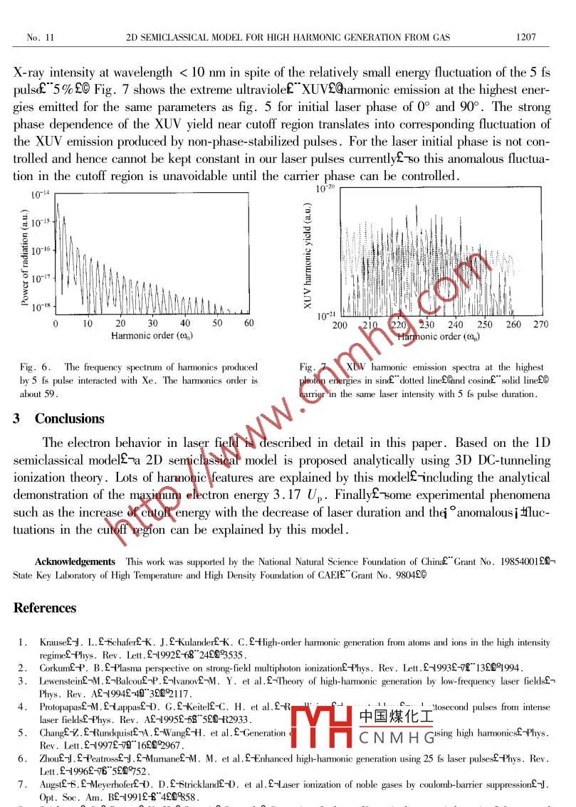 Vol. 43 No. I1SCIENCE| N CHINAS¨ Series a£0November 20002D semiclassical model for high harmonic generation from gasCHEN Liming"3AAeA÷6UWe" Oa caYcE ZHANG Jief¨0AwU妞CHEN Zhaoyang"3A NOze& JIANG Wenmiarf12-lAAace1. Laboratory of Optical Physicsf-tnstitute of Physicsf-Chinese Academy of Sciencesf Beijing 100080f-Chinaf2. Laboratory for Laser Fusionf institute of Nuclear Physics and Chemistry Mianyang 621900f-Chinaz3. Shanghai Institute of Optics and Fine Mechanics -Chinese Academy of Sciencesf-Shanghai 201800f-ChinaCorrespondence should be addressed to Chen Liming"email imchen aphy iphy. ac cncReceived December 62-1999Abstract The electron behavior in laser field is described in detail. Based on the 1dmodelf-a 2D semiclassical model is proposed analytically using 3D DC-tunneling ionization theory. Lotsof harmonic features are explained by this model -including the analytical demonstration of the maximum electron energy 3. 17 U. Finally -some experimental phenomena such as the increase of thecutoff harmonic energy with the decrease of pulse duration and theanomalousi luctuations in the cutoff region are explained by this modKeywordsf high harmonic generation -tunneling ionization ultrashort laser pulseHigh harmonics generation HHGECs an intriguing and experimentally well-confirmed phemenon which results from ionization of gas atom by laser field hhg has been studied in thesimple but illustrative models including classical modelsuiE-semiclassical models 2e and quantummodel5u354eY The semiclassical model put forward by Corkum and Kulander et al. explains theemission of high harmonic radiation in terms of three discrete stepsf Firste the electron tunnelsthrough the barrier formed by the atomic Coulomb potential and the laser fieldE>the quasi-freeelectron subsequently acquires kinetic energy from the laser fieldE> and half an optical cycle laterit returns to its parent ion and emits a photon. But the Corkum model has not considered the ef-fect of magnetic field of the laser and the laser pulse duration which is essential in ultrashortlaser-atom interactions. Sof it is necessary to adjust this model in ultrashort laser-atom interactions. This paper is the extended 2D model which can be used in the larger range1 Theoretical modelDuring the laser-atom interactions the atom will ionize in the laser field. When the Keldyshparameter y>1fwthe ionization is multiphoton f Whereas y< 1 corresponds to the tunnelinregime. The key difference between them is the coer transition time andhe laser optical cycle while the tunneling time is中國(guó)煤化工For atom tunneling ionization ratel-there areCNMHGE checked the experimental results and theoretical predictions - and found them fitted well with each other in the inten-sity of 10 W/cm2 except the Szoke s equations. Sof we can use the three-dimensional DC-tunheling theory which is not time-averaged when we want to calculate the behavior of electron inlaser fields捕No. ll2D SEMICLASSICAL MODEL FOR HIGH HARMONIC GENERATION FROM GAS1203eZ£nE=4W1//y/-2e3/2where Wa=4 10s is the atomic frequency unitE>Ei= Ea/ EH is the ratio of the ionizationpotential of the atom we studied and hydrogen. Ef ZEpfc E" nEg Ea= 1. 16x 102"Tb/AEGf nfSea is the atomic unit of field. Rh is the Bohr radius. n is the laser wavelength. E nECsthe well-known solution of one-dimentional wave equation. Here the field is statice and no atomicshell dependence is includedThe evolution of electron density n is given by;g= Pnowhere no is the initial gas densityAfter ionizationf-the ion remains its position for its large mass. The motion of the ionizeelectron in a linearly polarized laser field A=&"n 2@ is governed by Lagrangian equation£"420In non-relativistic limite we haveu/c- a= al u/c£"6£0Cwhere ai and a, are the constants to be determined by initial conditions. Since the electron haselocity when itda2=0£whotrength at ionization and then we getu1/c=a-a1£u2/c=1-√1££"720=C£"8£07The trajectory of the electron is then fully determinedIn generale u free electron quivering in laser field has very low probalility of collision withions. For examplef-in an ionized gas with Z=502wno=10cm End temperature Te= 100eⅤ£ the electron- ion collision rate is merely y/≈4.8×10-5. However£ since the electronsare ionized at rest e their behavior in the initial stage is somewhat special. We will show that inthe first half optical cycle after ionization an electron ionized bv a linearly polarized light hasrather good chance to be recombined. This inter中國(guó)煤化工 vant to the high harmonic generation from rare gasCNMHGLet us first consider a planar laser of infinite durationz-ti ytc aosif"kn2e-where kG/c. The trajectory isx= a EUcost;-cost£"t-tE所ntE方數(shù)據(jù)4-4+sim22t+3si¨2t£0cost(2sint£¨10£cSCIENCE IN CHINAC Series azoVol. 43Figpresentstralectonesof electrons being ionized at different timelot:=-20 and 5021where a0=0.02 and zi =0. In order to get a better viewf un amplified scale is used for the axisof z. The electrons entering the areac Hike that being ionized at t:=50f are considered to returnto the vicinity of its parent iorf defined as bohr radius rb=3. 3 x 10 fC It is clear that theseelectrons will be recombined with a photon of energy Ey=mu/2+ Ea emitted. Let us firstconsider the displacement in z direction after an optical cycle isTagUo. 5 +sin t fY= Ta/2£"112⑩日0.0-0.02」0.0Time of ionization/()Fig. 1. The trajectory of electron driven by the sameFig. 2. The relation between electron energy and ionia-laser field with different ionization limnlion tumeElectron will return to the vicinity of ion in the condition of z. 2RB. We can get three importantosiNe.IE ifCElectrons failed to return in the first half optical cycle have little chance to do so in theirfuture flights. After the initial stage an ionized electron behaves more and more like a quiveringfree electron. The probability of collision with ions is then described by yei/aE" liECBecause the effec