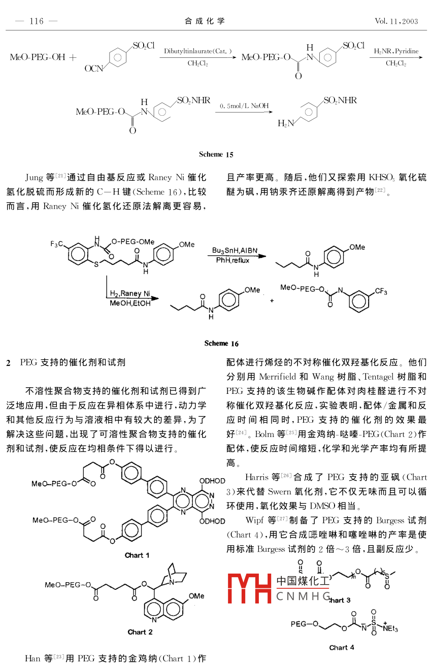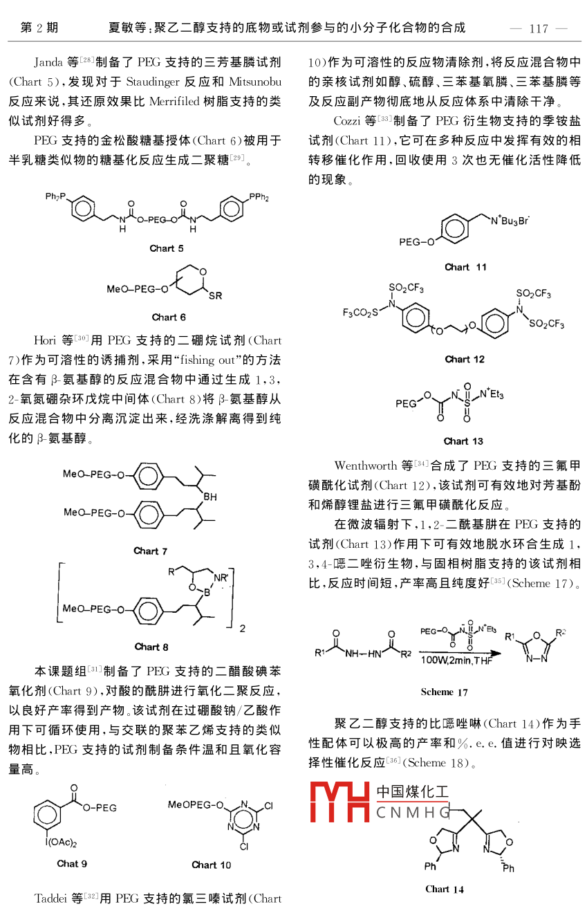 合成化學(xué)Chinese Journal of Synthetic Chemnistry111聚乙二醇支持的底物或試劑參與的小分子化合物的合成夏敏',王彥廣2(1.浙江工程學(xué)院應(yīng)用化學(xué)系,浙江杭州310033;2. 浙江大學(xué)化學(xué)系,浙江杭州310027)摘要:對(duì)近年來聚乙二醇為可溶性聚合物支持體支持的底物或試劑參與的小分子化合物的液相有機(jī)合成反應(yīng)進(jìn)行了總結(jié)。參考文獻(xiàn)36篇。關(guān)鍵詞:聚乙二醇;聚合物支持的底物或試劑;小分子化合物;液相有機(jī)合成中圖分類號(hào): O621.3文獻(xiàn)標(biāo)識(shí)碼: A文章編號(hào): 1005- 1511(2003)02-111-08Synthesis of Organic Small Compoundson Polyethylene Glycol Supported Substrates and ReagentsXIA Min',WANG Yan- guang2(1. Department of Applied Chemistry, Zhejiang Institute of Science and Technology, Hangzhou 310033,China ;2. Department of Chemistry , Zhejiang University,Hangzhou 310027, China)Abstract: Polyethylene glycol supported substrates and reagents in liquid- phase synthesis of organicsmall compounds are reviewed with 36 references.Keywords: polyethylene glycol; liquid- phase ; organic small compounds; review近年來,組合化學(xué)日益受到人們的關(guān)注,并成1.1 碳-碳鍵的形成為化學(xué)領(lǐng)域內(nèi)的研究熱點(diǎn)之一。直至目前為止,用探索和建立有效的形成碳-碳鍵的方法是任不溶性高分子聚合物為支持體的固相合成方法仍何 聚合物支持的反應(yīng)的一個(gè)重要目標(biāo),液相合成然是實(shí)現(xiàn)組合化學(xué)的主要手段。然而,固相合成有也不例外。在此方面,用碳原子為中心的親電試劑許多缺點(diǎn)阻礙了其進(jìn)-步的發(fā)展。液相合成法的對(duì)穩(wěn)定化的碳負(fù)離子進(jìn)攻是最常用的手段之一。出現(xiàn)則在很大程度上克服了其困難和缺點(diǎn),它既Lamaty等[3]報(bào)道,在K.CO3的作用下, PEG 3400兼容了固相合成與溶液相合成的優(yōu)點(diǎn),又摒棄了支持的二苯甲酮甘氨酸的Schiff堿可被一系列的他們的缺點(diǎn),是實(shí)現(xiàn)組合化學(xué)的另-條重要途徑。親電試劑進(jìn)攻,生成a-烷基取代產(chǎn)物(Scheme 1)。目前,中低分子量的聚乙二醇(PEG)是液相在此反應(yīng)中首次報(bào)道了PEG既可充當(dāng)可溶性支有機(jī)合成中使用最多的可溶性聚合物支持體。盡持體,又可充當(dāng)相轉(zhuǎn)移催化劑(PTC),使PEG支持管第一個(gè)液相合成反應(yīng)出現(xiàn)于60年代中,但近年的反應(yīng)在無任何外加PTC存在的條件下順利進(jìn)來液相合成方法有了長足進(jìn)展和巨大進(jìn)步,已成行。為實(shí)現(xiàn)許多有機(jī)分子合成的重要和有效的手段,PhR'X.K2CO%_ PhR'其中PEG支持的底物或試劑參與的小分子化合Ph/COR MeCN,PIC PhYCO2R物的合成已日益成為人們關(guān)注的領(lǐng)域[2]。本文就此方面的一些進(jìn)展進(jìn)行總結(jié)。中國煤化工、n Bu,N+Br- or MeO PEGMHCNMHG1PEG支持的底物參與的反應(yīng)Scheme 1收稿日期: 2002-08-20作者簡介:夏敏(1972-),女 .漢族.浙江余姚人,副教授,博士。主要從事有機(jī)合成與藥物合成的研究。Tel:(0571)- 8802212112合成化學(xué)Vol.11 ,2003在此基礎(chǔ)上,Lamaty等[4]又報(bào)道了PEG支持.作用,CsCO、的反應(yīng)效果比K,CO3要好。的二苯甲酮甘氨酸的Schiff堿的a-烷基化反應(yīng)可二芳基結(jié)構(gòu)是許多具有生物活性化合物中重在微波促進(jìn)的干反應(yīng)條件下進(jìn)行。在此反應(yīng)中,要的結(jié)構(gòu)單元,生成二芳基化合物在有機(jī)合成中PEG支持體不僅充當(dāng)PIC的作用,同時(shí)還成為反占有重要地位。Blettner等以首次報(bào)道了PEG支持應(yīng)的有機(jī)相,使該反應(yīng)的速率大為提高。由于體上進(jìn)行Suzuki偶聯(lián)生成多種二芳基化合物的PEG對(duì)銫離子的螯合作用強(qiáng)于對(duì)鉀離子的螯合反應(yīng)(Scheme 2)。OR,B(OH)2、FO-PEGPd( PPh).DMF0O-PEG :110C ,K2O%EaN-MeOH_OMe85C ,2dScheme 2由于PEG具有水溶性的特點(diǎn),Blettner等0隨Reggelin等[7]用MeOPEG5000支持的醛進(jìn)后報(bào)道了在水中進(jìn)行的PEG支持的Suzuki偶聯(lián)行了不對(duì)稱Aldol 反應(yīng)(Scheme 3)。通過H NMR反應(yīng)。實(shí)驗(yàn)表明,相比于上述有機(jī)溶劑中的反應(yīng),分析,產(chǎn)物的光學(xué)純度≥97%,通過H2/Pd均相催水中進(jìn)行的反應(yīng)由于PEG發(fā)揮了PIC的作用,反化反應(yīng)可將產(chǎn)物順利地解離下來。應(yīng)條件溫和,產(chǎn)率良好。BuB、OHCHOCH292o H2.Pd BlackP-0/P-OYHO'P= MeO-PEG-0-Scheme 3Cheng等[8]通過4步反應(yīng)以極高的純度(>90%)合成了亞胺二乙酸衍生物(Scheme 4)。,0 _PEGOH-CO2HBoc-N. DCC Boc-NMeOPEGOH,Boc _NRNH2PyridinePyBOP,DIEA, 0 -PEGOH0 _PEGOHBoc-中國煤化工:R1)TFAb=<2) R2CO2HYHCNMHGO:PyBOP ,DIEAN-R1Schene 4陳祖興等[0]在液相條件下合成了N-對(duì)羥基苯甲?;螂?Scheme5)第2期夏敏等:聚乙二醇支持的底物或試劑參與的小分子化合物的合成113C- CO,H(00C)2_ PEG-OClHOCCO:HPEG- OSO2ClPEG OH-PyridineDMF(Cat. )0-<0>-COCl\N=C=SPEG-ONH.SCN PEG-ORIR2NHOSNR'R21)6%NH●H2O_NR! R2H2)HtOHOScheme 51.2 雜環(huán)化合物的合成Moore等[I°]首次報(bào)道了液相條件下的1,3-偶由于雜環(huán)化合物富含于天然產(chǎn)物和藥物分子極環(huán)加成反應(yīng)。PEG支持的炔與糖類衍生的伯疊中,因此是-類重要的化合物,目前液相合成方法.氮化合物可順利地進(jìn)行環(huán)加成反應(yīng),以良好產(chǎn)率已日益成為合成雜環(huán)化合物的有效手段。得到