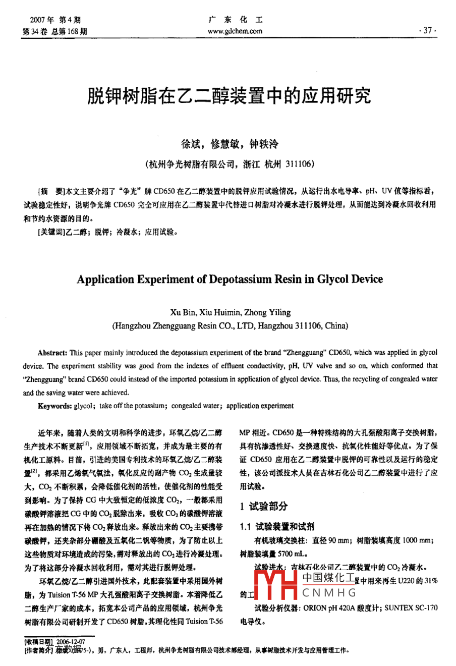 2007年第4期廣東化工第34卷總第168期www.gdchem.com脫鉀樹脂在乙二醇裝置中的應(yīng)用研究徐斌,修慧敏,鐘軼泠(杭州爭光樹脂有限公司,浙江杭州311106[摘要]本文主要介紹了“爭光”牌CD650在乙二醇裝置中的脫鉀應(yīng)用試驗情況,從運行出水電導(dǎo)率、p、UⅤ值等指標(biāo)看試驗穩(wěn)定性好,說明爭光牌CD650完全可應(yīng)用在乙二醇裝置中代替進口樹脂對冷凝水進行脫鉀處理,從而能達到冷凝水回收利用和節(jié)約水資源的目的[關(guān)鍵詞]乙二醇;脫鉀;冷凝水;應(yīng)用試驗。Application Experiment of Depotassium Resin in Glycol DeviceXu Bin, Xiu Huimin, Zhong Yiling(Hangzhou Zhengguang Resin CO, LTD, Hangzhou 311106, China)Abstract: This paper mainly introduced the depotassium experiment of the brand"Zhengguang"CD650, which was applied in glycoldevice. The experiment stability was good from the indexes of effluent conductivity, pH, UV valve and so on, which conformed that"Zhengguang"brand CD650 could instead of the imported potassium in application of glycol device. Thus, the recycling of congealed waterKeywords: glycol; take off the potassium; congealed water; application experiment近年來,隨著人類的文明和科學(xué)的進步,環(huán)氧乙烷乙二醇MP相近。CD650是一種特殊結(jié)構(gòu)的大孔強酸陽離子交換樹脂生產(chǎn)技術(shù)不斷更新,應(yīng)用領(lǐng)域不斷拓寬,并成為最主要的有具有抗?jié)B透性好、交換速度快、抗氧化性能好等優(yōu)點。為了保機化工原料。目前,引進的美國專利技術(shù)的環(huán)氧乙烷乙二醇裝證CD650應(yīng)用在乙二醇裝置中脫鉀的可靠性以及運行的穩(wěn)定置2,都采用乙烯氧氣氧法,氧化反應(yīng)的副產(chǎn)物CO2生成量較性,該公司派技術(shù)人員在吉林石化公司乙二醇裝置中進行了應(yīng)大,CO2不斷積累,會降低催化劑的活性,使催化劑的性能受用試驗到影響。為了保持CG中大致恒定的低濃度CO2,-般都采用碳酸鉀溶液把CG中的CO2脫除出來,吸收CO2的碳酸鉀溶液1試驗部分再在加熱的情況下將CO2釋放出來。釋放出來的CO2主要攜帶11試驗裝量和試劑碳酸鉀,還夾雜部分翻酸及五氧化二釩等物質(zhì),為了防t以上有機玻璃交換柱:直徑90mm;樹脂裝填高度1000mm;這些物質(zhì)對環(huán)境造成的污染,需對釋放出的CO2進行冷凝處理。樹脂裝填量5700mL為了將這部分冷凝水回收利用,需對其進行脫鉀處理。試驗進水;青林石化公司乙二醇裝置中的CO2冷凝水。環(huán)氧乙烷乙二醇引進國外技術(shù),此配套裝置中采用國外樹中國煤化工置中用來再生U220的31%脂,為 Tuition T-56MP大孔強酸陽離子交換樹脂。本著降低乙的CNMHG二醇生產(chǎn)廠家的成本,拓寬本公司產(chǎn)品的應(yīng)用領(lǐng)域,杭州爭光試驗分析儀器: ORION pI420A酸度計; SUNTEX SO70樹脂有限公司研制開發(fā)了CD60樹脂,其理化性同 Tuition T6電導(dǎo)儀。[收稿日期20061207作簡,布敢搔5),男,廣東人,工程螂,杭州爭光樹脂存限公司技術(shù)部經(jīng)理,從事樹脂技術(shù)開發(fā)與應(yīng)用管理工作廣東化工2007年第4期www.gdchem.com第34卷總第168期12具體試驗析儀器一樣將5700mL樹脂裝入交換柱中,用鹽酸溶液完全再生后,1.32U551操作工藝流程將試驗進水以200mL/min左右的運行流速通過,直至樹脂失U551的操作工藝流程參數(shù)見表I。效,失效終點完全參照吉林石化公司乙二醇裝置U220的運行終點,一般是pH>6.0。樹脂失效后,先用食鹽水清洗,對樹表1工藝流程脂清洗水量為5BV,清洗流速接近運行流速;然后用禽鹽水對工藝流程時間min流速(m3h4)樹脂反洗,直到反洗排水干凈,反洗時間為30min;再讓樹脂置換自由沉降,靜置10mn;再進行再生,再生劑用量為2BⅤ的%左右的HCl,再生接觸時間為35~45min,再生流速為3~5靜置m/h;然后用食鹽水進行慢漂,慢源流速同再生流速一樣,時間至少為30min;再用食鹽水進行快課,直至出水電導(dǎo)率<10sm,一般快漂水的用量為8~10BⅤ。之后,進行下一周期制水13U220系統(tǒng)裝置的試運行情況制水2-3131試驗裝量交換柱:直徑1500mm,樹脂裝填高度1200mm,樹脂裝133試驗結(jié)果填量2140L;再生劑:3%的工業(yè)鹽酸;有關(guān)水質(zhì):進水水質(zhì)(1)第一周期cD650小型試驗結(jié)果見表2。第二周期cD60及出水水質(zhì)控制同小試一樣;試驗分析儀器:同小試所用的分小型試驗結(jié)果見表3。表2第一周期CD650對cO2冷凝水脫鉀出水結(jié)果運行時間量系統(tǒng)裝試驗裝置電導(dǎo)率UV值日期時間PHAuS-cm) 220 nm 275 nm 350nmfus cm") 220nm 275350nm32969045381:00416345.168187446275:004.18:0040683896433.2643475.74734677455:0037.897.129697539091.036635:003.74927中國煤化工11,2CNMHG98.123929T60593.0880911200年第4期廣東化工第34卷總第l68期www.gdcbem.com喪3第二周期cD650對GO2冷凝水脫鉀出水結(jié)果運行時間系統(tǒng)裝量試驗裝量期時聞pH電導(dǎo)率UV值pH電導(dǎo)率Uv值A(chǔ)uS-cm 220 nm 275nm 350 nmAuS-cm) 220nm21:00349326013:003411329.73.521:003.4219367.225361497.513:006415750095.986.519064.5(2)第三周期CD650小型試驗結(jié)果見表4及圖1、圖2、圖3表4第三周期CD650對cO2冷凝水脫鉀出水結(jié)果運行時間系統(tǒng)裝置試驗裝量日期時間UV值pH電導(dǎo)率UV值uScm)220275nm350nm/uS-cm) 220 nm75 nm350nm28鴟17865:0071s4s8821;003731.73.7155794.75:003128043.1836.12300.597一暴統(tǒng)UV值220nm系統(tǒng)Uv值275nm系統(tǒng)pH一系統(tǒng)UV值350nm險Uv值220nm試驗Uv值350nm時聞/h時聞/h圖1第三周期pH變化曲線圖3算三周期cD650對CO2冷凝水脫鉀出水凵V值變化曲線1