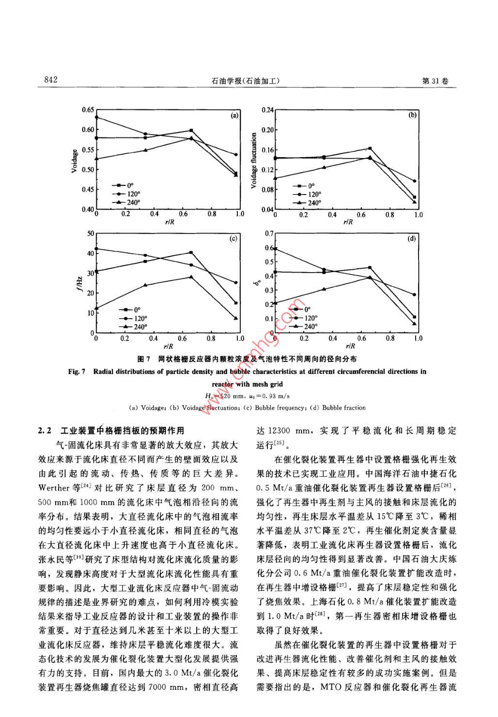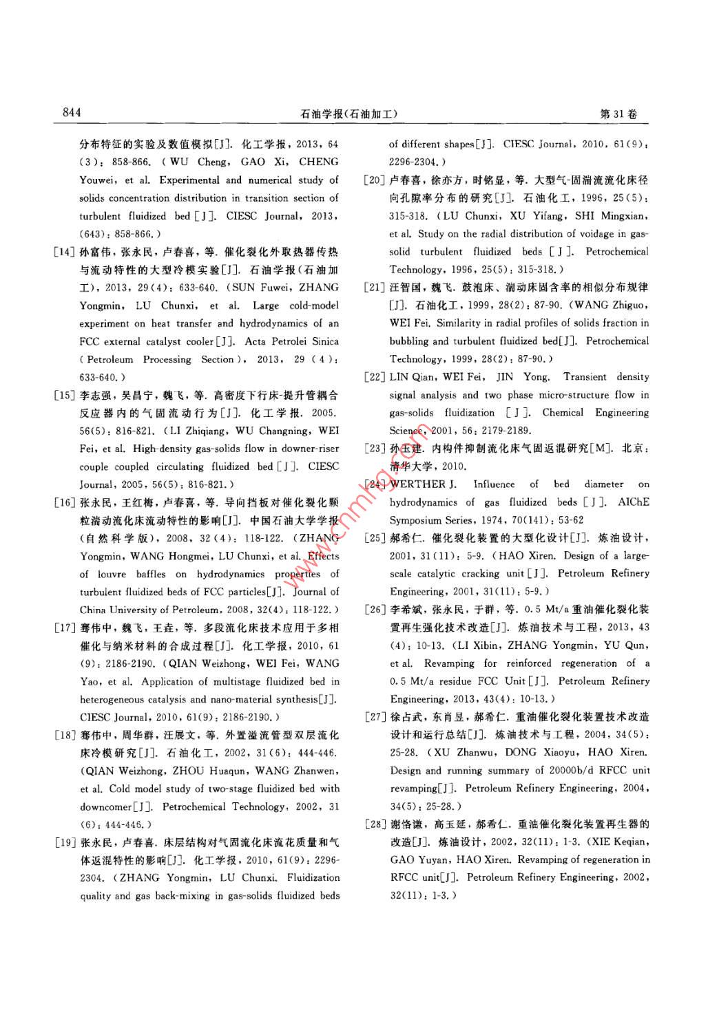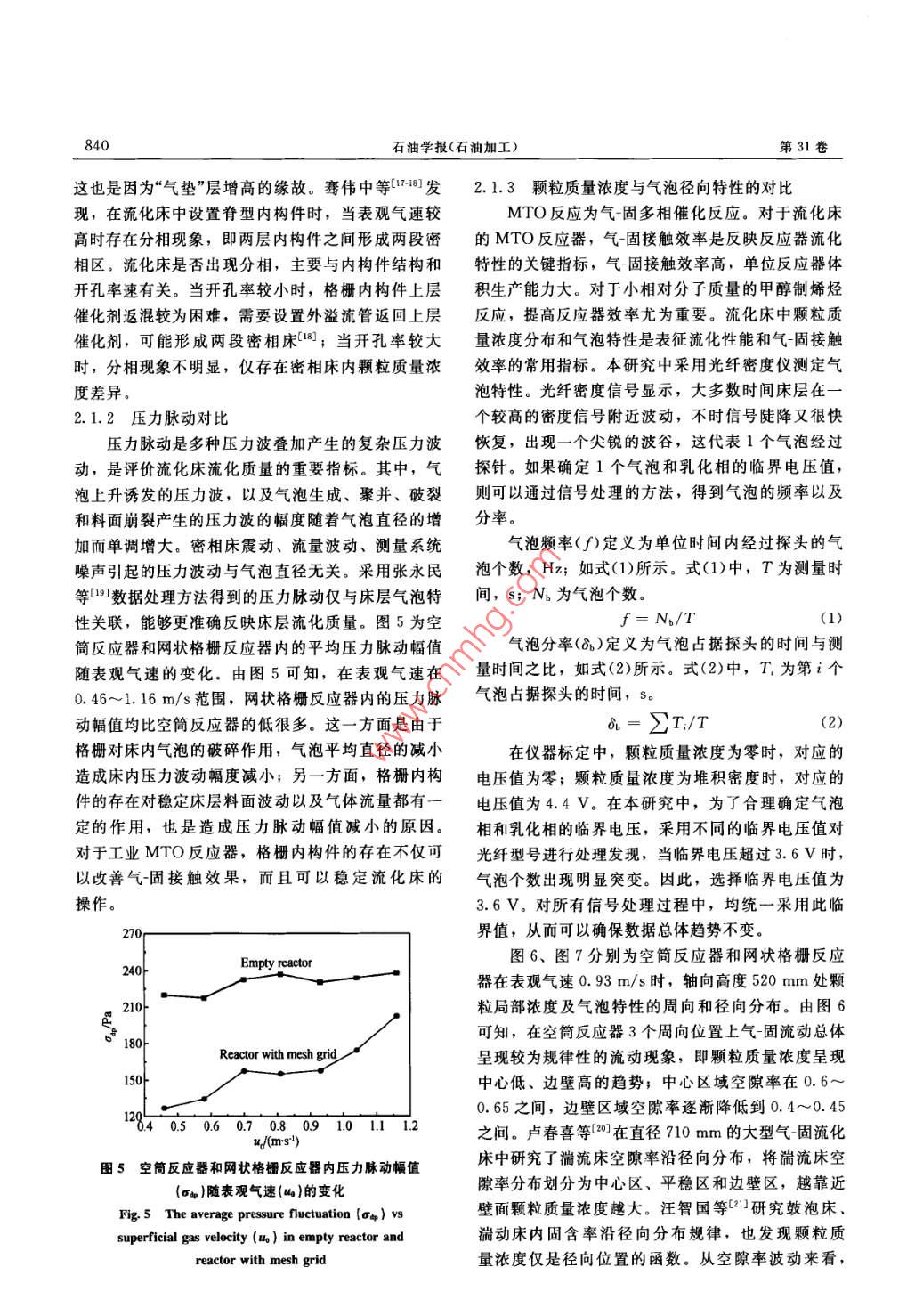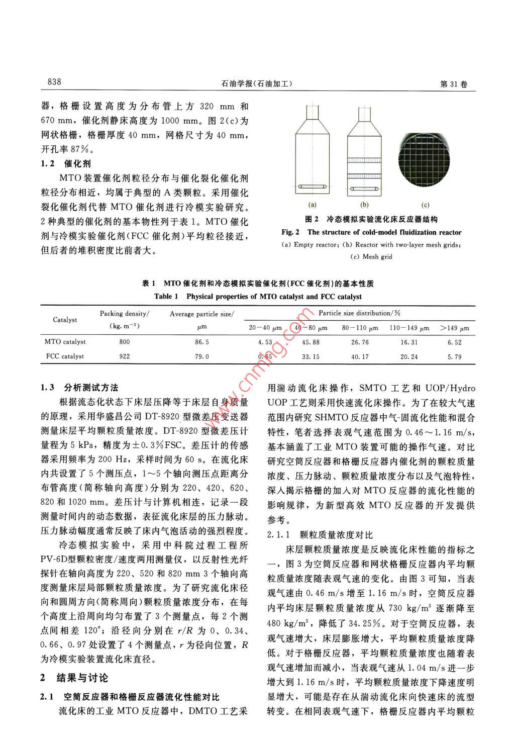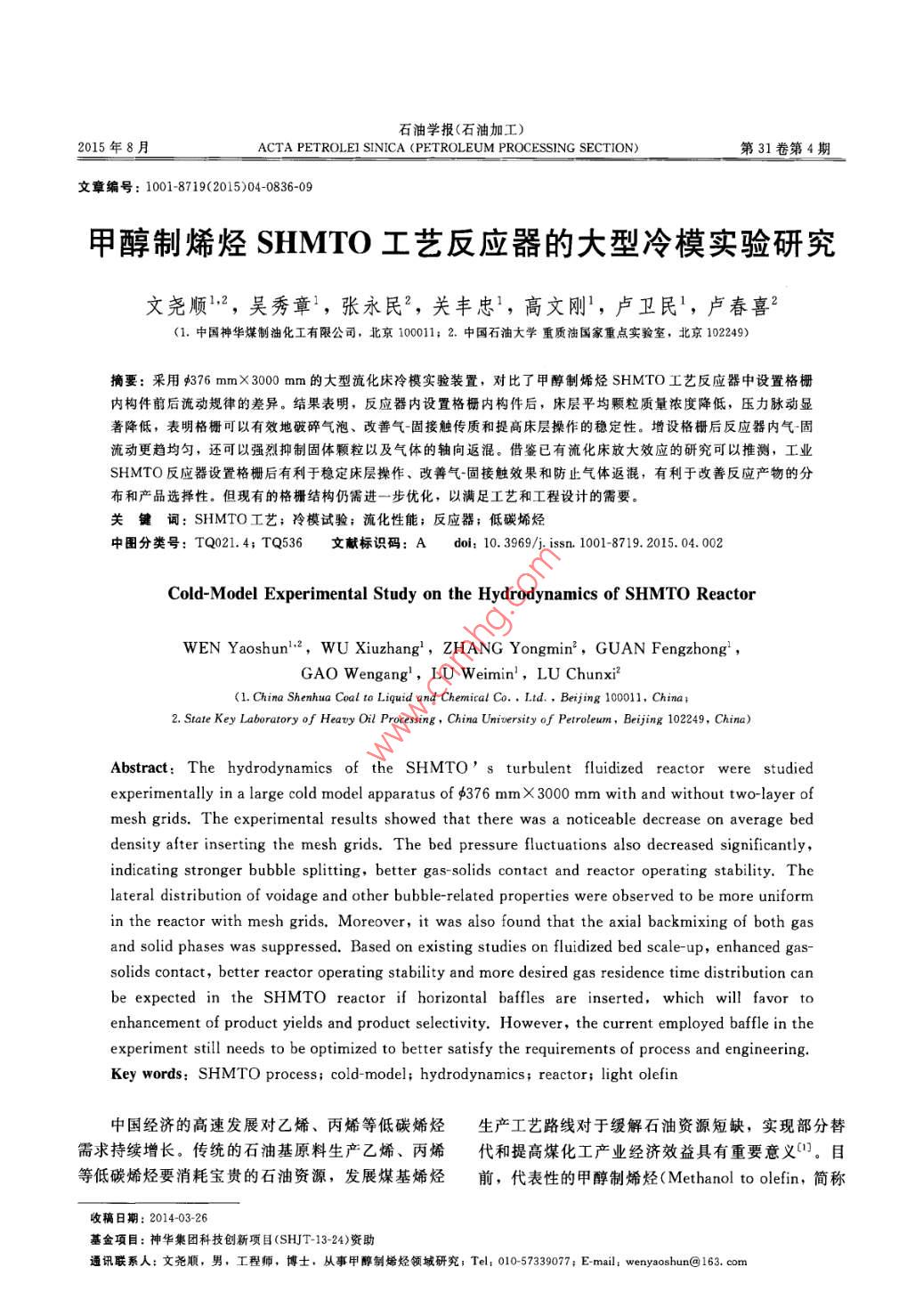 石油學報(石油加工)2015年8月ACTA PETROLEI SINICA (PETROLEUM PROCESSING SECTION)第31卷第4期文章編號: 1001-8719(2015)04-0836-09甲醇制烯烴SHMTO工藝反應器的大型冷模實驗研究文堯順'2,吳秀章',張永民”,關豐忠',高文剛',盧衛(wèi)民',盧春喜2(1.中國神華煤制油化工有限公司,北京10011; 2. 中國石油大學重質(zhì)油國家重點實驗室,北京102249)摘要:采用p376 mmX 3000 mm的大型流化床冷模實驗裝置,對比了甲醇制烯烴SHMTO工藝反應器中設置格柵內(nèi)構件前后流動規(guī)律的差異。結果表明,反應器內(nèi)設置格柵內(nèi)構件后,床層平均顆粒質(zhì)量濃度降低,壓力脈動顯著降低,表明格柵可以有效地破碎氣泡、改善氣-固接觸傳質(zhì)和提高床層操作的穩(wěn)定性。增設格柵后反應器內(nèi)氣固流動更趨均勻,還可以強烈抑制固體顆粒以及氣體的軸向返混。借鑒已有流化床放大效應的研究可以推測,工業(yè)SHMTO反應器設置格柵后有利于穩(wěn)定床層操作、改善氣固接觸效果和防止氣體返混,有利于改善反應產(chǎn)物的分布和產(chǎn)品選擇性。但現(xiàn)有的格柵結構仍需進一步優(yōu)化,以滿足工藝和工程設計的需要。關鍵詞:SHMTO工藝;冷模試驗;流化性能;反應器;低碳烯烴中圖分類號: TQ021. 4; TQ536文獻標識碼: A doi: 10. 3969/j. issn. 1001-8719. 2015. 04. 002Cold-Model Experimental Study on the Hydrodynamics of SHMTO ReactorWEN Yaoshun!2, WU Xiuzhang',ZHANG Yongmin2,GUAN Fengzhong',GAO Wengang',LU Weimin',LU Chunxi?(1. China Shenhua Coal to Liquid and Chemical Co.. Lid. ,Beijing 10011. China;2. State Key Laboratory of Heavy Oil Processing , China University of Petroleum, Beijing 102249, China)Abstract: The hydrodynamics of the SHMTO' s turbulent fluidized reactor were studiedexperimentally in a large cold model apparatus of φ376 mmX 3000 mm with and without two-layer ofmesh grids. The experimental results showed that there was a noticeable decrease on average beddensity after inserting the mesh grids. The bed pressure fluctuations also decreased significantly,indicating stronger bubble splitting, better gas- solids contact and reactor operating stability. Thelateral distribution of voidage and other bubbe-related properties were observed to be more uniformin the reactor with mesh grids. Moreover, it was also found that the axial backmixing of both gasand solid phases was suppressed. Based on existing studies on fluidized bed scale-up, enhanced gas-solids contact, better reactor operating stability and more desired gas residence time distribution canbe expected in the SHMTO reactor if horizontal baffles are inserted, which will favor tenhancement of product yields and product selectivity. However, the current employed baffle in theexperiment still needs to be optimized to better satisfy the requirements of process and engineering.Key words: SHMTO process; cold model; hydrodynamics; reactor; light olefin中國經(jīng)濟的高速發(fā)展對乙烯、丙烯等低碳烯烴生產(chǎn)工藝路線對于緩解石油資源短缺,實現(xiàn)部分替需求持續(xù)增長。傳統(tǒng)的石油基原料生產(chǎn)乙烯、丙烯代和提高煤化工產(chǎn)業(yè)經(jīng)濟效益具有重要意義以。目等低碳烯烴要消耗寶貴的石油資源,發(fā)展煤基烯烴前,代表性的甲醇制烯烴(Methanoltoolefin,簡稱收稿日期: 2014-03-26基金項目:神華集團科技創(chuàng)新項目(SHJT-13-24)資助通訊聯(lián)系人:文堯順,男,工程師,博士,從事甲醇制烯烴領域研究; Tel; 010-57339077; E mail. wenyaoshun@ 163. com.第4期甲醇制烯烴SHMTO工藝反應器的大型冷模實驗研究837MTO)技術有DMTO工藝2、SMTO工藝[8]、示的大型冷態(tài)模擬實驗裝置。該反應器采用湍流床UOP/Hydro MTO工藝印、Exxonmobil 的MTO和輸送床耦合的新結構,床層底部為湍動域操作的工藝[5]等,其中前3種工藝已經(jīng)實現(xiàn)工業(yè)化應用。密相流化床。其中流化床下部為φ376 mm X2010年,世界首套MTO國家示范工程在內(nèi)蒙古包3000 mm的透明有機玻璃筒體,上部為φ150 mmX頭建成[6],當年一次性投料試車成功,標志著中國4500mm的稀相輸送管。流化床底部設置樹枝狀氣處于世界煤制烯烴行業(yè)領先地位。為了進一步提高體分布器,開孔率為2%。密相床層夾帶至稀相輸甲醇制烯烴工藝的競爭力,神華集團有限責任公司送管的顆粒在高速氣流的作用下,先后進入串聯(lián)的在首套MTO裝置優(yōu)化運行的基礎上,開發(fā)了自主兩級PV型旋風分離器。旋風分離器的設計總效率知識產(chǎn)權的甲醇制烯烴工藝技術[7-8] ( Shenhua大于99. 99%,其分離的固體顆粒通過料腿返回密MTO,簡稱SHMTO)。SHMTO工藝采用同軸式相床層。布置,利用重力將再生催化劑輸送到反應器中,減如圖1所示,空氣經(jīng)過羅茨鼓風機1壓縮后少了催化劑磨損,同時強化了催化劑與反應原料的進人緩沖罐2和氣體分配器3,經(jīng)轉(zhuǎn)子流量計4接觸,改善了催化劑和反應產(chǎn)物在反應器中的停留計量后進入冷模實驗裝置,通人流化床底部,作時間分布,提高了MTO反應的選擇性。高效反應為反應器流化風。流化床內(nèi)的氣泡在離開床層表器是SHMTO工藝技術開發(fā)的核心,氣固接觸效面時,將大量顆粒夾帶到稀相輸送管,經(jīng)過兩級率和穩(wěn)定流化對MTO裝置穩(wěn)定運行和提高低碳烯旋風分離器6、7分離后,固體顆粒沿料腿返回烴選擇性具有重要意義。床層中部,流化風由頂部的出口管通過濾袋排入在工業(yè)氣-固流化床反應器中設置內(nèi)構件,作為大氣。改善流化質(zhì)量、增強氣-固接觸效率的方法已得到廣泛應用。20 世紀80