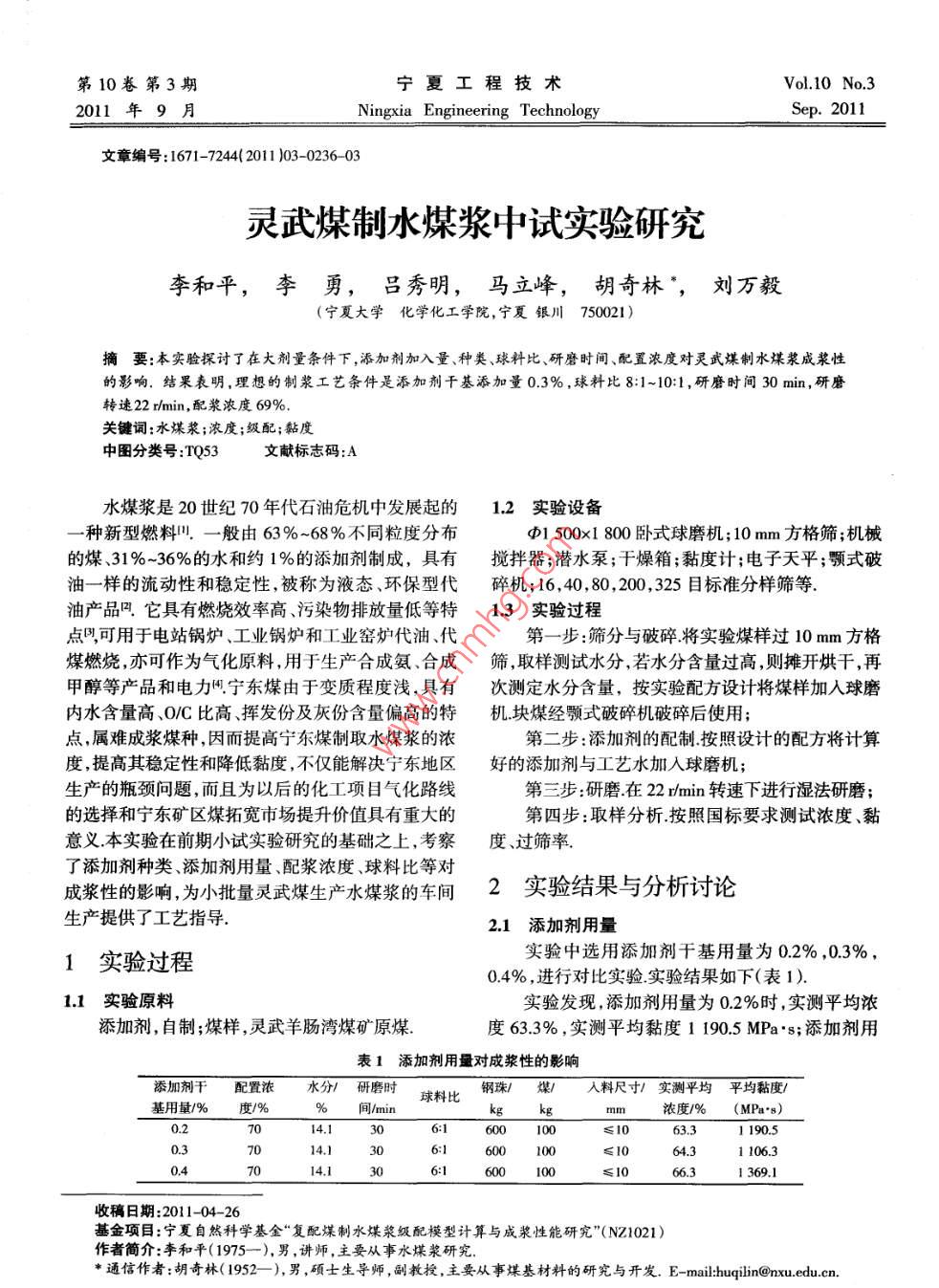 靈武煤制水煤漿中試實(shí)驗(yàn)研究