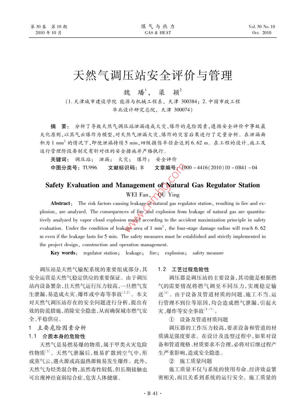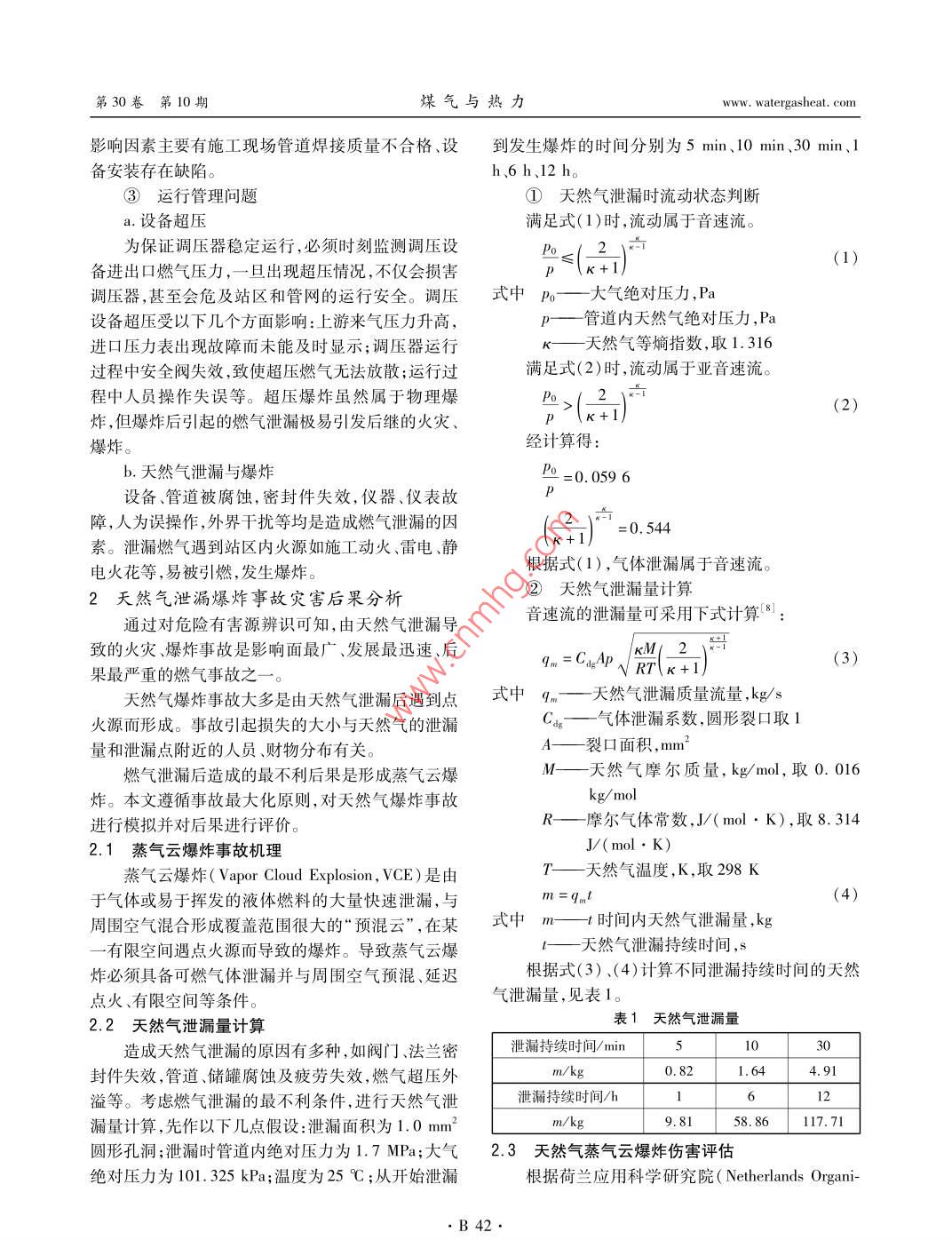 第30卷第10期煤氣與熱力Vol. 30 No. 102010年10月GAS & HEATOet. 2010天然氣調(diào)壓站安全評(píng)價(jià)與管理魏璠',渠穎2(1.天津城市建設(shè)學(xué)院能源與機(jī)械工程系,天津300384; 2. 中國(guó)市政工程華北設(shè)計(jì)研究總院,天津300074)摘要:分析了導(dǎo)致天然氣調(diào)壓站泄漏造成火災(zāi)、爆炸的危險(xiǎn)因素,遵循安全評(píng)價(jià)中事故最大化原則,以蒸氣云爆炸為模型,對(duì)天然氣泄漏火災(zāi)、爆炸的災(zāi)害后果進(jìn)行了定量分析。在泄漏面積為1 mm2的情況下,即使泄漏持續(xù)5 min,四級(jí)損傷半徑會(huì)達(dá)到6.62 m。在工程的設(shè)計(jì)、施工及運(yùn)行管理階段要制定有針對(duì)性的安全措施并嚴(yán)格執(zhí)行。關(guān)鍵詞:調(diào)壓站; 泄漏;火災(zāi);爆炸;安全評(píng)價(jià)中圖分類(lèi)號(hào): TU996文獻(xiàn)標(biāo)識(shí)碼: B文章編號(hào): 1000 - 4416(2010)10 - 0B41 -04Safety Evaluation and Management of Natural Gas Regulator StationWEI Fan,QU YingAbstract:The risk factors causing leakage at natural gas regulator station, resulting in fire and ex-plosion, are analyzed. The consequences of fire and explosion from leakage of natural gas are quantita-tively analyzed by vapor cloud explosion model according to the accident maximization principle in safetyevaluation. Under the condition of leakage area of 1 mm2,the four-stage damage radius will reach 6.62m even if the leakage lasts for 5 min. The safety measures must be established and strictly implemented inthe project design, construction and operation management.Key words: regulator station; leakage; fire; explosion; safety measure調(diào)壓站是天然氣輸配系統(tǒng)的重要組成部分,其1.2工藝過(guò)程危險(xiǎn)性安全運(yùn)營(yíng)是天然氣穩(wěn)定供應(yīng)的重要保證。由于調(diào)壓調(diào)壓器是調(diào)壓站的主要設(shè)備,其功能是根據(jù)燃站內(nèi)設(shè)備繁雜,且天然氣運(yùn)行壓力較高,一旦燃?xì)獍l(fā)氣的需要情況將燃?xì)庹{(diào)至不同壓力,實(shí)現(xiàn)穩(wěn)定輸生泄漏,易造成火災(zāi)、爆炸或中毒等事故[121。本文送“4。由于設(shè)備及管道材質(zhì)的問(wèn)題、施工不當(dāng)、運(yùn)對(duì)天然氣調(diào)壓站存在的安全問(wèn)題進(jìn)行分析,提出有行管理不到位等原因,均會(huì)造成燃?xì)庑孤鸹鹦У姆婪洞胧?消除安全隱患,從而確保城市燃?xì)獍矠?zāi).爆炸等安全事故5-71。全、平穩(wěn)供應(yīng)。①設(shè)備及管道材質(zhì)問(wèn)題1主要危險(xiǎn)因素分析調(diào)壓器的工作壓力較高,要求設(shè)備和管道的材1.1介質(zhì)本身的危險(xiǎn)性質(zhì)滿(mǎn)足強(qiáng)度要求。在設(shè)計(jì)及選型過(guò)程中,如果對(duì)設(shè)天然氣是易燃易爆的物質(zhì),屬于甲類(lèi)火災(zāi)危險(xiǎn)備和管道規(guī)格、材質(zhì)要求不合理,必將對(duì)后繼過(guò)程產(chǎn)性物質(zhì)甲。天然氣泄漏后,極易擴(kuò)散到空氣中,形生嚴(yán)重影響,造成安全隱患。成蒸氣云,遇火源或高溫?zé)嵩礃O易發(fā)生爆炸。此外,②施工質(zhì)量問(wèn)題天然氣為烴類(lèi)混合物,雖然毒性較低,但長(zhǎng)期接觸也施工質(zhì)量不僅與系統(tǒng)的使用壽命、經(jīng)濟(jì)效益緊可出現(xiàn)神經(jīng)衰弱綜合癥,危害人體健康。密相關(guān),而且關(guān)系到系統(tǒng)的運(yùn)行安全。施工質(zhì)量的●B41●第30卷第10期煤氣與熱力www. watergasheat. com影響因素主要有施工現(xiàn)場(chǎng)管道焊接質(zhì)量不合格、設(shè)到發(fā)生爆炸的時(shí)間分別為5 min.10 min、30 min、1備安裝存在缺陷。h.6 h、12 h。③運(yùn)行管理問(wèn)題①天然 氣泄漏時(shí)流動(dòng)狀態(tài)判斷a.設(shè)備超壓滿(mǎn)足式(1)時(shí),流動(dòng)屬于音速流。為保證調(diào)壓器穩(wěn)定運(yùn)行,必須時(shí)刻監(jiān)測(cè)調(diào)壓設(shè)_2_)=(1)備進(jìn)出口燃?xì)鈮毫?一旦出現(xiàn)超壓情況,不僅會(huì)損害p \k+1/調(diào)壓器,甚至?xí)<罢緟^(qū)和管網(wǎng)的運(yùn)行安全。調(diào)壓式中-大氣絕對(duì)壓力,Pa設(shè)備超壓受以下幾個(gè)方面影響:上游來(lái)氣壓力升高,p- - 管道內(nèi)天然氣絕對(duì)壓力,Pa進(jìn)口壓力表出現(xiàn)故障而未能及時(shí)顯示;調(diào)壓器運(yùn)行天然氣等熵指數(shù),取1.316過(guò)程中安全閥失效,致使超壓燃?xì)鉄o(wú)法放散;運(yùn)行過(guò)滿(mǎn)足式(2)時(shí),流動(dòng)屬于亞音速流。程中人員操作失誤等。超壓爆炸雖然屬于物理爆P>1_2 )產(chǎn)p>(k+1)(2)炸,但爆炸后引起的燃?xì)庑孤O易引發(fā)后繼的火災(zāi)、爆炸。經(jīng)計(jì)算得:b.天然氣泄漏與爆炸Po=0.059 6設(shè)備、管道被腐蝕,密封件失效,儀器、儀表故障,人為誤操作,外界干擾等均是造成燃?xì)庑孤┑囊?0.544素。泄漏燃?xì)庥龅秸緟^(qū)內(nèi)火源如施工動(dòng)火、雷電、靜根據(jù)式(1),氣體泄漏屬于音速流。電火花等,易被引燃,發(fā)生爆炸。②天然氣泄漏量計(jì)算2天然氣泄漏爆炸事故災(zāi)害后果分析通過(guò)對(duì)危險(xiǎn)有害源辨識(shí)可知,由天然氣泄漏導(dǎo)音速流的泄漏量可采用下式計(jì)算'8:致的火災(zāi)、爆炸事故是影響面最廣、發(fā)展最迅速、后qm =CgAp、/xM|_ 2岢(3)果最嚴(yán)重的燃?xì)馐鹿手? -。RT\K+1)天然氣爆炸事故大多是由天然氣泄漏后遇到點(diǎn)式中9.- 天然氣泄漏 質(zhì)量流量,kg/s火源