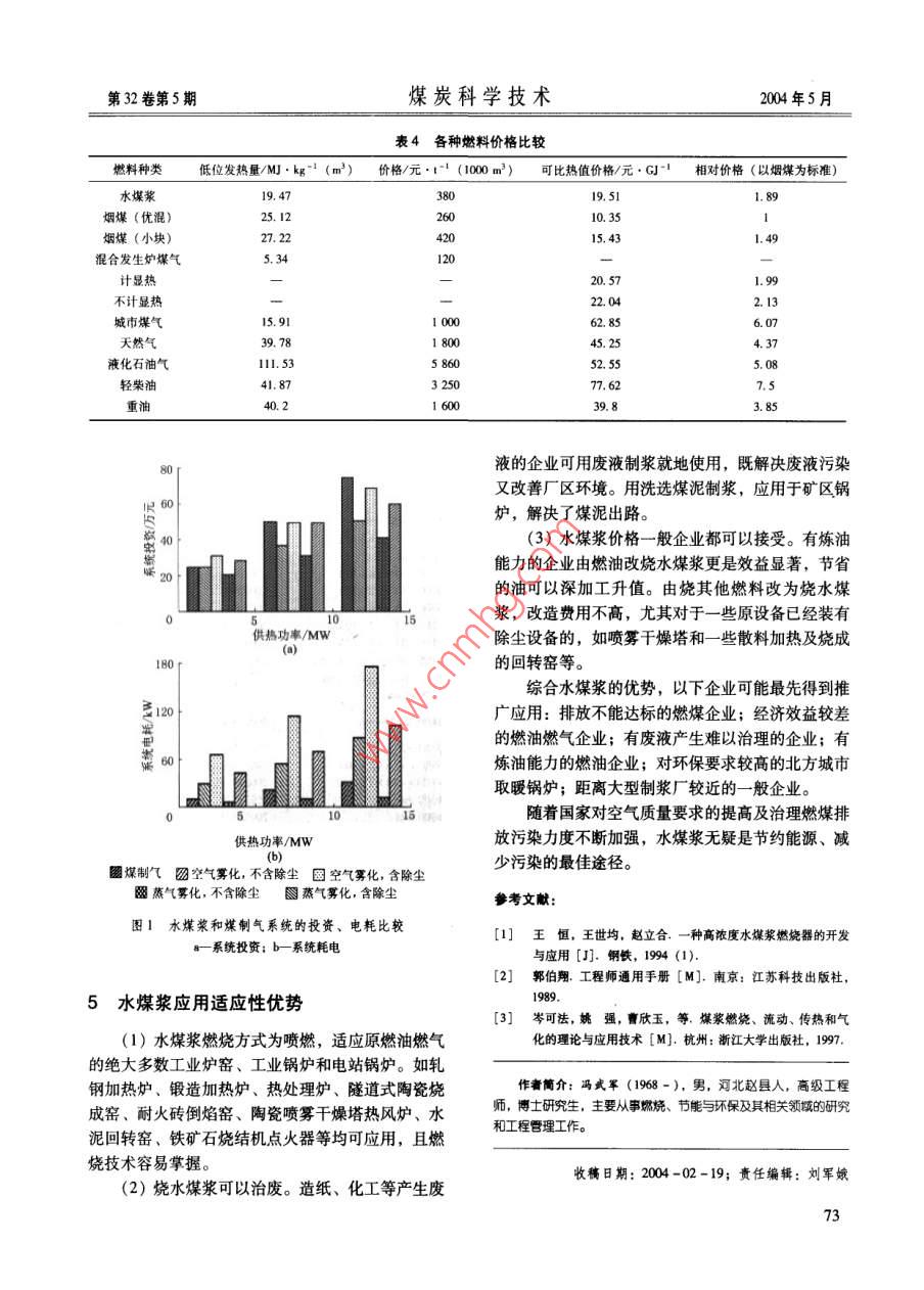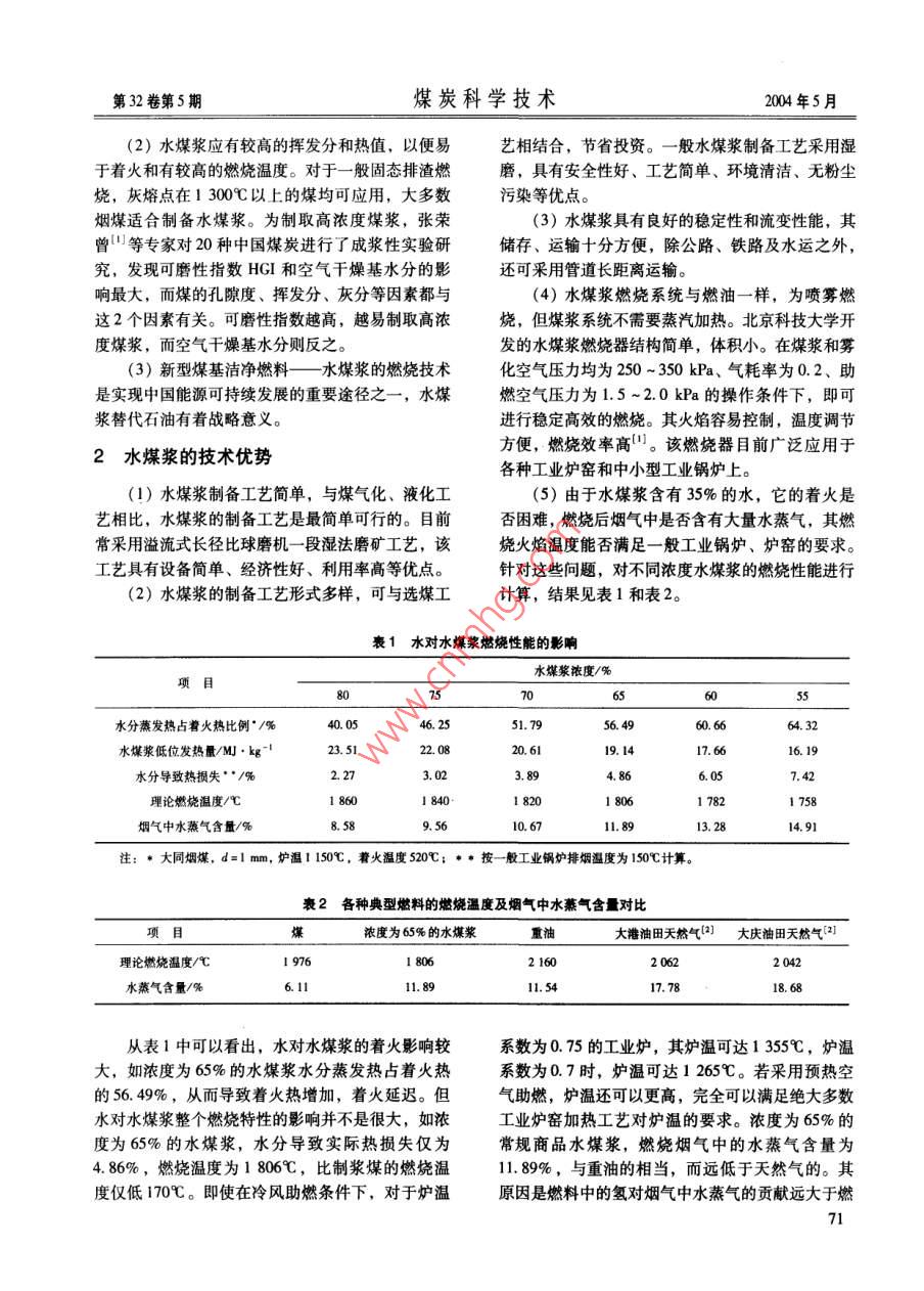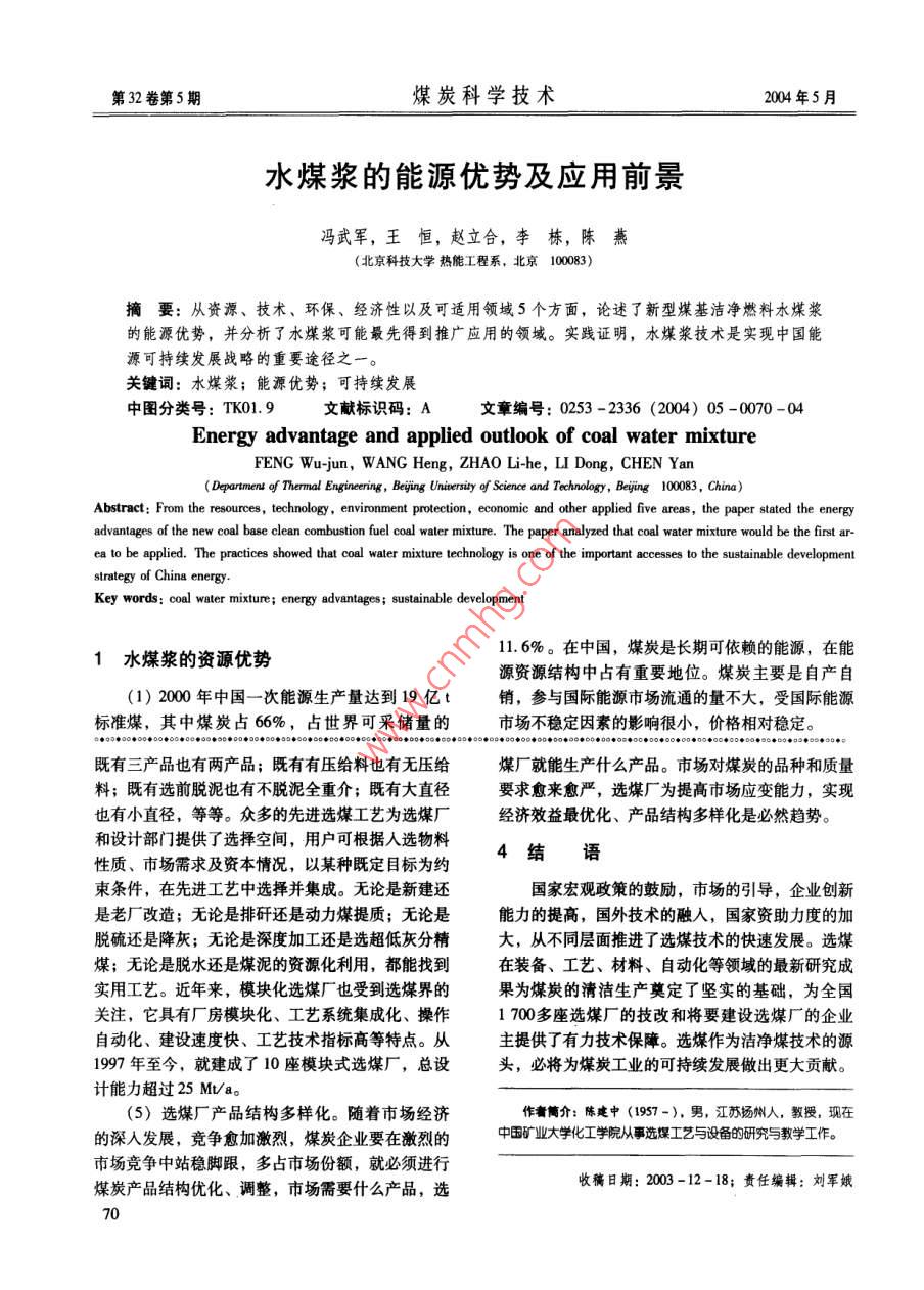 第32卷第5期煤炭科學(xué)技術(shù)004年5月水煤漿的能源優(yōu)勢及應(yīng)用前景馮武軍,王恒,趙立合,李棟,陳燕(北京科技大學(xué)熱能工程系,北京100083)摘要:從資源、技術(shù)、環(huán)保、經(jīng)濟性以及可適用領(lǐng)域5個方面,論述了新型煤基潔凈燃料水煤漿的能源優(yōu)勢,并分析了水煤漿可能最先得到推廣應(yīng)用的領(lǐng)域。實踐證明,水煤漿技術(shù)是實現(xiàn)中國能源可持續(xù)發(fā)展戰(zhàn)略的重要途徑之一。關(guān)鍵詞:水煤漿;能源優(yōu)勢;可持續(xù)發(fā)展中圖分類號:TK01.9文獻標(biāo)識碼:A文章編號:0253-2336(2004)05-0070-0Energy advantage and applied outlook of coal water mixtureFENG Wu-jun, WANG Heng, ZHAO Li-he, LI Dong, CHEN YanDepartment of Thermal Engineering, Beying University of Science and Technology, Beiing 100083, ChinaAbstract: From the resources, technology, environment protection, economic and other applied five areas, the paper stated the energyadvantages of the new coal base clean combustion fuel coal water mixture. The paper analyzed that coal water mixture would be the first area to be applied. The practices showed that coal water mixture technology is one of the important accesses to the sustainable developmenKey words: coal water mixture; energy advantages; sustainable development1水煤漿的資源優(yōu)勢11.6%。在中國,煤炭是長期可依賴的能源,在能源資源結(jié)構(gòu)中占有重要地位。煤炭主要是自產(chǎn)自(1)2000年中國一次能源生產(chǎn)量達(dá)到19億銷,參與國際能源市場流通的量不大,受國際能源標(biāo)準(zhǔn)煤,其中煤炭占66%,占世界可采儲量的市場不穩(wěn)定因素的影響很小,價格相對穩(wěn)定。3非。0000。0·0心·心⊙⊙0·000。00·.°·⊙··。?!?°0。,⊙0⊙⊙⊙。00。。99◆⊙⊙⊙000⊙⊙·⊙0心⊙專G00●00。0●00004既有三產(chǎn)品也有兩產(chǎn)品;既有有壓給料也有無壓給煤廠就能生產(chǎn)什么產(chǎn)品。市場對煤炭的品種和質(zhì)量料;既有選前脫泥也有不脫泥全重介;既有大直徑要求愈來愈嚴(yán),選煤廠為提高市場應(yīng)變能力,實現(xiàn)也有小直徑,等等。眾多的先進選煤工藝為選煤廠經(jīng)濟效益最優(yōu)化、產(chǎn)品結(jié)構(gòu)多樣化是必然趨勢。和設(shè)計部門提供了選擇空間,用戶可根據(jù)入選物料性質(zhì)、市場需求及資本情況,以某種既定目標(biāo)為約束條件,在先進工藝中選擇并集成。無論是新建還國家宏觀政策的鼓勵,市場的引導(dǎo),企業(yè)創(chuàng)新是老廠改造;無論是排矸還是動力煤提質(zhì);無論是能力的提高,國外技術(shù)的融入,國家資助力度的加脫硫還是降灰;無論是深度加工還是選超低灰分精大,從不同層面推進了選煤技術(shù)的快速發(fā)展。選煤煤;無論是脫水還是煤泥的資源化利用,都能找到在裝備、工藝、材料、自動化等領(lǐng)域的最新研究成實用工藝。近年來,模塊化選煤廠也受到選煤界的果為煤炭的清潔生產(chǎn)奠定了堅實的基礎(chǔ),為全國關(guān)注,它具有廠房模塊化、工藝系統(tǒng)集成化、操作1700多座選煤廠的技改和將要建設(shè)選煤廠的企業(yè)自動化、建設(shè)速度快、工藝技術(shù)指標(biāo)高等特點。從主提供了有力技術(shù)保障。選煤作為潔凈煤技術(shù)的源1997年至今,就建成了10座模塊式選煤廠,總設(shè)頭,必將為煤炭工業(yè)的可持續(xù)發(fā)展做出更大貢獻計能力超過25Mt/a。(5)選煤廠產(chǎn)品結(jié)構(gòu)多樣化。隨著市場經(jīng)濟作者筒介:陳建中(1957-),男,江蘇揚州人,教授,現(xiàn)在的深入發(fā)展,競爭愈加激烈,煤炭企業(yè)要在激烈的中國礦業(yè)大學(xué)化工學(xué)院從事選煤工藝與設(shè)備的研究與教學(xué)工作市場競爭中站穩(wěn)腳跟,多占市場份額,就必須進行煤炭產(chǎn)品結(jié)構(gòu)優(yōu)化、調(diào)整,市場需要什么產(chǎn)品,選收稿日期:2003-12-18;責(zé)任編輯:劉軍娥第32卷第5期煤炭科學(xué)技術(shù)2004年5月(2)水煤漿應(yīng)有較高的揮發(fā)分和熱值,以便易藝相結(jié)合,節(jié)省投資。一般水煤漿制備工藝采用濕于著火和有較髙的燃燒溫度。對于一般固態(tài)排渣燃磨,具有安全性好、工藝簡單、環(huán)境清潔、無粉塵燒,灰熔點在1300℃以上的煤均可應(yīng)用,大多數(shù)污染等優(yōu)點。煙煤適合制備水煤漿。為制取高濃度煤漿,張榮(3)水煤漿具有良好的穩(wěn)定性和流變性能,其曾等專家對20種中國煤炭進行了成漿性實驗研儲存、運輸十分方便,除公路、鐵路及水運之外究,發(fā)現(xiàn)可磨性指數(shù)HGI和空氣干燥基水分的影還可采用管道長距離運輸。響最大,而煤的孔隙度、揮發(fā)分、灰分等因素都與(4)水煤漿燃燒系統(tǒng)與燃油一樣,為噴霧燃這2個因素有關(guān)??赡バ灾笖?shù)越高,越易制取高濃燒,但煤漿系統(tǒng)不需要蒸汽加熱。北京科技大學(xué)開度煤漿,而空氣干燥基水分則反之。發(fā)的水煤漿燃燒器結(jié)構(gòu)簡單,體積小。在煤漿和霧(3)新型煤基潔凈燃料——水煤漿的燃燒技術(shù)化空氣壓力均為250~350kPa、氣耗率為0.2、助是實現(xiàn)中國能源可持續(xù)發(fā)展的重要途徑之一,水煤燃空氣壓力為15~2.0kPa的操作條件下,即可漿替代石油有著戰(zhàn)略意義。進行穩(wěn)定高效的燃燒。其火焰容易控制,溫度調(diào)節(jié)2水煤漿的技術(shù)優(yōu)勢方便,燃燒效率高。該燃燒器目前廣泛應(yīng)用