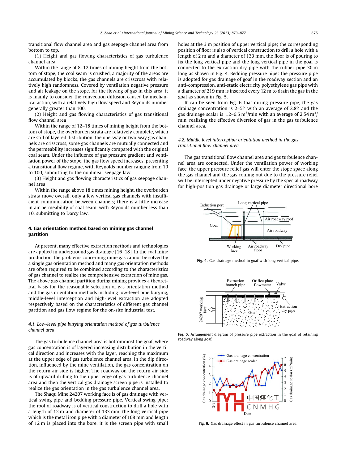 International Journal of Mining Science and Technology 23(2013)873-877Contents lists available at Science DirectInternational Journal of Mining Science and TechnologyELSEVIERurnalhomepagewww.elsevier.com/locate/ijmstPartitioning characteristics of gas channel of coal-rock mass in miningspace and gas orientation methodZhao Zhiqiang Ma Nianjie Jia Housheng Cheng Yuanpingl of resource and Safety Engineering, China University of Mining 8 Technional Engineering Research Center for Coal Gotrol, China University of8 Technolohou 221008. ChinaARTICLE INFOA BSTRACTArticle historIn order to research the influence of coal-rock mass morphology of mining space on the flow law of gas,Received 22 March 2013the laboratory physical model and numerical computation methods were adopted to simulate coal min-Received in revised form 20 April 2013Accepted 10 May 2013ing activities. The simulation results indicate that, after coal seam mining the loose rock accumulationber 2013body of free caving, ordered rock arrangement body of plate damage rich in longitudinal and transversefractures and horizontal fissure body formed by rock mass deformation imbalance are formed frombottom to top in the mining space. For these three types of accumulation bodies, there are essentialGas channeldifferences in the accumulation state, rock size and gas breakover characteristics. According to thisPartitioning characteristicsthe coal-rock mass in the mining space is classified into gas turbulence channel area, gas transitional flowchannel area and gas seepage channel area. In the turbulence channel area, the gas is distributed transGas orientation methodersely and longitudinally and gas diffuses in the form of convection with Reynolds number re more than0: in the transitional flow channel area, one-way or two-way gas channels are crisscross and gas is oftransitional flow regime with Re between 10 and 100. In the seepage channel area, there are a few verticalas channels with Re less than 10. In this paper, the researches on the gas orientation method in differentpartitions were further carried out, gas orientation methods of low-level pipe burying, middle-levelinterception and high-level extraction were determined and an on-site industrial test was conductedachieving the effective diversion of gas and verifying the reasonableness of gas channel partitiono 2013 Published by Elsevier B V. on behalf of China University of Mining Technology1 Introductioncoal mines is mainly guided by the theory of"upper three zonesbut the theory of"upper three layers"was proposed from theCoal mine gas drainage is both the need for safety guarantee of aspect of overburden destruction and roof control in coal miningoal energy production and the demand for fully mining energy without considering the gas flow regime characteristics whichesources, which has become a basic national policy of China have an important influence on the gas drainage. The engineering[1, 2]. Gas drainage is classified into ground extraction and practice shows that the change area of gas flow regime characterunderground extraction, forming a gas channel is essential to istics does not completely coincide with the division boundary ofUnderground gas drainage, while mining fissure is the main reason the traditional"upper three zones". Therefore, on the basis of existfor gas channel. Researching the development and evolution law of ing mine pressure research achievements including theory ofmining fissure is the basis to judge the formation and expansion of"upper three zones", the gas channel of coal-rock mass in thegas channel and conduct gas drainage design [ 3-5. In coal mining mining space is partitioned by considering the gas flow regimeof China, in the research of overburden failure and mining fissure characteristics and gas orientation method is studied based ondevelopment law, many mining scholars with academician Qiathe gas channel partition, providing a theoretical basis for aceMinggao as the representative have done a lot of work and system- rately guiding the gas drainage designatical research to form the theory of"upper three zones"in overburden movement and destruction on the stope, i. e caving zone,fissure zone and bending sinking zone, playing a major guiding role 2 Gas channel development law of coal-gas mass in miningin roof control and disaster prevention and treatment on coal stope space[6-8 At present, the underground gas drainage design in ChineseAfter the overburden strata are influenced by mining, asynchro-nous bending and中國煤化工 enerated betweenCorponding author. Tel. +86 18618405706the rock strataeparation layersE-mailaddresscaikuangren@126.com(z.Zhaowhere gas canCN MH Channels generatedh t: /d. do, oree o m imes.2013. 10014 hned Dy Elsevier Bv, on ehalt of China University ot Mining technolOgy74Science and Technology 23(2013)873-877by rock mass deformation, instability and destruction caused by insufficient channel communication, which is very difficult to formmining are called mining gas channels, which can greatly change gas channel network. There is a little increasing in air permeabilityof coal-rock mass, providing a space for the of coal seam, larger than the original air permeability of coal massfollowing and convergence of pressure relief gas [9In order to research the development and distribution law of6 To sum up, after coal seam mining, loose rock accumulationdy of free caving, ordered rock arrangement body of platehe overburden gas channels, the laboratory similar simulation test damage rich in longitudinal and transverse fractures and horizon(Fig. 1)and numerical simulation test(Fig. 2)were carried out in tal fissure body formed by rock mass deformation imbalance arethe coal seam group mining in Yangquan mining areaformed from bottom to top in the mining space, with essentialBy comprehensively analyzing the test results, it is found that difference in accumulation state, rock size and breakover characwithin the range of 8-12 times mining he