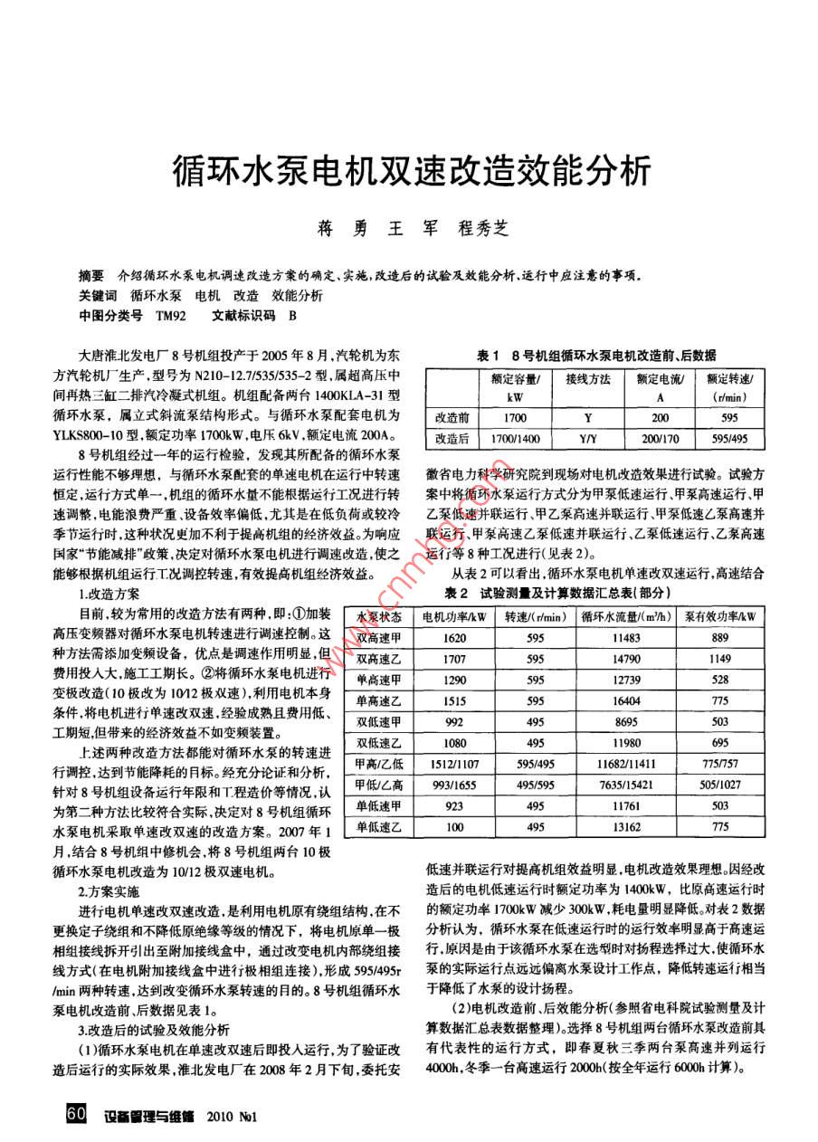 循環(huán)水泵電機雙速改造效能分析蔣勇王軍程秀芝摘要介紹循環(huán)水泵電機調(diào)速改造方案的確定、實施,改造后的試驗及效能分析.運行中應(yīng)注意的事項。關(guān)鍵詞循環(huán)水泵電機改造效能分析中國分類號TM92文獻(xiàn)標(biāo)識碼B大唐淮北發(fā)電廠8號機組投產(chǎn)于2005年8月,汽輪機為東表18 號機組循環(huán)水泵電機改造前、后數(shù)據(jù)方汽輪機廠生產(chǎn).型號為N210-12./535/535-2型,屬超高壓中額定容量/|接線方法額定電流額定轉(zhuǎn)速/間再熱三缸二排汽冷凝式機組。機組配備兩臺1400KLA-31 型kWA(r/min)循環(huán)水泵,屬立式斜流泵結(jié)構(gòu)形式。與循環(huán)水泵配套電機為改造前1700200595YLKS800-10型,額定功率1700kW ,電壓6kV ,額定電流200A。改造后170/1400200/170595/4958號機組經(jīng)過一年的運行檢驗,發(fā)現(xiàn)其所配備的循環(huán)水泵運行性能不夠理想,與循環(huán)水泵配套的單速電機在運行中轉(zhuǎn)速徽省電力科學(xué)研究院到現(xiàn)場對電機改造效果進(jìn)行試驗。試驗方恒定,運行方式單一.機組的循環(huán)水量不能根據(jù)運行工況進(jìn)行轉(zhuǎn)案中將循環(huán)水泵運行方式分為甲泵低速運行甲泵高速運行甲速調(diào)整,電能浪費嚴(yán)重.設(shè)備效率偏低.尤其是在低負(fù)荷或較冷乙泵低速并聯(lián)運行、甲乙泵高速并聯(lián)運行甲泵低速乙泵高速并季節(jié)運行時,這種狀況更加不利于提高機組的經(jīng)濟效益。為響應(yīng)聯(lián)運行、甲泵高速乙泵低速并聯(lián)運行,乙泵低速運行,乙泵高速國家“節(jié)能減排"政策,決定對循環(huán)水泵電機進(jìn)行調(diào)速改造,使之運行等8種工況進(jìn)行(見表2)。能夠根據(jù)機組運行工次調(diào)控轉(zhuǎn)速,有效提高機組經(jīng)濟效益。從表2可以看出,循環(huán)水泵電機單速改雙速運行,高速結(jié)合1.改造方案表2試驗測及計算數(shù)據(jù)匯總表(部分)目前,較為常用的改造方法有兩種,即:①加裝「水泵狀態(tài) I 電機功率AW轉(zhuǎn)速(