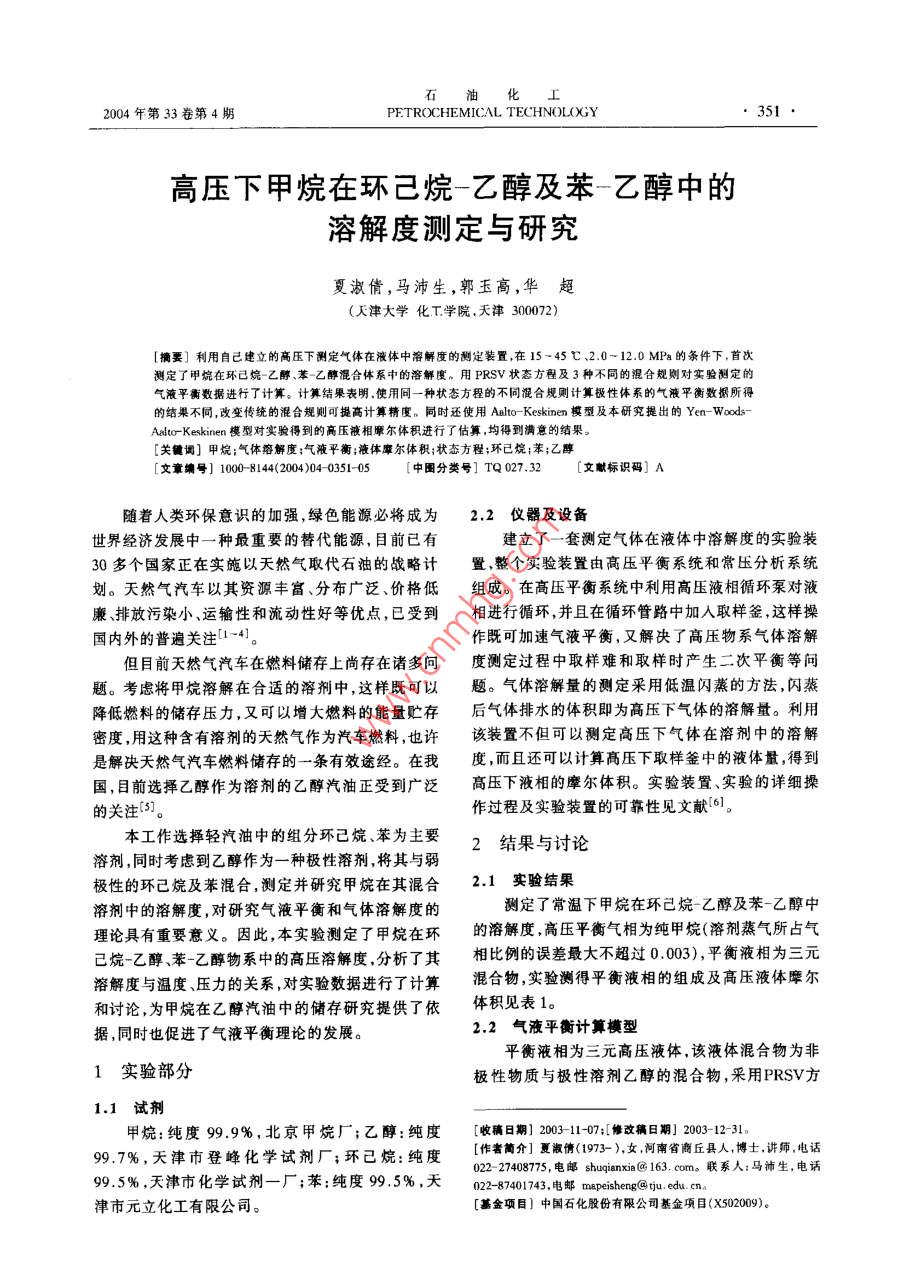 高壓下甲烷在環(huán)己烷-乙醇及苯-乙醇中的溶解度測定與研究