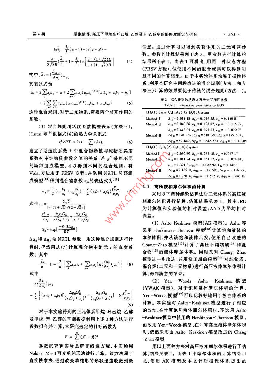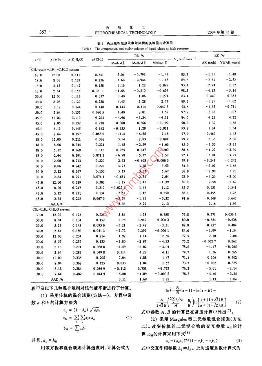 2004午第33卷第4期PETROCHEMICAL TECHNOLOGY351高壓下甲烷在環(huán)己烷-乙醇及苯-乙醇中的溶解度測定與研究夏淑倩,馬沛生,郭玉高,華超(天津大學(xué)化T學(xué)院,天津3072[摘要]利用自己建立的高壓下測定氣體在液體中溶解度的測定裝置在15-45℃、2.0-12.0MPa的條件下,首次測定了甲烷在環(huán)已烷乙酵苯乙醇混合體系中的溶解度。用PRSV狀態(tài)方程及3種不同的混合覿則對實(shí)驗(yàn)測定的氣液平衡數(shù)據(jù)進(jìn)行了計算。計算結(jié)果表明使用同一種狀態(tài)方程的不同混合規(guī)則計算極性體系的氣液平衡數(shù)據(jù)所得的結(jié)果不同,改變傳統(tǒng)的混合規(guī)則可提高計算精度。同時還使用Al- Keskinen模型及本研究提出的Yen-WadsAaltorKeskinen模型對實(shí)驗(yàn)得到的高壓液相摩爾體積進(jìn)行了估算,均得到滿意的結(jié)果[關(guān)鍵詞]甲烷;氣體溶解度;氣液平衡;液體摩爾體積;狀態(tài)方程;環(huán)已烷;苯;乙醇[文章編號]100081442004)040351-05中圈分類號]TQ02732[文獻(xiàn)標(biāo)識碼]A隨著人類環(huán)保意識的加強(qiáng)綠色能源必將成為22儀器及設(shè)備世界經(jīng)濟(jì)發(fā)展中一種最重要的替代能源,目前已有建立了一套測定氣體在液體中溶解度的實(shí)驗(yàn)裝30多個國家正在實(shí)施以天然氣取代石油的戰(zhàn)略計置整個實(shí)驗(yàn)裝置由高壓平衡系統(tǒng)和常壓分析系統(tǒng)劃。天然氣汽車以其資源豐富、分布廣泛、價格低組成。在高壓平衡系統(tǒng)中利用高壓液相循環(huán)泵對液廉、排放污染小、運(yùn)輸性和流動性好等優(yōu)點(diǎn),已受到相進(jìn)行循環(huán),并且在循環(huán)管路中加入取樣釜,這樣操國內(nèi)外的普遍關(guān)注-4。作既可加速氣液平衡,又解決了高壓物系氣體溶解但目前天然氣汽車在燃料儲存上尚存在諸多問度測定過程中取樣難和取樣時產(chǎn)生二次平衡等問題??紤]將甲烷溶解在合適的溶劑中,這樣既可以題。氣體溶解量的測定采用低溫閃蒸的方法閃蒸降低燃料的儲存壓力,又可以增大燃料的能量貯存后氣體排水的體積即為高壓下氣體的溶解量。利用密度,用這種含有溶劑的天然氣作為汽車燃料,也許該裝置不但可以測定高壓下氣體在溶劑中的溶解是解決天然氣汽車燃料儲存的一條有效途經(jīng)。在我度,而且還可以計算高壓下取樣釜中的液體量,得到國,目前選擇乙醇作為溶劑的乙醇汽油正受到廣泛高壓下液相的摩爾體積。實(shí)驗(yàn)裝置、實(shí)驗(yàn)的詳細(xì)操的關(guān)注5作過程及實(shí)驗(yàn)裝置的可靠性見文獻(xiàn)61。本工作選擇輕汽油中的組分環(huán)已烷苯為主要2結(jié)果與討論溶劑,同時考慮到乙醇作為一種極性溶劑,將其與弱極性的環(huán)己烷及苯混合,測定并研究甲烷在其混合21實(shí)驗(yàn)結(jié)果溶劑中的溶解度,對研究氣液平衡和氣體溶解度的測定了常溫下甲烷在環(huán)已烷-乙醇及苯-乙醇中理論具有重要意義。因此,本實(shí)驗(yàn)測定了甲烷在環(huán)的溶解度高壓平衡氣相為純甲烷(溶劑蒸氣所占?xì)庖淹橐掖?、?乙醇物系中的高壓溶解度,分析了其相比例的誤差最大不超過0003),平衡液相為三元溶解度與溫度、壓力的關(guān)系,對實(shí)驗(yàn)數(shù)據(jù)進(jìn)行了計算混合物實(shí)驗(yàn)測得平衡液相的組成及高壓液體摩爾和討論,為甲烷在乙醇汽油中的儲存研究提供了依體積見表1據(jù),同時也促進(jìn)了氣液平衡理論的發(fā)展。22氣液平衡計算模型平衡液相為三元高壓液體,該液體混合物為非1實(shí)驗(yàn)部分極性物質(zhì)與極性溶劑乙醇的混合物,采用PRSⅤ方1.1試劑甲烷:純度99.9%,北京甲烷廠;乙醇:純度收稿日期]2001107修改稿日期]200123199.7%,天津市登峰化學(xué)試劑廠;環(huán)已烷:純度作者簡介]夏椒倩《(973}),女河南省商丘縣人博士,講師電話022-27408775,電郵shuqianxia@163.com。聯(lián)系人:馬沛生,電話99.5%,天津市化學(xué)試劑一廠;苯:純度99.5%022-87401743,電郵mapeisheng@tju.edu.cna津市元立化工有限公基金項(xiàng)目]中國石化股份有限公司基金項(xiàng)目(X502009)石油化工352PETROCHEMICAL TECHNOLOGY2004年第33卷表1高壓液相組成及摩爾體積的實(shí)驗(yàn)值與計算值Tablel The composition and molar volume of liquid phase at high pressureRD%RD,℃ P/MPa r(C2HO)x(CH)MethodI Method Method V/emmo-1AK model YWAK modelCH"cyclo-C,.O system18,012.000.3410.7961.411.480.1422.1693,418.0l.680.4100.656-4.1330.012.000.33730.00,1290,2384.4530,00.047593.80,71130.00.080597.92,0245012.000,1190.2934.2245.00.1320.3000.3660.19245.05.130.1450.9350,9111.640.0680-6,850,4600,2112.36t8.85220,955-0.847-0.20988.63.39-6.98-0.608-0.00030.24130.00.2283.1884,95.6388.8.230.65192.9L2.000,2190.303L.390.212-0.02240.27188.L2.640.2920.06701,953.3291.62.13CH4-CHs-CHO system2.020.1230.22551.5376,8056330,8.040,15230.05,130.1430.0950-3218200.73730.02,640.1500.0513000.2141.9272.50.257-4.3330.00.08884.5978.6L,470.9050.2830.0498-0,5141.360.56530,012.000.3350.2057.041.8871.10.30273.70.32530,05.130.3840.0869-0.1376.20130,00,4020,04495.00-1,09-0.000278.3-3.25程及以下幾種混合規(guī)則對該氣液平衡進(jìn)行了計算。n=(z-1)-ln(z-B)-(1)采用傳統(tǒng)的混合規(guī)則(方法一)。方程中常數(shù)a和b的計算方法為A(2xyAB1ln「x+(1+2)Ba=(1-k)√aA式中參數(shù)A,B的計算已在常壓計算中列出aM=∑∑xp(2)采用 Margules型二元參數(shù)混合規(guī)則(方法b=∑x二)。改變傳統(tǒng)的二元混合物的交互參數