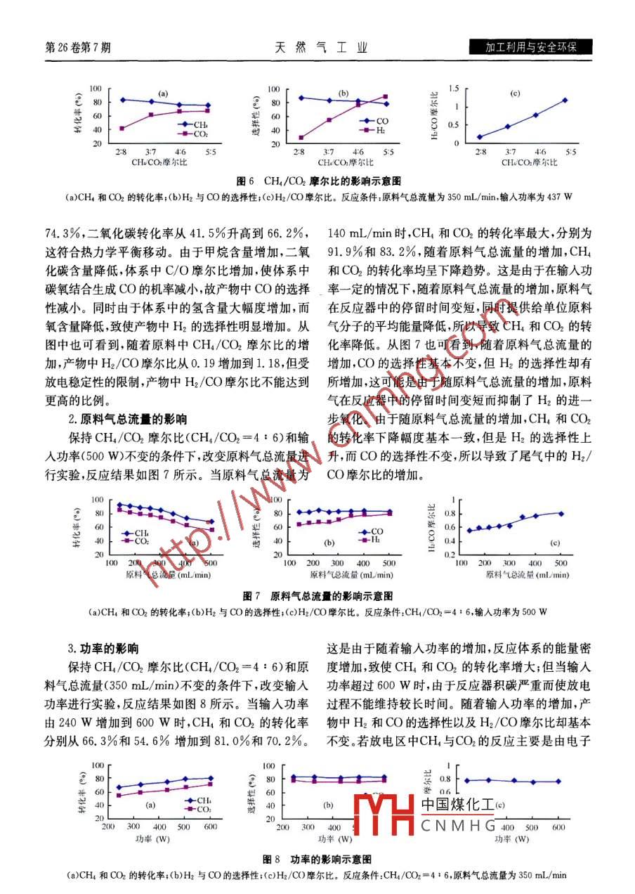 第26卷第7期天然氣工業(yè)加工利用與安全環(huán)保反常輝光放電下CH4-CO2轉(zhuǎn)化制合成氣龍華麗余徽陳琦12印永祥1戴曉雁1(1.四川大學(xué)化工學(xué)院2.中國石油獨山子石化公司)龍華麗等.反常輝光放電下CH4-CO2轉(zhuǎn)化制合成氣.天然氣工業(yè),2006,26(7):123-126.摘要在常壓下,利用一種新型的反常輝光放電反應(yīng)器,使CO重整CH制取合成氣。實驗表明,反應(yīng)體系輸入功率、原料氣配比和流量等對反應(yīng)結(jié)果有著較大影響。在常壓下,當輸入功率為437W、n(CH4):n(CO2)4:6及流量為140mL/min時,CH4和CO2的轉(zhuǎn)化率分別高達91.9%和83.2%,并且CO和H2的選擇性分別為82.4%和62.1%。通過調(diào)配原料的配比,可以得到不同n(H2):n(CO比值的合成氣。主題詞反常輝光放電甲烷二氧化碳轉(zhuǎn)化制備合成氣轉(zhuǎn)化率甲烷和二氧化碳是兩種主要的溫室氣體,并且離子體的部分特點,有著獨特的溫度分布和能量分許多天然氣中都有一定濃度的二氧化碳。如何有效布。筆者利用常壓下反常輝光放電反應(yīng)器使CH利用二者為世界范圍內(nèi)眾多研究者所關(guān)注。CH4和和CO2發(fā)生反應(yīng),獲得了較高的原料轉(zhuǎn)化率和COCO2化學(xué)穩(wěn)定性很高,通過常規(guī)方法難以直接轉(zhuǎn)化選擇性。為有用的產(chǎn)品。CH4和CO2重整制合成氣是熱力學(xué)上可行的反應(yīng),可同時利用兩種C1資源但為了、實驗部分抑制積碳等副反應(yīng)的發(fā)生,一般需在低壓或高溫下1.反常輝光放電反應(yīng)器進行,能耗很大。反常輝光放電反應(yīng)器結(jié)構(gòu)如圖1所示,采用冷等離子體又稱非平衡態(tài)等離子體,通常由介針一板式電極結(jié)構(gòu),電極間隙為10mm。高壓電極質(zhì)阻擋放電、電暈放電輝光放電等產(chǎn)生。在冷等離是一直徑為6mm的不銹鋼棒,其放電端為橢圓形;子體中,重粒子溫度T(300~500K)較低,電子溫度T(10000K以上)較高,T>Tg,然而由于重粒高壓哦極子密度遠大于電子密度,系統(tǒng)整體溫度T近似為重尾氣出匚粒子T的溫度。冷等離子體技術(shù)能在常溫常壓條冷卻水出口件下有效地將能量輸入到反應(yīng)體系中,激活惰性分冷卻水入口→子并使之反應(yīng)。國內(nèi)外已開展了大量冷等離子體轉(zhuǎn)低電極了化CH4-CO2制合成氣的研究,在介質(zhì)阻擋放電條件下CH4-CO2反應(yīng)的產(chǎn)物比較復(fù)雜,產(chǎn)物包括原料氣入口CO、H2、C2~C4烴、含氧化物、C以上烴和高聚物24;電暈放電下CH4和CO2雖然獲得了較高的圖1反應(yīng)器結(jié)構(gòu)圖轉(zhuǎn)化率,但脈沖電暈等離子體在空間分布上是非連低壓電極是直徑為9mm的鐵質(zhì)圓柱體,其中心開續(xù)的,反應(yīng)區(qū)較小,使原料處理量較低6;微波等離有一內(nèi)徑為1.5mm的光滑孔道,原料氣就通過此子體轉(zhuǎn)化甲烷大多都要求減壓操作,不僅生產(chǎn)能力孔道進入放電區(qū)進行反應(yīng)。兩電極通過一根內(nèi)徑為低,而且不利于提高能量效率28mm的圓管連接,此圓管中部為帶有冷卻夾套的反常輝光放電是介于正常輝光放電和弧光放電鐵管化想管守論亞田220V、50Hz交之間的一種放電形式0,它具有冷等離子體和熱等流電中國煤化工就高壓電后輸入到CNMHG本成果受到國家自然科學(xué)基金(編號:10475060)資助作者簡介:龍華麗,女,1981年生,碩土研究生。地址:(610065)四川省成都市四川大學(xué)化工學(xué)院研究生部。電話:13348865689.E-mail:lililong007@163.com加工利用與安全環(huán)保天然氣工業(yè)2006年7月等離子體反應(yīng)器高壓電極。圖2是以氮氣為放電氣體時的反常輝光放電圖,可以明顯看到在兩電極之間存在一個圓柱形的輝光放電區(qū)。8圖5實驗流程示意圖1.CH4鋼瓶;2.CO2鋼瓶;3.針形閥;4.轉(zhuǎn)子流量計;5,混合器圖2反常輝光放電圖6.等離子體反應(yīng)器;7冷阱;8.皂沫流量計;9電源;10.氣相色譜圖3為常壓下,放電氣體為CH4和CO2的混合3.分析方法及數(shù)據(jù)處理氣時反常輝光放電的伏安特性曲線??梢钥吹椒闯J褂蒙虾7治鰞x器廠的102G型氣相色譜儀進輝光放電具有較高的電流密度因而可以為反應(yīng)提行氣相產(chǎn)物的定量分析,采用TCD檢測器,使用4mm×2000mm不銹鋼填充柱,內(nèi)填80~100目供更多的能量。圖4為常壓下,原料氣流量為400TDX01,以高純氬氣為載氣mL/min、CH4/CO2摩爾比為4:6、功率為500W反應(yīng)后在冷凝器中收集到少量的液相產(chǎn)物,經(jīng)時反常輝光放電反應(yīng)器內(nèi)的溫度分布。由圖4可看分析其中絕大部分是水,只有很微量的有機物。尾到,在反應(yīng)器中心的輝光放電區(qū)溫度保持一致且較氣冷凝后經(jīng)分析,主要含有甲烷、二氧化碳、一氧化高在輝光放電區(qū)的邊緣溫度急劇降低,然后隨著遠碳氫氣氧氣以及微量的氣態(tài)烴。反應(yīng)后拆開反應(yīng)離輝光放電區(qū)溫度逐漸降低器,在電極和器壁表面上均有少量積碳。筆者定義原料轉(zhuǎn)化率、產(chǎn)物選擇性等如下CH轉(zhuǎn)化率=(CH4轉(zhuǎn)化的摩爾量/CH4引人的摩爾量)×100%CO2轉(zhuǎn)化率=(CO2轉(zhuǎn)化的摩爾量/CO2引入的摩爾量)×100%50040004500500055006000放電電壓(V)H2選擇性=[H2生成的摩爾量/(2×CH4轉(zhuǎn)圖3伏安特性曲線圖化的摩爾量)]×100%CO選擇性=[CO生成的摩爾量/(CH4轉(zhuǎn)化的摩爾量+CO2轉(zhuǎn)化的摩爾量)]×100%H2/CO摩爾比=H2生成的摩爾量CO生成的摩爾量3691215二、結(jié)果與討論半