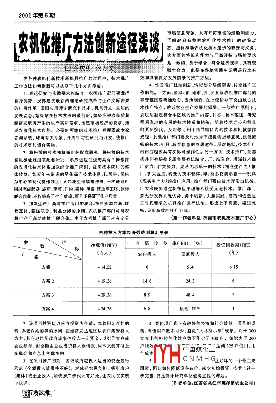 中國農(nóng)機(jī)化摘要本文從財務(wù)、用費(fèi)0.2萬元,人員工資146萬元,電費(fèi)0.7萬元,維修費(fèi)長期投資效益角度評價了秸0.3萬元,秸稈原料費(fèi)0.99萬元。單位供氣成本C=0.197稈氣化集中供氣系統(tǒng)在經(jīng)濟(jì)元/立方米。其中固定成本0.115元/立方米;可變成本稈氣化系上的可行性,進(jìn)行了靜動態(tài)0.082元/立方米,它包括人工費(fèi)0.033元/立方米、能源費(fèi)經(jīng)濟(jì)效益分析,并就提出的0.016元/立方米、原料費(fèi)0.022元/立方米等。固定成本是幾種投入機(jī)制進(jìn)行比較分總成本的主要組成部分,約占584%析,為該技術(shù)系統(tǒng)能否自我所以采用本項目的秸稈燃?xì)?每戶每月的支出約36發(fā)展、國家能否得益、農(nóng)戶能元,如農(nóng)戶用自產(chǎn)的秸稈相抵,則支出為32元,比目前使用否接受提出初步看法。本地石油液化氣節(jié)約支出近50%,與燒蜂窩煤每月支出相關(guān)鍵詞秸稈氣化項當(dāng)。因此,在這種生產(chǎn)成本下一般農(nóng)戶是可接受的。目評價經(jīng)濟(jì)效益分析經(jīng)濟(jì)效益評價系統(tǒng)經(jīng)濟(jì)效益目前秸稈氣化集中供1.靜態(tài)經(jīng)濟(jì)效益評價氣是一項我國現(xiàn)階段經(jīng)濟(jì)生氣化站正常運(yùn)行后,按向農(nóng)戶收取0.197元/立方米成□產(chǎn)條件下應(yīng)用于農(nóng)村地區(qū)的本費(fèi)計算,年總產(chǎn)值為865萬元(秸稈相抵暫不計),按綜胡新技術(shù),它從氣化站建沒、運(yùn)合折舊率7.2%(戶內(nèi)設(shè)施除外)計算年折舊費(fèi)為3.51萬夏、管理燃?xì)庀M(fèi)等基本上元,按前述年運(yùn)行總支出3.65萬元,得靜態(tài)經(jīng)濟(jì)效益年凈明還是政府行為,并未完全進(jìn)和鬧149萬元。由此可知,本項目為微利項目,但在系統(tǒng)計入市場,帶有福利色彩。將來算壽命期內(nèi),可使項目更新改造得以保證朱秸稈氣化集中供氣工程系統(tǒng)2.動態(tài)經(jīng)濟(jì)效益評價(國民經(jīng)濟(jì)評價)學(xué)是否能自我發(fā)展、完全進(jìn)入項目進(jìn)入正常運(yùn)行后,用成本一效益法動態(tài)經(jīng)濟(jì)評價明市場經(jīng)濟(jì),國家能否得益,農(nóng)主要評價參數(shù)有:凈現(xiàn)值(NPV)、內(nèi)部收益率(R)、投資回戶能否得益,除了在技術(shù)上收期(RP)。經(jīng)計算,按0.197元/立方米收取費(fèi)用,工程總進(jìn)一步改進(jìn)和完善外,還將投資50.3萬元都由政府或鄉(xiāng)鎮(zhèn)集體投資的方案(方案1)取決于該技術(shù)和系統(tǒng)實(shí)際應(yīng)其累計凈現(xiàn)值為-14.52萬元,故該方案不可取。當(dāng)按用的經(jīng)濟(jì)性。反過來說,當(dāng)這0.26%元/立方米以上收取費(fèi)用時,凈現(xiàn)值才會正值,即為技術(shù)成果大面積推廣時+5.27萬元,方案基本可取。農(nóng)戶每月燃?xì)庵С鰧⒃黾拥桨茨壳暗倪@種主要以政府加鎮(zhèn)村補(bǔ)貼的投資方式必然給政46.8元,仍低于液化氣,而政府卻由此背上了沉重負(fù)擔(dān),因府帶來沉重的經(jīng)濟(jì)負(fù)擔(dān),從而彩響該項技術(shù)推廣的健康發(fā)此長久之計此方案也不可取。此類項目如前所述,應(yīng)采取政展,故走市場化道路勢在必行府適當(dāng)補(bǔ)貼,引導(dǎo)農(nóng)戶集資或私人投資為好,即誰出錢誰用本文應(yīng)用成本一效益等方法對已使用的吳江市震澤鎮(zhèn)氣、誰受益,而且農(nóng)戶投入主要是為了改善生活質(zhì)量,不是等地秸稈氣化集中供氣系統(tǒng)項目的經(jīng)濟(jì)性作較全面的評為了獲利。下面提出三個方案進(jìn)行比較、探討,即農(nóng)戶分別價,為將來決策提供科學(xué)的參考依據(jù)投人30.3萬元(方案2)、40.3萬元(方案3)45.3萬元(方系統(tǒng)基本經(jīng)濟(jì)情況案4);國家或集體分別投入20萬元、10萬元5萬元。計算系統(tǒng)主要由氣化站、燃?xì)夤芫W(wǎng)和用戶室內(nèi)設(shè)施三大系時農(nóng)戶投入作收入,第一年收入、支出折半,以后幾年不變,統(tǒng),原則上以自然村為單元。按系統(tǒng)設(shè)計要求,供氣規(guī)模為向農(nóng)戶按成本價0.197元/立方米收取費(fèi)用,可算出凈現(xiàn)值200戶、氣柜容積300立方米、每戶每天消耗6立方米燃?xì)鉃?19.36萬元、+29.36萬元、+34.36萬元。以下四種方(3-4口之家)、保證每戶每小時不低于2立方米燃?xì)夤┌赣嬎愫髤R總?cè)缦马摫?。?yīng)。系統(tǒng)關(guān)鍵設(shè)備由山東引進(jìn),氣柜等就地開發(fā)生產(chǎn),建設(shè)由表可知,方案1國家(集體)投入過大,效益不好,負(fù)周期約8個月,系統(tǒng)初始總投資約50萬元,年運(yùn)行費(fèi)用擔(dān)太重;方案4國家(集體)投入過少,農(nóng)民負(fù)擔(dān)重;考慮到3.65萬元,平均戶投資0.25萬元。初始投資包括設(shè)備、土建戶數(shù)可能不夠的情況,以2、3方案較合適,其中第2方案等,運(yùn)行費(fèi)用包括工資能源、維修、原料等費(fèi)用。最好,國家(集體)和農(nóng)戶的IRR均大于10%。二、財務(wù)評價四、初步結(jié)論在這里僅與農(nóng)村其它炊事方式作比較,以評價項目在綜上所述,秸稈氣化集中供氣工程應(yīng)該說是一個具有財務(wù)上的可接受性和農(nóng)戶的可接受性,而暫不對產(chǎn)出的效益作較中國煤化工益性項目。要使這個項出評價。本文采用成本一效益法計算燃?xì)獾膯挝挥脷獬杀尽D空娴靡?、走市場化之?財務(wù)分析時,根據(jù)