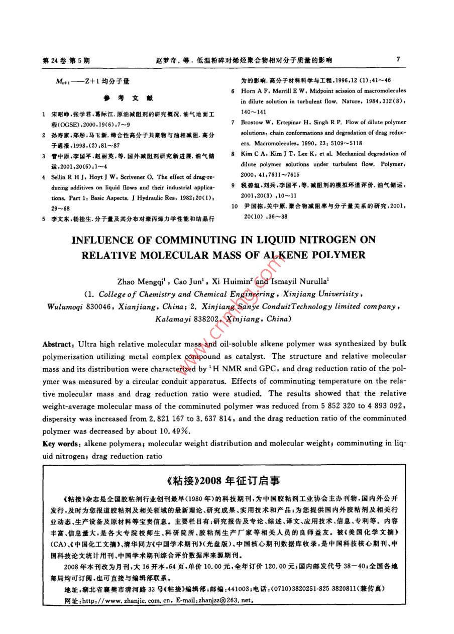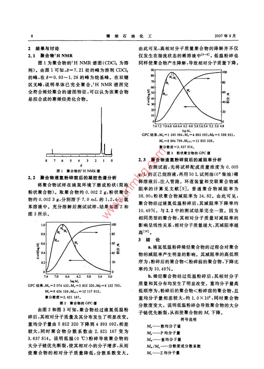 第24卷第5期精細(xì)石油化工2007年9月SPECIALITY PETROCHEMICALS低溫粉碎對(duì)烯烴聚合物相對(duì)分子質(zhì)量的影響趙夢(mèng)奇'曹 軍奚惠民*司馬義●努爾拉'"(1.新疆大學(xué)化學(xué)化工學(xué)院,新疆烏魯木齊830046;2.新疆三葉管道技術(shù)有限公司,新疆克拉瑪依834000)摘要:以金屬配合物為催化劑,采用本體聚合法合成了一類油溶性的超高相對(duì)分子質(zhì)量的烯烴類聚合物,用核磁共振、凝膠滲透色譜(GPC)和循環(huán)管道減阻測(cè)定裝置分別表征聚合物的構(gòu)成、相對(duì)分子質(zhì)量和減阻率。研究了在液氤環(huán)境中,將聚合物磨成粉末后,聚合物相對(duì)分子質(zhì)量的變化和減阻率的變化,并考察了低溫粉碎溫度對(duì)聚合物相對(duì)分子質(zhì)量和減阻率的影響。結(jié)果表明,烯烴聚合物經(jīng)液氮低溫粉碎后,其重均分子量由5 852 320下降到4 893 092 ,分散系數(shù)由2.821 167增加到3. 637 814,同時(shí)減阻率下降約10. 49%.關(guān)鍵詞:烯烴橐合物相對(duì)分子質(zhì)量及其分布 低溫粉碎 臧阻率中圈分類號(hào):0632.12 TQ325. 1文獻(xiàn)標(biāo)識(shí)碼:A自20世紀(jì)80年代以來,國內(nèi)外上百條輸油金壇市通濟(jì)儀器廠;Alliance GPC/V2000型凝膠管線使用減阻劑節(jié)約了大量的能源和資金,同時(shí)滲透色譜,美國Waters有限公司; BRUKER E-大大減少環(huán)境污染[~1]。在制備石油減阻劑產(chǎn)品QUINOX-55型傅里葉變換紅外光譜儀,美國時(shí),要將高相對(duì)分子質(zhì)量的聚合物和分散劑一起Perkin Elmer公司;INOVA-400型核磁共振儀,在低于其玻璃化溫度的環(huán)境中磨成粉末,并加入美國 Varian 公司。適當(dāng)?shù)奶砑觿┮灾瞥刹煌庥^形態(tài)和不同性能的1.3測(cè)試減阻劑產(chǎn)品(此過程簡稱配劑)。通常本體聚合產(chǎn)采用凝膠滲透色譜(GPC/V2000)測(cè)定聚合物可以直接置于低溫環(huán)境中磨碎,聚合物的相對(duì)物相對(duì)分子質(zhì)量及其分布。流動(dòng)相為1,2,4-三分子質(zhì)量及其分布的變化會(huì)對(duì)其最終產(chǎn)物(減阻氯苯,溫度為130 C,窄分布聚乙烯為標(biāo)樣,相對(duì)劑)的性能和用途產(chǎn)生重要的影響[5。筆者采用校正。本體聚合法合成了一類油溶性的減阻類烯烴聚合按照中國石油天然氣管道科技研究中心編制物,并通過液氮低溫粉碎,考察其相對(duì)分子質(zhì)量及的行業(yè)標(biāo)準(zhǔn)(標(biāo)準(zhǔn)號(hào)為SY/T 6578- -2003)測(cè)定減其分布的變化,與此相關(guān)研究目前還未見報(bào)道。阻劑減阻率,自制循環(huán)管道減阻測(cè)定裝置測(cè)試。1實(shí)驗(yàn)部分1.4聚合物的制備1.1原料及 試劑所有反應(yīng)均在無水無氧的條件下進(jìn)行。將充單體:Cs~Cw混合烯烴(各組分的質(zhì)量分?jǐn)?shù)分干燥的自制聚合瓶放入冰水浴中,控制反應(yīng)溫為: Cl280.0%,Co 10. 0%,Cg 7. 5%,Cs 1. 5%,度為0 C,高純度N2驅(qū)出瓶中的氧氣后,在磁力Co 1. 0%),百靈威公司進(jìn)口分裝;CS-1催化劑:攪拌下依次加人C;~C,混合烯烴單體、烷基鋁丙烯聚合高效催化劑,營口遼陽化工廠;助催化系配合物助催化劑、CS-1催化劑,并充分?jǐn)嚢?控劑:烷基鋁系配合物,分析純,Burris-Druck試劑制反應(yīng)溫度為0 C,反應(yīng)48 h后終止反應(yīng),所得公司;正已烷,分析純,西安化學(xué)試劑廠;1,3,5-三產(chǎn)物為半透明凝膠。在50 C的真空干燥箱中干氯苯,色譜純,德國Merk公司;聚乙烯標(biāo)樣,日本燥至恒重.昭和電工株式會(huì)社特殊化學(xué)品事業(yè)部;其余試劑均為分析純。收稿日期:2007 -02-25;修改稿收到日期:2007 -08 -20.1.2實(shí)驗(yàn)儀器作者簡介:趙夢(mèng)寺(1974-),女,講師,主要從事離子液體的.DZF 6050型恒溫真空干燥箱,上海精宏實(shí)驗(yàn)合成及其應(yīng)用的研究工作。E-mail; xjzmq@163. com.,基金項(xiàng)目:新疆雛晉爾自治 區(qū)高技術(shù)開發(fā)項(xiàng)目(200416117).設(shè)備有限公司; DJ-1 型大功率礅力攪拌器,江蘇■通訊聰系人,E-mailrismayilnu@ sohu. com.精細(xì)石油化工2007年9月2結(jié)果與討論由此可見,高相對(duì)分子質(zhì)量聚合物的降解并不僅2.1 聚合物'H NMR僅發(fā)生在湍流狀態(tài)的稀溶液中[6~8],低溫粉碎也圖1為聚合物的'HNMR譜圖(CDCl,為溶同樣使聚合物產(chǎn)生降解,導(dǎo)致相對(duì)分子質(zhì)量下降。劑)。由圖1可知,8=7.21處的峰為溶劑CDCl,oo的峰,在8=0.93~1.26的峰為烷基峰。在雙鍵0Ma700/M480區(qū)無峰,說明單體已完全聚合.H NMR譜圖完全符合烯烴聚合的譜圖特征,可以認(rèn)為該聚合物MM60更是擬合成的聚烯烴類化合物。40賣馬30-20o-/747.2 7.06.8 666.6 62 6.0 5.85.65.4 5.2 5.04.8logM.GPC結(jié)果:M。=1345 064.M。=4893 092;Mp -5598 931,M, =8864 799,M.+1=11 855 026,聚分散度=3.637 814.山圖3粉狀秦合物的GPC譜2.3聚 合物液氨粉碎前后的減阻率分析在測(cè)試前,先將試樣配成質(zhì)量濃度為0. 005圖1聚合物的'H NMR譜2.2聚合物液氨粉碎前后的凝膠色譜分析g/L的正已烷溶液,再用50L試劑油(0#柴油)稀將聚合物試樣在液氮環(huán)境下磨成粉狀(簡稱釋溶液后,注人管路。環(huán)道裝置和交聯(lián)聚合物減粉狀聚合物)。取聚合物約0.0022 g,粉狀聚合阻率的計(jì)算見文獻(xiàn)[9]。普通聚合物減阻率為物約0.002 3 g,分別溶于7.0 mL的1,2,4-三氯38. 90;粉狀聚合物減阻率為34. 82。由此可見,苯溶液中。充分溶解后測(cè)試試樣,結(jié)果如圖2和聚合物經(jīng)過液氮低溫粉