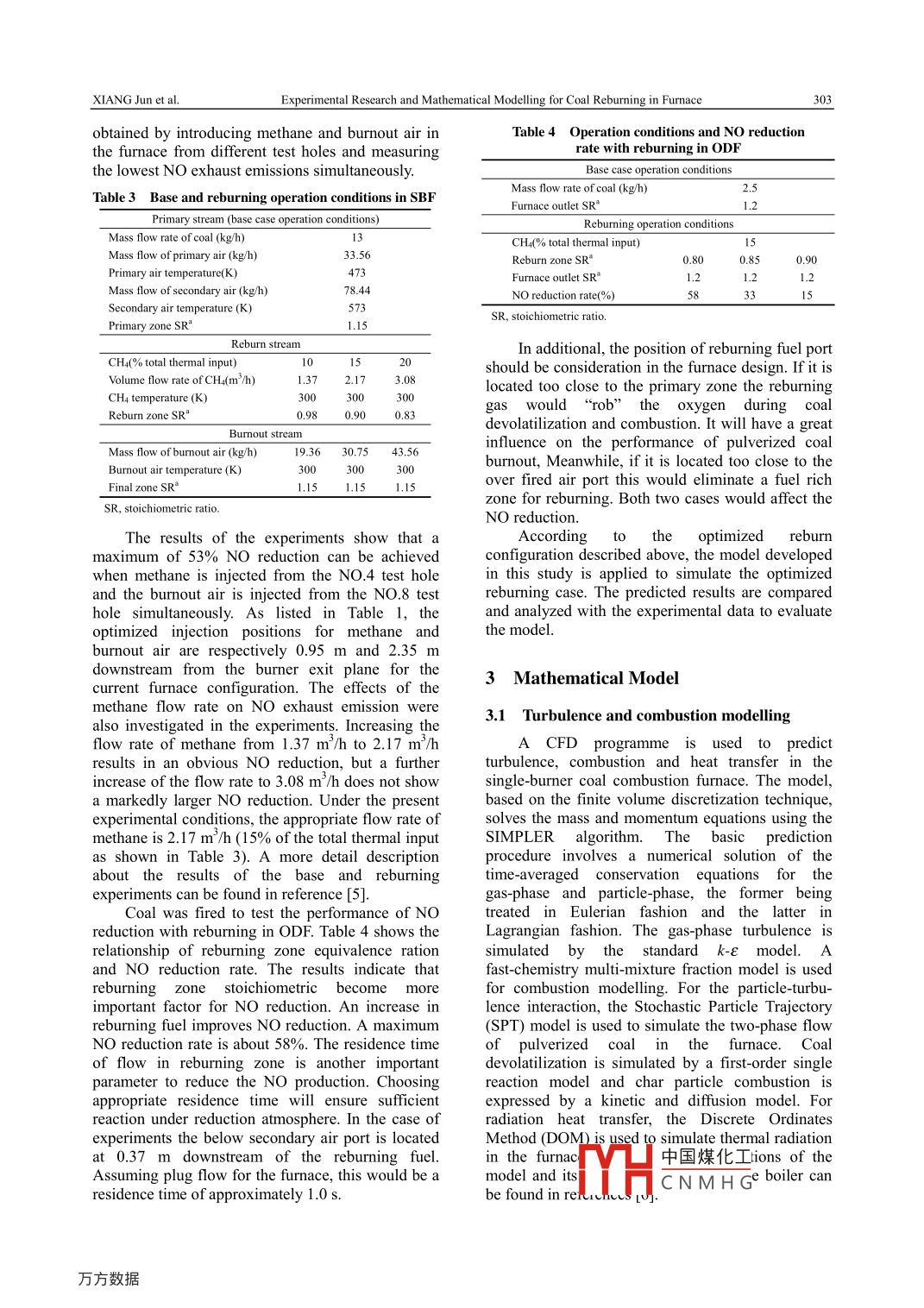Experimental Research and Mathematical Modelling for Coal Reburning in Furnace