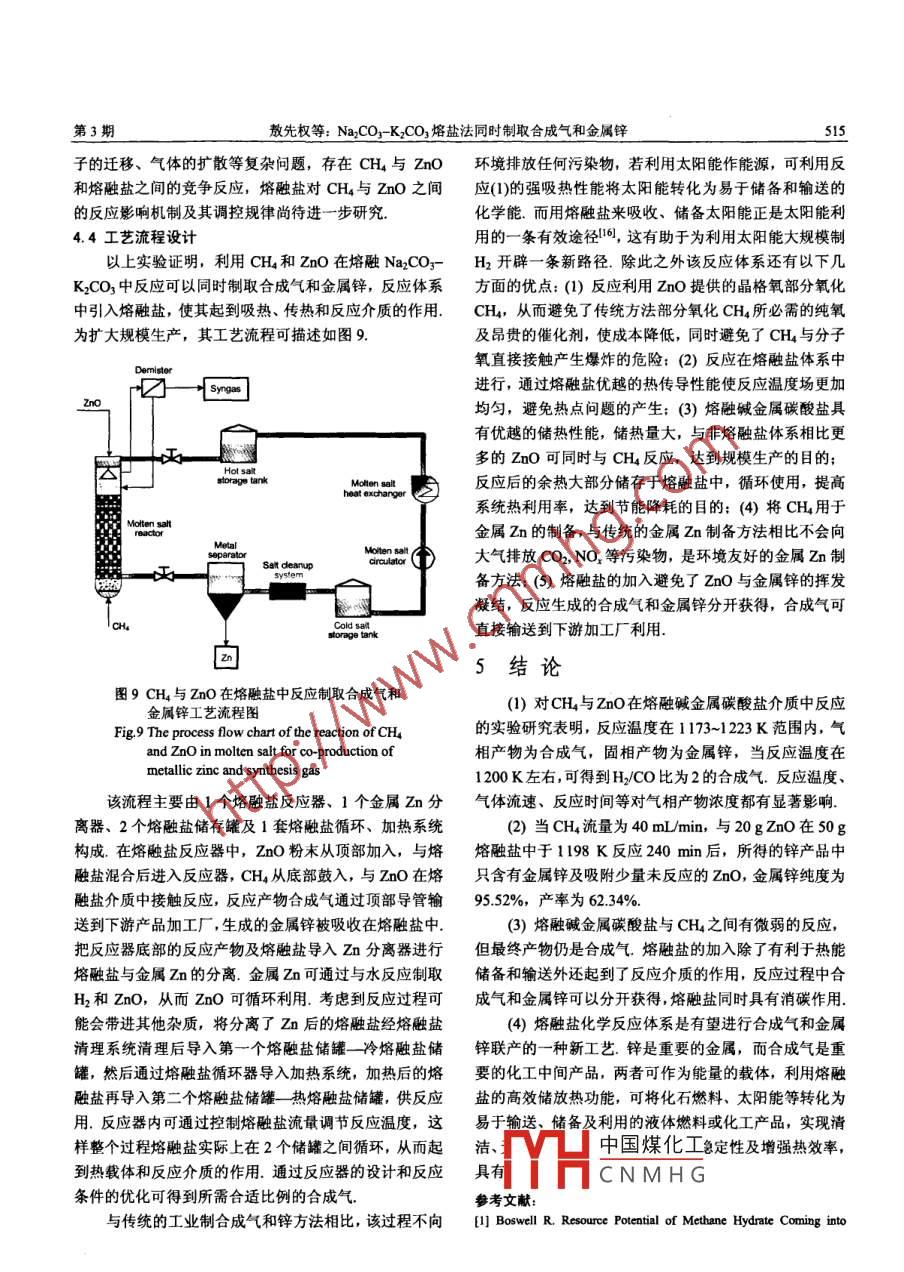 第8卷第3期過程工程學(xué)報(bào)vol 8 No. 32008年6月The Chinese Joumal of Process EngineeringJune 2008Na2CO3-KCO3熔鹽法同時(shí)制取合成氣和金屬鋅敖先權(quán)2,王華,魏永剛(1.昆明理工大學(xué)材料冶金工程學(xué)院,云南昆明650093:2.貴州大學(xué)化學(xué)工程學(xué)院,貴州貴陽55003)摘要:針對(duì)傳統(tǒng)的甲烷轉(zhuǎn)化制合成氣及金屬鋅制備技術(shù)的缺陷,提出了一種新型的熔融鹽反應(yīng)體系,在熔融鹽反應(yīng)器中以熔融鹽(質(zhì)量比為11的Na2COyK2CO3)為反應(yīng)介質(zhì)對(duì)CH4與ZnO反應(yīng)同時(shí)生成金屬鋅和合成氣作了實(shí)驗(yàn)研究,利用氣相色譜對(duì)氣體組分進(jìn)行了分析.結(jié)果表明,反應(yīng)尾氣組分主要是H2,CO和CH4,未檢測(cè)到CO2,其中合成氣的量及H2CO比例隨反應(yīng)溫度的升高而增加,在1198K左右獲得了H2CO比為2的合成氣.合成氣和金屬鋅分別從氣相和熔融鹽中獲得.用XRD,SEM及EDS對(duì)金屬鋅產(chǎn)品和熔融鹽進(jìn)行了表征,發(fā)現(xiàn)反應(yīng)后的熔融鹽含有少量Na2O和NaOH,來自于CH4與熔融鹽之間的微弱反應(yīng),由此推斷熔融鹽還具有消碳功能關(guān)鍵詞:甲烷;熔融鹽;合成氣;金屬鋅;同時(shí)制取中圖分類號(hào):TE646文獻(xiàn)標(biāo)識(shí)碼:A文章編號(hào):1009606X(2008)03-0511-061前言利用太陽光線對(duì)反應(yīng)物加熱,由于太陽光的不穩(wěn)定性,旦陽光中斷,反應(yīng)也得中斷,導(dǎo)致反應(yīng)不能連續(xù)進(jìn)行甲烷(CH4)是天然氣、煤層氣和甲烷水合物的主要熔融堿金屬碳酸鹽在能源轉(zhuǎn)化技術(shù)中已有廣泛研成分,隨著石油資源的日益枯竭,儲(chǔ)量豐富的甲烷資源究和應(yīng)用,具有化學(xué)穩(wěn)定及熱穩(wěn)定、無毒、不易燃、將成為最具希望的替代能源之一合成氣是甲烷轉(zhuǎn)化操作壓力低、安全以及優(yōu)越的儲(chǔ)熱和熱傳輸能力、粘度的重要化工中間產(chǎn)品,工業(yè)上從天然氣制合成氣的傳統(tǒng)較低、流動(dòng)性較好、通過管道循環(huán)可傳熱傳質(zhì)等優(yōu)點(diǎn)制備方法投資大、能耗高、效率低.使用固定床反應(yīng)器可用作催化劑吲、反應(yīng)介質(zhì)例、熱載體等.在熔融鹽高空速反應(yīng)時(shí),單位催化劑的表面放熱量大,很易產(chǎn)生中進(jìn)行甲烷還原znO同時(shí)制備合成氣和金屬鋅工藝簡點(diǎn)問題,造成催化劑燒結(jié)失活,對(duì)反應(yīng)器本身也有嚴(yán)單,合成氣和金屬鋅可在氣相和熔鹽中分別獲得,熔融重的損害鹽循環(huán)加熱使反應(yīng)連續(xù)進(jìn)行,有利于規(guī)模化生產(chǎn)金屬Zn具有廣泛的用途,其傳統(tǒng)生產(chǎn)一直是高能耗、高污染行業(yè),近來的研究表明可通過m分解水制2基本原理分析H2,生成的ZnO再還原成Zn而循環(huán)利用,即化學(xué)循環(huán)ZnO分子中Zn與O的摩爾比為1:1,利用其晶格制氫刈,該方法是實(shí)現(xiàn)大規(guī)模工業(yè)制氫的一條有效途徑氧替代分子氧部分氧化CH,同時(shí)制取合成氣和金屬znO可以直接高溫分解再生金屬zn,但反應(yīng)溫度很高鋅,其反應(yīng)式可表示如下:(>273K),且必須通過淬火( uenching)過程在線分離出氣相產(chǎn)物,以防止產(chǎn)生再氧化反應(yīng),這一過程相當(dāng)繁CH+ZnO→Zn+2H2+CO,△29=314.5kmol.(1)瑣和困難,熱利用率也較低,難以規(guī)?;ㄟ^熱力學(xué)計(jì)算1可知,CH4在1173K就可以還利用ZnO中的晶格氧對(duì)CH4進(jìn)行部分氧化同時(shí)制原ZnO,比用碳還原溫度約低300K,而且生成的產(chǎn)物取合成氣和金屬鋅的新方法近來已有報(bào)道,與傳統(tǒng)方法只有CO,H2和Zn.CO和H2都是較強(qiáng)的還原劑,但在相比可提高能量利用率和降低CO2的排放,并可利用低于1500K以下都不能還原ZnO,這也是ZnO熱力學(xué)反應(yīng)吸熱的特點(diǎn)將太陽能轉(zhuǎn)化為化學(xué)能,是同時(shí)制取上的特殊性理論研究2表明,由CH4與ZnO反應(yīng),理合成氣和金屬鋅的環(huán)境友好方法.但目前的研究都局限論上生成CHOH和HCHO需克服的能壘較高,而生成于氣-固反應(yīng)體系,存在許多缺陷,如ZnO、金屬Zn合成氣需克服的能壘相對(duì)較低,所以反應(yīng)的最終產(chǎn)物是的揮發(fā)會(huì)導(dǎo)致反應(yīng)器堵塞,使反應(yīng)效率降低;氣相產(chǎn)物合成氣和金屬鋅.動(dòng)力學(xué)研究叫得出該反應(yīng)的活化能包括合成氣和鋅蒸汽,必須通過冷凝裝置將鋅與合成氣E=146kJmo,反應(yīng)速率可用縮核反應(yīng)模型描述,遵循分離,既增加了工藝的復(fù)雜性又降低了熱效率;而直接Soke中國煤化工收稿日期:CNMHG然科學(xué)基金資助項(xiàng)目(編號(hào):50574046;50774038):國家自然科學(xué)基金重大研究計(jì)劃資助項(xiàng)目(編號(hào):90610035)作者簡介972-),男,貴州省湄潭縣人,博士研究生,冶金物化專業(yè);王華,通訊聯(lián)系人,Te:0871-5153405,E-mail:wanghuaheatd@hotmail.com過程工程學(xué)報(bào)第8卷3實(shí)驗(yàn)計(jì)時(shí),然后CO濃度隨反應(yīng)時(shí)間的增加逐漸降低GC分析結(jié)果顯示,反應(yīng)穩(wěn)定后,CH4與ZnO在熔融碳酸鹽中3.1試劑與儀器反應(yīng)后的氣體產(chǎn)物主要是合成氣(H2與CO)及未反應(yīng)的Na2CO3,K2CO3(分析純,天津大茂化學(xué)試劑廠),CH4,未檢測(cè)到CO2,在氣體冷卻裝置中也未發(fā)現(xiàn)有水ZnO(分析純,重慶北碚化學(xué)試劑廠),CH(99.99%)生成N2(高純,昆明梅賽爾氣體