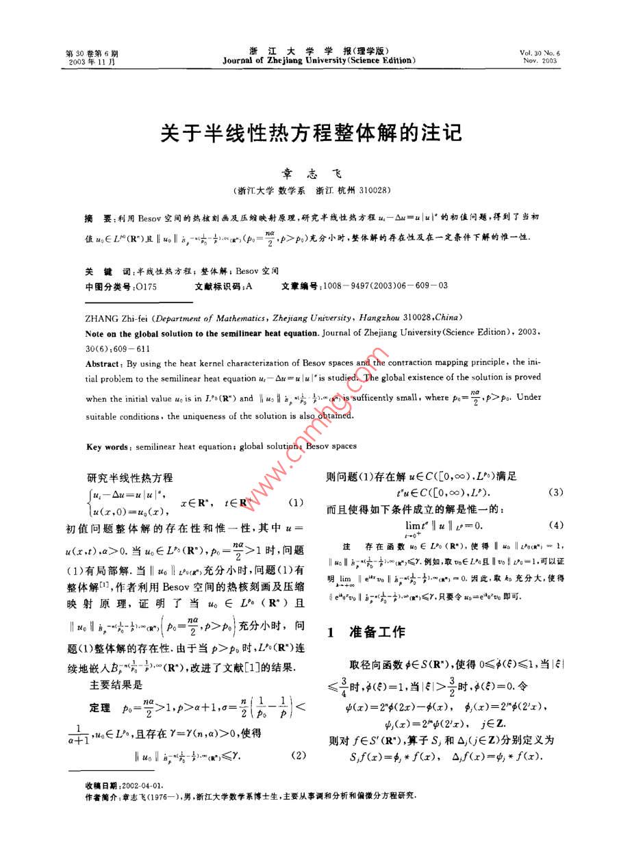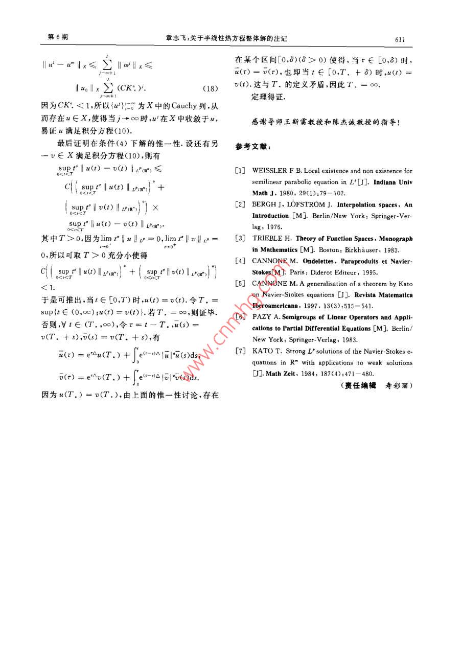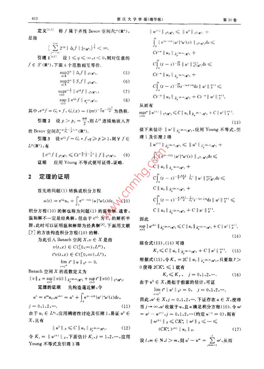 第30卷第6期大學(xué)學(xué)報(bào)(理學(xué)版)Vol 30 No 6Journal of Zhejiang University( Science Editi關(guān)于半線性熱方程整體解的注記章志飛浙江大學(xué)數(shù)學(xué)系浙江杭州310028)摘要:利用 Besov空間的熱核刻畫及壓編映射原理,研究半線性熱方程u-△n=u|w|°的初值問(wèn)題,得到了當(dāng)初值m∈(R)且u,…實(shí)m(p=2,p>p)充分小時(shí),整體解的存在性及在一定條件下解的惟一性詞:半戴性熱方程;整體解; Besov空間中圖分類號(hào):O175文獻(xiàn)標(biāo)識(shí)碼:A文章編號(hào):1008-9497(2003)06-609-03ZHANG Zhi-fei(Department of Mathematics, Zhejiang University, Hangzhou 310028, China)Note on the global solution to the semilinear heat equation. Journal of Zhejiang University(Science Edition), 200330(6):609-611Abstract: By using the heat kernel characterization of Besov spaces and the contraction mapping principle, the ini-tial problem to the semilinear heat equation u, Au=ulul is studied. The global existence of the solution is proved.o(R")and Iusb.F.). r", is sufficently smasuitable conditions, the uniqueness of the solution is also obtained.Key words: semilinear heat equation; global solution: Besov spaces研究半線性熱方程則問(wèn)題(1)存在解u∈C(0,∞),L)滿足(3)x∈R,∈R()而且使得如下條件成立的解是惟一的初值問(wèn)題整體解的存在性和惟一性,其中l(wèi)(4)n(x),a>0.當(dāng)a∈L(R"),P=2>1時(shí),問(wèn)題注存在函數(shù)∈D(R"),使得‖“‖z(g;=1(1)有局部解.當(dāng)‖xo‖t(充分小時(shí),問(wèn)題(1)有b,“h一("≤7例如取vn∈Lh且目vb=1,可以證整體解口,作者利用 Besov空間的熱核刻畫及壓縮明m‖mb,”0因此,取k充分大,使得映射原理,證明了當(dāng)∈L(R”)且4e"volb;“,"m≤,只要令=e"o即可xoi,一“-如“P2=,p>。充分小時(shí),問(wèn)1準(zhǔn)備工作題(1)整體解的存在性由于當(dāng)p>P時(shí),L(R")連續(xù)地嵌入B"n(R"),改進(jìn)了文獻(xiàn)[1]的結(jié)果取徑向函數(shù)中∈S(R),使得0≤中()≤1,當(dāng)主要結(jié)果是≤子時(shí),()=1,當(dāng)1>2時(shí),4()=0.令定理=>1,P>a+1,≈n1_12(。-p0,使得則對(duì)f∈S"(R"),算子S和△(j∈Z)分別定義為(2)Sf(x)=*f(x),△f(x)=中*f(x)收稿日期:2002-04-01作者簡(jiǎn)介:章志飛(1976-),男,斷江大學(xué)數(shù)學(xué)系博士生,主要從事調(diào)和分析和偏微分方程研究610浙江大學(xué)學(xué)報(bào)(理學(xué)版)第30卷定義2,稱∫屬于齊性 Besov空間B;(R")4tg≤‖a"l:g是指le siau'|"a(s)|xds≤k”)引理14設(shè)1≤q≤∞,<0,則對(duì)任意的f∈S'(R"),下面4個(gè)范數(shù)相互等價(jià)(-s)-ad≤sup2‖△,f‖xg"(5)Ct&teMg")+t‖ef‖c(-)從而有其中,e“f=G,*f,Gi(x)=(4x)-et為熱核.upr‖‖(g’≤CⅡ4,2、,+C‖'‖x+1引理2設(shè)p>=2,則L連續(xù)地嵌入齊性Bso空間B"h“(R")接下來(lái)估計(jì)|d'‖g-3w.=(g,應(yīng)用 Young不等式,引引理3設(shè)e∫=G,f,g≥p≥1則f∈理1及引理2得L(R"),有l(wèi)u1lg-2.(≤‖4°~g”,+ef‖x≤C--,le-oaju'|"x(5)|gds≤證明應(yīng)用 Young不等式便可證得,證略2定理的證明C(-)x首先將問(wèn)題(1)轉(zhuǎn)換成積分方程u(t)=eun+|e"n4luI'u(s)ds. (10)c}(-s)-“pud‖x≤積分方程(10)的解也稱為問(wèn)題(1)的溫和解.通常,C‖al-(g+C‖a‖x"溫和解不一定是經(jīng)典解,但由于e為C的解析半因此群,此時(shí)可以證明溫和解即為經(jīng)典解下面用文獻(xiàn)s|a+1lmm(g≤C‖目2“圖+C‖2x1[7]的方法構(gòu)造積分方程(10)的解(14)為此引人 Banach空間X,v∈X是指綜合式(13)、(14)可得v(1,x)∈C([0,∞),L°),K;≤C‖4‖x~+C‖a'‖x+2,(15)r"v(t,x)∈C([0,∞),L)limt"‖a‖=0.根據(jù)式(15),令K,=2C‖‖,只要取y>0使得2CK.≤1就有Banach空間X的范數(shù)定義為K,≤K0,1,2(16)I v Ix=sup v(t) B-bcg")+supr"llv(t)va"由于u°∈X,類似于前面的估計(jì),可證定理的證明先構(gòu)造逼近解,令imr"‖u2h=0,j=0,1,2,n=e“a,wy+1=x2+|e-lv(s)d,因此,∈x,=0,1,2,…下證存在u∈X,使得j=0,1,2,(11)當(dāng)j→∞,l收斂于a,且滿足積分方程(10).令a由于u∈L,應(yīng)用稠密性討論及引理1,易證u∈--,j=0,1,2,…(約定u-1=0),則有X,且有l(wèi)u‖x≤C‖xolg-2,-ay,(12)(CK,)+1‖u6‖x(17)令K,=‖a+1‖x,下面估計(jì)K1,j=1,2,…,應(yīng)用Young不等式及引理3得設(shè),m∈N,>m,則x2-=∑,從而第6期章志飛;關(guān)于半線性熱方程整體解的注記611在某個(gè)區(qū)間[0,0)(>0)使得,當(dāng)r∈[0,B)時(shí)a(r)=v(r),也即當(dāng)t∈[0,T.+a)時(shí),(t)=aox∑)(CK∵)v(1),這與T.的定義矛盾,因此T定理得證因?yàn)镃K:<1,所以}=。為X中的 Cauchy列,從而存在x∈X,使得當(dāng)j→∞時(shí),在X中收斂于u,感謝導(dǎo)師王斯雷教授和陳杰誠(chéng)教授的指導(dǎo)易證a滿足積分方程(10)最后證明在條件(4)下解的惟一性,設(shè)還有另參考文獻(xiàn)v∈X滿足積分方程(10),則有supt"lw()-v(t)‖g≤[1] WEISSLER F B Local existence and non existence forCli sup !lu(r) pIr>+semilinear parabolic equation in I.[]. Indiana UnivMath J,1980,29(1):79-1sup!"lv(t)lx)】[2] BERGH J, LOFSTROM J. Interpolation spaces,AnIntroduction [M]. Berlin/New York: Springer-vesup u()-v(t)v(Ryg,1976其中T>0,因?yàn)閘imr‖al=0,limt"‖v‖=[3] TRIEBLE H. Theory of Function Spaces, Monographin Mathematics [M]. Boston: Birkhauser, 19830,所以可取T>0充分小使得[4J CANNONE M. Ondelettes, Paraproduits et Navier-ci( sp pl uoI")+( sup r ll t) I zag 5).)Stokes[M]. Paris: Diderot Editeur, 1995.[5] CANNONE M. A generalisation of a theorem by Kato于是可推出,當(dāng)t∈[0,T)時(shí),a(t)=v(t)令T,=on Navier-Stokes equations [J]. Revista Matematicasup{t∈(0,∞);u(t)=v(t)}.若T.=∞,則證畢Iberoamericana, 1997, 13(3):515-541[6] PAZY A. Semi