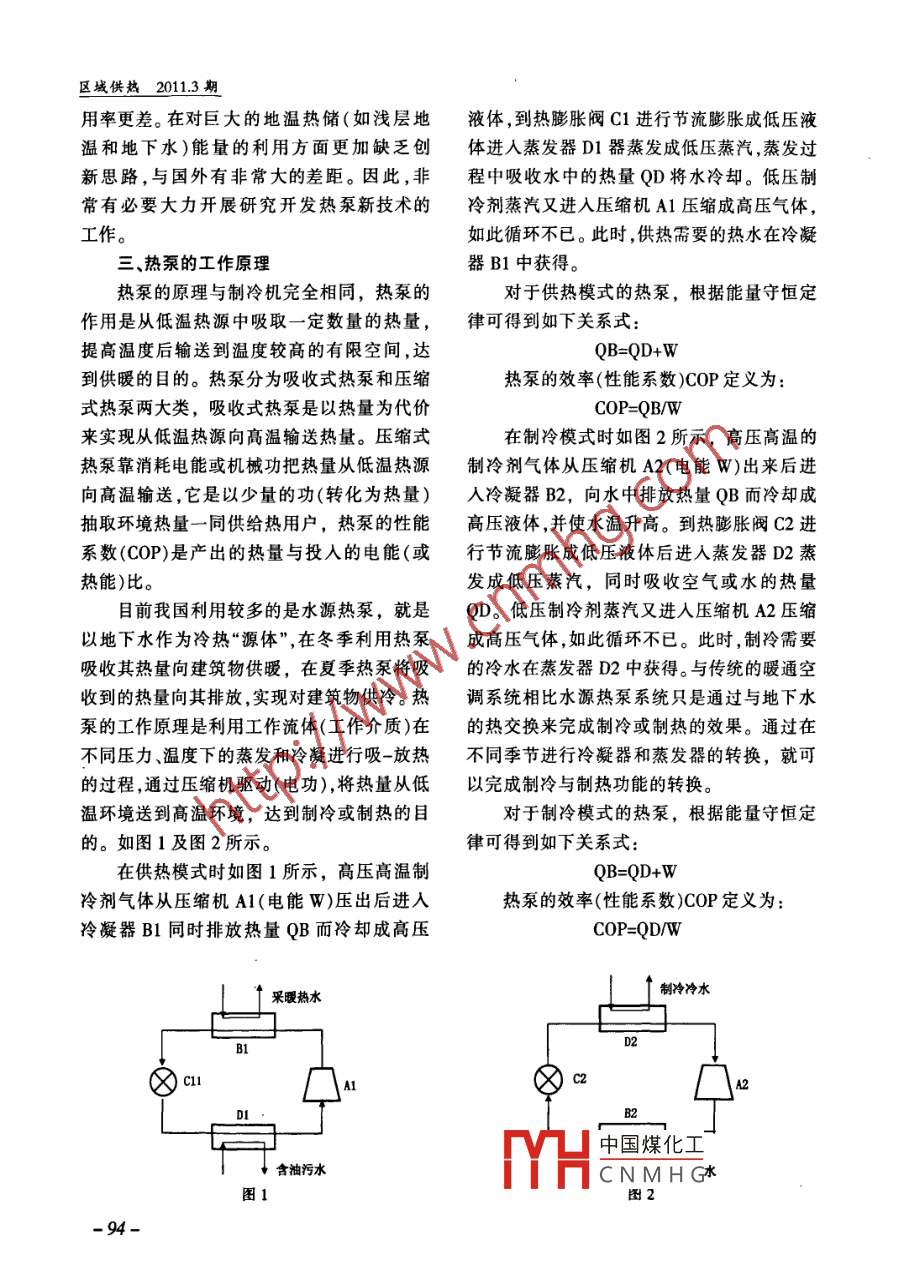 區(qū)城供熱2011.3期水源熱泵技術(shù).山東勝利油田熱電聯(lián)供中心張文[摘要]我國有豐富的地?zé)豳Y源。目前,地?zé)嶂饕侵苯永?如冬天供暖、供熱水、農(nóng)業(yè)利用、溫泉沐浴等。近年來,國際上適用于低溫地?zé)崂玫乃礋岜眉夹g(shù)發(fā)展非常迅速,對地?zé)崮艿母咝ЬC合利用有極為重要的意義。[關(guān)鍵詞]水源熱泵吸收式熱泵壓縮 式熱泵.一、前言建筑中地源熱泵系統(tǒng)已占空調(diào)總保有量的當(dāng)今世界,常規(guī)能源日見短缺,而在總能19% ,其中在新建筑中占30%。美國熱泵工業(yè)耗中,民用采曖、空調(diào)耗能比例逐年增長。目已經(jīng)成立了由美國能源部、環(huán)保署、愛迪遜前,采暖、空調(diào)存在能耗大,效率低、惡化城市電力研究所及眾多熱泵廠家組成的美國熱大氣環(huán)境質(zhì)量等問題,在這種背景下,以環(huán)保泵協(xié)會,該協(xié)會在近年中將投入一億美元從和節(jié)能為主要特征的綠色采暖、空調(diào)系統(tǒng)應(yīng)事開發(fā)、研究和推廣工作。美國計劃近期達(dá)到運而生,而熱泵系統(tǒng)正是滿足這些要求的新每年安裝40萬臺熱泵的目標(biāo),屆時將降低溫興技術(shù)。室氣體排放1百萬噸,相當(dāng)于減少50萬輛汽.大地作為一種巨大而穩(wěn)定的熱儲資源,車的污染物排放或植樹1百萬英畝,年節(jié)約其淺層地溫和地下水在能源利用方面也有廣能源費用達(dá)4.2億美元,此后,每年節(jié)約能源泛應(yīng)用前景,我國有豐富的地?zé)豳Y源。目前,地費用再增加1.7億美元。與美國的熱泵發(fā)展熱主要是直接利用,如冬天供暖、供熱水、農(nóng)有所不同,中、北歐如瑞典、瑞士、奧地利、德業(yè)利用、溫泉沐浴等。近年來,國際上適用于國等國家主要利用淺層地?zé)豳Y源,地下土壤低溫地?zé)崂玫乃礋岜眉夹g(shù)發(fā)展非常迅埋盤管(埋深<400米)的地源熱泵,用于室內(nèi)速,對地?zé)崮艿母咝ЬC合利用有極為重要的地板輻射供暖及提供生活熱水。據(jù)1999年意義。水源熱泵技術(shù)是一種較理想的采暖、空的統(tǒng)計,家用的供熱裝置中,地源熱泵所占調(diào)方式,具有耗能少,不污染環(huán)境等優(yōu)點,符比例,瑞士為96%,奧地利為38%,丹麥為合可持續(xù)發(fā)展的要求。27%。二、熱泵技術(shù)現(xiàn)狀我國占地?zé)豳Y源總量98%以上的是低溫歐美等發(fā)達(dá)國家較早意識到要調(diào)整社會資源。目前對我國眾多的低溫地?zé)豳Y源還主能源結(jié)構(gòu)和環(huán)境保護問題,因此熱泵在這些要中國煤化工利用總量已達(dá)國家應(yīng)用較多。許多國家采取一系列措施來到24YHCNMHG,但利用水平刺激熱泵的發(fā)展。據(jù)統(tǒng)計, 1998年美國商業(yè)和效率比較低,40C以下溫度段的能量利-93 -區(qū)域供熱2011.3 期用率更差。在對巨大的地溫?zé)醿?如淺層地液體,到熱膨脹閥C1進行節(jié)流膨脹成低壓液溫和地下水)能量的利用方面更加缺乏創(chuàng)體進入蒸發(fā)器D1器蒸發(fā)成低壓蒸汽,蒸發(fā)過新思路,與國外有非常大的差距。因此,非程中吸收水中的熱量QD將水冷卻。低壓制常有必要大力開展研究開發(fā)熱泵新技術(shù)的冷劑蒸汽又進入壓縮機A1壓縮成高壓氣體,工作。如此循環(huán)不已。此時,供熱需要的熱水在冷凝三熱泵的工作原理器B1中獲得。熱泵的原理與制冷機完全相同,熱泵的對于供熱模式的熱泵,根據(jù)能量守恒定作用是從低溫?zé)嵩粗形?定數(shù)量的熱量,律可得到如下關(guān)系式:提高溫度后輸送到溫度較高的有限空間,達(dá)QB=QD+W到供暖的目的。熱泵分為吸收式熱泵和壓縮熱泵的效率(性能系數(shù))COP定義為:式熱泵兩大類,吸收式熱泵是以熱量為代價COP=QB/W來實現(xiàn)從低溫?zé)嵩聪蚋邷剌斔蜔崃俊嚎s式在制冷模式時如圖2所示,高壓高溫的熱泵靠消耗電能或機械功把熱量從低溫?zé)嵩粗评鋭怏w從壓縮機A2(電能W)出來后進向高溫輸送,它是以少量的功(轉(zhuǎn)化為熱量)人冷凝器B2,向水中排放熱量QB而冷卻成抽取環(huán)境熱量一同供給熱用戶,熱泵的性能高壓液體,并使水溫升高。到熱膨脹閥C2進系數(shù)(COP)是產(chǎn)出的熱量與投人的電能(或行節(jié)流膨脹成低壓液體后進入蒸發(fā)器D2蒸熱能)比。發(fā)成低壓蒸汽,同時吸收空氣或水的熱量目前我國利用較多的是水源熱泵,就是QD。低壓制冷劑蒸汽又進人壓縮機A2壓縮以地下水作為冷熱“源體”,在冬季利用熱泵成高壓氣體,如此循環(huán)不已。此時,制冷需要.吸收其熱量向建筑物供暖,在夏季熱泵將吸的冷水在蒸發(fā)器D2中獲得。與傳統(tǒng)的暖通空收到的熱量向其排放,實現(xiàn)對建筑物供冷。熱調(diào)系統(tǒng)相比水源熱泵系統(tǒng)只是通過與地下水泵的工作原理是利用工作流體(工作介質(zhì))在的熱交換來完成制冷或制熱的效果。通過在不同壓力溫度下的蒸發(fā)和冷凝進行吸-放熱不同季節(jié)進行冷凝器和蒸發(fā)器的轉(zhuǎn)換,就可的過程,通過壓縮機驅(qū)動(電功),將熱量從低以完成制冷與制熱功能的轉(zhuǎn)換。溫環(huán)境送到高溫環(huán)境,達(dá)到制冷或制熱的目對于制冷模式的熱泵,根據(jù)能量守恒定的。如圖1及圖2所示。在供熱模式時如圖1所示,高壓高溫制冷劑氣體從壓縮機A1(電能W)壓出后進入冷凝器B1同時排放熱量QB而冷卻成高壓COP=QD/W制冷冷水.采暖熱水D231兇) C11