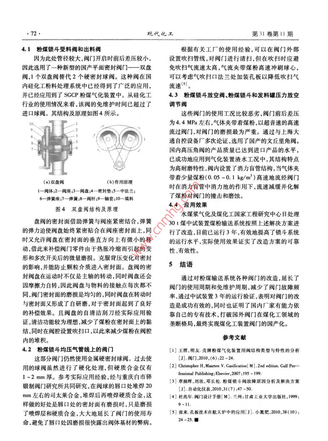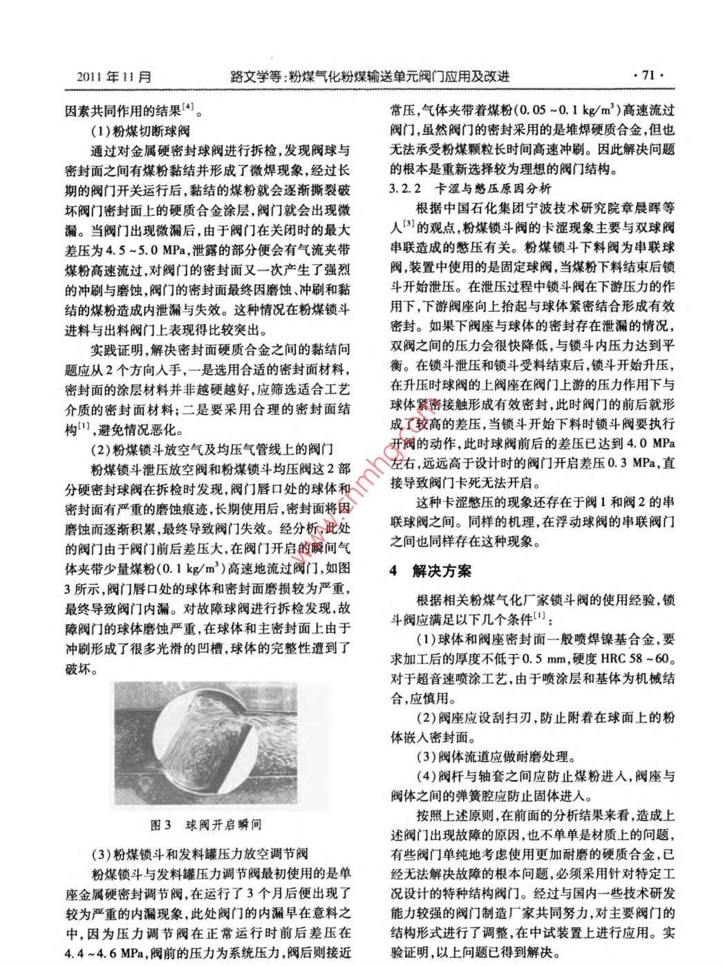 Noy, 201 1現(xiàn)代化工第3l卷第ll期68·Modem Chemical Industry2011年l月粉煤氣化粉煤輸送單元閥門應(yīng)用及改進(jìn)路文學(xué)1,龔欣,劉珂2(1.華東理工大學(xué)資源與環(huán)境學(xué)院,上海2002372.水煤漿氣化及煤化工國家工程研究中心,山東滕州27527)摘要:針對(duì)粉煤氣化粉煤輸送單元閥門經(jīng)常出現(xiàn)內(nèi)漏和卡澀的現(xiàn)象,分析了閥門發(fā)生故障的原因和機(jī)理提出一些特種閥門的結(jié)構(gòu)形式并加以應(yīng)用。中試裝置3年的運(yùn)行情況表明,通過對(duì)球閥的改造和采用新型結(jié)構(gòu)閥門,有效地降低了故障發(fā)生的頻率,保證了粉煤氣化粉煤輸送單元的長周期運(yùn)行。關(guān)鍵詞:硬密封球閥;文丘里角閥;盤閥;內(nèi)漏中圖分類號(hào):TF214文獻(xiàn)標(biāo)識(shí)碼:A文章編號(hào):0253-4320(2011)11-0068-05Application and modification of pulverized coal transportation elementin pulverized coal gasification unitLU Wen-xue. GoNG Xin. LIU Ke(1. School of Resources and Environmental Engineering, East China University of Science and TechnologyShanghai 200237, China; 2. National Engineering Research Center for Coal Slurry Gasification and Coal Chemicals277527, China)Abstract: According to frequent phenomena of intermal leakage and jamming in valves of conveying unit ofpulverized coal gasification system, some special structure forms of valves are proposed and applied through analyzingcauses and mechanism of valves faults. Experimental results show that the faults are effectively reduced by remolding ballvalve and adopting new valve structure, which ensures a long period running of conveying unit of pulverized coalgasification systemKey words: hard sealing ball valve; venturi angle valve; poppet valve; intemal leakage兗礦集團(tuán)、華東理工大學(xué)、中國天辰工程公司共關(guān),分析了閥門發(fā)生故障的原因和機(jī)理聯(lián)合有關(guān)廠同承擔(dān)國家高技術(shù)研究發(fā)展計(jì)劃(“863”計(jì)劃)項(xiàng)目家試制出一些特殊結(jié)構(gòu)的閥門,在水煤漿氣化及煤(208AA050301)“高灰熔點(diǎn)煤加壓氣流床氣化”,化工國家工程研究中心中試裝置上進(jìn)行應(yīng)用。實(shí)驗(yàn)以兗礦開陽化工有限公司年產(chǎn)50萬t合成氨項(xiàng)目表明,通過對(duì)球閥的改造和采用新型結(jié)構(gòu)的閥門,有為依托,在貴州開陽建設(shè)日處理煤1000t級(jí)粉煤加效地降低了故障發(fā)生的頻率保證了粉煤氣化煤粉壓氣化示范裝置,實(shí)施高灰熔點(diǎn)煤的氣流床粉煤加輸送單元的長周期運(yùn)行壓氣化技術(shù)工業(yè)化示范。“高灰熔點(diǎn)煤加壓氣流床氣化”項(xiàng)目包括實(shí)驗(yàn)室研究、中試研究和工業(yè)化示1粉煤氣化煤粉輸送單元簡介范3部分內(nèi)容。其中,中試研究建設(shè)了1套日處理煤粉輸送是將煤粉由常壓煤粉儲(chǔ)倉經(jīng)粉煤鎖斗30t煤水冷壁粉煤加壓氣化裝置,進(jìn)行氣化爐開發(fā)輸送至粉煤發(fā)料罐的過程,一般采用煤粉鎖斗變壓實(shí)驗(yàn),完成了北宿煤、鮑店煤、南屯煤和貴州田壩煤(0~46MPa)操作形式,將粉煤分批次地從常壓粉4個(gè)煤種和1個(gè)混配煤種的試燒任務(wù),完成了工業(yè)煤倉送至恒壓(4.6MPa)粉煤發(fā)料罐中。規(guī)模大管徑煤粉輸送實(shí)驗(yàn)工作。工業(yè)示范裝置包括1.1中試裝置煤粉輸送粉煤制備、粉煤供料與輸送、氣化框架和渣水處理4在中試裝置(圖1)中,煤粉鎖斗采用單系列,即個(gè)工段。1個(gè)煤粉儲(chǔ)料罐、1個(gè)煤粉鎖斗、1個(gè)煤粉發(fā)料罐,設(shè)針對(duì)粉煤氣化粉煤輸送單元經(jīng)常出現(xiàn)故障,兗備間通過閥門進(jìn)行控制,圖1為煤粉輸送單元集散礦集團(tuán)、華東理工大學(xué)、中國天辰工程公司聯(lián)合攻控制系統(tǒng)(DCS)控制畫面。收稿日期:2011-05-25基金項(xiàng)目:國家“863”計(jì)劃項(xiàng)目(2008A050301);兗礦集團(tuán)2008年科技研發(fā)項(xiàng)目(08-27教授博士生導(dǎo)師主要從事氣流床煤氣化過程與技術(shù)研究開發(fā),通訊聯(lián)系人,m1-6231,m如g令(199-,女,作者簡介路文學(xué)(1974-)男博士生高級(jí)工程師從事煤氣化及煤化工開發(fā)工作,0632-2362727,luwenrue@sin_.com;龔2!年l1月路文學(xué)等:粉煤氣化粉煤輸送單元閥門應(yīng)用及改進(jìn)69式圖1中試裝置煤粉程控示意圖1.2工業(yè)示范裝置煤粉輸送工業(yè)示范裝置煤粉輸送系統(tǒng)包含2套鎖斗系煤粉輸送單元示意圖見圖2。統(tǒng),由1套順控邏輯自動(dòng)控制系統(tǒng)控制,2套鎖斗交替運(yùn)行,每個(gè)鎖斗的循環(huán)周期約30min。單個(gè)鎖斗的運(yùn)行過程共分5步,下面以A系列鎖斗運(yùn)行舉例說明第1步:鎖斗受料。按程序打開粉煤鎖斗受料閥1,鎖斗開始受料,待鎖斗料位達(dá)到高料位要求時(shí),關(guān)閉鎖斗受料閥1,粉煤鎖斗受料完畢。第2步:充壓。打開鎖斗充壓閥8對(duì)鎖斗進(jìn)行充壓,待鎖斗壓力達(dá)到要求后,關(guān)閉鎖斗充壓閥8鎖斗充壓結(jié)束。1、2,3,4-煤粉切斷閥;5,6—平衡閥:7一鎖斗壓力調(diào)節(jié)閥第3步:鎖斗等待。將鎖斗壓力調(diào)節(jié)閥7投入8一鎖斗沖壓/放空閥;9—發(fā)料罐放空閥;10—煤鎖斗A;自動(dòng)調(diào)節(jié),保持罐壓等待下料11—煤鎖斗B;12一發(fā)料罐第4步:鎖斗下料。打開粉煤鎖斗下料閥3、平圖2煤粉輸送單元示意圖衡閥5開始下料,待鎖斗料位開關(guān)低報(bào)警時(shí),關(guān)