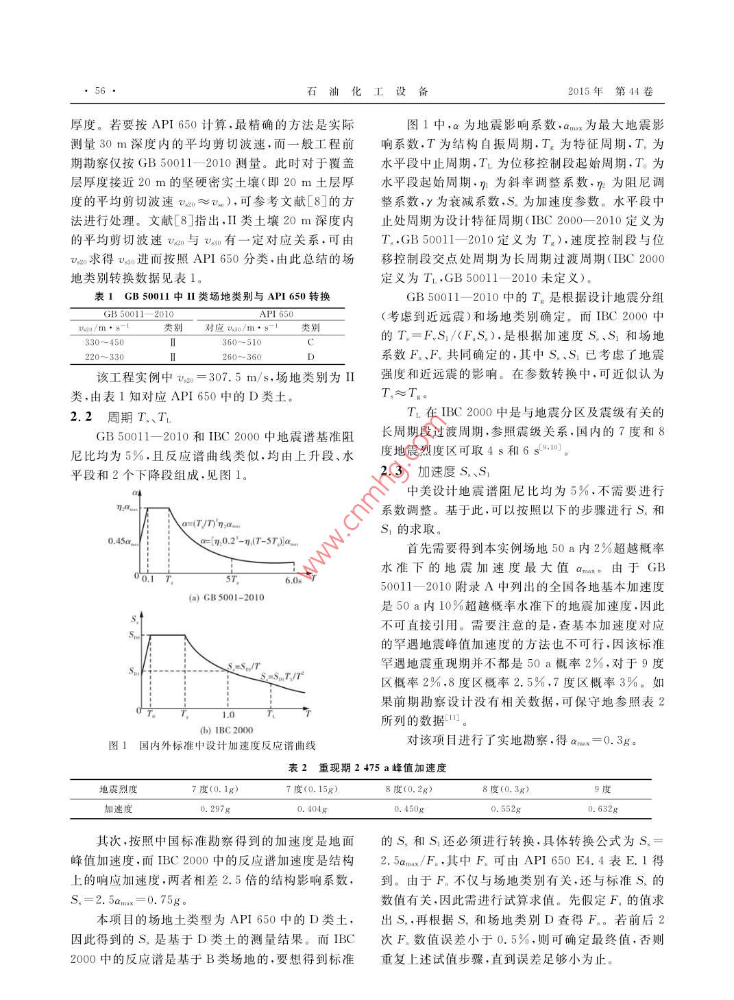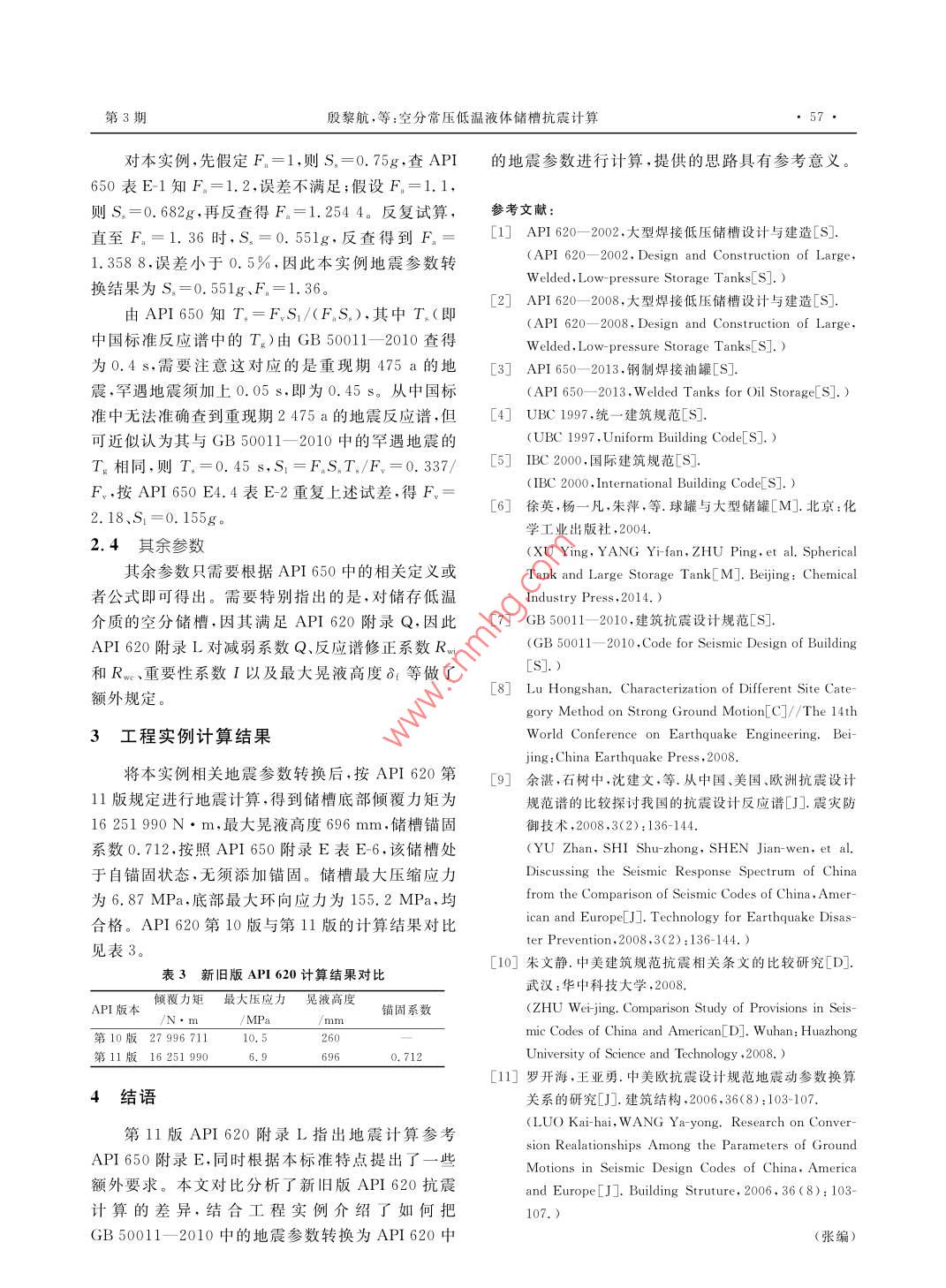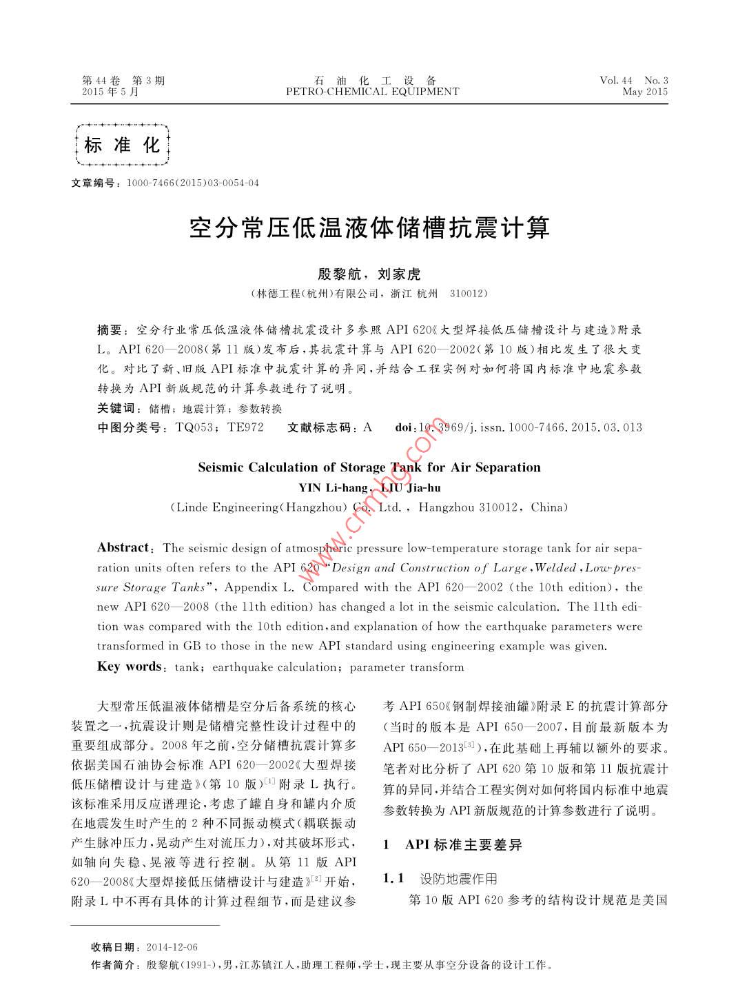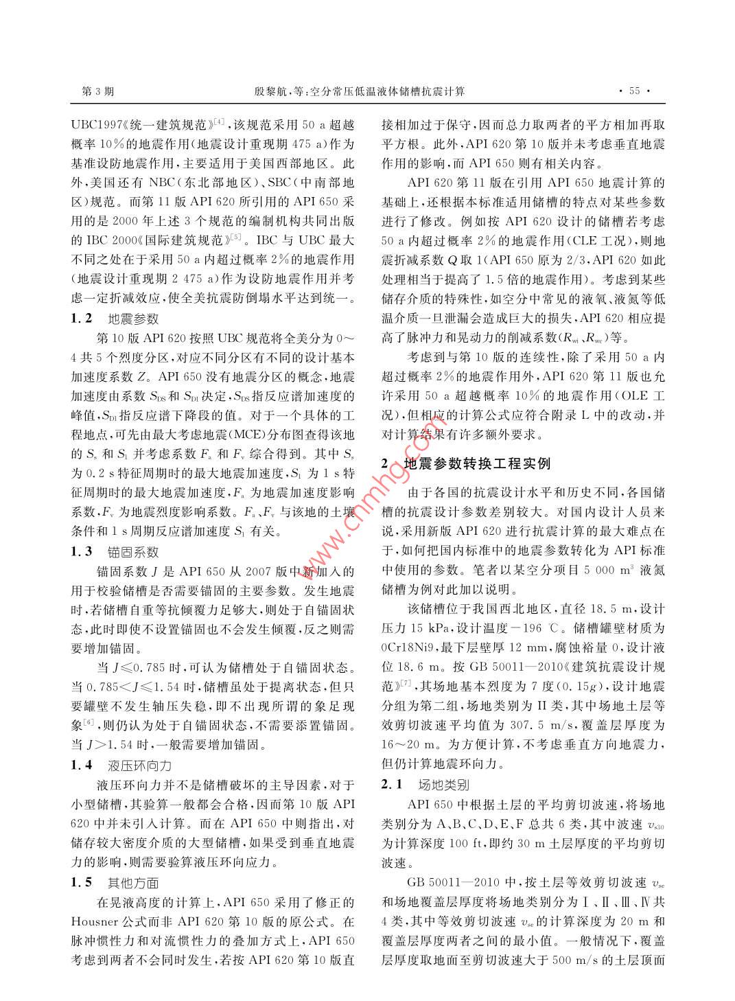44卷第3期Vol 44 No. 32015年5月PETRO-CHEMICAL EQUIPMENT標準化文章編號:1000-746(2015)03-0054-04空分常壓低溫液體儲槽抗震計算殷黎航,劉家虎(林德工程(杭州)有限公司,浙江杭州310012)摘要:空分行業(yè)常壓低溫液體儲槽抗震設(shè)計多參照ΔPI62θ《大型焊接低壓儲槽設(shè)計與建造》附錄L。APⅠ620—2008(第11版)發(fā)布后,其抗震計算與API620—2002(第10版)相比發(fā)生了很大變化。對比了新、舊版API標準中抗震計算的異同,并結(jié)合工程實例對如何將國內(nèi)標準中地震參數(shù)轉(zhuǎn)換為API新版規(guī)范的計算參數(shù)進行了說明關(guān)鍵詞:儲槽;地震計算;參數(shù)轉(zhuǎn)換中圖分類號:TQ053;TE972文獻標志碼:Adoi:10.3969/j.issn.1000-7466.2015.03.013Seismic Calculation of Storage Tank for Air SeparationYIN Li-hang. LIU Jia-huLinde engineering( Hangzhou) Co. Ltd, Hangzhou 310012, China)Abstract: The seismic design of atmospheric pressure low-temperature storage tank for air sepa-ration units often refers to the API 620"Design and Construction of large, Welded, Lou-pressure Storage Tanks", Appendix L. Compared with the API 620-2002( the 10th edition), thenew API 620--2008(the 1lth edition) has changed a lot in the seismic calculation. The llth edition was compared with the 10th edition and explanation of how the earthquake parameters weretransformed in GB to those in the new APi standard using engineering example was givenKey words: tank; earthquake calculation; parameter transform大型常壓低溫液體儲槽是空分后備系統(tǒng)的核心考ΔPⅠδ5α《鋼制焊接油罐》附錄E的抗震計算部分裝置之一,抗震設(shè)計則是儲槽完整性設(shè)計過程中的(當時的版本是API6502007,目前最新版本為重要組成部分。2008年之前,空分儲槽抗震計算多API650-2013-3),在此基礎(chǔ)上再輔以額外的要求依據(jù)美國石油協(xié)會標準AP6202002《大型焊接筆者對比分析了AP1620第10版和第11版抗震計低壓儲槽設(shè)計與建造》(第10版)附錄L執(zhí)行算的異同,并結(jié)合工程實例對如何將國內(nèi)標準中地震該標準采用反應(yīng)譜理論,考慮了罐自身和罐內(nèi)介質(zhì)參數(shù)轉(zhuǎn)換為API新版規(guī)范的計算參數(shù)進行了說明。在地震發(fā)生時產(chǎn)生的2種不同振動模式(耦聯(lián)振動產(chǎn)生脈沖壓力,晃動產(chǎn)生對流壓力),對其破壞形式,1API標準主要差異如軸向失穩(wěn)、晃液等進行控制。從第11版API620-208&《大型焊接低壓儲槽設(shè)計與建造》開始,1·1設(shè)防地震作用附錄L中不再有具體的計算過程細節(jié),而是建議參第10版AP1620參考的結(jié)構(gòu)設(shè)計規(guī)范是美國收稿日期:2014-12-06作者簡介:殷黎航(1991-),男,江蘇鎮(zhèn)江人,助理工程師,學(xué)士,現(xiàn)主要從事空分設(shè)備的設(shè)計工作3期股黎航,等:空分常壓低溫液體儲槽抗震計算55·UBC1997《統(tǒng)一建筑規(guī)范》,該規(guī)范采用50a超越接相加過于保守,因而總力取兩者的平方相加再取概率10%的地震作用(地震設(shè)計重現(xiàn)期475a)作為平方根。此外,AP1620第10版并未考慮垂直地震基準設(shè)防地震作用,主要適用于美國西部地區(qū)。此作用的影響,而API650則有相關(guān)內(nèi)容。外,美國還有NBC(東北部地區(qū))、SBC(中南部地API620第11版在引用API650地震計算的區(qū))規(guī)范。而第11版API620所引用的AP1650采基礎(chǔ)上,還根據(jù)本標準適用儲槽的特點對某些參數(shù)用的是2000年上述3個規(guī)范的編制機構(gòu)共同岀版進行了修改。例如按API620設(shè)計的儲槽若考慮的IBC20《國際建筑規(guī)范》。IBC與UBC最大50a內(nèi)超過概率2%的地震作用(CILE工況),則地不同之處在于采用50a內(nèi)超過概率2%的地震作用震折減系數(shù)Q取1(AP1650原為2/3,AP1620如此(地震設(shè)計重現(xiàn)期2475a)作為設(shè)防地震作用并考處理相當于提高了1.5倍的地震作用)??紤]到某些慮一定折減效應(yīng),使全美抗震防倒塌水平達到統(tǒng)一。儲存介質(zhì)的特殊性,如空分中常見的液氧、液氮等低1.2地震參數(shù)溫介質(zhì)一旦泄漏會造成巨大的損失,AP1620相應(yīng)提第10版API620按照UBC規(guī)范將全美分為0~高了脈沖力和晃動力的削減系數(shù)(R、Rm)等4共5個烈度分區(qū),對應(yīng)不同分區(qū)有不同的設(shè)計基本考慮到與第10版的連續(xù)性,除了采用50a內(nèi)加速度系數(shù)Z。API650沒有地震分區(qū)的概念,地震超過概率2%的地震作用外,API620第11版也允加速度由系數(shù)S和Sm決定,S指反應(yīng)譜加速度的許采用50a超越概率10%的地震作用(OLE工峰值,S指反應(yīng)譜下降段的值。對于一個具體的工況),但相應(yīng)的計算公式應(yīng)符合附錄L中的改動.并程地點,可先由最大考慮地震(MCE)分布圖查得該地對計算結(jié)果有許多額外要求的S和S1并考慮系數(shù)F和F、綜合得到。其中S為0.2s特征周期時的最大地震加速度,S為1s特2地震參數(shù)轉(zhuǎn)換工程實例征周期時的最大地震加速度,F。為地震加速度影響由于各國的抗震設(shè)計水平和歷史不同,各國儲系數(shù),F、為地震烈度影響系數(shù)。F、F與該地的土壤槽的抗震設(shè)計參數(shù)差別較大。對國內(nèi)設(shè)計人員來條件和1s周期反應(yīng)譜加速度S1有關(guān)說,采用新版AP1620進行抗震計算的最大難點在1.3錨固系數(shù)于,如何把國內(nèi)標準中的地震參數(shù)轉(zhuǎn)化為API標準錨固系數(shù)J是AP1650從2007版中新加入的中使用的參
