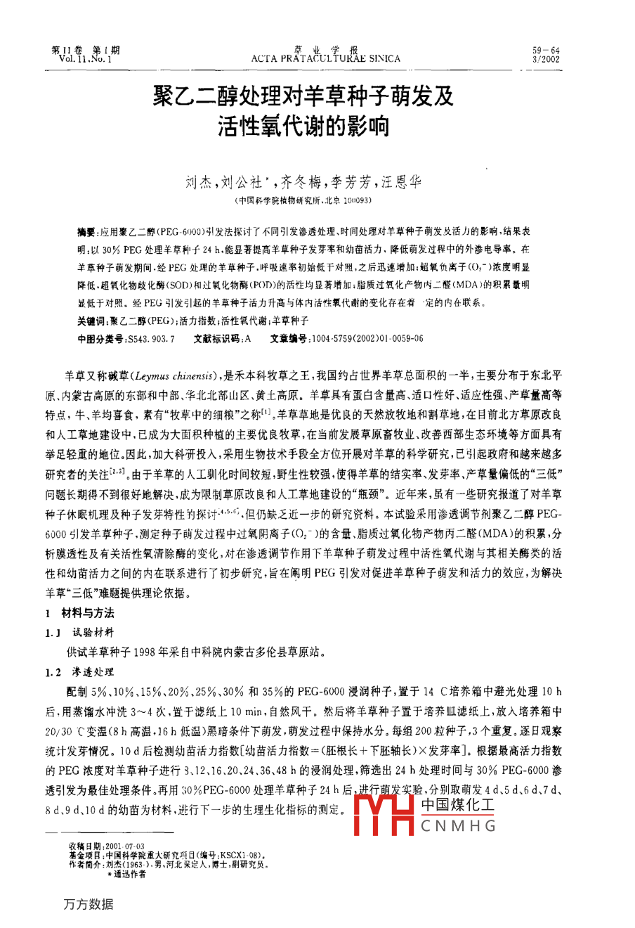 第!1卷第1期Val11.N.1mACTA PRATALLfUKAE SINICA8/2002聚乙二醇處理對(duì)羊草種子萌發(fā)及活性氧代謝的影響劉杰,劉公社" ,齊冬梅,李芳芳,汪恩華(中國(guó)科學(xué)院櫝物研究所.北京11093)摘要:應(yīng)用聚乙二醇(PEG 600)引發(fā)法探討了不同引發(fā)滲透處理時(shí)間處理對(duì)羊草種子萌發(fā)及活力的影響,結(jié)果表明:以30% PEG處理羊草種千24 h.能顯著提高羊草種子發(fā)芽率和幼苗活力降低萌發(fā)過(guò)程中的外滲電導(dǎo)率。在羊草種子萌發(fā)期間,經(jīng)PEG處理的羊草種子.呼吸速率初始低千對(duì)照,之后迅速增加;超氧負(fù)離子(O2- )濃度明顯降低.超氧化物歧化酶(SOD)相過(guò)氧化物酶(PO0D)的活性均顯著增加:脂質(zhì)過(guò)氧化產(chǎn)物內(nèi)二醛(MDA)的積累最明顯低于對(duì)照。經(jīng)PEG引發(fā)引起的羊草種子活力升高與體內(nèi)活性氧代謝的變化存在著定的內(nèi)在聯(lián)系。關(guān)鍵詞:聚乙二醇(PEG);活力指數(shù);活性氧代謝;羊草種子中圍分類號(hào):S543.903.7文獻(xiàn)標(biāo)識(shí)碼:A .文章編號(hào):1004- 5759<2002)01 0059-06羊草又稱堿草(Leymus chinensis) ,是禾本科牧草之王,我國(guó)約占世界羊草總面積的一半,主要分布 于東北平原、內(nèi)蒙古高原的東部和中部、華北北部山區(qū)、黃t高原。羊草具有蛋白含量高、適口性好、適應(yīng)性強(qiáng)、產(chǎn)草量高等特點(diǎn),牛、羊均喜食,素有“牧草中的細(xì)糧”之稱1。羊草草地是優(yōu)良的天然放牧地和割草地,在目前北方草原改良和人工草地建設(shè)中.已成為大面積種植的主要優(yōu)良牧草,在當(dāng)前發(fā)展草原畜牧業(yè)、改善西部生態(tài)環(huán)境等方面具有舉足輕重的地位。因此,加大科研投入,采用生物技術(shù)手段全方位開(kāi)展對(duì)羊草的科學(xué)研究,已引起政府和越來(lái)越多研究者的關(guān)注(2.2]。由于羊草的人工馴化時(shí)間較短,野生性較強(qiáng),使得羊草的結(jié)實(shí)率、發(fā)芽率、產(chǎn)草量偏低的“三低”問(wèn)題長(zhǎng)期得不到很好地解決,成為限制草原改良和人工草地建設(shè)的“瓶頸”。近年來(lái),雖有一些研究報(bào)道了對(duì)羊草種子休眠機(jī)理及種子發(fā)芽特性釣探討15.6.但仍缺E近-步的研究資料。本試驗(yàn)采用滲透調(diào)節(jié)劑聚乙二醇PEG-6000引發(fā)羊草種子,測(cè)定種子萌發(fā)過(guò)程中過(guò)氧陰離子(O2-)的含量、脂質(zhì)過(guò)氧化物產(chǎn)物丙二醛(MDA)的積累,分析膜透性及有關(guān)活性氧清除酶的變化,對(duì)在滲透調(diào)節(jié)作用下羊草種子萌發(fā)過(guò)程中括性氧代謝與其相關(guān)酶類的活性和幼苗活力之間的內(nèi)在聯(lián)系進(jìn)行了初步研究,旨在闡明PEG引發(fā)對(duì)促進(jìn)羊草種子萌發(fā)和活力的效應(yīng),為解決羊草“三低”難題提供理論依據(jù)。1材料與方法1.]試驗(yàn)材料供試羊草種子1998 年采自中科院內(nèi)蒙古多倫縣草原站。1.2滲 透處理配制5%、10%、15%、20%、25%、30%和35%的PEG-6000浸潤(rùn)種子,置于14 C培養(yǎng)箱中避光處理10 h后,用蒸餾水沖洗3~4次,置于濾紙上10 min,自然風(fēng)千。然后將羊草種子置于培養(yǎng)皿濾紙上,放入培養(yǎng)箱中20/30 C變溫(8 h高溫,16h低溫>黑暗條件下萌發(fā),萌發(fā)過(guò)程中保持水分。每組200粒種子,3個(gè)重復(fù)。逐日觀察統(tǒng)計(jì)發(fā)芽情況。10d后檢測(cè)幼苗活力指數(shù)[幼苗活力指數(shù)=(胚根長(zhǎng)+下胚軸長(zhǎng))X發(fā)芽率]。根據(jù)最高活力指數(shù)的PEG濃度對(duì)羊草種子進(jìn)行3.12.16.20.24.36、48 h的浸潤(rùn)處理,篩選出24 h處理時(shí)間與30% PEG-6000滲透引發(fā)為最佳處理?xiàng)l件。再用30%PEG-6000處理羊草種子24 h后,進(jìn)行萌發(fā)實(shí)驗(yàn),分別取萌發(fā)4d.5d、6d.7d、中國(guó)煤化工8d.9d、10d的幼苗為材料,進(jìn)行下一步的生理生化指標(biāo)的測(cè)定。MHCNMHG收稿日期:200 07-03作者簡(jiǎn)介:劉杰(1963-).男、河北來(lái)定人,博士,副研究員。*通迅作者50ACTA PRATACULTURAE SINICA(Vol. 11,No. 1)3/20021.3測(cè)定方法經(jīng)PEG預(yù)處理的各組羊草種子,用蒸餾水洗干凈后,取重量-致的萌發(fā)種子(1. 34 g.500粒),在25 ml重蒸水中萌發(fā),分別在4.5.6.7.8.9、10 d時(shí)測(cè)定種子外滲電導(dǎo)串,3次重復(fù)。外滲電導(dǎo)率的測(cè)定參照陳光儀的方法[”;呼吸速率的測(cè)定參照堿吸收法,25C時(shí)測(cè)定萌發(fā)種子呼吸釋放的CO,含量f°8];超氧陰離子的測(cè)定參照王愛(ài)國(guó)等.的羥胺法[";過(guò)氧化物酶(POD)活性的測(cè)定按波欽諾克的方法[0];過(guò)氧化物歧化酶(SOD)活性的測(cè)定,采用氮藍(lán)四唑(NBT)光化還原抑制法"”;丙二醛(MDA)含量的測(cè)定,按Heath 等的硫代巴比妥酸(TAB)比色法”。2結(jié)果與分析2.1 PEG 處理對(duì)羊草種子活力的影響用不同濃度PEG、不同時(shí)間處理的羊草種子萌發(fā)率及幼苗活力指數(shù)均高于對(duì)照,其中以30%PEG處理24h的羊草種子差異最為顯著(表1、2),發(fā)芽率可提高4倍左右,而活力指數(shù)提高了近10倍。表1不同PEG濃度處理對(duì)羊草種子萌發(fā)率及幼苗活力指數(shù)的影響Table 1 Effect of difterent PEG concentration on the vigour index in wildrye seeds項(xiàng)目ltemCK10% 15%20%25%30%35%發(fā)芽率Rate gerninatioa (%)11.20 24. 6029.400 35.800 39.200
