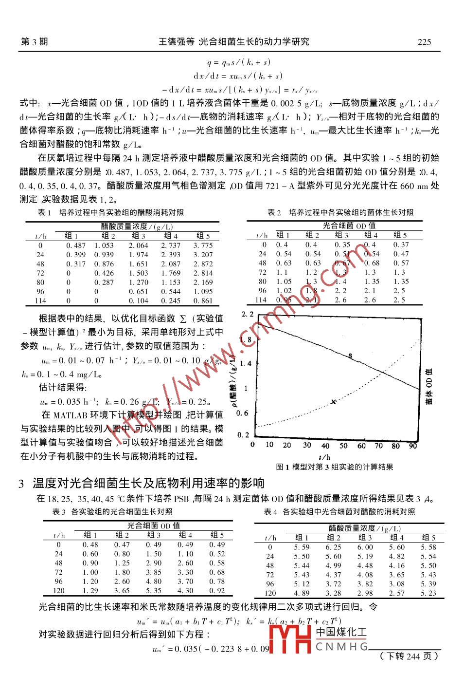 安徽工業(yè)大學(xué)學(xué)報第18卷第3期2001J. of Anhui University of Technology2001年7月文章編號000-2170(2001)03-0224-02光合細(xì)菌生長的動力學(xué)研究王德強(qiáng)1郭養(yǎng)浩21.安徽工業(yè)大學(xué)化學(xué)工程系安徽馬鞍山2430022.福州大學(xué)福建福州350002)摘要報道了光合細(xì)菌在醋酸溶液中的生長動力學(xué)并用πonod模型描述了光合細(xì)菌生長情況模型能夠較好地描述光合細(xì)菌生長狀況。關(guān)鍵詞光合細(xì)菌;動力學(xué) nono模型中圖分類號TQ033文獻(xiàn)標(biāo)識碼:AStudy on kinetics of photosynthetic bacterialWANG De-qiang GUo Yang-hao(1. Chemical Engineering Department Anhui University of Technology, Ma' anshan 243002, China: 2. FuzhouUniversity, Fuzhou 350002, China)Abstract Reported the kinetics of PSB in the solutions of CH3 cooh, and described the growth of pSb with monodmodel. This model can describe the data gathered from laboratory very wellKey words: photosynthetic bacterial kinetic: monod model引言光合細(xì)菌(PSB)在厭氧光照條件下,能利用低級脂肪酸、多種二羧酸、醇類、糖類、芳香族化合物等低分子有機(jī)物作為光合作用的電子受體,進(jìn)行光能異養(yǎng)生長。在黑暗條件下能利用有機(jī)物作為呼吸基質(zhì)進(jìn)行好氧或異氧生長。則正確估計光合細(xì)菌的生長動力學(xué)參數(shù)對于光合反應(yīng)器的設(shè)計具有重要意義。1材料方法(1)菌體分離本實(shí)驗(yàn)室的厭氧處理裝置中的活性污泥接入 RCVBN培養(yǎng)基中富集培養(yǎng),液面加蓋無菌液體石蠟。在改良的YP培養(yǎng)基固體平板上劃線分離瓊脂上加蓋無菌液體石蠟溫度為30℃光強(qiáng)為3000lx(2)以醋酸為生長限制性底物,在厭氧祭件下培養(yǎng),光照強(qiáng)度為30kx,溫度30℃,培養(yǎng)基初始pH7.5??疾煸诓煌跏嫉孜镔|(zhì)量濃度2~20g/L的 CH3 COONa·3HO(即 CH3COO·質(zhì)量濃度0.5~5.0g/L)中光合細(xì)菌的生長速率和底物消耗速率。(3)溫度因素夏季是魚類生長最佳季節(jié),水溫范圍一般在15~40℃,實(shí)驗(yàn)溫度分別設(shè)置在∶8,2535A0A5℃下培養(yǎng)PSB分別取5個500mL三角瓶裝入純化菌種液40mL和培養(yǎng)基300mL培養(yǎng)H7.0,光強(qiáng)3000ⅸ液面加蓋無菌液體石蠟。培養(yǎng)過程中測定培養(yǎng)液的光密度和有機(jī)酸濃度。2結(jié)果討論光合細(xì)菌生長與底物消耗用 monod模型描述,則描述光合細(xì)菌生長與底物消耗的方程表示為:u= ums/(k+s中國煤化工收稿日期2000-12-26CNMHG作者簡介汪德強(qiáng)1968-)男安徽繁昌人安徽工業(yè)大學(xué)化學(xué)工程第3期王德強(qiáng)等光合細(xì)菌生長的動力學(xué)研究225q=qms/(k。+s)dx/dt= xum s/(k+s)dx/dt=xum S/(k+s)ya/I=r,/y式中:x一光合細(xì)菌OD值,10D值的1L培養(yǎng)液含菌體干重是0.0025g/L;s一底物質(zhì)量濃度g/L;dx/dt-光合細(xì)菌的生長率g(L·h);-ds/d底物的消耗速率g/(L:h);Y/一相對于底物的光合細(xì)菌的菌體得率系數(shù);q一底物比消耗速率h-1;l-光合細(xì)菌的比生長速率h-1,lm-最大比生長速率h1;k-光合細(xì)菌對醋酸的飽和常數(shù)g/L。在厭氧培過程中毎隔24h測定培養(yǎng)液中醋酸質(zhì)量濃度和光合細(xì)菌的O值。其中實(shí)驗(yàn)1~5組旳初始醋酸質(zhì)量濃度分別是:.487,1.053,2.064,2.737,3.775g/L;1~5組的光合細(xì)菌初始OD值分別是.4,0.4,0.35,0.4,0.37。醋酸質(zhì)量濃度用氣相色譜測定OD值用721-A型紫外可見分光光度計在660mm處測定實(shí)驗(yàn)數(shù)據(jù)見表1,2表1培養(yǎng)過程中各實(shí)驗(yàn)組的醋酸消耗對照表2培養(yǎng)過程中各實(shí)驗(yàn)組的菌體生長對照1h組醋酸質(zhì)量濃度/(g/L光合細(xì)菌OD值3組4組5t/h組1組2組3組4組50.4871.0532.0642.7373.77500.40.40.350.40.3990.9391.9742.39307240.540.540.510.540.470.3170.8761.6512.0872.872480..630.630.670.680.57800.2872701.1532.169801.051.31.41.351.350.6510.5441.095961.021.82.22.12.50.1040.2450.8611140.952.12.6根據(jù)表中的結(jié)果,以優(yōu)化目標(biāo)函數(shù)∑(實(shí)驗(yàn)值22模型計算值)2最小為目標(biāo),采用單純形對上式中參數(shù) um. k.y進(jìn)行估計,參數(shù)的取值范圍為um=0.01~0.07hl;Y=0.01-0.10g/g;:1.4k=0.1~0.4mg/L估計結(jié)果得:隘1想Elm=0.035h-;k.=0.26g/L;H=0.25。5在 MATLAB環(huán)境下計算模型并繪圖把計算值0.6與實(shí)驗(yàn)結(jié)果的比較列入圖中可以得圖1的結(jié)果。模0.2型計算值與實(shí)驗(yàn)值吻合,可以較好地描述光合細(xì)菌010203045060708在小分子有機(jī)酸中的生長與底物消耗的過程t/h圖1模型對第3組實(shí)驗(yàn)的計算結(jié)3溫度對光合細(xì)菌生長及底物利用速率的影響在18,25.35,40,45℃條件下培養(yǎng)PSB每隔24h測定菌體OD值和醋酸質(zhì)量濃度所得結(jié)果見表3A。表3各實(shí)驗(yàn)組的光合細(xì)菌生長對照表4各實(shí)驗(yàn)組中光合細(xì)菌對醋酸的消耗對照光合細(xì)菌OD值t/h組1組醋酸質(zhì)量濃度/(g/L)組1組3組4組0.480.490.490.495.505.605.194.825.54721.001.803.853.300.685.434.374.083.651.202.604.803.700.78965.123.723.823.085.39201.293.655光合細(xì)菌的比生長速率和米氏常數(shù)隨培養(yǎng)溫度的變化規(guī)律用二次多項(xiàng)式進(jìn)行回歸。令um =um(a1+b1T+c1 T):k,'=k(az+b2T+c2 T2對實(shí)驗(yàn)數(shù)據(jù)進(jìn)行回歸分析后得到如下方程中國煤化工0.035(-0.2238+0.09CNMHG(下轉(zhuǎn)244頁)上接225頁k.=0.02633(-0.316+0.308T-表5溫度對光合細(xì)菌 monod模型中動力學(xué)參數(shù)的影響0.0048T2)項(x