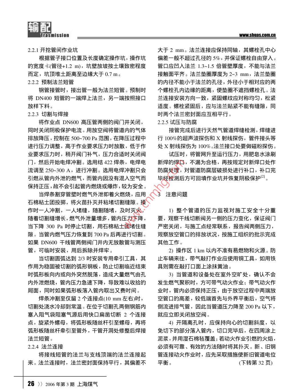 輸配www.shgas.com.cnTrasmission天然氣帶氣接管施工技術江蘇技術師范學院石宇熙摘要:天然氣管網(wǎng)投入運行后,隨著用戶的增加,需要接裝新用戶,文章以一條新增的天然氣中壓管線接入輸氣的高壓管線工程為例,介紹帶氣接管的施工方法。關鍵詞:天然氣帶氣接線施工技術城市天然氣管網(wǎng)投入運行后,隨著用戶的增多節(jié)燃氣壓力和流量。閥門必須嚴密性好、強度可靠、及燃氣改造進程的加快,需要增加新的管線,帶氣耐腐蝕,關閉后不泄漏,閥殼無砂眼、氣孔且壽命接線就是將新建的燃氣支管與正在運行的管線連較長。安裝前逐個對閥門進行強度試驗和嚴密性試接起來。在輸氣管道上切割,焊接或鉆孔,如措施驗。不當,就會發(fā)生著火與爆炸,因此正確的技術方案DN600及施工組織是保證工程順利完工的關鍵。1接線原理與施工平=y中壓支線管接入輸氣的高壓管采用降壓法施圖1天然氣帶氣接線示意工。高壓管道內(nèi)壓力高使用阻氣袋無法阻氣,需要關閉高壓管(DN00兩端的閥門,將兩閥門之間剩法蘭連接的閥門應在關閉狀態(tài)下安裝,閥門與氣放散并穩(wěn)定到正壓500~00Pa,最高不超過1000波紋伸縮節(jié)直接連接。安裝時根據(jù)閥門與波紋伸縮Pa,最低不得低于200Pa,然后切割、焊接,將新節(jié)以及法蘭與墊片的尺寸,將其兩側的管道切斷,建支線與運行的輸氣管線連接。降壓后,管內(nèi)的留出安裝位置。閥門放在支墩上,按要求標高墊平壓力必須大于大氣壓力,以免造成回火事故。當燃穩(wěn),不允許閥門因懸空而受力。先與一側管道上的氣管道內(nèi)產(chǎn)生負壓時,必須重新充燃氣,直到達到法蘭連接,再與波紋伸縮補償器連接。補償器不僅作業(yè)要求的壓力,否則禁止動火作業(yè)可以提供充分的軸向位移補償,還可以提供橫向或角向的位移補償,其補償能力為波節(jié)數(shù)與單節(jié)波紋1.1新增支線的安裝的補償能力之積。本工程中補償器采用8波,單節(jié)中壓支線管安裝到位后,在其靠近高壓輸氣管波紋補償能力一般為20mm。補償器應按氣流方向的近端安裝一座中壓閥門井,以便于切斷、檢修,安裝,并安裝在閥門的下側,利用其伸縮性能,方如圖1所示。新建中壓管與高壓管線連接的管道、便閥門的安裝、拆卸和檢修。安裝時根據(jù)閥門與另法蘭短管等應放樣下料,作好坡口,以保證與干線側管道的間距,用安裝螺栓調節(jié)伸縮節(jié)的長度,管道割開后可以吻合。同時中壓支線經(jīng)檢測、試壓安裝后,可拆去安裝螺栓或松開螺母,使波紋伸縮驗收后方可與輸氣干線連接。節(jié)能自由伸縮,否則不但不能發(fā)揮其補償作用,反新建的中壓閽門井中采用球閥作切斷閽,閥門而使管道受到不應有的應力。必須檢驗合格,開關靈活。在燃氣輸送中,閥門是重要的控制設備,除用以切斷和連通管線,還可調2.2接管施工上海煤氣2006年第3期《25匾配Trasmissionwww.shgas,com.cn22.1開挖管間作業(yè)坑大于2mm。法蘭連接應保持同軸,其螺栓孔中心根據(jù)管子接口位置及長度確定操作坑,操作坑偏差一般不超過孔徑的5%,并保證螺栓自由穿入。的寬度≮(管徑±1.2m),坑壁放坡按土壤致密程度管口應凹λ法蘭1.3-1.5倍管壁厚度,不能與法蘭而定,坑頂堆土距離至邊緣大于0.7m。接觸面平齊。法蘭墊圈厚度為2~3mm,法蘭墊圈222預制法蘭短管的內(nèi)徑不能小于法蘭的孔徑,外徑小于相對應的兩鋼管接管時,接岀管一般為法蘭短管。預制時?螺栓孔內(nèi)邊緣旳距離,使墊圈不遮擋螺栓孔。法將DN400短管的一端焊上法蘭,另一端按照接口蘭連接安裝方向一致,緊固螺紋應對稱均勻,松緊放樣下料適度。螺栓緊固后,應與法蘭貼緊不能有縫隙,同22.3切割與焊接時兩個法蘭密封面應互相平行。將作業(yè)點DN600高壓管兩側的閥門井關閉225試壓與防腐同時關閉陰極保護電流。用放空閥將管道內(nèi)的氣體接管完成后進行天然氣管道焊縫檢測,焊縫進排放降壓,控制在500~700Pa范圍,在降壓過程中行100%的超聲波探傷和ⅹ射線探傷,管件接頭等進行壓力調整,高于作業(yè)要求壓力時放散,低于作處ⅹ射線探傷為100%法蘭接口處要做磁粉探傷。業(yè)要求壓力時,稍開閥門補氣,壓力合適時關閉閥試壓時,將管網(wǎng)升至運行壓力,用肥皂水涂刷門,然后開始電焊沖割。選用結42焊條,電焊電新焊的焊口,不漏為合棓,再按規(guī)定對新焊口處作流調至250-300A,進行沖割。選用電焊沖割只會防腐處理,對管道防腐層破損處進行補口,補口完引燃從管內(nèi)外泄的燃氣,而管內(nèi)因沒有混入空氣而畢經(jīng)檢測后方可回填作業(yè)坑并恢復陰極保護保持正壓,故不會引起管內(nèi)燃燒或爆炸,較為安全。當焊條割穿管壁時燃氣外泄即著火燃燒,應用3注意問題石棉粘土團投擲,將火苗撲滅并粘堵切割縫隙。操作時一人沖割,一人堵縫,隨割隨堵,及時滅火。1)整個管道的壓力監(jiān)視對施工安全十分重隨著切割縫增長,燃氣外泄量增多,管內(nèi)壓力下降,要,觀察干線切斷閥另一側的壓力變化,保證閥門當下降300Pa時停止切割,用石棉粘土團堵住縫嚴密關閉,與施工點經(jīng)常聯(lián)系,報告閥兩側壓力,隙。當管內(nèi)燃氣壓力恢復到π00Pa后再進行切割。觀察放空管口的排放狀況,按施工組織的批示完成如果DN600干線管兩側閥門井內(nèi)無放散管與測壓其他工作。管,可臨時安裝,用后拆除并焊牢。2)操作區(qū)1km以