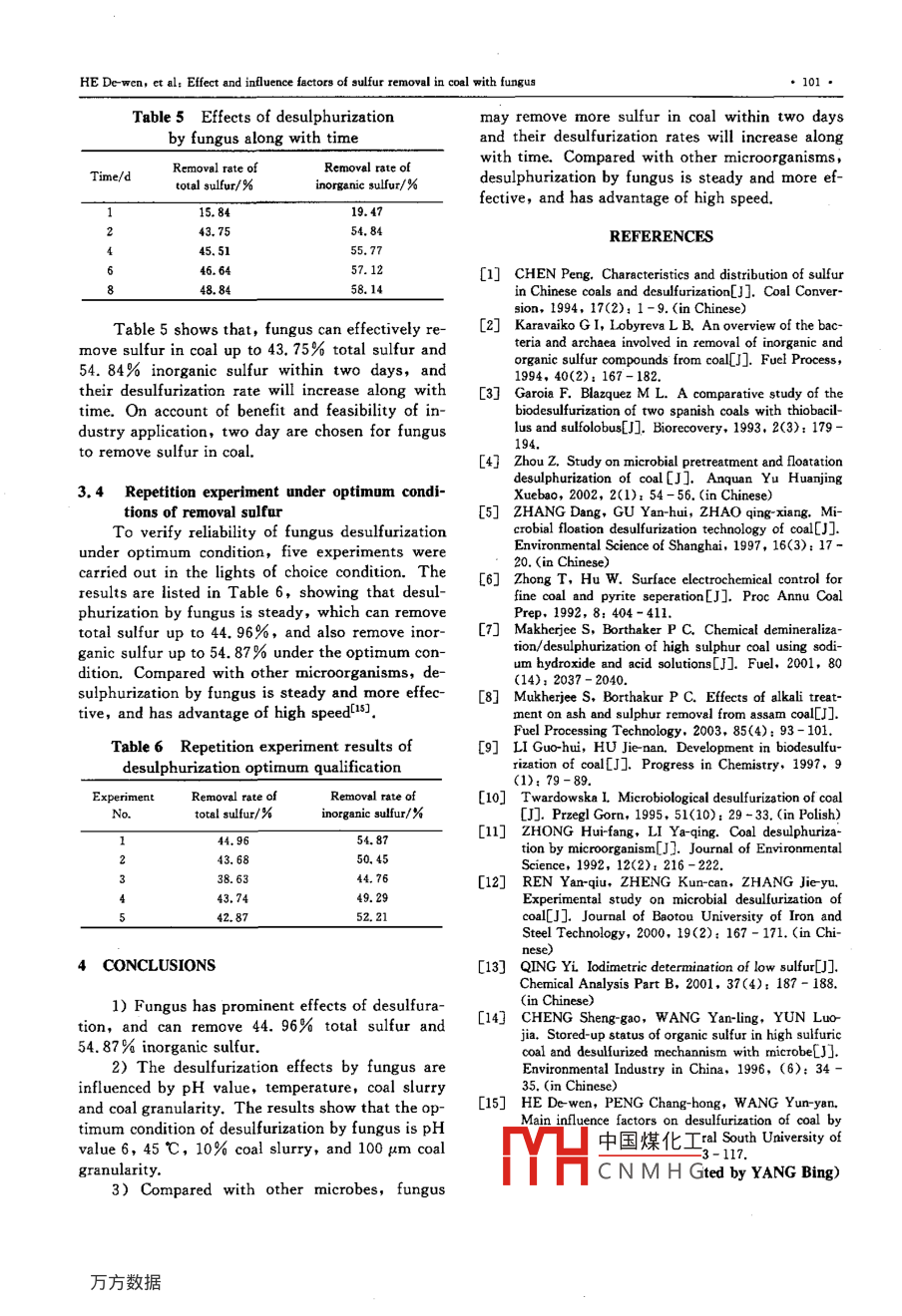 Vol, 12 Suppl. 1J. CENT. SOUTH UNIV. TECHNOL.Oct.2005Article d:1005-9784(2005)S1-0098-04Effect and influence factors of sulfur removal in coal with fungusHE De-wenc何德文), JIN Yan(金艷), CHAl Li-yuan(柴立元),JANG Rui(黃銳), PENG Bing(彭兵), WANG Yun-yan(王云燕)( College of Metallurgical Science and EngineeringCentral South University, Changsha 410083, ChinaAbstract: The influence of coal desulfurization by fungus was experimentally studied. The results suggest that fun-gus can effectively remove inorganic and organic sulfur in coal, and main influences of desulfurization by fungus ofpH value, temperature, coal slurry concentration and coal granularity were studied by orthodox experiment and theoptimal experimental conditions are/as follows: ph value 6, temperature 45 C, coal slurry concentration 10% andcoal granularity 100 um. Under above conditions, fungus can remove up to 44. 96% total sulfur and 54. 87% inor-ganic sulfur within two days, and their desulfurization rates will increase along with time. Compared with sulfolo-bas, desulphurization by fungus is steady and more effective, and has advantage of high speedKey words: fungus: desulfurization; coal; orthodox experimentCLC number: X7013Document code: A1 INTRODUCTION2 EXPERIMENTALHigh sulfur coal, which lets out poisonous 2.1 Experimental bacteriumand harmful gaalfur dioxide in theThe experimental original bacterium, pickedprocess of coal combustion, is a main factor to form punk wood, was enriched and brought up inform great area acid rain and occupies one third of culture medium, and then was separated to obtainreserves of total coal in China[i]. People has paid fungus. Subsequently the bacterium mycelium wasmuch attention to serious environment pollution made for the next experiment by purification andmade by sulfur in coal and searched for a speed, breeded in relative culture medium.low-cost and effective technology of desulphurizetion,which has become a significant environment 2.2 Coal samples preparationprotection task nowadays aCoal samples, picked from Chongqing areaoal desulfurization can be sorted into fore- were high sulfur coal with 2. 45% total sulfurburning, aflame-burning and after-burning by 1. 87% inorganic sulfur and 0. 58%organic sulfurburning processl3-53. and also sorted into physics, and were crashed and screened out into differentchemistry and biology method by different meascoal powders of 60, 100 and 160 umuresL6-9. Of all desulfurization methods, fore-burning desulfurization by microorganism, which 2.3 Desulfurization conditionscan remove sulfur in coal accompanied by oxida- 2. 3. 1 Soaking by rocking bottletion-reduction reaction at normal temperature andAbove coal powders were gotten and made intopressure, has more notable advantages of usin100 mL coal slurry in 250 mL triangle flask, and thenless energy, fewer operational cost. So researches cultivated bacterium was filtrated through 0. 2 um filmon coal desulfurization by microorganism drand throwed into coal slurry. The triangle flask wascholars more attention all over the world(. 11], placed into SHZ-88 model water-bathing vibrator tolow sulfolobus were used to remove sulfur and its breed microorganism under the condition with differentdesulfurization rate would be lower( 12)temperatures and rotating speed of 120 r/min. To aThe factors of desulfurby furnrus arevoid water vapor, distilled water was added at intervaltime to keep coal slurry to be 100 mlcould provide any guidance of key technology prob- 2. 3. 2 Post-treatment of coal sampleslem and industrialization experiment feasibilityCoal samples to be desulfurizated by microbe中國煤化工CNMHGo Foundation item: Project(2002AA649220) supported by Hitech Research and Development Programe: project( 1667)supported by the10: Accepted date: 2005-07-10Correspondence: HE De-wen, Associate Professor, PhD; Tel: +86-731-8830875: E-mail hedewen@mail, csu, edu.enHE De-wen, et al: Effect and influence factors of sulfur removal in coal with funguswere soaked with 4 mol/L hydrochloric acid after Fig 3 and Fig. 4 show that, coal desulphurizationcentrifugal separature. Super clear liquid was dis- is certainly affected by coal granularity and coalarded, and deposits was washed to neuter by dis- slurry concentration, and desulphurization rate oftilled water and dried at 70-100 C for analysis.total sulfur obviously ascends with small coal granularity and coal slurry concentration. But with ex-2. 4 Analysis methodscessive decrease of coal granularity(60 um), desulTotal sulfur in coal was determined by oxida- phurization rate of total sulfur and inorganic sulfurtion-reduction method, and inorganic sulfur was would fall compared with that of 100 um. The readetermined by colorimetry method. The amount of son is that microorganisms lie in coal slurry withorganic sulfur having complex and less component, two ways of adsorption and dissociation, and adequals to the difference between total sulfur and in- sorptive microorganism has more effective desulorganic sulfur[i3]phurization than dissociative microorganism be-cause there are much more adsorptive microorgan3 RESULTS AND DISCUSSIONisms on greater exterior area with finer coal granu-larity. While coal granularity is too fine, unit3. 1 Influencing factors of desulfuration by fungus amounts of bacterium on surface area would de3. 1. 1 Influence of pH value and temperaturecreasedesulphurization rate would fall. On thewhen keeping 10 coal slurry and 100 um coal otherdesulphurization rate would decreasegranularity, Fig. 1 and Fig. 2 show that, fungus with high coal slurry concentrationhave good effects of desulfuration under the condi- fewer microorganism amounton of ph=6 and 45 C because fungus activitywill augment alone with temperature, but too hightemperature will harm microbe. On the otherhand, acid medium would be brought out on theprocess of fungus biodegradation, so high ph value makes for rate of desulfuration i4. Its biodegradation equation4FeS2+15O2+2