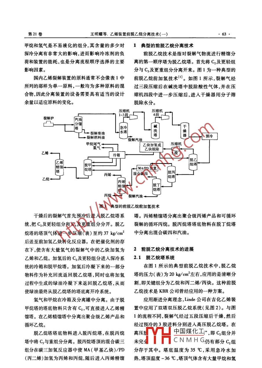 專家講壅乙烯工業(yè)2009,21(3) 62 ~64.ETHYLENE INDUSTRY乙烯裝置前脫乙烷分離技術(shù)(一)王明耀,李廣華(中國(guó)石化工程建設(shè)公司,北京100101) .摘要:介紹了乙烯裝置分離工藝路線中 的前脫乙烷技術(shù)。前脫乙烷技術(shù)將脫乙烷塔作為裂解氣精餾分離的第一順序塔,首先將碳二及更輕組分與碳三及更重組分分離開來。在前脫乙烷技術(shù)中,可以應(yīng)用碳二前加氫技術(shù)和低壓乙烯熱泵流程。與順序分離技術(shù)、前脫丙烷技術(shù)相同,前脫乙烷技術(shù)是乙烯裂解深冷分離的一項(xiàng)重要技術(shù)。關(guān)鍵詞:乙烯裝置;前脫乙烷;前加氫;乙烯精餾塔以蒸汽熱裂解為基礎(chǔ)的乙烯分離雖然有著多然是含有H2.C ~C,、輕汽油等多組分的混合物。種不同的順序,但從裝置的設(shè)備布置或各系統(tǒng)的表1給出了不同的裂解原料經(jīng)急冷、壓縮工功能上看,均可分為急冷區(qū)、壓縮區(qū)、冷分離區(qū)和段后典型的裂解氣組成。熱分離區(qū)。急冷區(qū)的主要目的是分離出裂解氣中表1裂解氣典型組成mol,%的燃料油和重汽油,并將其中大部分的水蒸汽冷項(xiàng)目尾油原料石腦油原料LPC原料二8.9315. 8917.55凝。急冷區(qū)流出的裂解氣為H2、C ~C,等多組分一氧化碳0.170.12甲烷19.0125.5327. 80的混合物。應(yīng)用深冷分離來分離氫氣和甲烷,通乙炔0.190.48常需要30kg/cm2以上的壓力,所以壓縮區(qū)的主要乙烯33.7531.6630.65乙烷8.085.464.97功能是將裂解氣的壓力(表)從接近常壓提升至丙烯丙二烯/丙炔0.720.500.5913.3910.479.1330 kg/cm2以上。由于裂解氣中存在有二烯烴和炔0.560.222.093.87烴等不飽和烴,溫度過高這些不飽和烴會(huì)發(fā)生聚3.882. 191.320. 191. 63103合反應(yīng)而使壓縮機(jī)內(nèi)積炭結(jié)焦,所以壓縮機(jī)的出3.030.891.53口溫度通??刂圃?05C以下,這就要求壓縮機(jī)Cg-Cp非芳2.450.95甲苯0.400.04的單段壓縮比不能太高(-般在2左右),因此從苯乙烯0.01常壓增壓(表)至30 kg/cm’以上需要四~五段壓乙苯/二甲苯0.020.00Cg+汽油縮。在壓縮機(jī)的三、四段之間,需要通過堿洗/水由表1可見,裂解氣組成中,C2及C2以下輕組洗將其中的CO2和H2S等酸性氣體除去。在現(xiàn)有技術(shù)中,主要應(yīng)用深冷對(duì)烴進(jìn)行進(jìn)一分的總摩爾分?jǐn)?shù)在70%以上,如果再加上Cz,總步分離,但即使微量水的存在對(duì)深冷分離都是不摩爾分?jǐn)?shù)可達(dá)84%以上,因此乙烯回收裝置的物利的。原因是水會(huì)在深冷部分結(jié)凍或與較大的烴料分離,主要在這些物料之間。另外,由表1還可分子形成水合物而堵塞管道或冷箱,因此在進(jìn)入以看出,不同的裂解原料,裂解氣組成變化很大,冷分離區(qū)前,需要應(yīng)用分子篩等將裂解氣中的水并且原料越輕,裂解氣中甲烷和氫氣的含量越高。分除去。中國(guó)煤化工相比于裂解爐流出物,經(jīng)急冷和壓縮工段后,:YHCN.M.H.196年畢業(yè)于裂解氣中沒有了水、脫除了CO2和H2S等酸性氣天津大學(xué)化學(xué)工程專業(yè),獲工學(xué)碩士學(xué)位,現(xiàn)從事石油化工的體燃料油和重汽油等重組分也得到了分離,但其仍設(shè)計(jì)和開發(fā)工作,高級(jí)工程師,專業(yè)副總工程師。第21卷王明耀等.乙烯裝置前脫乙烷分離技術(shù)(- -)甲烷和氫氣是不易液化的組分,其含量的多少對(duì)1典型的前脫乙烷分離技術(shù)深冷分離有非常大的影響,進(jìn)而影響冷凍劑的負(fù)前脫乙烷技術(shù)是指對(duì)裂解氣物流進(jìn)行精餾分荷和裝置的能耗,也是分離流程順序選擇的主要離的第- -順序塔為脫乙烷塔。首先將C2及更輕組影響因素。分與C3及更重組分分離開來。圖1為- -種典型的國(guó)內(nèi)乙烯裂解裝置的原料通常不會(huì)像表1中前脫乙烷前加氫技術(shù)"。如圖1所示,裂解氣經(jīng)所列的那樣為單- - 原料,- -般均為多種原料的混過三段壓縮后在堿洗塔中脫除酸性氣體,并在壓合物,因此分離裝置的設(shè)備需要具有適當(dāng)?shù)脑O(shè)計(jì)縮機(jī)四段中進(jìn)一步壓縮后,進(jìn)入干燥器用分子篩余量以適應(yīng)原料的變化。脫除水分。壓縮機(jī)裂解爐135凸4段廠凸分餾|干Th洗|操T幾裂解柴油果|L + 裂解燃料油裂解汽迪預(yù)冷甲姚氣土乙炔加氨或玉縮機(jī)乙炔脫除乙婚。7冷箱脫乙Z烯烷塔+ MA/PD加氫|混合碳四脫丙丙烯←z完塔烷←精簡(jiǎn)塔裂解汽油.圖1典型的前脫乙烷前加氫技術(shù)干燥后的裂解氣首先預(yù)冷后進(jìn)人脫乙烷塔系塔。丙烯精餾塔分離出聚合級(jí)丙烯產(chǎn)品和可循環(huán)統(tǒng),把C2及更輕組分和C3及更重組分分開。脫乙裂解 的循環(huán)丙烷。脫丙烷塔塔底物料在脫丁烷塔烷塔的塔頂氣體進(jìn)一步壓縮(表)至約37 kg/cm2中分離出混合碳四和汽油。后送至前加氫乙炔轉(zhuǎn)化反應(yīng)器。在鈀催化劑的存在下,使含有大量氫氣的裂解氣中的乙炔加氫為2前脫乙烷分離技術(shù)的進(jìn)展乙烯和乙烷。加氫后的C.及更輕組分進(jìn)入深冷系2.1脫乙烷塔系統(tǒng)統(tǒng)的冷箱和脫甲烷塔。加氫后冷凝下來的- -部分在圖1所示的典型前脫乙烷技術(shù)中,脫乙烷物料作為祁補(bǔ)充回流返回脫乙烷塔,同時(shí)也將加氫塔的壓力( 表)為20 kg/cm2 左右,應(yīng)用的是清晰分過程中生成的綠油冷凝下來返回脫乙烷塔,從而割, 即關(guān)鍵組分為乙烷和丙二烯/丙炔。這種前脫使綠油最