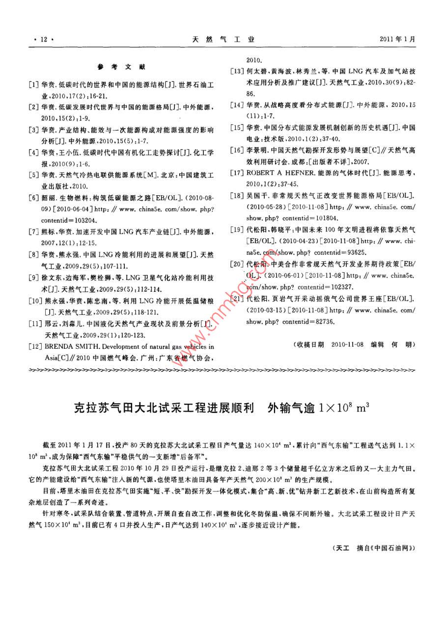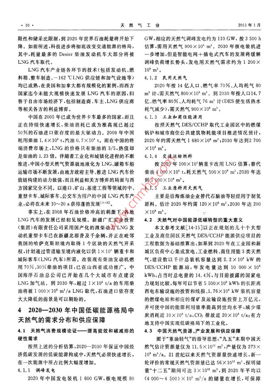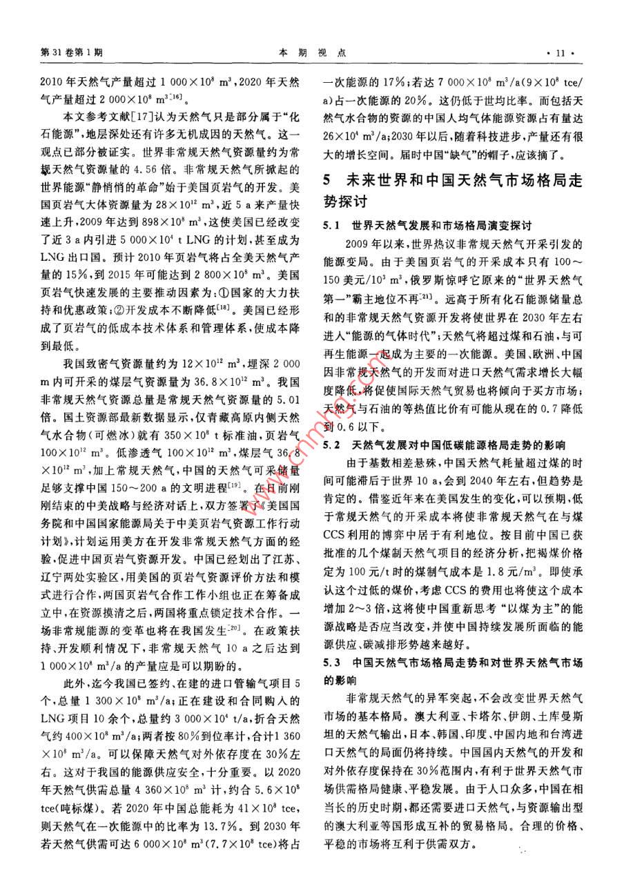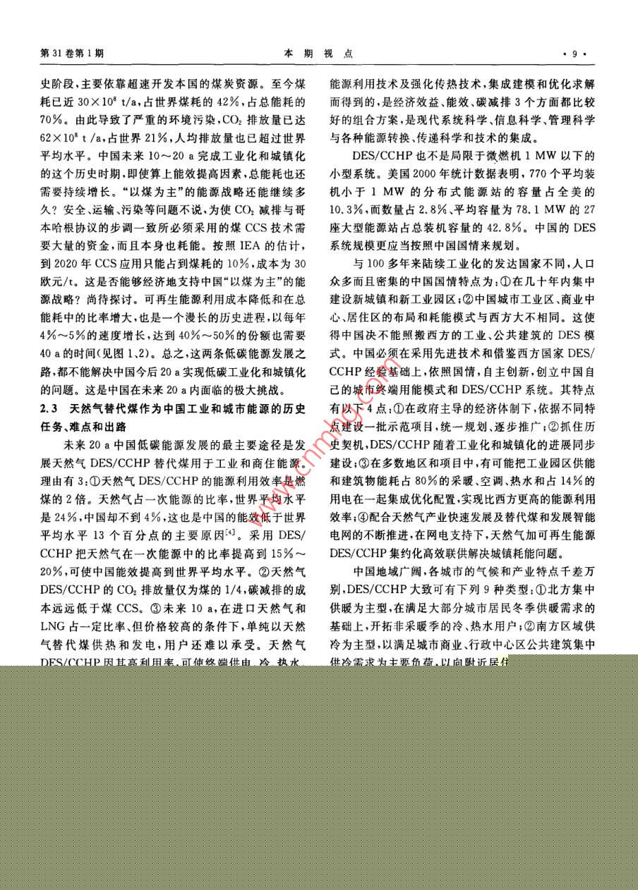 第31卷第1期本期視點(diǎn)中國(guó)低碳能源格局中的天然氣華賁華南理工大學(xué)天然氣利用研究中心華責(zé).中國(guó)低碳能源格局中的天然氣,天然氣工業(yè),2011,31(1):7-12摘要2009年底的哥本昏根會(huì)議開啟了世界走向低碳能源的新時(shí)代。為此,分析了低碳時(shí)代世界及中國(guó)一次能源構(gòu)成的變化情況,結(jié)論指出:在控制溫升不超過(guò)2℃的情況下,要求把能源消耗產(chǎn)生的CO2控制在100×10v/a,這將導(dǎo)致目前石油、煤、天然氣、核能與可再生能源在總能耗構(gòu)成中的比率逆轉(zhuǎn)和終端用能模式巨變,2020-—2050年中國(guó)天然氣將在工業(yè)燃料、商住和民用能源、調(diào)峰發(fā)電、交通幾大領(lǐng)域占據(jù)主導(dǎo)或重要地位,并將在冷熱電聯(lián)供分布式能源系統(tǒng)、CNG汽車和LNG汽車技術(shù)領(lǐng)域自主創(chuàng)新,領(lǐng)先于世界;中國(guó)非常規(guī)天然氣資源豐富、開發(fā)前景看好,自給率可達(dá)70%;2020-2030年中國(guó)天然氣消費(fèi)規(guī)模將達(dá)到(4000-6000103m3/a,將對(duì)世界天然氣市場(chǎng)發(fā)生積極、正面的影嘲關(guān)鍵詞低碳能源格局中國(guó)天然氣冷熱電聯(lián)供LNG汽車市場(chǎng)規(guī)模資源和供應(yīng)保障DO:10.3787/.isn.1000976.2011.01.002工業(yè)化以來(lái)的150a間,地表大氣中CO的濃度1低碳時(shí)代一次能源到終端利用的變?cè)黾恿?5%,增加部分的80%來(lái)自于化石能源的使用,而這部分的80%由工業(yè)化的發(fā)達(dá)國(guó)家所排放。20化趨勢(shì)世紀(jì)90年代以來(lái),占世界總?cè)丝诮氲摹靶屡d國(guó)家”掀本文參考文獻(xiàn)[1-3]研究了能耗、一次能源構(gòu)成以起了工業(yè)化高潮,導(dǎo)致了世界能源消耗的加速增長(zhǎng)及及應(yīng)用碳抽獲和封存( Carbon Capture and Sequestra-新一輪溫室氣體濃度的快速增加并將導(dǎo)致地表溫度tion,CCS)技術(shù)三者與CO2排放之間的制約關(guān)系,并加速上升冰山融化海平面上升、災(zāi)害天氣增加和生推算出了在上述減排目標(biāo)和進(jìn)程下世界能耗和一次能態(tài)環(huán)境的破壞。源構(gòu)成變化的走勢(shì),2005-2050年世界、中國(guó)一次能氣候變化已成為世界各國(guó)面臨的最緊迫問(wèn)題。源構(gòu)成的變化趨勢(shì)圖如圖1、2所示,未來(lái)的10~20a,200912月的哥本哈根會(huì)議以世界192個(gè)國(guó)家的聲即2020-2030年,將是世界一次能源構(gòu)成的轉(zhuǎn)折點(diǎn)音,肯定了會(huì)議前夕國(guó)際能源署(IEA)提出的“450情石油(曲線Ⅳ)與可再生能源(曲線I)在一次能源構(gòu)成景方案”3個(gè)具體目標(biāo)中的2個(gè),即:全球平均氣溫不應(yīng)比工業(yè)化開始前高出2℃;這要求全球CO2排放量減到1990年(209×10t)的一半。為此,發(fā)達(dá)國(guó)家至少應(yīng)當(dāng)減少80%溫室氣體排放量發(fā)展中國(guó)家的溫室60氣體排放量應(yīng)當(dāng)比“通常情況下”低15%~3%,至1、可再生能源Ⅱ煤于第3個(gè)目標(biāo),即碳排放的峰值年和減排到1990年排20Ⅲl'天然氣Ⅳ石油放量一半的時(shí)限,以及發(fā)達(dá)國(guó)家以資金和技術(shù)支持發(fā)2000201020202025203020402050展中國(guó)家減排的具體安排,則留給了2010年末的墨西年份哥會(huì)議去解決。圖12005-2050年世界一次能源構(gòu)成的變化趨勢(shì)圖作者簡(jiǎn)介:華賁,1937年生,教授,華南理工大學(xué)天然氣利用研究中心主任;主要從事天然氣利用研究工作。地址:(510640)廣東省廣州市天河區(qū)五山華南理工大學(xué),電話:(020)8711374413802978973, E-mail: cehuabent@ scut. edu,cn天然氣工業(yè)2011年1月商住用能天然氣DES/CCH圈智能電阿!工業(yè)用可再Ⅱ煤Ⅲl天然氣Ⅳ石油匚氣化多聯(lián)產(chǎn)交通用能2000200520102020203020加工有機(jī)化了圖22005-2050年中國(guó)一次能源構(gòu)成的變化趨勢(shì)圖圖3低碳時(shí)代一次能源終端利用的新格局圖中的排位互換,而煤(曲線Ⅱ)和天然氣(曲線Ⅲ)兩者注:DES/CHP表示分布式冷熱電聯(lián)供系統(tǒng);BO表示生物燃料的走勢(shì)高低將取決于煤CCS利用技術(shù)經(jīng)濟(jì)指標(biāo)與非常規(guī)天然氣開采成本和規(guī)模兩者之間的博弈。2中國(guó)發(fā)展天然氣冷熱電聯(lián)供能源系1.1低碳時(shí)代世界一次能源構(gòu)成的變化趨勢(shì)統(tǒng)的歷史機(jī)遇和創(chuàng)新前景未來(lái)20~40a,因氣候變化的挑戰(zhàn),世界將進(jìn)入由2.1冷熱電聯(lián)供能源系統(tǒng)是化石能源用于工業(yè)和商科技進(jìn)步引領(lǐng)的低碳經(jīng)濟(jì)增長(zhǎng)時(shí)期。但世界各國(guó)的發(fā)住的必然選擇展是不平衡的,合計(jì)10億人口的發(fā)達(dá)國(guó)家已經(jīng)進(jìn)入后占世界總能耗70%左右的工業(yè)和商住建筑物耗工業(yè)化階段,人均能耗逐漸降低,而擁有30多億人口能中,大部分都是低品位的熱能,占工業(yè)能耗大的“新興國(guó)家”也步人工業(yè)化階段使得人類利用能源多數(shù)的過(guò)程工業(yè)耗能熱與電之比超過(guò)5,大部分低于的總量繼續(xù)增長(zhǎng);工業(yè)、商住和交通三大領(lǐng)域的耗能均400℃;建筑耗能80%的溫位與環(huán)境溫度只差10~衡增加;科技進(jìn)步促進(jìn)總能效將由目前的50%提高到30℃。按照熱力學(xué)第二定律化石能源的化學(xué)能轉(zhuǎn)換55%;人均能耗將比現(xiàn)在大大減少