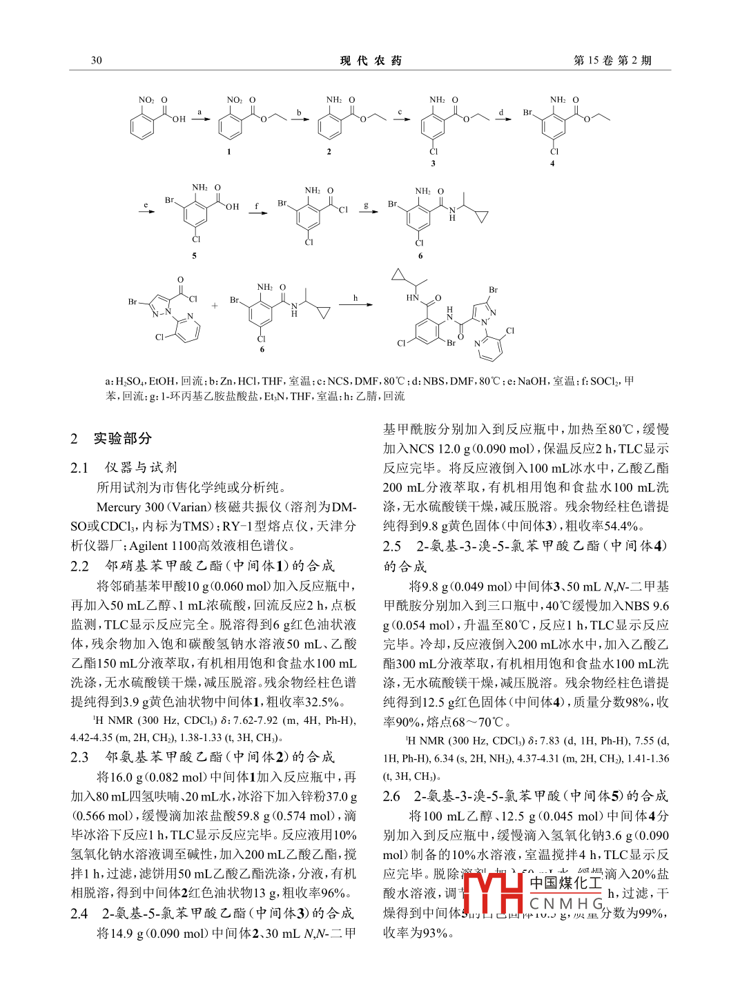 第15卷第2期現(xiàn)代農(nóng)藥Vol.15 No.22016年4月.Modern AgrochemicalsApr. 2016◆研究與開(kāi)發(fā)◆Cyclaniliprole的合成與殺蟲(chóng)活性英君伍,羅煥,宋玉泉,李 斌,楊輝斌 °(沈陽(yáng)中化農(nóng)藥化工研發(fā)有限公司,新農(nóng)藥創(chuàng)制與開(kāi)發(fā)國(guó)家重點(diǎn)實(shí)驗(yàn)室,沈陽(yáng)1 10021)摘要:以鄰硝基苯甲酸為起始原料,經(jīng)酯化、還原、氯化、溴化、水解、?;约翱s合反應(yīng)制得關(guān)鍵中間體2-氨基-3-澳-5-氯-N-(1-環(huán)丙基乙基)苯甲酰胺,該中間體進(jìn)一步與3-溴-1-(3-氯吡啶-2-基)-1H-吡唑-5-甲酰氯反應(yīng)合成cyclaniliprole。 目標(biāo)化合物結(jié)構(gòu)經(jīng)MS和'H NMR確證。殺蟲(chóng)活性測(cè)試結(jié)果表明,cyclaniliprole對(duì)小菜蛾及黏蟲(chóng)具有優(yōu)異的殺蟲(chóng)活性,在10 mg/L質(zhì)量濃度下對(duì)小菜蛾和黏蟲(chóng)的防效分別為88.2%和100%。關(guān)鍵詞:cyclaniliprole;2-氨基-3-澳-5-氯-N-(1-環(huán)丙基乙基)苯甲酰胺;合成;殺蟲(chóng)活性中圖分類號(hào):TQ453.2+99文獻(xiàn)標(biāo)志碼:Adoi: 10.3969/jissn. 1671-5284.2016.02.007Synthesis and Insecticidal Activity of CyclaniliproleYING Jun-wu, LUO Huan, SONG Yu-quan, LI Bin, YANG Hui-bin'(State Key Laboratory of the Discovery and Development of Novel Pesticide, Shenyang Sinochem AgrochemicalsResearch and Development Co, Ltd, Shenyang 110021, China)Abstract: The synthetic method of cyclaniliprole was introduced in this paper. First, 2-amino-3-bromo 5-chlor0-N-(1-cyclopropyl-ethyl)benzamide was synthesized using 2-nitrobenzoic acid as starting material, by steps of esterification,reduction, chlorination, bromination, hydrolysis, acylation and condensation. Then, cyclaniliprole was prepared fron2-amino-3-bromo-5-chloro-N- (1-cyclopropyl-ethyl)benzamide and 3-bromo-1- (3-chloro-2-pyridiny)-1H-pyrazole-5-car-bonyl chloride. The structure of the target compound was confirmed by MS and 'H NMR. Indoor insecticidal activity testshowed that cyclaniliprole had excellent insecticidal activities against diamond back moth and army worm, with the controleffects of 88.2% and 100% at the concentration of 10 mg/L.Key words: cyclaniliprole; 2-amino 3-bromo-5-chloro-N-(1-cyclopropyl-ethy)benzamide; synthesis; insecticidal activityCyclaniliprole是 日本石原產(chǎn)業(yè)株式會(huì)社開(kāi)發(fā)△的雙酰胺類殺蟲(chóng)劑,具有廣譜的殺蟲(chóng)活性,對(duì)小菜BHN 0蛾、斜紋夜蛾、粉虱、蚜蟲(chóng)、薊馬、家蠅、斑潛蠅、白蟻等具有很好的殺死效果,且具有很好的內(nèi)吸活性,對(duì)刺吸式口器害蟲(chóng)有效川。本文對(duì)cyclaniliprole的合成路線進(jìn)行了探索,并對(duì)其殺蟲(chóng)活性進(jìn)行了1 合成路線研究。Cyclaniliprole 試驗(yàn)代號(hào)IKI-3106,分子式Cyclaniliprole的合成路線主要有2條,均由日本C2H,Br,CIlN,O,相對(duì)分子質(zhì)量600.91,化學(xué)結(jié)構(gòu)式石原產(chǎn)業(yè)株式會(huì)社報(bào)道1251。如右所示。路線12:以2-氨基-5-氯苯甲酸為起始原料,經(jīng)過(guò)中國(guó)煤化工收稿日期:2015-10-14基金項(xiàng)目:“十二.五”國(guó)家科技支撐計(jì)劃項(xiàng)目(2011BAE06B01)YHCNM HG作者簡(jiǎn)介:英君伍(1984- -),男,沈陽(yáng)市人,碩士。研究方向:新農(nóng)藥創(chuàng)制。E-mail; yingjunwu@sinochem.com通訊作者:楊輝斌(1981-),男,沈陽(yáng)市人,碩士。研究方向:新農(nóng)藥創(chuàng)制。E-mail: yanghuibin@sinochem.com2016年4月英君伍,等:Cylailiprole的合成與殺蟲(chóng)活性29取代、酯化、環(huán)合、溴化、氧化等10步反應(yīng)制得目標(biāo)物。該合成路線較長(zhǎng),反應(yīng)條件苛刻,原料不易得。0、,OH。OH0、OH,NH: +°x°_a.NrCl△)HO2d、 HN2OHNy°HN sCI是上HNNy°,BHN 0Bi3ra:二氧六環(huán),回流: b: MeOH, HSO,; c: AcONa, Ac2O, MeOH;d: 1-環(huán)丙基乙胺鹽酸鹽, EtN, MeCN,室溫;e:NH4 HO,EtOH,回流:f:2,3-二氯吡啶,DMF, NaOH, 70C;g: 2-硝基苯-1-磺酰胺,EtN, CHCI,室溫; h: HBr, AcOH;i:H2Oz,AcOEt,回流;j: NaOH, Br2, AcOEt路線21351:以環(huán)丙甲酮為原料制備1-環(huán)丙基乙唑_5-甲酰氯通過(guò)嗯嗪酮開(kāi)環(huán)方式制備目標(biāo)物。該路胺,以2-硝基-5-氯苯甲酸制備2-氨基-3-溴-5-氯苯甲線收率較低,原料浪費(fèi)嚴(yán)重,同時(shí)中間體2-氨基-3-酸,再與另一中間體3-溴-1-(3-氯吡啶-2-基)-1H-吡溴-5-氯苯甲酸提純困難,對(duì)下步收率影響較大。At HO-NH:HC1 - AHCI c. Av~OHNH2NOzIH2 OCOOHH_ ec51NHz OBr^~OFBr馬a: H2O, Na2CO,回流: b: PtO2, AcONa, HCl;c: NaOH; d: Fe, HCI; e: NaOH, Br, DMF; f:CH$SO2Cl, Et,N, MeCN;g: 1-環(huán)丙基乙胺, EtN,THF,回流本研究在現(xiàn)有文獻(xiàn)基礎(chǔ)上,綜合考慮原料、實(shí)在0.13~0.36之間;甲基3個(gè)氫與叔碳上的氫耦合驗(yàn)操作及反應(yīng)條件等方面,以鄰硝基苯甲酸為起始為雙峰,化學(xué)中國(guó)煤 化工化學(xué)位移為原料,經(jīng)過(guò)酯化、還原、氯化、溴化、水解等8步反應(yīng)7.43;吡啶318.08, 7.57;JYTHCNMHG,制得目標(biāo)物。結(jié)構(gòu)經(jīng)核磁、質(zhì)譜確證。由核磁數(shù)據(jù)吡唑4位氫為單畔,化子位多內(nèi)1.00.日成路線如下可知,目標(biāo)產(chǎn)物的環(huán)丙基4個(gè)氫為多重峰,化學(xué)位移.圖所示。30現(xiàn)代農(nóng)藥第15卷第2期VO2 oNH2 (NH2 ONH2 0OH aCNHz CNH O0H_ f、 BIcrg. Br日V21BBr-Cla: H2SO4, EtOH,回流; b: Zn, HCI, THF,室溫;c: NCS, DMF, 80^C ;d: NBS, DMF, 80'C;e: NaOH,室溫; f: SOCl,甲苯,回流;g:1-環(huán)丙基乙胺鹽酸鹽,EtN,THF,室溫;h:乙腈,回流.基甲酰胺分別加入到反應(yīng)瓶中,加熱