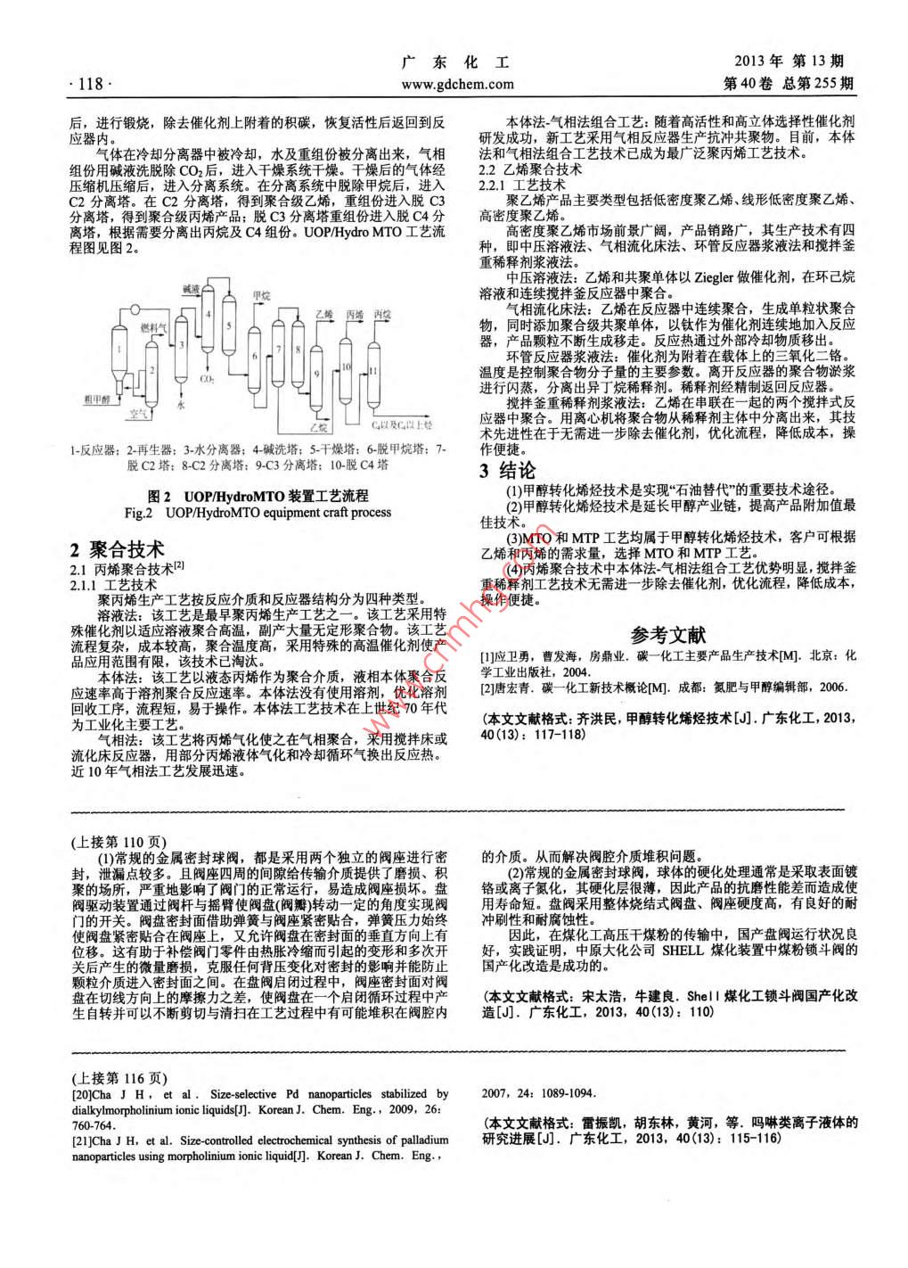 廣東化工2013年第13期.118.www.gdchem.com第40卷總第255期后,進(jìn)行鍛燒,除去催化劑上附著的積碳,恢復(fù)活性后返回到反本體法-氣相法組合工藝:隨著高活性和高立體選擇性催化劑應(yīng)器內(nèi)研發(fā)成功,新工藝采用氣相反應(yīng)器生產(chǎn)抗沖共聚物。目前,本體氣體在冷卻分離器中被冷卻,水及重組份被分離出來,氣相法和氣相法組合工藝技術(shù)已成為最廣泛聚丙烯工藝技術(shù)。組份用堿液洗脫除CO2后,進(jìn)入干燥系統(tǒng)干燥。干燥后的氣體經(jīng)2.2乙烯聚合技術(shù)壓縮機(jī)壓縮后,進(jìn)入分離系統(tǒng)。在分離系統(tǒng)中脫除甲烷后,進(jìn)入2.2.1 工藝技術(shù)C2分離塔。在C2分離塔,得到聚合級(jí)乙烯,重組份進(jìn)入脫C3聚乙烯產(chǎn)品主要類型包括低密度聚乙烯、線形低密度聚乙烯、分離塔,得到聚合級(jí)丙烯產(chǎn)品;脫C3分離塔重組份進(jìn)入脫C4分高密度聚乙烯離塔,根據(jù)需要分離出丙烷及C4組份。UOP/Hydro MTO工藝流高密度聚乙烯市場前景廣闊,產(chǎn)品銷路廣,其生產(chǎn)技術(shù)有四程圖見圖2。種,即中壓溶液法、氣相流化床法、環(huán)管反應(yīng)器漿液法和攪拌釜重稀釋劑漿液法。中壓溶液法:乙烯和共聚單體以Ziegler做催化劑,在環(huán)己烷照馬溶液和連續(xù)攪拌簽反應(yīng)器中聚合。中國容液法氣相流化床法:乙烯在反應(yīng)器中連續(xù)聚合,生成單粒狀聚合物,同時(shí)添加聚合級(jí)共聚單體,以鈦?zhàn)鳛榇呋瘎┻B續(xù)地加入反應(yīng)器,產(chǎn)品顆粒不斷生成移走。反應(yīng)熱通過外部冷卻物質(zhì)移出。環(huán)管反應(yīng)器漿液法:催化劑為附著在載體上的三氧化二鉻。溫度是控制聚合物分子量的主要參數(shù)。離開反應(yīng)器的聚合物淤漿進(jìn)行閃蒸,分離出異丁烷稀釋劑。稀釋劑經(jīng)精制返回反應(yīng)器。期甲醇1攪拌釜重稀釋劑漿液法:乙烯在串聯(lián)在一起的兩個(gè)攪拌式反C以及C以上整應(yīng)器中聚合。用離心機(jī)將聚合物從稀釋劑主體中分離出來,其技術(shù)先進(jìn)性在于無需進(jìn)一步除去催化劑,優(yōu)化流程,降低成本,操1-反應(yīng)器: 2-再生器: 3-水分離器; 4-堿洗塔; 5-干燥塔: 6-脫甲烷塔: 7-作便捷。脫C2塔: 8-C2 分離塔: 9-C3 分離塔: 10-脫C4塔3結(jié)論(1)甲醇轉(zhuǎn)化烯烴技術(shù)是實(shí)現(xiàn)“石油替代”的重要技術(shù)途徑。圖2 UOP/HydroMTO 裝置工藝流程(2)甲醇轉(zhuǎn)化烯烴技術(shù)是延長甲醇產(chǎn)業(yè)鏈,提高產(chǎn)品附加值最Fig.2UOP/HydroMTO equipment craft process佳技術(shù)(3)MTO和MTP工藝均屬于甲醇轉(zhuǎn)化烯烴技術(shù),客戶可根據(jù)2聚合技術(shù)乙烯和丙烯的需求量,選擇MTO和MTP工藝。2.1丙烯聚合技術(shù)B(4)丙烯聚合技術(shù)中本體法氣相法組合工藝優(yōu)勢明顯,攪拌釜2.1.1工藝技術(shù)重稀釋劑工藝技術(shù)無需進(jìn)一- 步除去催化劑,優(yōu)化流程,降低成本,聚丙烯生產(chǎn)工藝按反應(yīng)介質(zhì)和反應(yīng)器結(jié)構(gòu)分為四種類型。操作便捷。有液法,該工產(chǎn)工藝之一。該工藝采用公公公公專司司司形公物公殊催化劑以適應(yīng)溶液聚合高溫,副產(chǎn)道參考文獻(xiàn)流程復(fù)雜,成本較高,聚合溫度高,采用特殊的高溫催化劑使產(chǎn)[]應(yīng)衛(wèi)勇,曹發(fā)海,房鼎業(yè).碳-化工主要產(chǎn)品生產(chǎn)技術(shù)[M].北京:化品應(yīng)用范圍有限,該技術(shù)已淘汰。本體法:該工藝以液態(tài)丙烯作為聚合介質(zhì),液相本體聚合反學(xué)工業(yè)出版社,200應(yīng)速率高于溶劑聚合反應(yīng)速率。本體法沒有使用溶劑,優(yōu)化溶劑[2]唐宏青.碳一化工新技術(shù)概論[M].成都:氨肥與甲醇編輯部,2006.回收工序,流程短,易于操作。本體法工藝技術(shù)在上世紀(jì)70年代(本文文獻(xiàn)格式:齊洪民,甲醇轉(zhuǎn)化烯烴技術(shù)[J].廣東化工, 2013,為工業(yè)化主要工藝。氣相法:該工藝將丙烯氣化使之在氣相聚合,采用攪拌床或40(13): 117-118)流化床反應(yīng)器,用部分丙烯液體氣化和冷卻循環(huán)氣換出反應(yīng)熱。近10年氣相法工藝發(fā)展迅速。(上接第110頁)(1)常規(guī)的金屬密封球閥,都是采用兩個(gè)獨(dú)立的閥座進(jìn)行密的介質(zhì)。從而解決閥腔介質(zhì)堆積問題。封,泄漏點(diǎn)較多。且閥座四周的間隙給傳輸介質(zhì)提供了磨損、積(2)常規(guī)的金屬密封球閥,球體的硬化處理通常是采取表面鍍聚的場所,嚴(yán)重地影響了閥門的正常運(yùn)行,易造成閥座損壞。盤鉻或離子氮化,其硬化層很薄,因此產(chǎn)品的抗磨性能差而造成使閥驅(qū)動(dòng)裝置通過閥桿與搖臂使閥盤(閥瓣)轉(zhuǎn)動(dòng)一定的角度實(shí)現(xiàn)閥用壽命短。盤閥采用整體燒結(jié)式閥盤、閥座硬度高,有良好的耐門的開關(guān)。閥盤密封面借助彈簧與閥座緊密貼合,彈簧壓力始終沖刷性和耐腐蝕性。使閥盤緊密貼合在閥座上,又允許閥盤在密封面的垂直方向上有因此,在煤化工高壓干煤粉的傳輸中,國產(chǎn)盤閥運(yùn)行狀況良位移。這有助于補(bǔ)償閥門零件由熱脹冷縮而引起的變形和多次開好,實(shí)踐證明,中原大化公司SHELL煤化裝置中煤粉鎖斗閥的關(guān)后產(chǎn)生的微量磨損,克服任何背壓變化對(duì)密封的影響并能防止國產(chǎn)化改造是成功的。顆粒介質(zhì)進(jìn)入密封面之