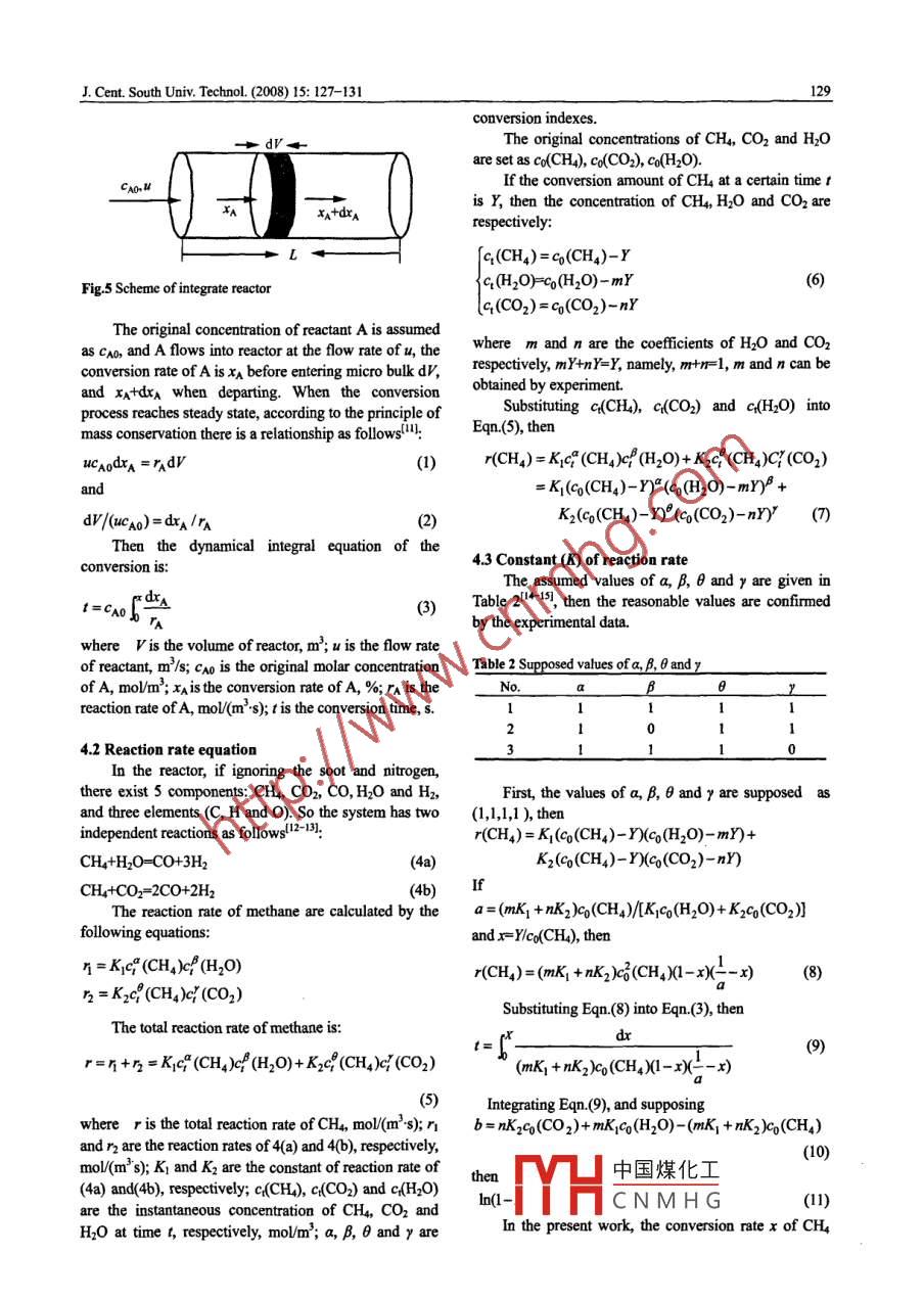 J. Cent, South Univ TechnoL. (2008)15: 127-131DOI:10.1007/s11771008-0025-82 springerKinetic model on coke oven gas with steam reformingZHANG Jia-yuan(張家元), ZHoU Jie-min(周孑民), YAN Hong-jie(閆紅杰)(School of Energy Science and Engineering, Central South University, Changsha 410083, ChinaAbstract: The effects of factors such as the molar ratio of H,o to CH(n(H, O)(CH,), methane conversion temperature and timeon methane conversion rate were investigated to build kinetic model for reforming of coke-oven gas with steam. The results ofexperiments show that the optimal conditions for methane conversion are that the molar ratio of H20 to CH varies from 1.1 to 1.3and the conversion temperature varies from 1 223 to 1 273 K. The methane conversion rate is more than 95% when the molar ratio ofHyO to CH is 1.2, the conversion temperature is above 1 223 K and the conversion time is longer than 0. 75 s. Kinetic model ofmethane conversion was proposed. All results demonstrate that the calculated values by the kinetic model accord with theexperimental data well, and the error is less than 1.5%Key words: coke oven gas; steam reforming: kinetic model; conversion rate1 IntroductionOutlet ofsynthesis gasThe coke oven gas is a by-product from cokingplants during the production of blast furnace coke.Besides CO and H2, these product gases always containFlowmetlarge amount of hydrocarbons like methane, benzene andnaphthalene. The actuality of application technique aboutthe coke oven gas behind productivity leads to that alarge amount of coke oven gas cannot be utilizedTesto 360 gassufficiently, resulting in environmental pollution andresource wasting. With the development of the cokeindustry, the issue is acute increasingly-2.Reformingcoke oven gas into synthesis gas, which can be used asResistance wiremetallurgical reduction gas or raw material for theproduction of chemicals, such as methanol or ammonith regard to the useSteam preheaterof the product gases, hydrocarbons should beconverted!l6l. Steam-reforming is effective to reformFlowmeter Flowmetercoke-oven gas, but the kinetic behavior needs furtherFig 1 Scheme of experimental systemIn this paper, to develop a process of reformingcoke-oven gas, the conversion of methane in the Table I Compositions of raw coke oven gas for experimentspresence of H20 was studied, and the kinetic model ofCH conversion was proposed.2 Experimental58174601.6025205.903.20The scheme of experimental system is shown ina tubular electric flow reactor made of quartz wasFig 1. The experiments were made in a laboratory-scaled used to heat and maintain the furnace at the requiredapparatus at 1.4 X 10 Pa and 773-1 323 K. The temperature. The alumina balls were put at the bottom ofcompositions of the coke oven gas for the experiments the fumace to keep the evenly-distributed flow field.are listed in Table 1Temperature of the fumace can be controlled in the rangen item: Project(291054)supported by Postdoctoral Fund of ChinaReceived date: 2007-06-ll; Accepted date: 2007-08-27Corresponding author: ZHANG Jia-yuan, PhD, Associate professor; Tel: +86-731-8876H中國煤化工CNMHGJ. Cent. South Univ. Technol. (2008)15: 127-131of 773-1 323 K. Real temperatures were measured bylatinum- rhodium thermocouple that can be shifted in asmall quartz tube with 5 mm in diameter. During theexperiments, the coke oven gas from storage flowed intethe reactor at the fixed speed of 18 m/h. Water wasinjected into an electrothermal evaporator by a highprecision syringe pump to from steam of about 573 K, gand then the steam was blown into the furnace with cokein proportion. The desired molar ratio was— Conversion rate of CH.t90djusted by controlling the temperatures in theMolar fraction ofsaturator&). The flow rate and composition of the cokeoven gas were kept constant during the experiments, thevolume of the reactor(namely conversionwaschanged through adjusting the depth of then(H,O)n(CH)composition of product was analyzed and recorded byFig 4 Effect of molar ratio of H2O to CH ratio on conversiongas analysis recorder.rate and molar fraction of H+Co at 1 223 K for 0.6 s3 Results and discussionFig 2 shows that the methane conversion increaseswith decreasing temperature gradually. It can be seenDuring the experiments, the factors including the from Fig 3 when conversion time is longer than 0.6 s andmolar ratio of H20 to CH4, conversion temperature and the temperature is above 1 223 K, the conversiontime in the reactor on methane conversion rate were reaction approaches equilibrium state and the methaneinvestigated. The conversion temperature varied from conversion rate approaches the maximum value773 to 1 323 K, and the molar ratio of H,o to CH4 variesFig 4 shows that the methane conversion ratein the range of 0.8-1. 4. Conversion time was changed by increases with decreasing the molar ratio of H,0 to CH4adjusting the depth of outlet. The results of experiments in a rang of 0.8-1.4, the methane conversion rate isare shown in Figs 2-4above 87%. When the molar ratio of H2o to CH4 is in arange of 1. 4-1.6, the methane conversion ratio decreasesas increasing the molar ratio of H2o to CH4. It is knownthat the gas conversion rate depends on its conversiontime, viz., the contact time among reactant moleculesWhen the flow rate of coke oven gas is fixed, thevelocity of the admixture is faster as the molar ratio ofH,O to CH4 increases, so the conversion time of theadmixture in reactor is reduced, resulting in less methane0.3040.50.60.708091.0To sum up, the optimal conditions for methaneconversion are that the molar ratio of H2o to CH4 variesFig 2 Effect of temperature and conversion time on conversion in a range of 1. 1-1.3 and the conversion temperaturerate of CH: 1-823K; 2-923 K; 3-1023K 4-1 123 K; varies in a range of 1 223-1 273 K. The methane5-1173K;61223K;71273Kconversion rate is more than 95% when the molar ratioof H,0 to CH, ratio is 1. 2, the conversion temperature isabove 1 223 K and the conversion time