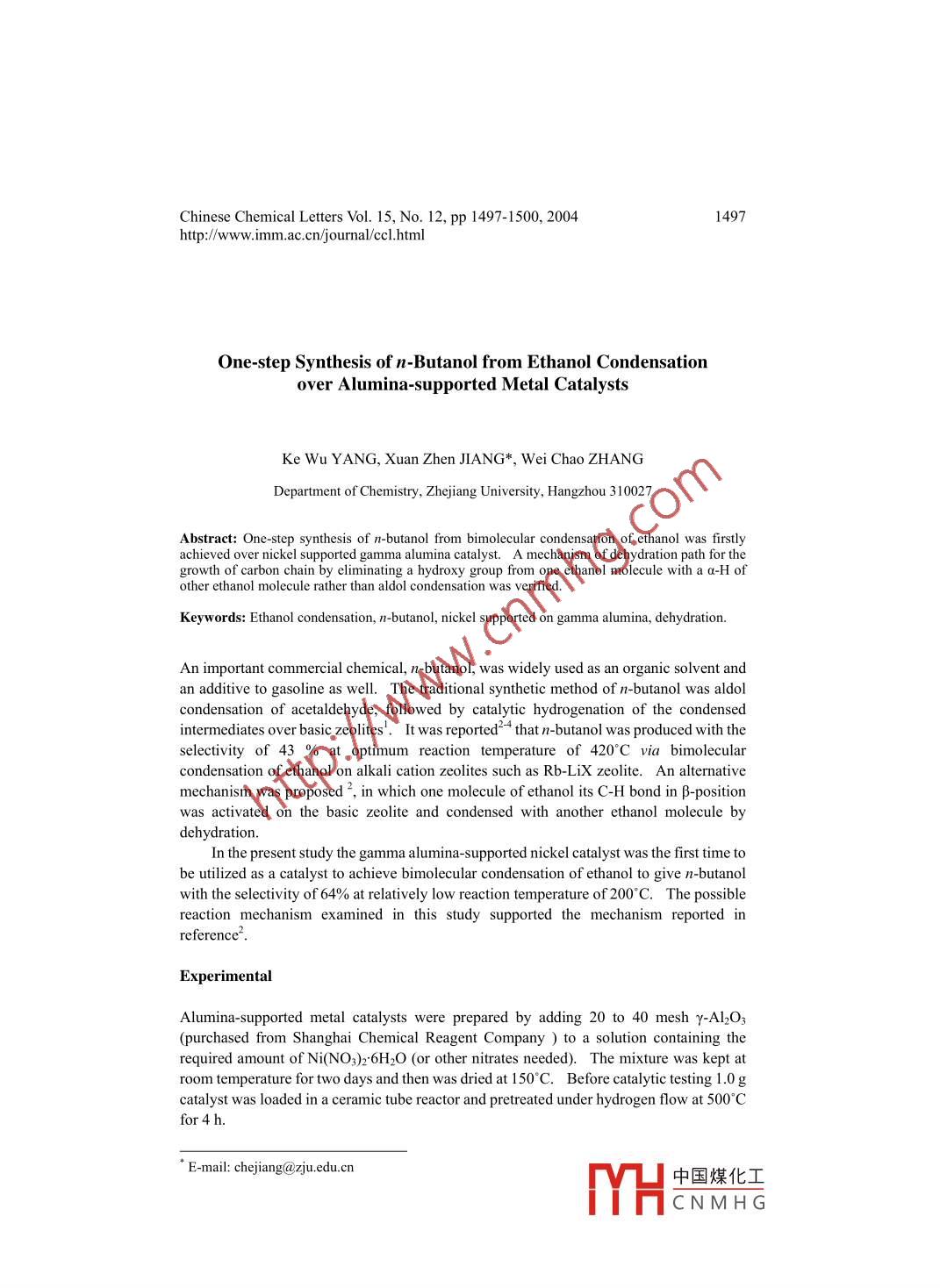 Chinese Chemical Letters vol. 15, No 12, pp 1497-1500, 20041497http://www.immac.cn/journal/ccl.htmlOne-step Synthesis of n-Butanol from Ethanol Condensationover Alumina-supported Metal CatalystsKe Wu Yang, Xuan Zhen JIANG", Wei Chao ZHANGartment of Chemistry, Zhejiang University, Hangzhou 31002Abstract: One-step synthesis of n-butanol from bimolecular condensation of ethanol was firstlyachieved over nickel supported gamma alumina catalyst. A mechanism of dehydration path for thegrowth of carbon chain by eliminating a hydroxy group from one ethanol molecule with a a-H ofother ethanol molecule rather than aldol condensation was verifiedKeywords: Ethanol condensation, n-butanol, nickel supported on gamma alumina, dehydrationAn important commercial chemical, n-butanol, was widely used as an organic solvent andn additive to gasoline as well. The traditional synthetic method of n-butanol was aldolondensation of acetaldehyde, followed by catalytic hydrogenation of the condensedintermediates over basic zeolites. It was reported that n-butanol was produced with theselectivity of 43 at optimum reaction temperature of 420C via bimolecularcondensation of ethanol on alkali cation zeolites such as rb-LiX zeolite. An alternativemechanism was proposed, in which one molecule of ethanol its C-H bond in B-positionwas activated on the basic zeolite and condensed with another ethanol molecule bydehydrationIn the present study the gamma alumina-supported nickel catalyst was the first timebe utilized as a catalyst to achieve bimolecular condensation of ethanol to give n-butanolwith the selectivity of 64% at relatively low reaction temperature of 200'C. The possiblereaction mechanism examined in this study supported the mechanism reported inAlumina-supported metal catalysts were prepared by adding 20 to 40 mesh y-Al2Opurchased from Shanghai Chemical Reagent Company)to a solution containing therequired amount of Ni(NO3 )2 6H2O (or other nitrates needed). The mixture was kept atroom temperature for two days and then was dried at 150 C. Before catalytic testing 1.0 gcatalyst was loaded in a ceramic tube reactor and pretreated under hydrogen flow at 500Cfor 4 hE-mail:chejiang@zju.edu.cn中國煤化工CNMHG1498Ke Wu yang et alThe ethanol condensation reactions were carried out at 200"C and l atm in a fixed bedceramic tube reactor with the inner diameter of 8 mm. Ethanol was introduced by a pumpwith LHSV of 0.67 h. The products were analyzed by GC-FID(HP-1102G)equippedwith ov-101 column and identified by GC/MS(HP5970)The X-ray diffraction of the catalyst was performed with Ni-filtered Cu-Ka radiationfrom a 12-kw Rigaku rotating anode X-ray source operated at 45 kV and 50 mA after thecatalyst was reduced by hydrogen at 500C for 4 h and cooled to room temperature underhydrogen flow in a specially designed cellTemperature-programmed reduction (TPR)of the catalysts was performed in amicro-reactor(ca 80 mg sample loading )at a heating rate of 10C min" using a mixtureof 5 vol H2/N2 as reducing gas after passing through a 4A molecular sieve trap toremove water. A gas chromatography with TCD was used for monitoring the hydrogenconsumption and recorded the tpr profilesResults and discussionThe catalytic performances over 8%Fe/y-AlO3, 8%Co/y-Al2O3 and 8%Ni/y-AlO3atalysts were given in Table 1. It can be seen from Table 1 that among them the8%Ni/y-Al2O3 catalyst exhibited the highest catalytic activity with 19. 1% conversion ofethanol and 64.3% selectivity of n-butanol, respectively. However no n-butanol wasobtained over 8%Fe/y-Al2O, mainly producing acetaldehyde. Over 8%Co/y-AL2Ocatalyst the considerable amounts of n-butanol was obtained with selectivity of 22%To optimize nickel loading for alumina-supported nickel catalysts, three differentloading catalysts, 4%Ni/Y-Al2O3, 8%Ni/y-Al2O3 and 15%Ni/y-Al2O3 were prepared andtheir catalytic performances at the same reaction conditions were listed in Table 2Table 1 The catalytic performances of different catalysts over ethanol condensation reactionsBDCatalystConv (Sel (8%Co/y-AlO17,214.115,929,222.718.43.164.323.0a)Reaction conditions: temp: 200 C, LHSV: 0.67hb)AD: Acetaldehyde; BD: Butaldehyde, EA: Ethanyl acetate: BO: n-butanolc)Others: 2-Ethylbutanol, n-hexanol, ethyl ether, n-butyl ether etc.Table 2 Catalytic performances over different nickel loading catalystscatalystEthanol Conv (%)n-Butanol yield(%)8%Ni/Y-Al2O319.115%Ni/Y-Al2012.0中國煤化工CNMHGOne-step Synthesis of n-Butanol from Ethanol1499Figure 1 XRD patterns of y-Al2O3 and 8%Ni/y-Al2O326(°)A: Blank y-Al2O3 B: 8%Ni/y-Al2O3 after H2 reductionFigure 2 Profiles of temperature-programmed reduction over4%Ni/y-Al2O3 8%Ni/y-Al2O3 and 15%Ni/y-Al2O330060090Temperature CFrom therein one can see that 8%Ni/y-Al2O3 catalyst demonstrated relatively highcatalytic activity and selectivity of n-butanol. To explore the active site of the catalyst,semi-in-situ XRD was performed and the results was shown in Figure 1. From the XRDprofiles Ni(o) was confirmed in the catalyst and it may act as the active sitesThis will be further confirmed by TPR profiles as shown in Figure 2. In the TPrprofiles the first peak maximum(Tm)in the lower temperature region due to the reductionof Ni(NO3)2 to NiO were observed on three catalysts. The corresponding Tm value510C(on 15%Ni/y-Al2O3), 560C(on 8%Ni/Y-Al2O3) and 590'C(on 4%Ni/y-Al2O3)wereshifted to higher temperatures as decreasing nickel loading. The second peakmaximum(TM)in the higher temperature region mainly ascribed to the reduction of nio toNi(0) were observed on both 8%Ni/y-Al2O3 and 4%Ni/y-Al2O3 samples; while only tinypeak on 15%Ni/y-Al2O3 sample indicating the formation of less Ni(O) species over highloading sample. Analogously the Tm values of second reduction peaks: 705C(on8%Ni/y-Al2O3)and 745 C(on 4%Ni/y-Al2O3) showed the same tendency. Reduction ofNio to Ni(O) required increasing temperature as nickel loading decreased. The reasonprobably was attributed to that low nickel loading catalyst