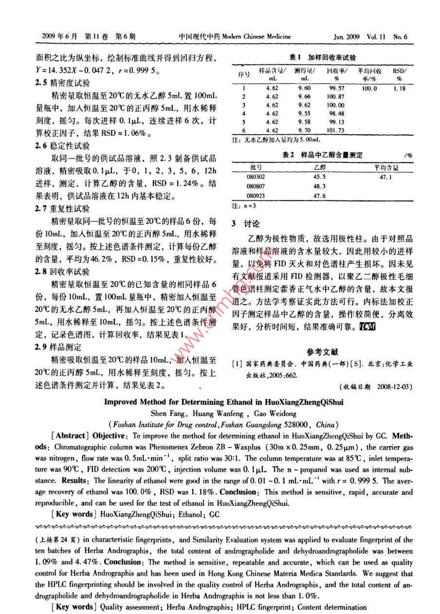2009年6月第1卷第6期中同現(xiàn)代中藥 Modem Chinese MedicineJun, 2009 Vol 11 No藿香正氣水中乙醇含量測(cè)定方法研究申放,黃婉峰,高衛(wèi)東(佛山市藥品檢驗(yàn)所,廣東佛山528000[摘要]目的:對(duì)霖香正氣水中乙醇的含量測(cè)定方法進(jìn)行改進(jìn)。方法:色譜柱為 phenomenex毛細(xì)管柱nZB- waxplus(30mx0.25mm,0.25μm);氮?dú)鉃檩d氣,流速為0.5 mL min,分流比為30:1;進(jìn)樣口溫度為90℃;柱溫為85℃;FID檢測(cè)器,溫度為200℃;進(jìn)樣量0.1μL;正丙醇為內(nèi)標(biāo)物。結(jié)果:在該色譜條件下,歡香正氣水中乙醇和內(nèi)標(biāo)物得到良好的分離,乙醇在0.010~0.1mL·mL線性良好(r=0.995,n=7);平均回收率為100.0%,RSD=1.18%(n=6)。結(jié)論:該法靈敏、準(zhǔn)確,重復(fù)性好,可用于測(cè)定該制劑的乙醇含量關(guān)鍵香正氣水;乙醇;氣相色譜香正氣水具有解表化濕,理氣和中的功能,臨床常用于外感風(fēng)寒、內(nèi)傷濕滯或夏傷暑濕所致的感冒等。對(duì)于制劑中乙醇含量的檢查,《中國(guó)藥典》中規(guī)定是以二乙烯苯乙基乙烯苯型高分子多孔小球作為載體的填充柱進(jìn)行測(cè)定,但是因?yàn)樘畛渲胁贿m宜做程序升溫以及相對(duì)理論塔板數(shù)比較低等不足,在藥品檢測(cè)工作中使用有減少的趨勢(shì),而多用毛細(xì)管柱。氣相色譜毛細(xì)管柱因其高分離能力1.乙醉峰:2.丙酚峰高靈敏度、高分析速度等獨(dú)特優(yōu)點(diǎn)而得到迅速發(fā)展。A內(nèi)標(biāo)物正內(nèi)醇:B.對(duì)照品:C香正氣水供試品查閱文獻(xiàn)未見有關(guān)于以聚乙二醇極性柱為色譜柱,圖1氣相色譜圖采用氫火焰離子化檢測(cè)器氣相色譜法測(cè)定制劑中乙醇含量的報(bào)道,故本實(shí)驗(yàn)建立了相應(yīng)方法,為乙醇2校正因子測(cè)定含量的測(cè)定提供參考。精密量取恒溫至20℃的無水乙醇4,5,6mL,1儀器與試藥分別置100m量瓶中,分別精密加入恒溫至20℃的正內(nèi)醇(內(nèi)標(biāo)物)5mL,加水稀釋至刻度,取上述3Varian CP-3800氣相色譜儀,FD檢測(cè)器;phe種溶液適量,按上述色譜條件分別連續(xù)進(jìn)樣3次nonene聚乙二醇毛細(xì)管柱 zebron ZB-waxplus(30mx計(jì)算乙醇的校正因子為1.3904,RSD=1%6%。0.25mm,0.25μm)。無水乙醇,正丙醇均為分析2.3供試品溶液的制備純,水為超純水。藿香正氣水,四川蜀中制約有限23供試品溶液的制備精密吸取恒溫至20℃的本品溶液10mL,置公司(批號(hào)080302,080807,080923)。100mL量瓶中,精密加入恒溫至20℃的正丙醇5mL2方法和結(jié)果加水稀釋至刻度,搖勻,即得。2.1色譜條件與系統(tǒng)適應(yīng)性試驗(yàn)2.4線性關(guān)系氫氣流速為30 mL. min-',尾吹流速28mL·min精密量取恒溫至20℃的無水乙醇1,2,氮?dú)饬魉?5mL·min1,空氣流速為300mLm8,10mL,分別置100mL量瓶中,分別精密加入柱溫為85℃;進(jìn)樣口溫度為90℃,檢測(cè)器溫度為恒溫至20℃的正丙醇(內(nèi)標(biāo)物)5mL,加水稀釋至刻200℃,分流比為30:1。在此色譜條件下,乙醇和正度,搖勻,按上述色譜條件進(jìn)樣,每次進(jìn)樣0.lμ,丙醇有較好的分離,色譜圖見圖1。以對(duì)照品含量為橫坐標(biāo),以對(duì)照品峰面積與內(nèi)標(biāo)峰[通訊作者]‘高衛(wèi)東,E-mail:weidong@163.com009年6月第卷第6期中國(guó)現(xiàn)代中藥 Moclern Chinese medicineJun 2009 Vol 11 No 6面積之比為縱坐標(biāo),繪制標(biāo)準(zhǔn)曲線并得到回歸方程,表1加樣回收率試驗(yàn)Y=14.352X-0.0472,r=0.9995。樣品含測(cè)得收率平均收RSD2.5精密度試驗(yàn)99.5700.0L.18精密量取恒溫至20℃的無水乙醇5mL置100mL9.66100.87量瓶中,加入恒溫至20咒℃的正丙醇5mL,用水稀釋4.629624.629.5598.48刻度,搖勻。每次進(jìn)樣0.IμL,連續(xù)進(jìn)樣6次,計(jì)算校正因子,結(jié)果RSD=1.06%4.629.70101.73水乙醇加入量均為500mL2.6穩(wěn)定性試驗(yàn)取同一批號(hào)的供試品溶液,照2.3制備供試品表2樣品中乙醇含量測(cè)定溶液,精密吸取0.1μL,于0,1,2,3,5,6,12h乙醇平均含址08030245.5進(jìn)樣,測(cè)定,計(jì)算乙醇的含量,RSD=1.24%。結(jié)080807果表明,供試品溶液在12h內(nèi)基本穩(wěn)定。27重復(fù)性試驗(yàn)精密量取同一批號(hào)的恒溫至20℃的樣品6份,每討論份10mL,加入恒溫至20℃的正丙醇5mL,用水稀釋至刻度,搖勻。按上述色譜條件測(cè)定,計(jì)算每份乙醇乙醇為極性物質(zhì),故選用極性柱。由于對(duì)照品溶液和樣品溶液的含水量較大,因此用較小的進(jìn)樣的含量,平均為4.2%,RSD=015%,重復(fù)性較好。量,以免將FD滅火和對(duì)色譜柱產(chǎn)生損壞。因未見2.8回收率試驗(yàn)有文獻(xiàn)報(bào)道采用FID檢測(cè)器,以聚乙二醇極性毛細(xì)精密量取恒溫至20℃的已知含量的相同樣品6管色譜柱測(cè)定藿香正氣水中乙醇的含量,故本文報(bào)份,每份10mL,置100mL量瓶中,精密加入恒溫至道之。方法學(xué)考察證實(shí)此方法可行。內(nèi)標(biāo)法加校正20℃的無水乙醇5mL,再加入恒溫至20的正內(nèi)醇因子測(cè)定樣品中乙醇的含量,操作較簡(jiǎn)便,分離效5mL,用水稀釋至10mL,搖勻。按上述色譜條件測(cè)果好,分析時(shí)間短,結(jié)果準(zhǔn)確可靠。cM定,記錄色譜圖,計(jì)算回收率,結(jié)果見表I。2.9樣品測(cè)定參考文獻(xiàn)精密吸取恒溫至20℃的樣品l0mL,加入恒溫至[]國(guó)家藥典委員會(huì),中國(guó)藥典(一部)[S].北京:化學(xué)工業(yè)20℃的正丙醇5mL,用水稀釋至刻度,搖勻。按上出版