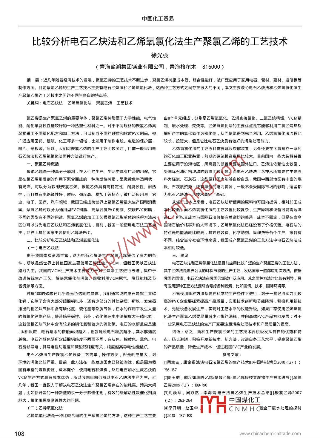 比較分析電石乙炔法和乙烯氧氯化法生產(chǎn)聚氯乙烯的工藝技術(shù)