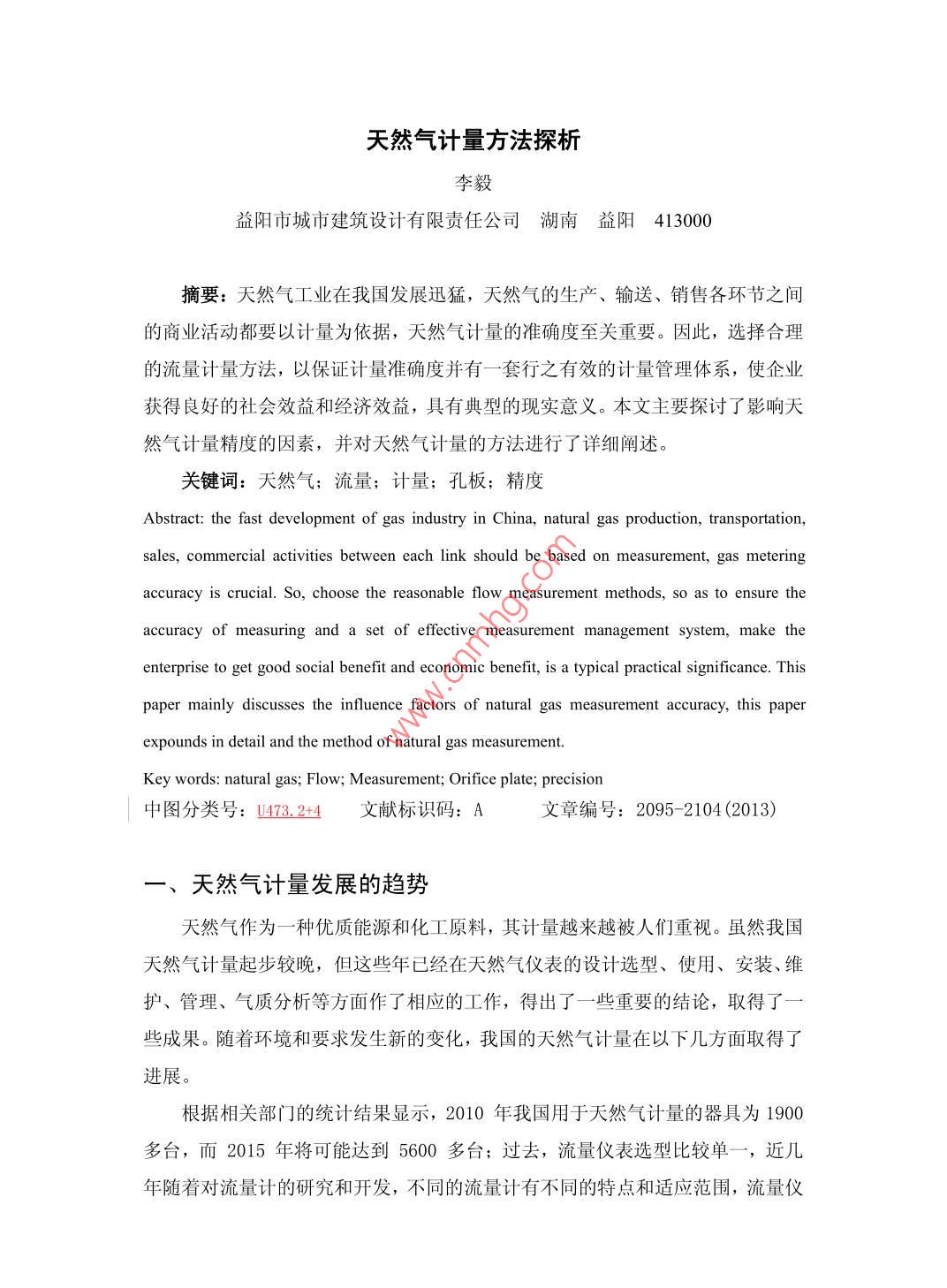 天然氣計(jì)量方法探析李毅益陽市城市建筑設(shè)計(jì)有限責(zé)任公司湖南益陽413000摘要:天然氣工業(yè)在我國發(fā)展迅猛,天然氣的生產(chǎn)、輸送、銷售各環(huán)節(jié)之間的商業(yè)活動(dòng)都要以計(jì)量為依據(jù),天然氣計(jì)量的準(zhǔn)確度至關(guān)重要。因此,選擇合理的流量計(jì)量方法,以保證計(jì)量準(zhǔn)確度并有一套行之有效的計(jì)量管理體系,使企業(yè)獲得良好的社會(huì)效益和經(jīng)濟(jì)效益,具有典型的現(xiàn)實(shí)意義。本文主要探討了影響天然氣計(jì)量精度的因素,并對(duì)天然氣計(jì)量的方法進(jìn)行了詳細(xì)闡述。關(guān)鍵詞:天然氣;流量;計(jì)量:孔板;精度Abstract: the fast development of gas industry in China, natural gas production, transportation,ales, commercial activities between each link should be based on measurement, gas meteringccuracy is crucial. So, choose the reasonable flow measurement methods, so as to ensure theaccuracy of measuring and a set of effective measurement management systeem. makeenterprise to get good social benefit and economic benefit, is a typical practical significance. Thpaper mainly discusses the influence factors of natural gas measurement accuracy, this paperexpounds in detail and the method of natural gas measurementKey words: natural gas; Flow; Measurement; Orifice plate; precision中圖分類號(hào):473.2+4文獻(xiàn)標(biāo)識(shí)碼:A文章編號(hào):2095-2104(2013)、天然氣計(jì)量發(fā)展的趨勢天然氣作為一種優(yōu)質(zhì)能源和化工原料,其計(jì)量越來越被人們重視。雖然我國天然氣計(jì)量起步較晚,但這些年已經(jīng)在天然氣儀表的設(shè)計(jì)選型、使用、安裝、維護(hù)、管理、氣質(zhì)分析等方面作了相應(yīng)的工作,得出了一些重要的結(jié)論,取得了些成果。隨著環(huán)境和要求發(fā)生新的變化,我國的天然氣計(jì)量在以下幾方面取得了進(jìn)展。根據(jù)相關(guān)部門的統(tǒng)計(jì)結(jié)果顯示,2010年我國用于天然氣計(jì)量的器具為1900多臺(tái),而2015年將可能達(dá)到5600多臺(tái);過去,流量儀表選型比較單一,近幾年隨著對(duì)流量計(jì)的硏究和開發(fā),不同的流量計(jì)有不同的特點(diǎn)和適應(yīng)范圍,流量儀表選型由此呈現(xiàn)從單一儀表向多元化儀表方向發(fā)展,一些新型的流量計(jì),如高中壓、大流量干線超聲流量計(jì)將得到廣泛運(yùn)用:我國目前的天然氣貿(mào)易計(jì)量方法主要還是在法定的質(zhì)量指標(biāo)下按體積計(jì)量,隨著市場經(jīng)濟(jì)的不斷完善和與國外天然氣交易量的增加,要求我國天然氣貿(mào)易計(jì)量方法盡快與國際接軌,實(shí)行能量計(jì)量結(jié)算,而據(jù)介紹,我國天然氣能量計(jì)量的標(biāo)準(zhǔn)已經(jīng)制定完成,國家可能即將推行按能量計(jì)量的貿(mào)易結(jié)算方式;另外,完善天然氣計(jì)量校準(zhǔn)系統(tǒng),擴(kuò)大流量校準(zhǔn)口徑,改建成都分站,擴(kuò)大校準(zhǔn)能力也將成為我國天然氣計(jì)量的一大發(fā)展趨勢。二、影響天然氣計(jì)量精度的因素分析(一)節(jié)流裝置本身產(chǎn)生的誤差如設(shè)計(jì)計(jì)算時(shí)偏離實(shí)際常用流量,偏離實(shí)際流體特性。孔板加工時(shí)由于各種原因?qū)е氯肟谥苯卿J利度不夠、孔板厚度誤差、節(jié)流件附件產(chǎn)生臺(tái)階、偏心、孔板上游端面水平度、孔板的圓度等影響其精度孔板使用一段時(shí)間后,發(fā)生彎曲變形、上游測量管沉積臟物、上游端面沉積臟物、孔板入口直角邊緣變鈍,破損等也會(huì)影響計(jì)量精度(二)孔板閥產(chǎn)生的誤差流量計(jì)的節(jié)流孔板是安裝在孔板閥當(dāng)中,由于存在泄漏,會(huì)導(dǎo)致不同程度的誤差。對(duì)此應(yīng)加強(qiáng)孔板閥的維護(hù)保養(yǎng),及時(shí)發(fā)現(xiàn)及時(shí)解決。在條件允許的情況下每隔一定周期對(duì)孔板閥進(jìn)行全面清洗維護(hù),使孔板閥工作在最佳狀態(tài)(三)安裝引起的誤差計(jì)量裝置安裝中造成的節(jié)流件不同軸度、取壓位置、焊接、焊縫突出、取壓孔加工不規(guī)范或堵塞、導(dǎo)壓管的不規(guī)范等造成的安裝誤差是普遍性的(四)直管段引起的誤差孔板前后的直管段,其長度和管道內(nèi)壁的粗糙度,平直度、圓度等必須符合定的要求。管道投入使用后,由于污物沉積和長期沖刷會(huì)產(chǎn)生計(jì)量誤差(五)現(xiàn)場儀表產(chǎn)生的誤差儀表精度、回差、線性度、量程等不可避免的會(huì)產(chǎn)生計(jì)量誤差;另外由于現(xiàn)場工作條件惡劣,儀表會(huì)產(chǎn)生零漂和溫漂。(六)流量積算儀產(chǎn)生的誤差流量積算儀工作是否可靠、流量計(jì)算軟件選用是否科學(xué),以及為保證積算儀穩(wěn)定工作采取的保護(hù)措施是否恰當(dāng),都會(huì)影響天然氣的計(jì)量。、天然氣計(jì)量的方法(一)撬裝式燃?xì)庹{(diào)壓計(jì)量站燃?xì)庹{(diào)壓計(jì)量站是一座自動(dòng)化程度較高的多功能區(qū)域站,包括燃?xì)鉁[潔過濾、調(diào)壓、計(jì)量及數(shù)據(jù)采集系統(tǒng),所有功能集成于一個(gè)整體的撬座上,占地面積小、現(xiàn)場安裝工作量少,操作維護(hù)方便,使用安全可靠,并且可以實(shí)現(xiàn)遠(yuǎn)程遙控?zé)o需現(xiàn)場值守。其內(nèi)部采用了流量范圍不同的兩個(gè)流量計(jì