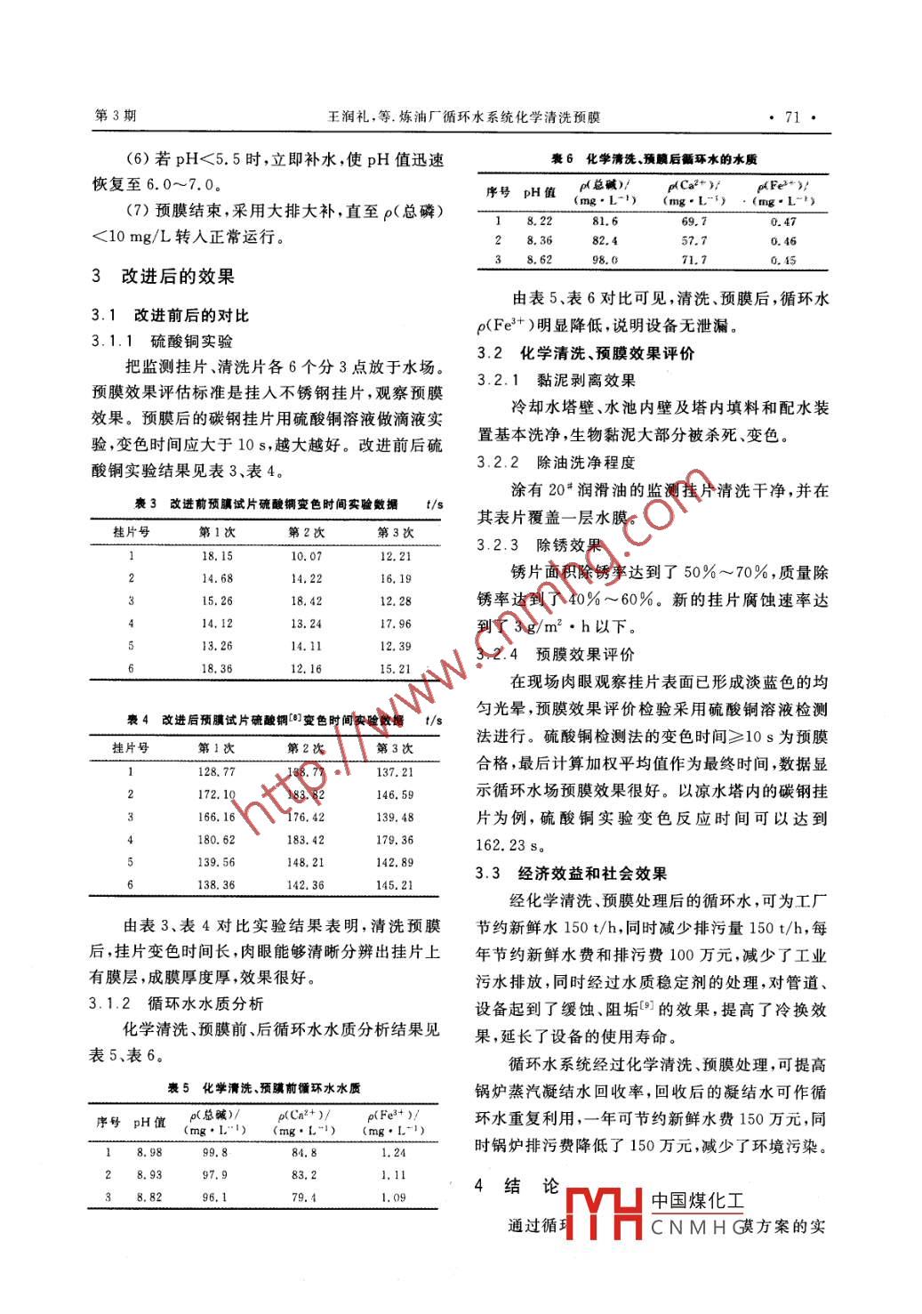 化工科技,2015,23(3):69~72生產(chǎn)技術(shù)SCIENCE & TECHNOLOGY IN CHEMICAL INDUSTRY煉油廠循環(huán)水系統(tǒng)化學(xué)清洗預(yù)膜王潤禮',孫坤' ,郝宇寧”,張玉紅' ,李寶城'(1.中國石油吉林石化公司煉油廠,吉林吉林132022;2. 中國石油吉林石化公司丙烯腈廠,吉林吉林132021)摘要:研究了 影響煉油廠循環(huán)水水質(zhì)的因素,通過對循環(huán)水系統(tǒng)進(jìn)行化學(xué)清洗、預(yù)膜,減少了工業(yè)污水排放,有利于節(jié)約水資源;同時(shí)經(jīng)過水質(zhì)穩(wěn)定劑的處理,對管道、設(shè)備起到了緩蝕、阻垢的作用,提高了冷換效果,延長了設(shè)備的使用壽命。關(guān)鍵詞:循環(huán)水;化學(xué)清洗;預(yù)膜中圖分類號: TQ085+.4文 獻(xiàn)標(biāo)識碼: B .文章編號: 1008-0511(2015)03 0069-04中國石油吉林石化公司煉油廠給排水車間是列生化反應(yīng),有機(jī)物被氧化,分解成二氧化碳和全廠生產(chǎn)用水的樞紐,主要負(fù)責(zé)全廠各裝置生產(chǎn)水,同時(shí)微生物又進(jìn)行同化合成,生成新的微生用水、鍋爐生產(chǎn)蒸汽用水、生活和消防用水。由于物,使循環(huán)水顏色逐漸變黑,濁度迅速增大,嚴(yán)重該車間循環(huán)水場長時(shí)間運(yùn)行,大量的介質(zhì)泄漏到地影響了循環(huán)水冷卻效果,漏油后循環(huán)水水質(zhì)分系統(tǒng)中,造成循環(huán)水系統(tǒng)微生物繁殖嚴(yán)重,產(chǎn)生大析結(jié)果見表1。量的生物黏泥,同時(shí)造成嚴(yán)重的垢下腐蝕,生物黏表1漏油后循環(huán)水水質(zhì)數(shù)據(jù)結(jié)果泥腐蝕產(chǎn)物以及結(jié)垢使得水冷器的交換效果變序號pH值p(總堿)/濁度 p(Ca2+)/ p(Fex+)/差,同時(shí)由于垢下腐蝕的原因,造成水冷器腐蝕加(mg.L-1) /NTU (mg.L1I) (mg.L-I)7.581.8710.358.90. 58劇,系統(tǒng)漏油,進(jìn)一步加劇循環(huán)水系統(tǒng)微生物繁27.820.9811.265.00. 59殖,易產(chǎn)生惡性循環(huán)。為確保裝置的“安全、平穩(wěn)、7.271. 0412.378.40. 65長周期.滿負(fù)荷”運(yùn)行,提高油品收率,必須定期對由表1可見,漏油后,循環(huán)水濁度增大,水質(zhì)循環(huán)水系統(tǒng)進(jìn)行化學(xué)清洗、預(yù)膜[] ,以減少污染物惡化。需加大殺菌滅藻劑的投人量和增加投藥對循環(huán)水系統(tǒng)的危害。通過水質(zhì)穩(wěn)定劑[2]處理,次數(shù)。對管道和設(shè)備能夠起到緩蝕和阻垢作用,提高冷.2氨的存在對循環(huán)水系統(tǒng)的影響及原因分析換~效率,減少排污水量,有利于節(jié)約水資源,確硝化細(xì)菌是自養(yǎng)型好氧微生物,由亞硝酸菌保達(dá)到水資源綜合利用和保護(hù)環(huán)境的目的。和硝酸菌組成,亞硝酸菌將水中的氨氮轉(zhuǎn)化成亞1影響循環(huán)水水質(zhì)的因素及原因分析硝酸根,硝酸菌將亞硝酸根轉(zhuǎn)變成硝酸根,將1mgNH3-N轉(zhuǎn)變成NOs需要4.57mg氧,同時(shí)1.1裝置漏油對循環(huán)水水質(zhì)影響及原因分析消耗7.14mg重碳酸鹽堿度(以CaCO3計(jì)),因而裝置漏油,使循環(huán)水中的有機(jī)物增加。循環(huán)硝化反應(yīng)會使水質(zhì)堿度迅速下降,見表2。水冷卻的過程,也是菌藻繁殖的過程,由于各種藥表2有氨時(shí)循環(huán)水水質(zhì)情況分析劑中含有足夠的磷,而且水與空氣接觸,不斷有氨序號pH值 .ρ(總堿)/p(Ca2+ )/p(Fe2+ )/水、氧氣溶解在水中,在微生物的作用下發(fā)生一-系(mg. L~1)(mg.1-1)(mg. L-1)7.28O. 8994.80.740. 79102. 40.76作者簡介:王潤禮(1966-),男,吉林九臺人,中國石油吉7.30109. 80.89林石化公司煉油廠工程師,從事油品調(diào)和、分析工作。中國煤化工收稿日期:2015-04-21當(dāng)堿度7TYHCN MH G器內(nèi)積存,70●化工科技第23卷黏泥下設(shè)備局部腐蝕。必須定期對各裝置換熱器2.2.2除銹除垢處理進(jìn)行出水檢查,對進(jìn)出酸性水汽提裝置的循環(huán)水目的是充分去除系統(tǒng)設(shè)備的銹垢和頑垢,減測定pH值,定期排污,及時(shí)補(bǔ)加緩蝕阻垢劑,提少結(jié)垢和腐蝕的產(chǎn)生,提高熱交換效率,改善工藝高循環(huán)水的利用率。操作條件,保證循環(huán)水系統(tǒng)正常運(yùn)行,操作過程如下。2改進(jìn)措施(1)確認(rèn)循環(huán)水濁度<15NTU,濃縮倍數(shù)3.02.1改進(jìn)方 案的選擇以下水質(zhì)合格,酸洗時(shí)為防止換熱設(shè)施本身發(fā)生上述問題采取清洗預(yù)膜的方案解決。煉油廠氫的去極化作用,防止被洗設(shè)備發(fā)生氫脆,先向系循環(huán)水系統(tǒng)不停車清洗預(yù)膜分2階段進(jìn)行。第一統(tǒng)中投加了酸洗緩蝕劑原液0. 375t,運(yùn)行0.5h階段為清洗,包括殺菌黏泥剝離,除油、除銹除垢后,按保有水量- -次性投加200 mg/L清洗劑0. 8 t,清洗,清洗之后將循環(huán)水采用邊排邊補(bǔ)的方法置循環(huán)1h后,開始分析pH值、p(Fe+)、p(總磷)、換掉。第二階段為確認(rèn)除去系統(tǒng)設(shè)備內(nèi)表面的浮濁度、p(Ca2+ )、p(Zn2+)。銹和雜質(zhì)后,進(jìn)行熱態(tài)預(yù)膜處理,預(yù)膜合格后,循(2)運(yùn)行過程中,若pH>4.0,用清洗劑作調(diào)環(huán)冷卻水系統(tǒng)恢復(fù)正常運(yùn)行。具體步驟為:黏泥節(jié)劑調(diào)節(jié)至規(guī)定pH=3.0~4.0,維持運(yùn)行24 h。剝離處理→水置換(→)→除銹除垢處理-?水置換(3)監(jiān)測掛片、清洗銹片各準(zhǔn)備6片分3點(diǎn)(二)-→熱態(tài)預(yù)膜處理- >水置換(三)→正常運(yùn)行放置,監(jiān)測清洗