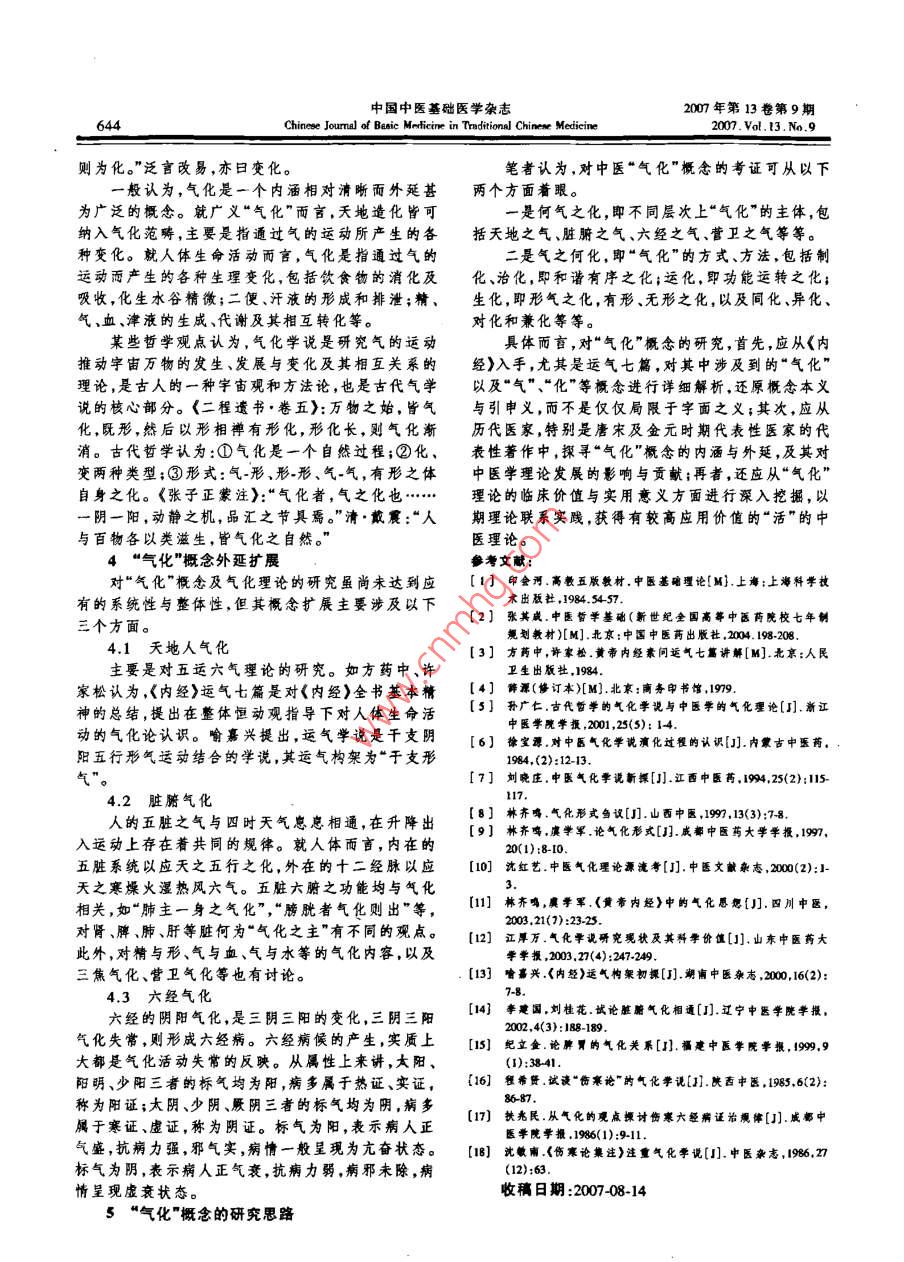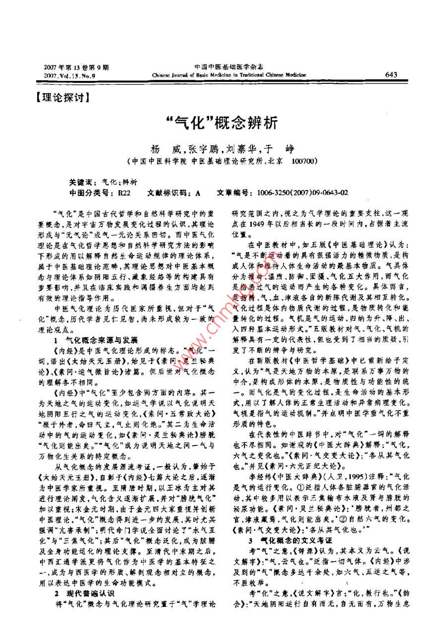 2007年第13卷第9期中國中醫(yī)基礎(chǔ)醫(yī)學(xué)雜志2007.Vnl.13.No.9Chince Joumal of Besle Medicine in Traditional Chinese Medicine643[理論探討]“氣化”概念辨析楊威,張宇鵬,劉寨華,于崢(中國中醫(yī)科學(xué)院中醫(yī)基礎(chǔ)理論研究所,北京 100700)關(guān)鍵試;氣化;辨析中圖分類號(hào): R22文獻(xiàn)標(biāo)識(shí)碼: A文章編號(hào): 1006-3250(2007 )09-0643-02“氣化”是中國古代哲學(xué)和自然科學(xué)研究中的重.研究范圍之內(nèi),視之為氣學(xué)理論的重要支柱,這一觀要概念,是對(duì)宇宙萬物發(fā)展變化過程的認(rèn)識(shí),其理論點(diǎn)在1949年以后相當(dāng)長的一段時(shí)間內(nèi),占據(jù)著主流形成與“元?dú)庹摗被驓庖辉撽P(guān)系密切。丙中醫(yī)氣化位置。理論是在氣化哲學(xué)思想和自然科學(xué)研究方法的影響.在中醫(yī)教材中,如五版《中醫(yī)基礎(chǔ)理論》認(rèn)為:下形成的用以解釋自然生命運(yùn)動(dòng)規(guī)律的理論體系,“氣是不斷運(yùn)動(dòng)著的具有很強(qiáng)活力的精微物質(zhì),是構(gòu)屬于中醫(yī)基礎(chǔ)理論范疇,其理論思想對(duì)中醫(yī)基本概成人體和維持人體生命活動(dòng)的最基本物質(zhì)。氣具體.念與理論體系如陰陽五行、藏象經(jīng)絡(luò)等的構(gòu)建具有分為推動(dòng)、溫息、防御、固攝、氣化五大作用,而氣化重要影響,并且在臨床實(shí)踐和調(diào)攝養(yǎng)生方面均起到是指通過氣的運(yùn)動(dòng)而產(chǎn)生的各種變化。具體頁言,有效的理論指導(dǎo)作用。是指精、氣、血、津液各自的新陳代謝及其相互轉(zhuǎn)化。.中醫(yī)氣化理論為歷代醫(yī)家所重視,但對(duì)于“氣氣化過程是體內(nèi)物質(zhì)代謝的過程,是物質(zhì)轉(zhuǎn)化和能.化”概念,歷代學(xué)者見仁見智,尚未形成較為一致的量轉(zhuǎn)化的過程。氣機(jī)是氣的運(yùn)動(dòng),歸納為升、降、出、理論觀點(diǎn)。入四種基本運(yùn)動(dòng)形式?!蔽灏娼滩膶?duì)氣、氣化、氣機(jī)的氣化概念來源與發(fā)展解釋具有一定的代表性,但也受到了相當(dāng)?shù)馁|(zhì)疑,引《內(nèi)經(jīng)》是中醫(yī)氣化理論形成的標(biāo)志。“氣化"一發(fā)了不斷的辨爭與研究。詞,語出《太始天元玉冊》,始見于《素問.靈蘭秘典在新版教材《中醫(yī)哲學(xué)基礎(chǔ)》中已重新給予定論>、《素問.運(yùn)氣徼旨論》諸篇。但后世對(duì)氣化概念義,認(rèn)為“氣是天地萬物的本原,是聯(lián)系萬事萬物的的理解各不相同。中介,是構(gòu)成形體的本原。是物質(zhì)性與功能性的統(tǒng)《內(nèi)經(jīng)》中“氣化”至少包含兩方面的內(nèi)容。其一一。面氣化是氣的變化過程。是生命活動(dòng)的基本形為天地之氣的運(yùn)動(dòng)變化,如運(yùn)氣學(xué)說以氣化說明天式,用以了解人體的正常生理話動(dòng)和異常病理變化。;地陰陽五行之氣的運(yùn)動(dòng)變化,《素問●五常政大論》氣機(jī)是指氣的運(yùn)動(dòng)機(jī)制?!辈Ⅻc(diǎn)明中醫(yī)學(xué)重氣化不重“根于外者,命日氣立。氣止則化絕?!逼涠樯?形質(zhì)的特色。動(dòng)中的氣的運(yùn)動(dòng)變化。如《素間.靈蘭秘典論》膀胱在代表性的中醫(yī)辭書中,對(duì)“氣化”一詞的解釋.“氣化則能出矣?!薄睔饣背蔀檎f明天地之間一氣與也不盡相同。如謝觀的《中醫(yī)大辭典》解釋:“氣化,萬物化生關(guān)系的特定概念。六氣之變化也?!薄端貑?氣交變大論》:“各從其氣化從氣化概念的發(fā)展源流考證,一般認(rèn)為,肇始于也?!辈⒁姟端貑?六元正紀(jì)大論》?!洞笫继煸駜浴?,自彰于《內(nèi)經(jīng)》七篇大論之后。逐漸李經(jīng)緯《中醫(yī)大辭典》(人衛(wèi),1995)注釋:“氣化為中醫(yī)學(xué)家所重視。至隋唐時(shí)期,以王冰為主對(duì)其是氣的運(yùn)行變化。①泛指人體各臟腑器官的氣化活進(jìn)行理論闡發(fā),氣化含義逐漸擴(kuò)展。并對(duì)“膀胱氣化”動(dòng),其中較多用以表示三焦輸布水液及腎與膀胱的.加以重視;宋金元時(shí)期,由于金元四大家重視并創(chuàng)新談尿功能?!端貑枴耢`蘭秘典論》:‘膀胱者,州都之中醫(yī)理論。“氣化”概念得到進(jìn)一步的發(fā)展,其時(shí)尤其.官,津液藏焉,氣化則能出矣。'②自然六氣的變化。強(qiáng)調(diào)“亢害承制”;明代命門學(xué)說全面討論了“水氣互《素阿.氣交變大論》:*各從其氣化也。’”化“與“三焦氣化”;其后“氣化”概念泛化,成為臟腑3氣化概念的文義考證及全身功能運(yùn)化的理論支撐。至清代中末期之后,考“氣”之意,《辭源》認(rèn)為,其本義為云氣?!墩f中西匯通學(xué)派更將氣化作為中醫(yī)學(xué)的基本特征之文解字>:“氣,云氣也?!狈褐敢磺袣怏w?!秲?nèi)經(jīng))中涉一,成為與西醫(yī)學(xué)的形質(zhì)、解剖觀念相對(duì)立的概念,及到的“氣”概念多達(dá)千余處,如六氣、五運(yùn)之氣等,用以表達(dá)中醫(yī)學(xué)的生命功能模式。不勝枚舉。2現(xiàn)代普遍認(rèn)識(shí).考“化”之意,《說文解字》言:“化,教行也?!薄俄崒ⅰ皻饣备拍钆c氣化理論研究置于“氣”學(xué)理論:會(huì)》:“天地陰陽運(yùn)行自有而無,自無面有。萬物生息