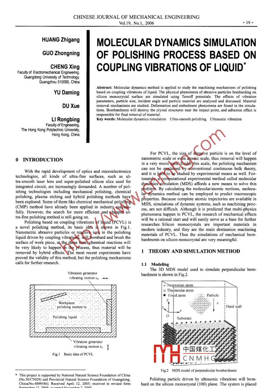 CHINESE JOURNAL OF MECHANICAL ENGINEERING_Vol.19, No.l, 2006●19●HUANG ZhigangMOLECUL AR DYNAMICS SIMULATIONGUO ZhongningOF POLISHING PROCESS BASED ONCHENG XingCOUPLING VIBRATIONS OF LIQUID*Faculty of Electromechanical Engineering.Guangdong University of Technology,Guangzhou 510090, ChinaAbstract: Molecular dynamics method is applied to study the machining mechanisms of polishingYU Damingbased on coupling vibrations of liquid. The physical phenomena of abrasive particles bombarding onsilicon monocrystal surface are simulated using Tersoff potentials. The effects of vibrationparameters, particle size, incident angle and particle material are analyzed and discussed. Materialremoval mechanisms are studied. Deformation and embedment phenomena are found in the simula-DU Xuetions. Bombardment will destroy the crystal structures near the impact point, and adhesion effect isresponsible for final removal of material.LI RongbingKey words: Molecular dynamics simulation Ultra-smooth polishing Ultrasonic vibrationFaculty of EngineenThe Hong Kong Polyechnic UniversityHong Kong, ChinaFor PCVL, the size of abrasive particle is on the level of0 INTRODUCTIONnanometric scale or even atomic scale, thus removal will happenin a very micro area. Under this scale, the polishing mechanismWith the rapid development of optics and microelectronicscan not be explained by conventional continuous bulk theory,and it is hard to be studied by experimental means as well. For-technologies, all kinds of ultra-fine sufaces, such as ultunately, a computational experimental method called moleculartra-smooth laser lens and super-polished silicon slice used fordynamics simulation (MDS) affords a new means to solve thisintegrated circuit, are increasingly demanded. A number of pol-problem. By calculating the molecular/atomic motions, molcu-ishing technologies including mechanical polishing, chemicallar dynamics method can be employed to predict macroscopicpolishing, plasma etching and hybrid polishing methods haveproperties. Because complete atomic trajectories are available inbeen explored. Some of them like chemical mechanical polishingMDS, simulations of dynamic systems, such as machining proc-(CMP) method have already been applied in industry success-ess, are not difficult. Although it is predicted that multi-physicsfully. However, the search for more efficient and cheaper ul-phenomena happen in PCVL, the research of mechanical effectstra-fine polishing method is still going on.Polishing based on coupling vibrations of liquid (PCVL) iswill be a rational start and will surely serve as a base for furtherA novel polishing method, its basic idea is shown in Fig.1.researches. Silicon monocrystals are important materials inNanometric abrasive particles or reactive ions in the polishingmodern industry, and they are the main destination machiningmaterials of PCVL. Thus the simulations of mechanical bom-liquid driven by coupling vibrations, will bombard and brush thebardments on silicon monocrystal are very meaningful.surface of work picce, at the same time, chemical reactions willbe very likely to happen in the process, thus material will be1 THEORY AND SIMULATION METHODremoved by hybrid effects. The most recent experiments haveproved the validity of this method, but the polishing mechanismscalls for further research.1.1 ModelingThe 3D MDS model used to simulate perpendicular bom-bardment is shown in Fig.2.vibrating motionw+一Neytonian altomo Thermostat atom) Fixed atomParticlepolishing motion印pHard wallPolishing liquidSubstrateVibration generatorvibrating motiony |中國煤化工Fig.I Basic idea of PCVLMH.CNMH GFig.2 MDS model of perpendicular bombardment●This project is supported by National Natural Science Foundation of China(No 50375029) and Provincial Natural Science Foundation of Guangdong,Polishing particle driven by ultrasonic vibrations will bom-China(No. 4009486). Received April 12, 2005; received in revised formbard on the silicon monocrystal (100) plane. The system is placedSeptember 12, 2005: accepted November 2, 2005●20●HUANG Zhigang, et al: Molecular dynamics simulation of polishing process based on coupling vibrations ofliquidin a vacum environment, and is surrounded by hard walls to pre-VYw=F(n)+N,+Ty+P,vent atoms from escaping. Fixed atoms are arranged around New-tonian atoms in the substrate to fix the space. The initial tempera-where Fs is a symmetric two-body term which implies Fs(r) --ture is room temperature (293 K). Thermnostat atoms are employedFs(n), Ny is an asymmetric two-body term, Ty is a three-bodyto simulate heat conduction.term, and Py is the force term related to bond angle.The dimension of the substrate must be large enough tolimit the boundary effects, but on the other hand, the scale of the()=[0()0《2+ 501)2,2]。system should also be controlled to reduce computing time. It is’aOrfound that when the particle size is about 1 nmX1 nmX1 nm,substrates of 9.2 nmX 6.0 nmX 9.2 nm, 10.3 nmX7.1nmX 10.3nm and 11.4 nmX8.1 nmX 11.4 nm almost give out the samearor, ]yresults. Thus a dimension of 9.2 nmX6.0 nmX9.2 nm can bethought of as accuracy enough. Considering the requirement ofJτ=q 2|8(0a)accuracy and eficiency, in most cases, the dimensions employed(4)are 10.3 nmX7.1 nmX10.3 nm (that is 19X13X 19 siliconP,=p, 2 ya(m -r cosOx)e+(ry - rn cosoQw)ez]crystal cell, and containing 37544 atoms).The thermal motions of Newtonian atomsasigned ran-domly according to the initial temperature of system. Meanwhile,中= (c(I)f()自there are additional motions of particles caused by vibratingliquid. Because of the viscosity of polishing liquid, the move-fe(x). 2g(0x)ments of particles fail to keep synchronizing with the ultrasonicVa=rYn a(cosOgx)vibration source. And when there are more than just one vibra-tion sources, coupling efect will be destined to happen. For sim-The objct ey= (1/r) (n;- r1) is the unit vector between atom iplicity, viscosity efet and coupling efect are ignored in simula-and atom j.