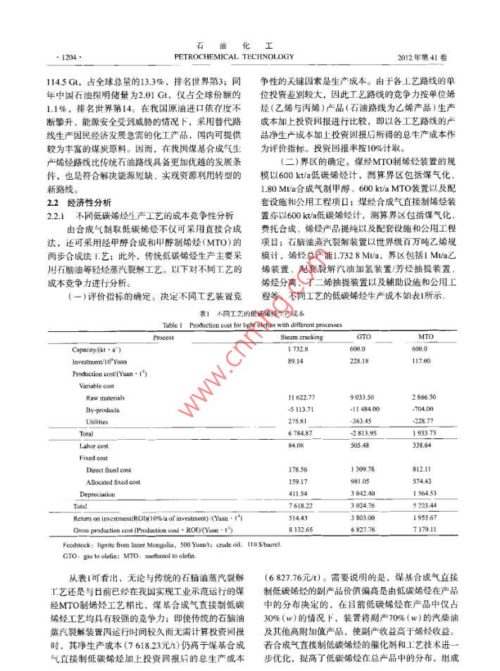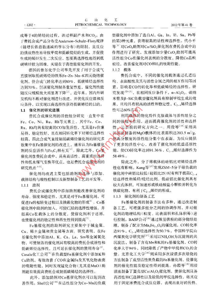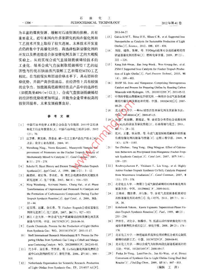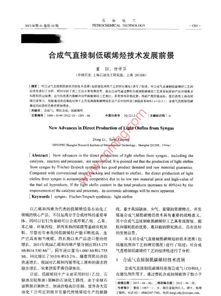 石油比工2012年第41卷第10期PEIROCHEMICAL TECHNOLOGY●1201 .合成氣直接制低碳烯烴技術(shù)發(fā)展前景董麗,楊學萍(中國石化上海石油化工研究院,上海201208)[摘要]對合收氣古按制低碳勢烴的技術(shù)進展(包括任化制和T藝的研究情況)進行廣綜述;對合成氣白接制低碳制烴工藝的經(jīng)濟性進行了分析,同時分析了該工藝的本來發(fā)展前景。撕出合成氣通過費托合成制飯?zhí)枷《蘐藝具有較好的產(chǎn)品市場需求和原料供應(yīng)保障,且與傳繞蒸汽裂解和經(jīng)甲解制烯烴工藝相比,具有原料價格優(yōu)勢,并副產(chǎn)高價值鈾品。在經(jīng)濟性上具有較強的競爭力。如能通過改進雅化劑和T藝優(yōu)化揭高低碳場烴在總產(chǎn)品中的組成(如提高至40%(w)以上.),合成氣直接制低碳墻烴的經(jīng)濟性優(yōu)勢將更加明顯。[關(guān)鍵聞”合成氣;費托合成;低堿瑞烴” 文章編號] 1000- 8144(2012) 10- 1201 - 06中圈分類號: TQ 2212[文獻標識碼] ANew Advances in Direct Production of Light Olefins from SyngasDong Li,Yung Xueping(SINOPEC Shangboi Research lsite of Ptrochemical Tecnolougy. Shenghai 201208,Ching )[ Abstract ] New advances in the direet production of light olefins from syngas, including thecatalysts, reactors and processes, are summarized. It is pointed out that the production of light olefinsfrom syngas by Fischer- Tropsch synthesis has good product demand and raw material guarantee.Compared with conventional steam cracking and methaol to olefins, the direct production of lightolefins from syngas is economically competitive due to is low raw material price and high-value ofthe fuel oil byproducts. If the light olefin content in the total products increases to 409%(W) by theimprovement of the catalysts and processes. its economic advantage will be more apparent.[ Keywords ] syngas; Fischer Tropsch synthesis; light olefins以憶烯和丙烯為代表的低碳烯烴是石油化r線?;谖覈庇?、少氣、富煤的資源特點,開發(fā)領(lǐng)域的核心產(chǎn)品,不僅是高分子合成材料的重要單煤基合成氣制低碳烯烴技術(shù)具有重要的戰(zhàn)略意義,體,同時以它們?yōu)榛A(chǔ)可以合成環(huán)氧乙烷、乙苯、其中合成氣直接制取低碳烯烴工藝具有流程短、能苯乙烯、環(huán)氧丙燒、異丙苯和丙烯情等基礎(chǔ)有機原耗和煤耗低的優(yōu)勢,是月前的研究熱點,具有良好料。盡管近年來我國低碳烯烴產(chǎn)能不斷提高,生的發(fā)展前景。產(chǎn)已具有相當規(guī)模,但長期以來產(chǎn)品進口量持續(xù)本文對合成氣直接制低磯烯烴的技術(shù)進展(包增長。201 1年我國乙烯和丙烯產(chǎn)量分別達到15.275括催化劑和T藝的研究情況)進行了綜述;對合成Mt和14.530 Mit',同年進口量為1.060 Mt和1.755氣直接制低碳烯烴T.藝的經(jīng)濟性進行了分析。Mt.同比增長了30.0%和15.2%。隨著閑民經(jīng)濟的1合成氣直接制 低碳烯烴技術(shù)進展快速增長.我國對乙烯和丙烯等化1.原料的需求將穩(wěn)步增長,未來供需矛盾仍很突出。合成氣直接制低碳烯烴是指合成氣(CO和H2)日前,低碳烯烴牛產(chǎn)主要采用輕烴(乙烷、石在催化劑作用下,通過費托合成制得碳原子數(shù)小于腦油及輕柴油)裂解的石油化工路線。由于全球石[收稿日期」2012-04-06; i修改稿日期] 2012-06-28。油資源日漸貴乏,原油價格高位徘徊,世界各大石.作者簡介}重麗(1987-).女,湖北省隨州市人,傾+.助理油化T公司正積極開發(fā)替代傳統(tǒng)烯烴生產(chǎn)的新路工程師,電話021 - 68462197.7502,電郵dongl shy@sinopec. com。第10期.董麗等.合成氣直接制低碳烯烴技術(shù)發(fā)展前景導(dǎo)熱性能,減少飛溫的可能性。流化床費托合成中試裝置,采用Fe基催化劑,在,催化劑的焙燒過程與焙燒溫度對活性組分的300~ 400 C.2.0~ 5.0 MPa下操作。該裝置連續(xù)滿顆粒尺寸及其在催化劑中的分布情況有直接影響。負荷運行1 580h,裝置溫度控制穩(wěn)定,催化劑在線沈興等20發(fā)現(xiàn)FeK/ZMS -5催化劑經(jīng)500 C焙燒3 h排放和添加操作自如。費托反應(yīng)的合成氣轉(zhuǎn)化率大后具有最佳的催化活性。但對低碳烯烴的選擇性影于82%,產(chǎn)物中含大量烯烴,進一步提純后可生產(chǎn)響不明顯。Tao等[則認為提高焙燒溫度和加熱速乙烯、丙烯和丁烯等低碳烯烴。率可降低Fe- -Mn催化劑的比表面積,提高低碳烯烴Kohshiroh等[25)于 1989年首次在固定床反應(yīng)器與C;產(chǎn)物的選擇性;另外,在氬氣中焙燒可改善催上將超臨界介質(zhì)應(yīng)用到Co基催化劑的費托合成反化劑積碳情況,并提高反應(yīng)活性。Reubroycharoen應(yīng)中,發(fā)現(xiàn)在提高CO轉(zhuǎn)化率和抑制甲烷轉(zhuǎn)化方面等221發(fā)現(xiàn)用微波法處理Co/SiO,催化劑前體可避免均得到明顯改善。此后,國內(nèi)外研究學者紛紛對超催化劑表面的Co粒子燒結(jié),使其具有更加均- -的臨界技術(shù)在費托合成中的應(yīng)用展開了研究。唐浩粒徑和較高的分散度,提高反應(yīng)活性。東等32)考察了多種超臨界介質(zhì)下的費托合成反應(yīng),超細顆粒技術(shù)、超臨界流體技術(shù)以及微波輻認為C3.正構(gòu)烷烴在催化劑活性溫度下都是適宜熔射技術(shù)也被應(yīng)用到催化劑的制備過程中,用來提鐵催化劑的超臨界介質(zhì),具備較好的傳質(zhì)與傳熱性高催化劑的合成效率,并改善催化劑的物化性能。能,可改善費托合成反應(yīng)性能。北京化工大學(2])北京化工大學2]采用超臨界流體組合技術(s